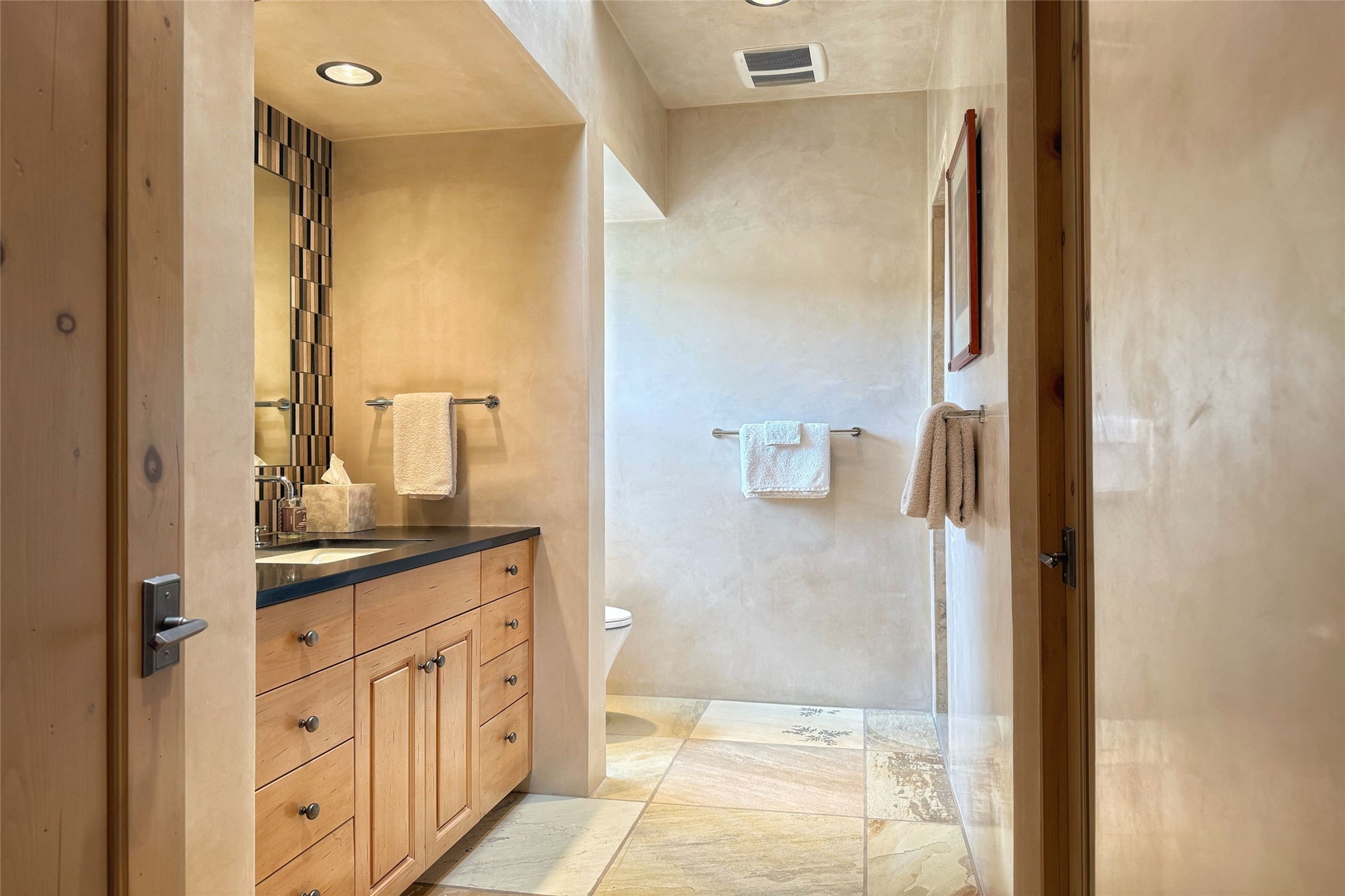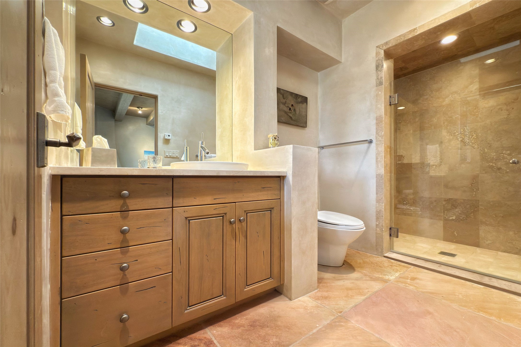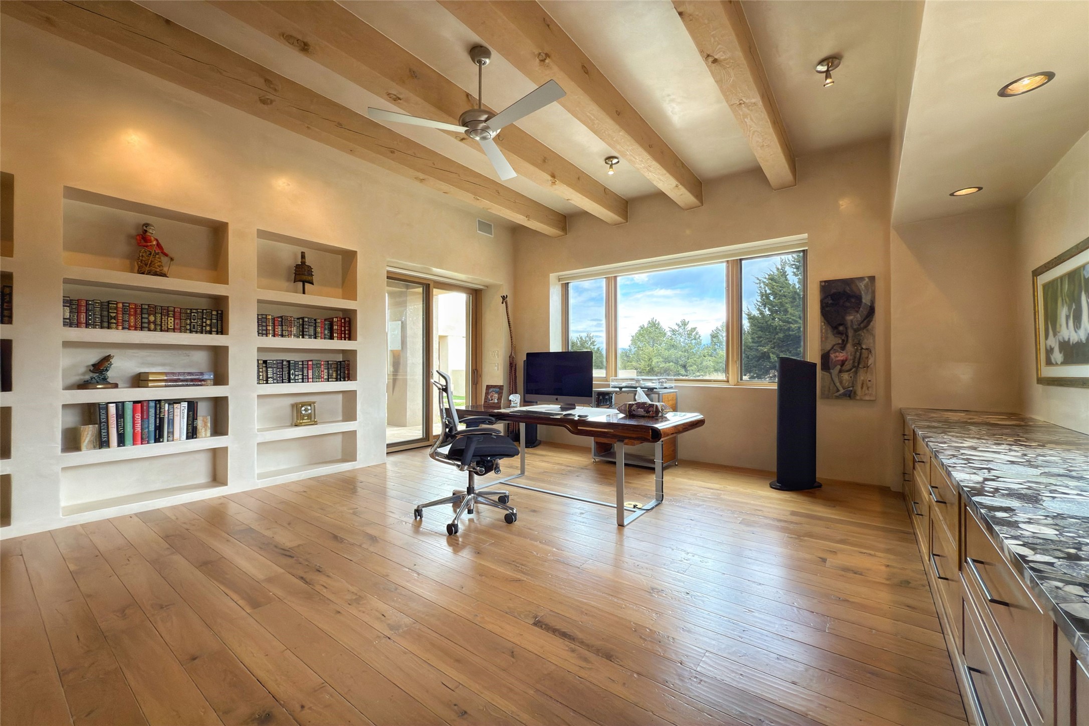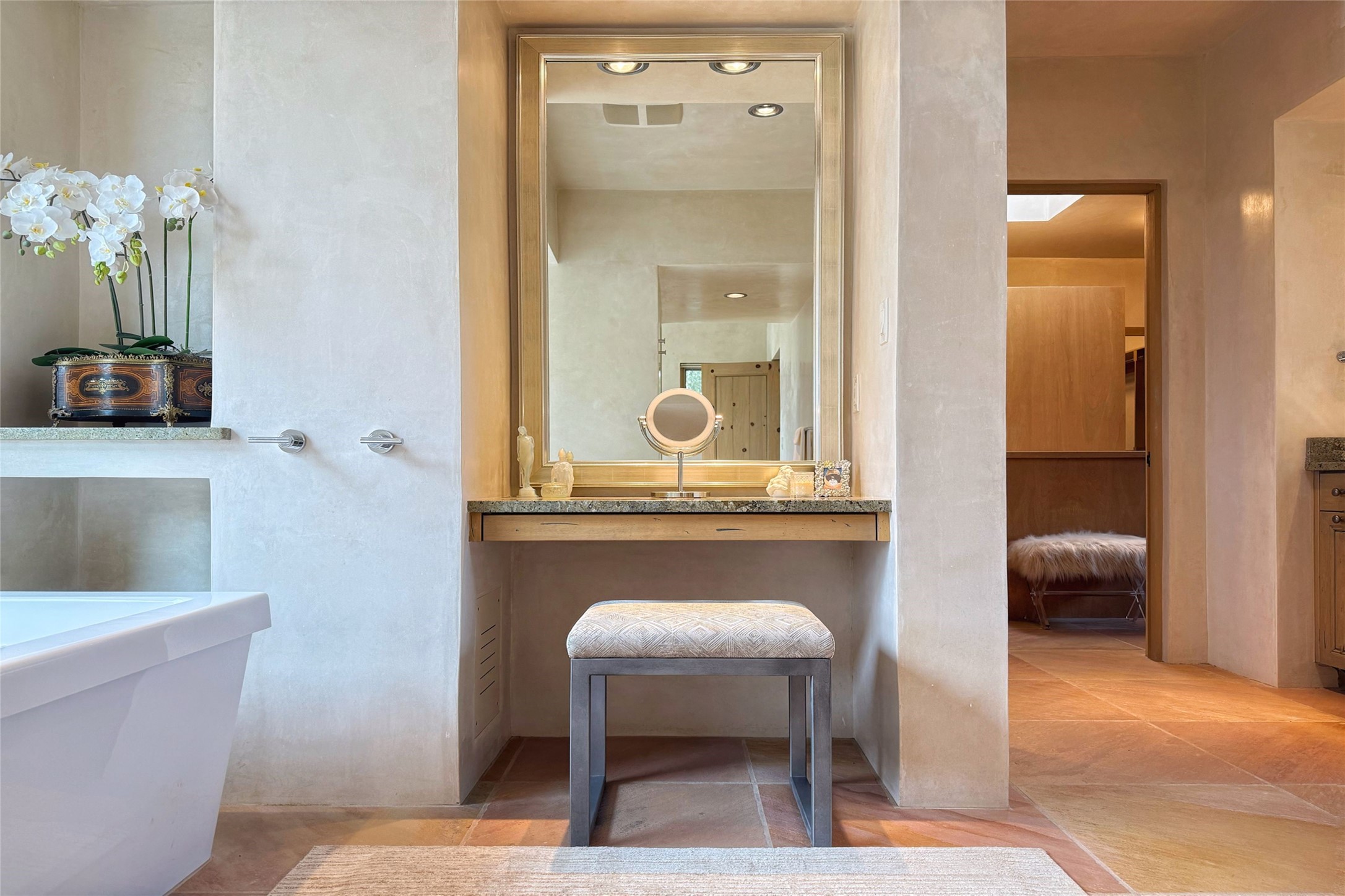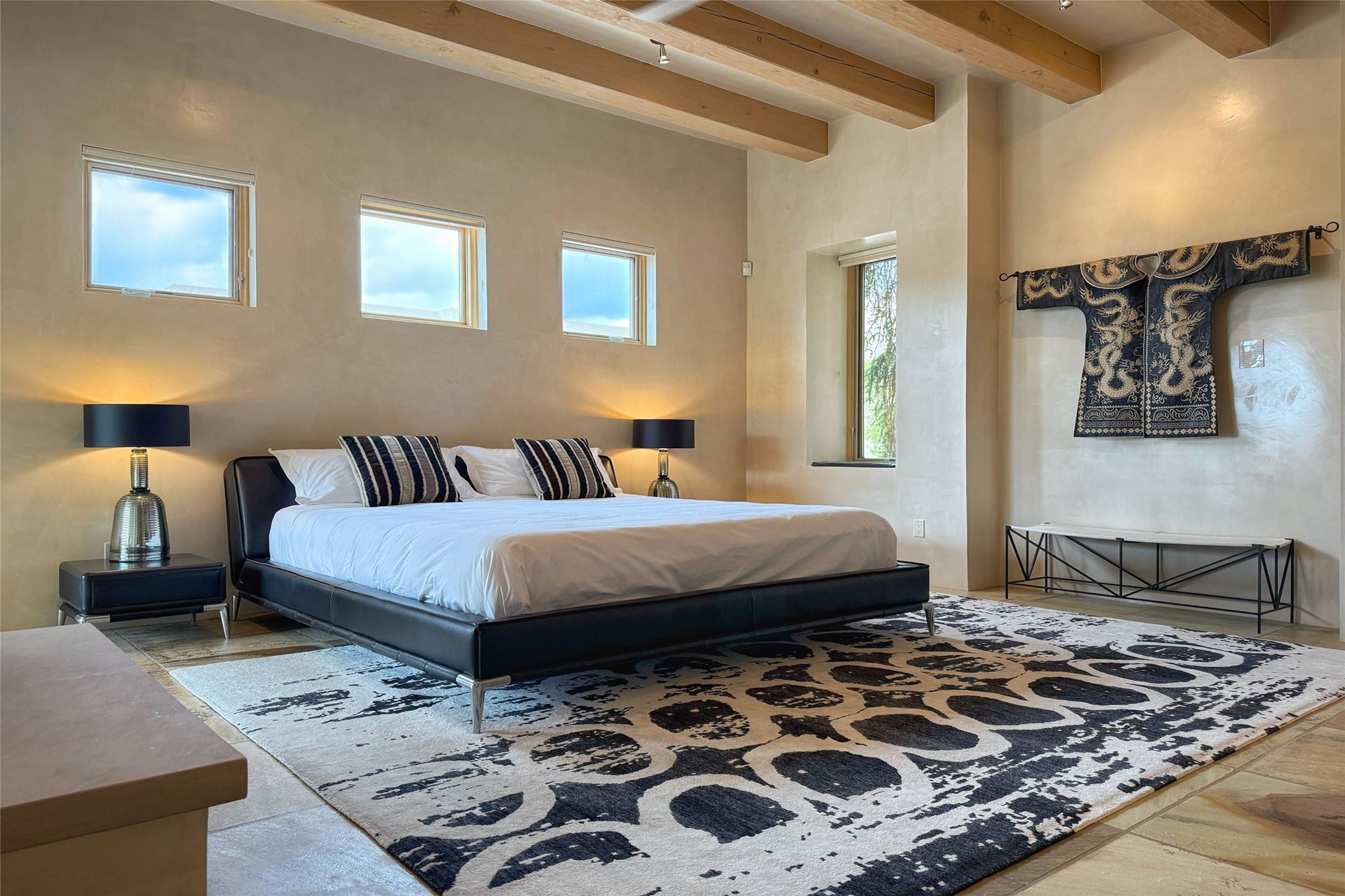 Prestigious Las Campanas Estate. Sophisticated Soft Contemporary on a Double Lot- over 3 acres for privacy.Welcome to an extraordinary estate built by Kim Dressel. Featuring a circular front drive, enclosed zen-like courtyard, and large separate motor court. With sweeping Sangre de Cristo views, this masterpiece blends elegance with tranquility and superb attention to detail. The entire residence is filled with natural light and augmented with custom lighting to showcase the art lover's collection.Interiors are graced with vigas and Desert Indian Sandstone floors. A total of 9 fireplaces (indoor and outdoor) provide warmth and charm. A generous entry hall, framed with alabaster sculptural lighting opens to the Great Room, anchored with a center fireplace and inspired by a bank of floor to ceiling windows that showcase the Sangre de Cristos. This space flaunts soaring ceilings and clerestory windows that flood the space with light. A gourmet kitchen features a large center island with Taj Mahal countertops, Sub-Zero/Wolf appliances, and opens to adjoining formal dining area and a cozy family room. A lavish primary suite offers a fireplace and an east facingportal complete with hot tub, fireplace and mountain views. Primary bath includes dual vanities, steam shower, soaking tub, dry sauna and custom closet. Adjacent home gym for convenience. Transition to the second wing through an impressive Gallery Hall designed for private art collections, exhibits and concert entertaining. A dedicated wine tasting space and sculpture garden complete the gallery.The secondary residence area includes large media room,office, two ensuite bedrooms with fireplaces and patios.Multiple outdoor spaces for indoor/outdoor living and entertaining including a deep covered portal with skylights, water feature, built-in grill and banco seating.Sparing no expense, this architectural gem delivers high-end fit and finishes throughout. The ultimate in style and serene luxury.