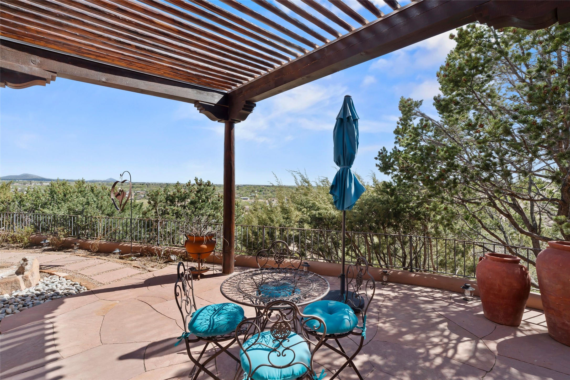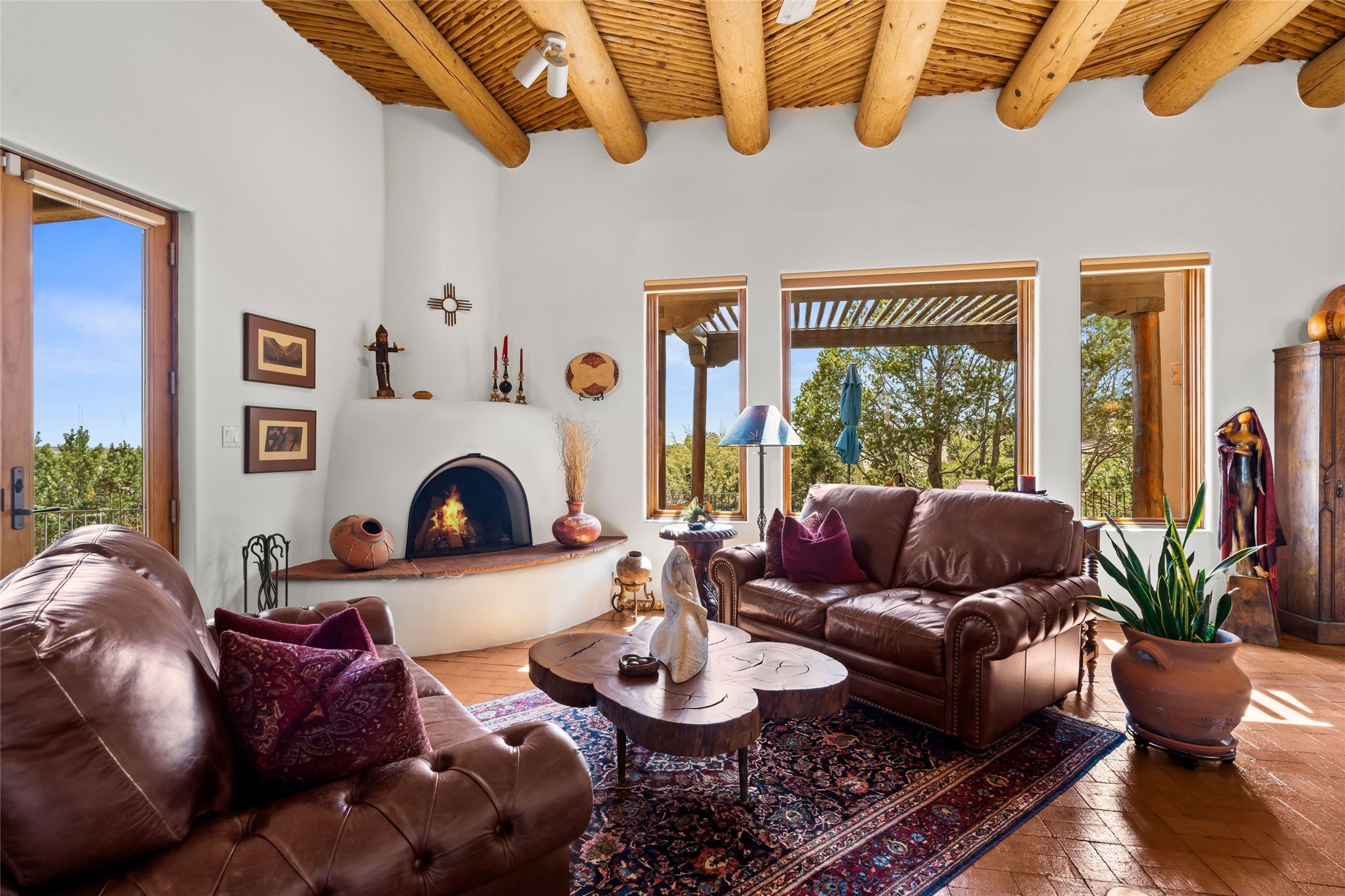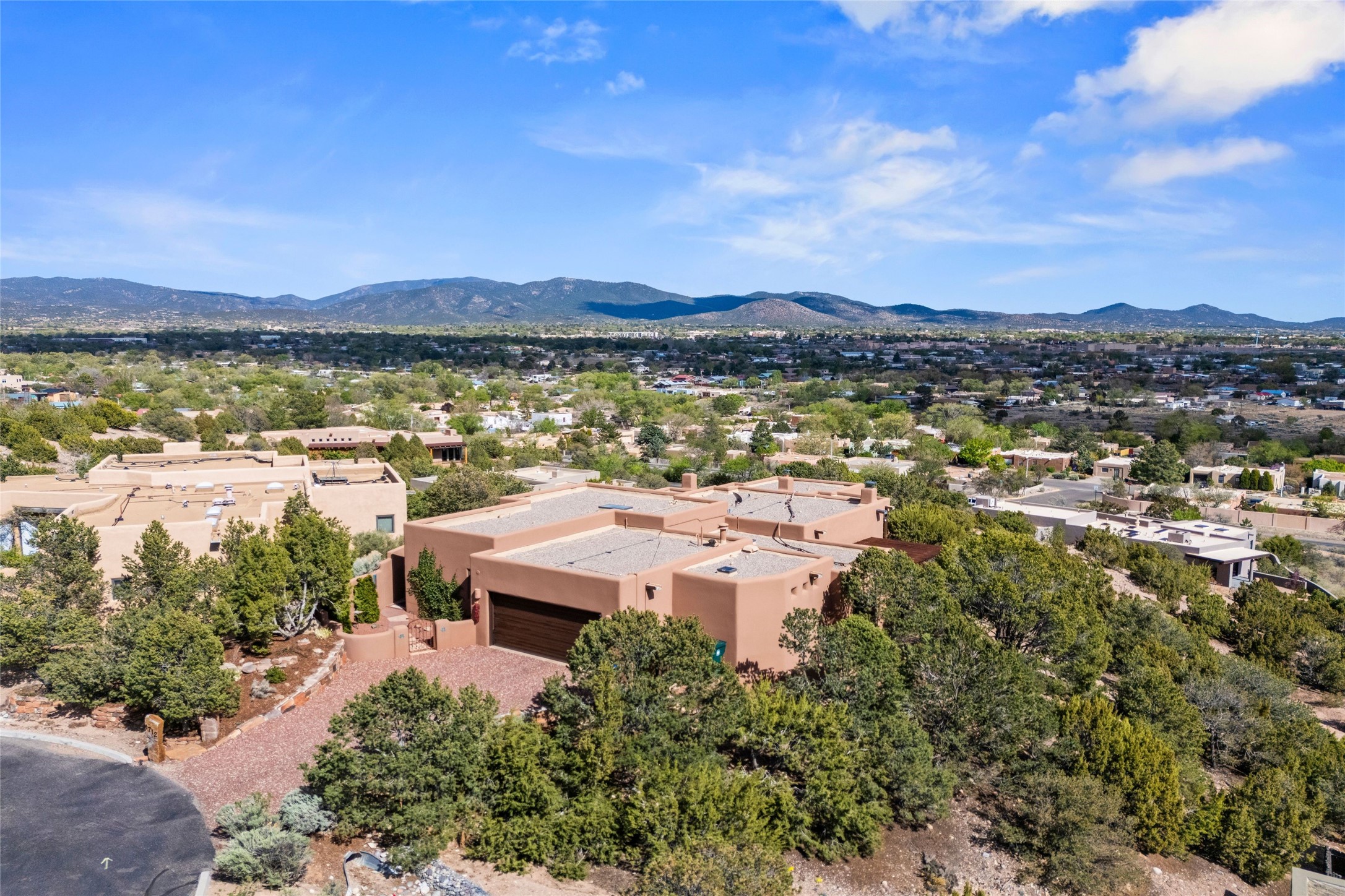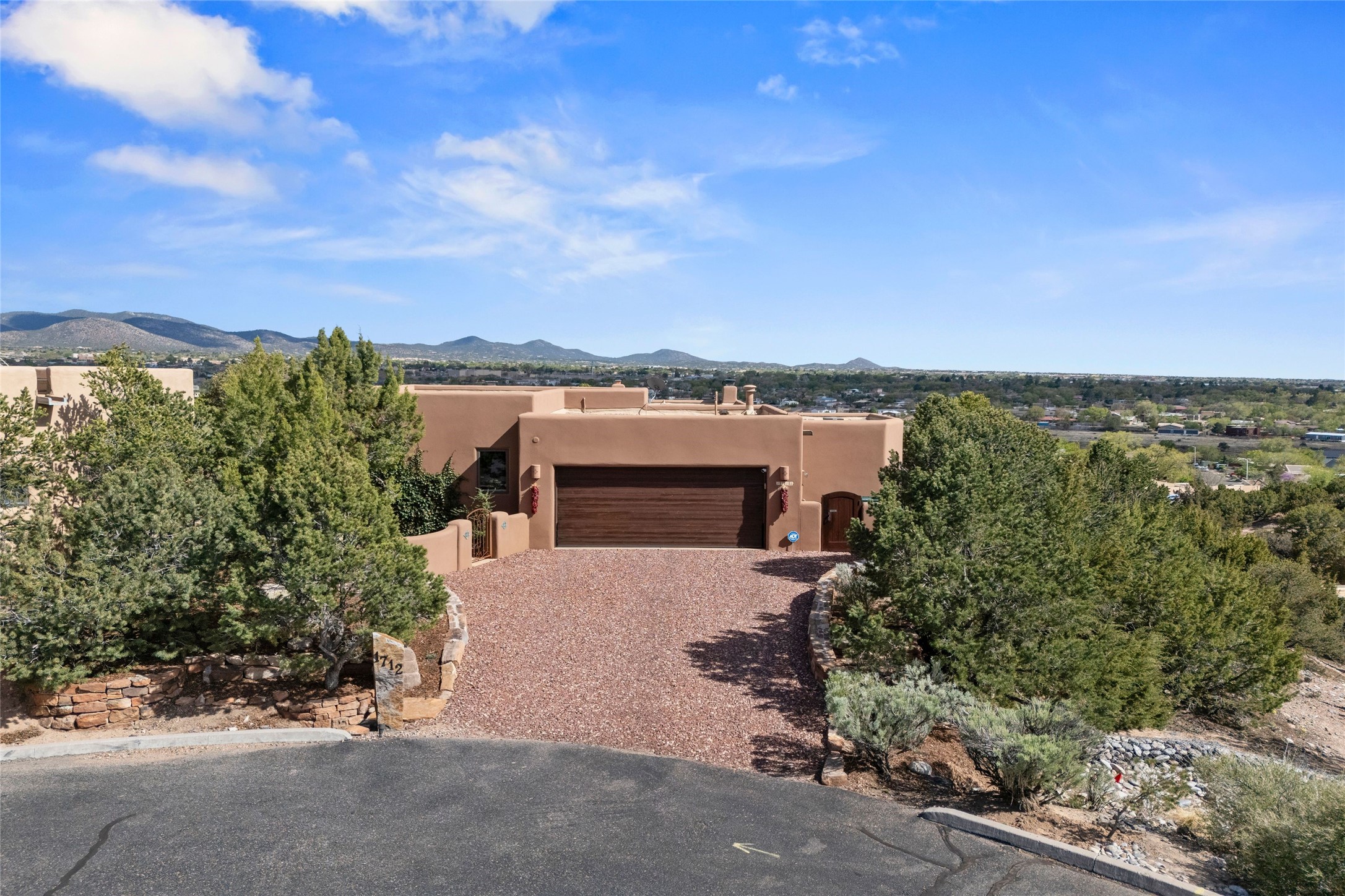 Step through the custom-designed front door and you're instantly welcomed by the charm of traditional Pueblo architecture--soaring ceilings with vigas and latillas, three cozy kiva fireplaces, and classic brick flooring. This thoughtfully updated home features fully remodeled bathrooms and kitchen, fresh paint throughout, redesigned closets, a walled courtyard, an epoxy-coated garage floor, and a modern alarm system. New windows frame breathtaking mountain and sky views from three sides of the home, offering daily front-row seats to spectacular sunrises and sunsets. Enjoy three distinct outdoor living spaces, perfect for relaxing or entertaining in style. Nestled in a serene natural landscape at the end of a quiet cul-de-sac, this home provides exceptional privacy while still being part of a welcoming neighborhood--just 12 minutes from the historic Plaza.