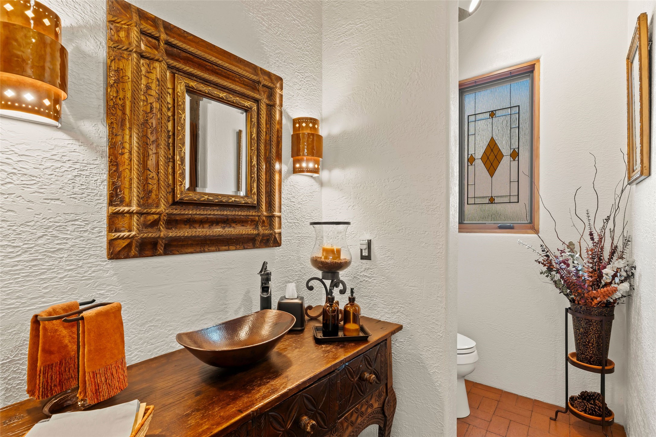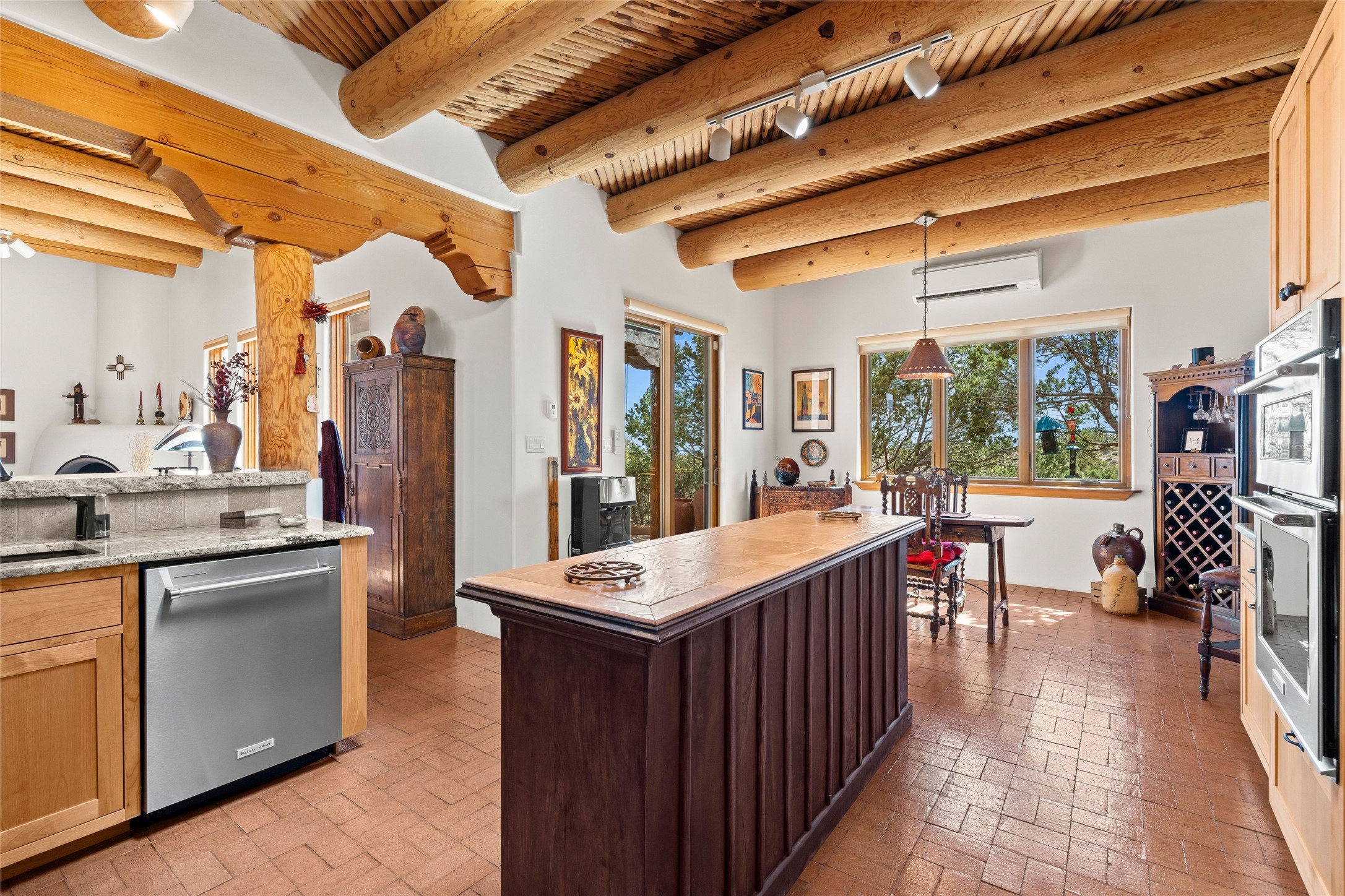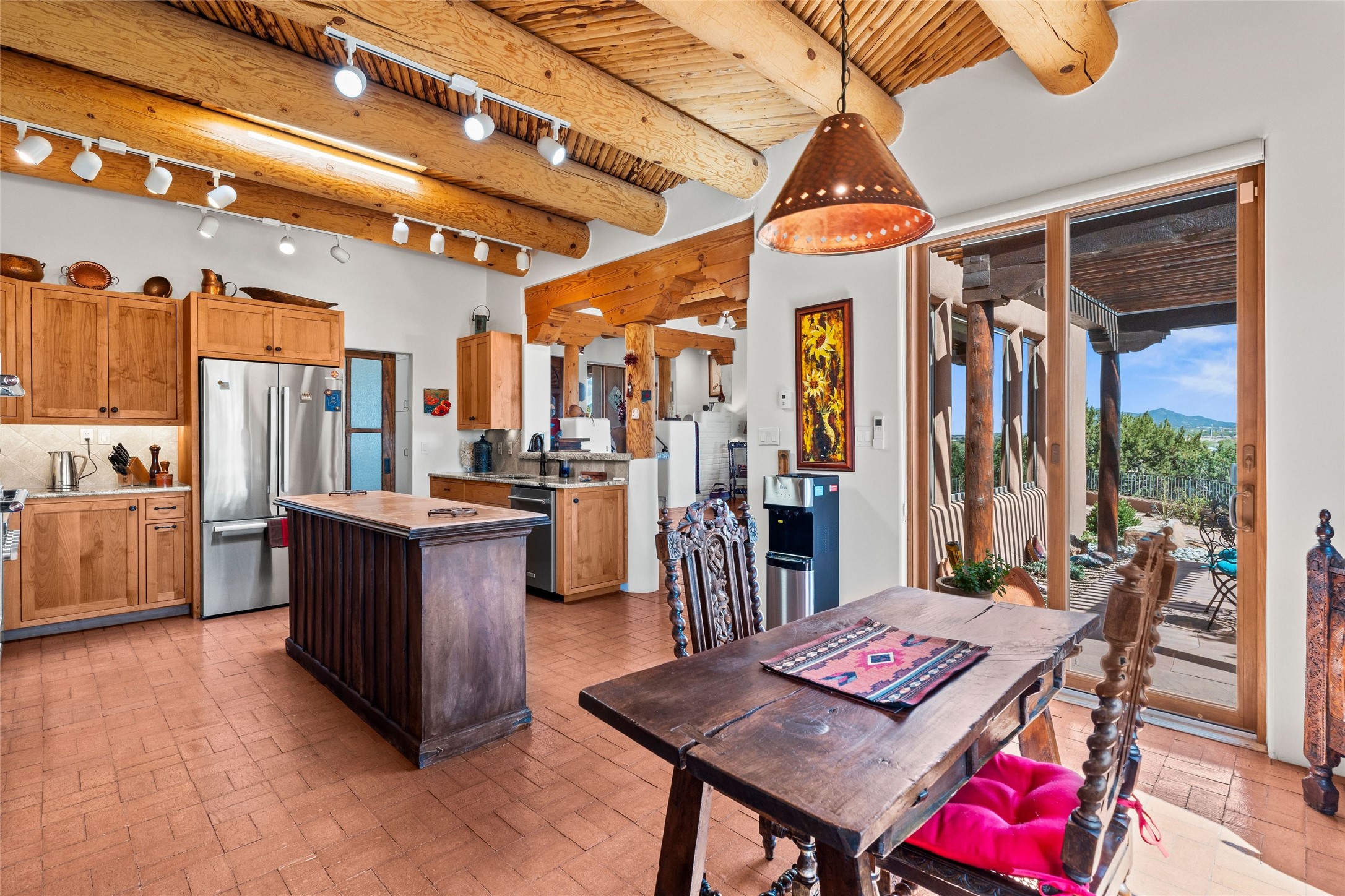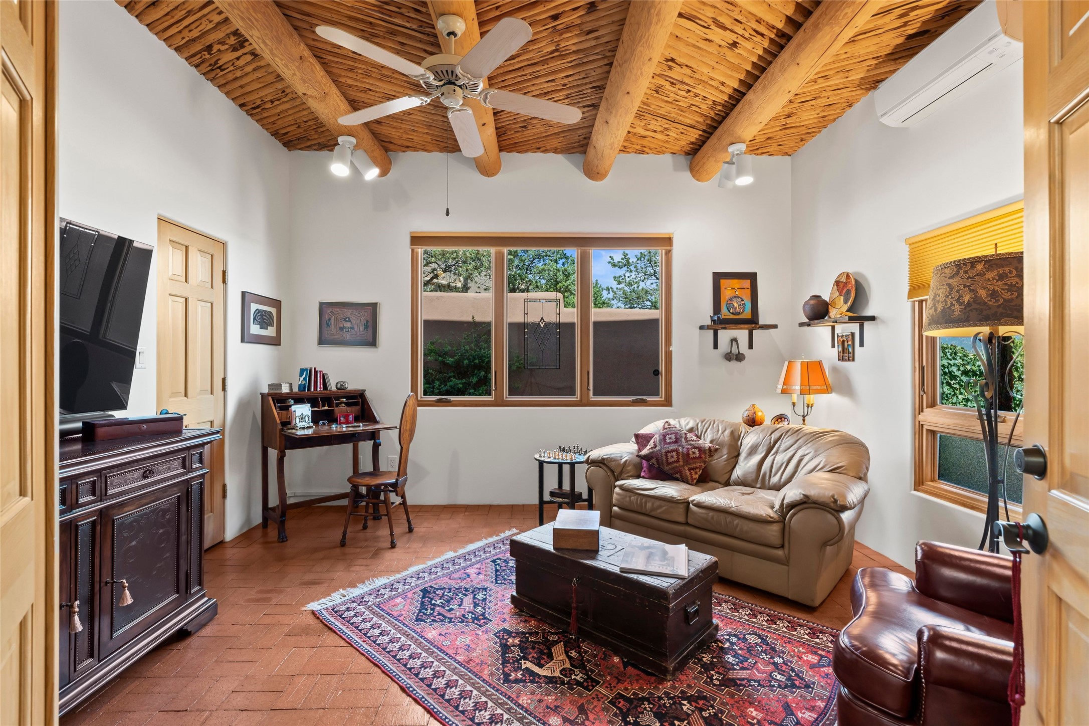 Step through the custom-designed front door and you're instantly welcomed by the charm of traditional Pueblo architecture--soaring ceilings with vigas and latillas, three cozy kiva fireplaces, and classic brick flooring. This thoughtfully updated home features fully remodeled bathrooms and kitchen, fresh paint throughout, redesigned closets, a walled courtyard, an epoxy-coated garage floor, and a modern alarm system. New windows frame breathtaking mountain and sky views from three sides of the home, offering daily front-row seats to spectacular sunrises and sunsets. Enjoy three distinct outdoor living spaces, perfect for relaxing or entertaining in style. Nestled in a serene natural landscape at the end of a quiet cul-de-sac, this home provides exceptional privacy while still being part of a welcoming neighborhood--just 12 minutes from the historic Plaza.
