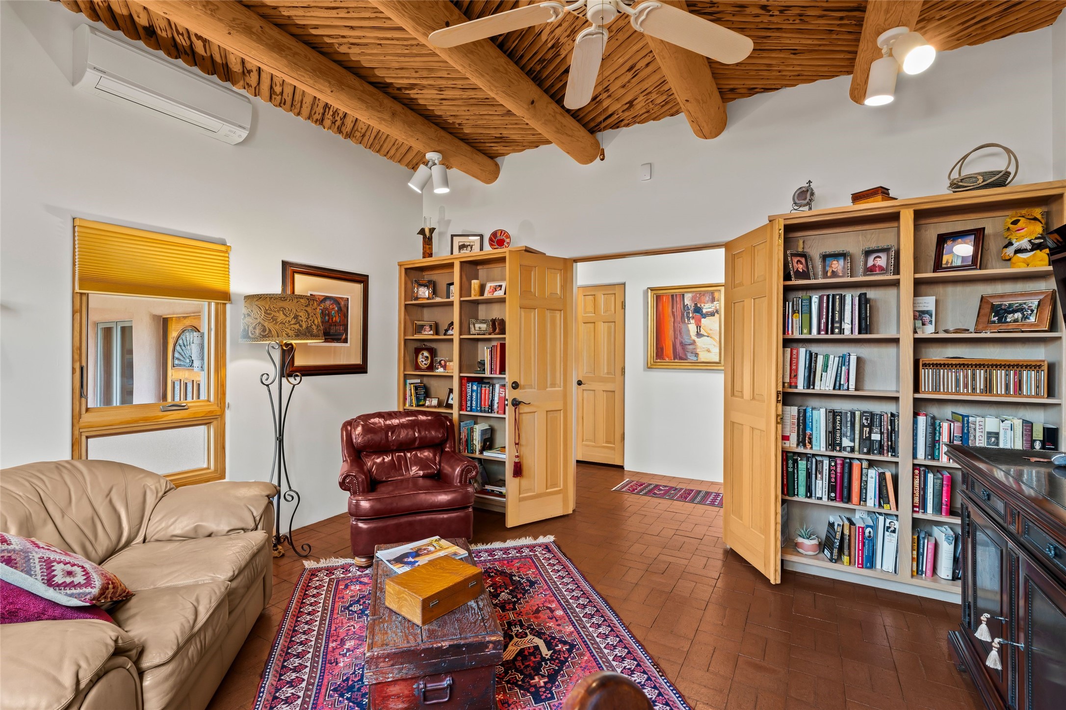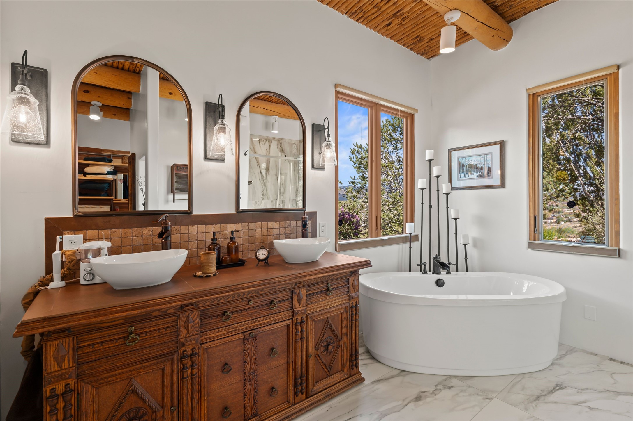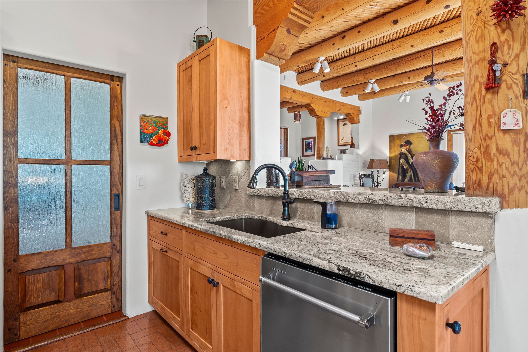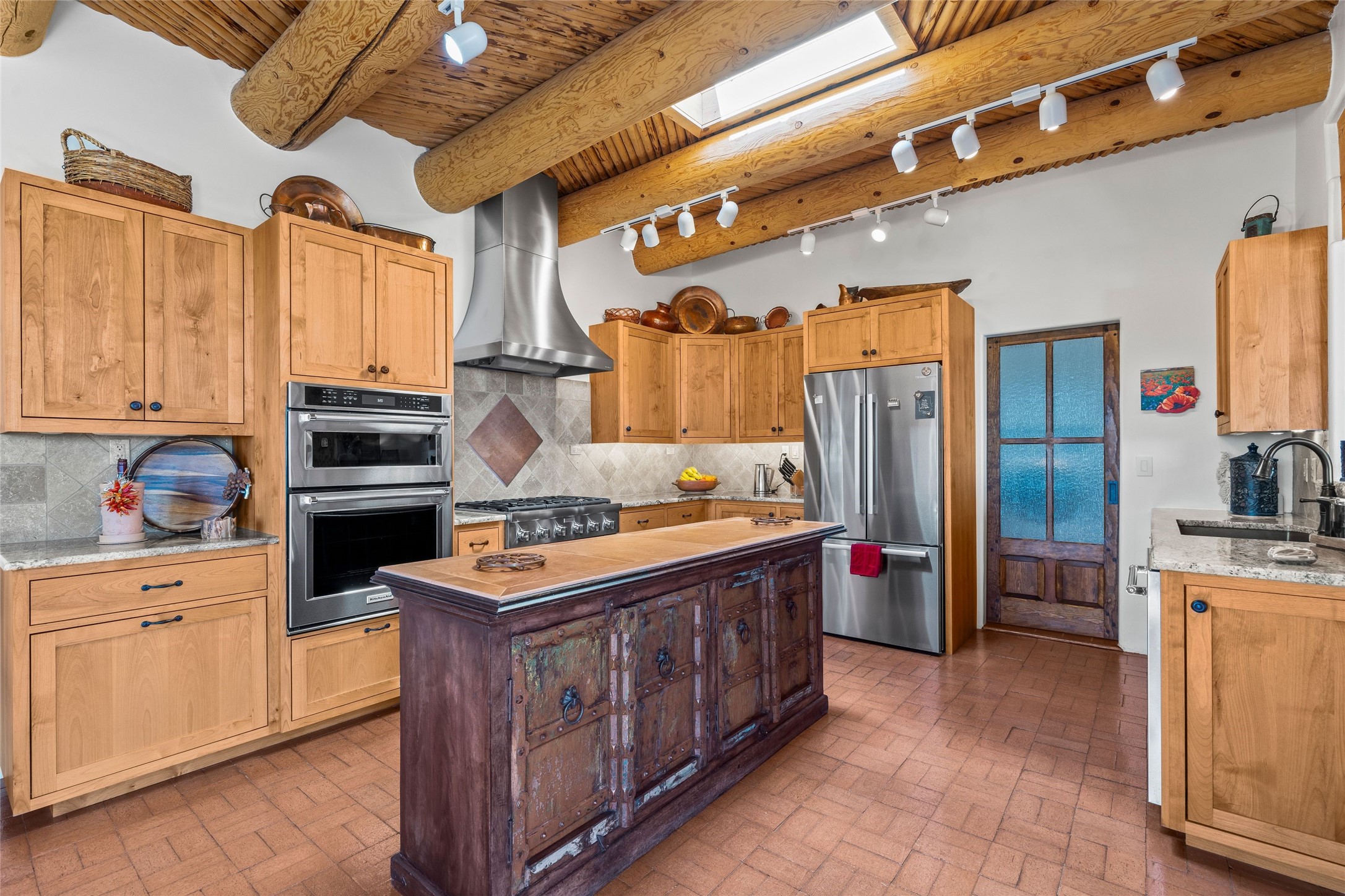 Step through the custom-designed front door and you're instantly welcomed by the charm of traditional Pueblo architecture--soaring ceilings with vigas and latillas, three cozy kiva fireplaces, and classic brick flooring. This thoughtfully updated home features fully remodeled bathrooms and kitchen, fresh paint throughout, redesigned closets, a walled courtyard, an epoxy-coated garage floor, and a modern alarm system. New windows frame breathtaking mountain and sky views from three sides of the home, offering daily front-row seats to spectacular sunrises and sunsets. Enjoy three distinct outdoor living spaces, perfect for relaxing or entertaining in style. Nestled in a serene natural landscape at the end of a quiet cul-de-sac, this home provides exceptional privacy while still being part of a welcoming neighborhood--just 12 minutes from the historic Plaza.