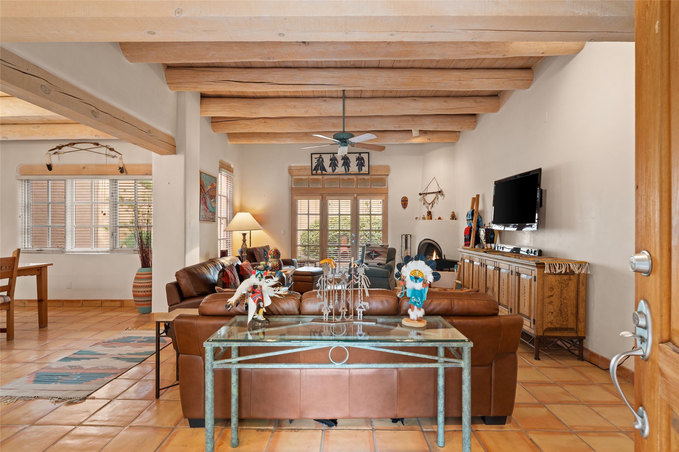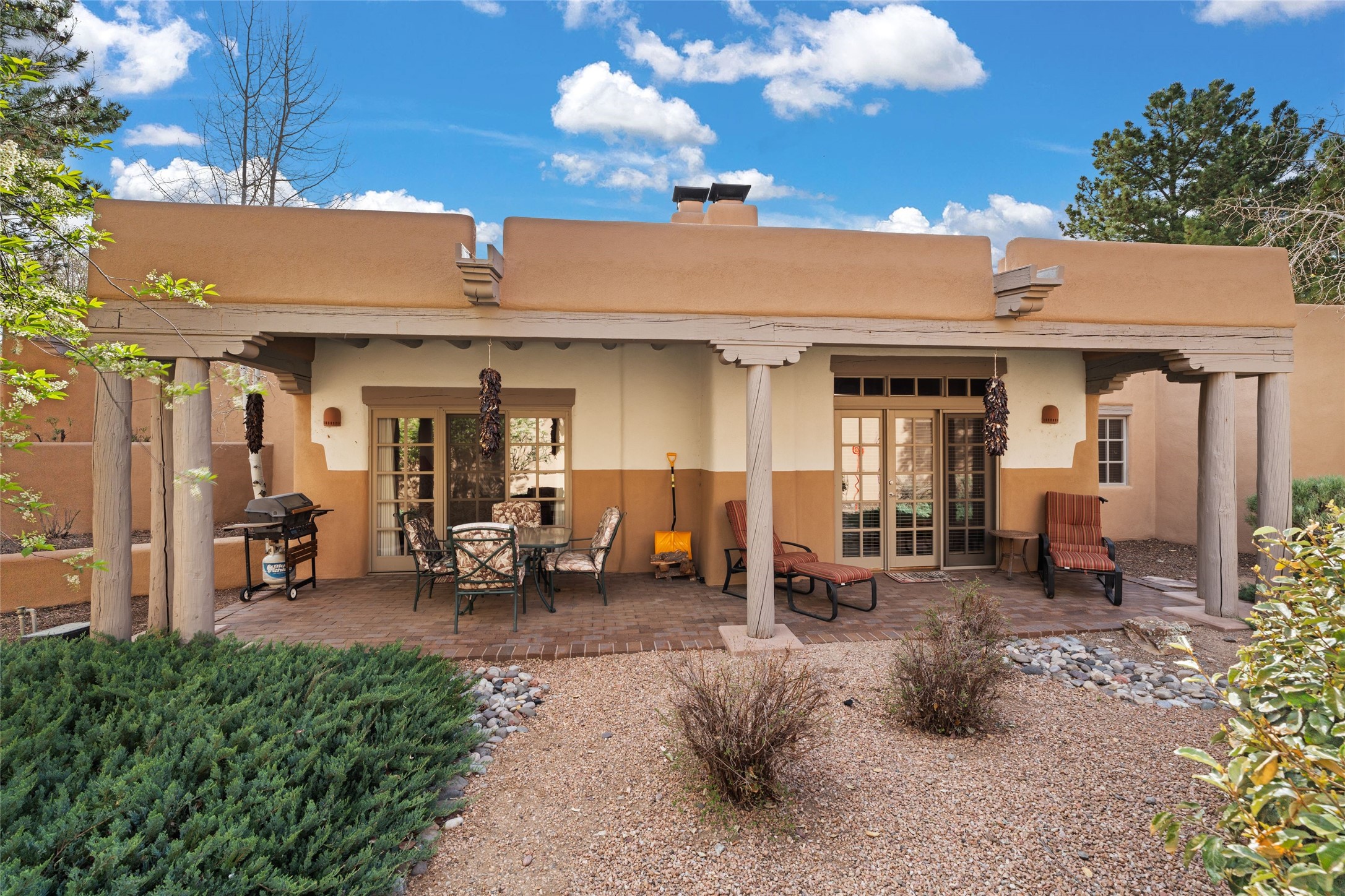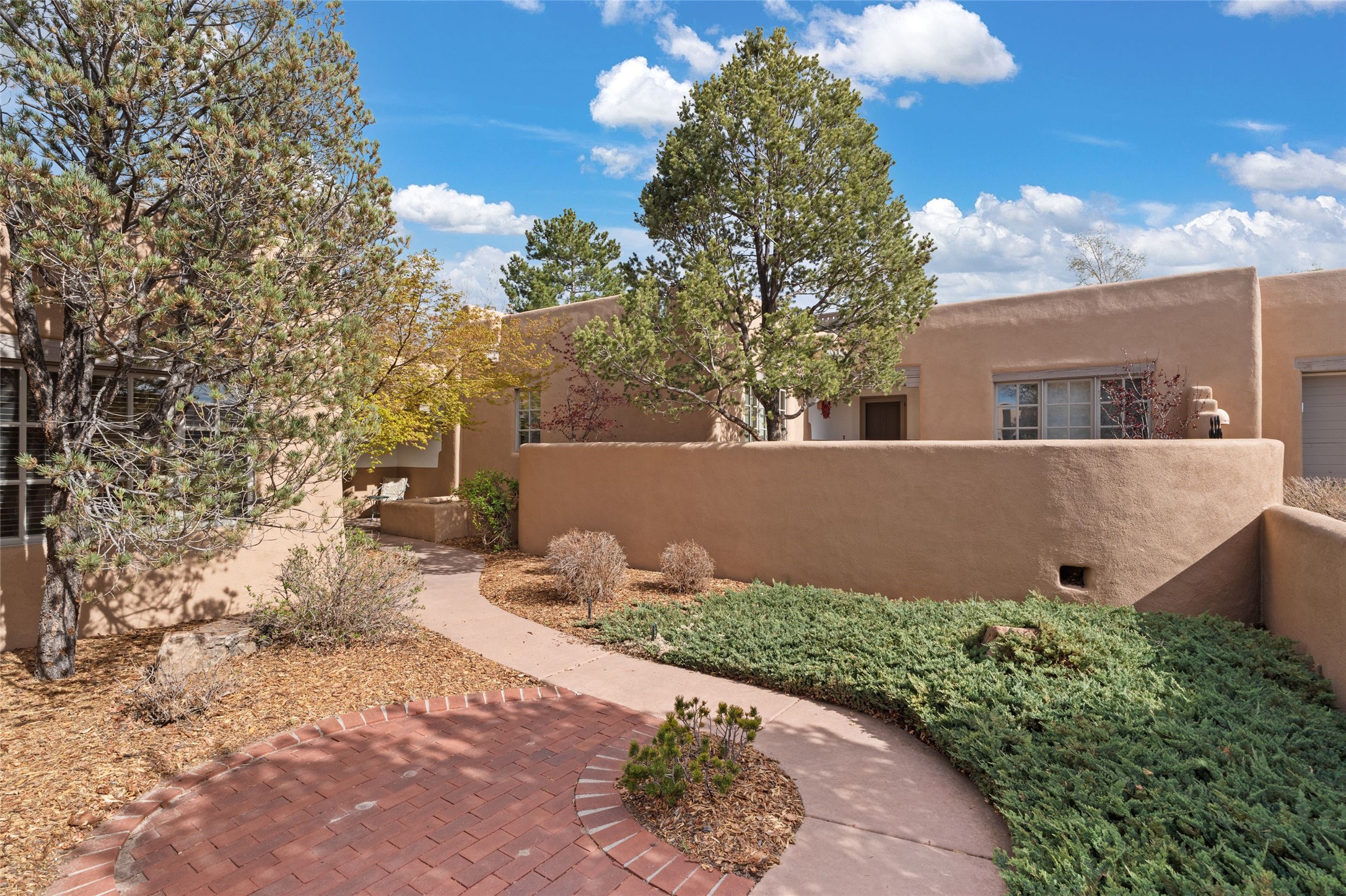 Classic Quail Run Pinon B with delightful outdoor spaces, charming Santa Fe style and an ideal floorplan. Enter through the spacious front courtyard which showcases views of the first green and those fabulous sunsets. The home will greet you with Saltillo floors, open living and optimal separation of bedrooms. Light filled kitchen nook compliments a spacious kitchen which extends to an alluring dining and living area. Sizable primary bedroom features a wood burning Kiva and opens to an ample back portal with lovely high desert landscape. Located on a quiet cul de sac in the midst of Santa Fe's premier condominium resort. Ownership at Quail Run includes 24 hour hosted security, beautiful grounds, state of the art gym and pool, multiple fitness classes, engaging 9 hole golf course, pickleball, tennis and much more. Come and experience!