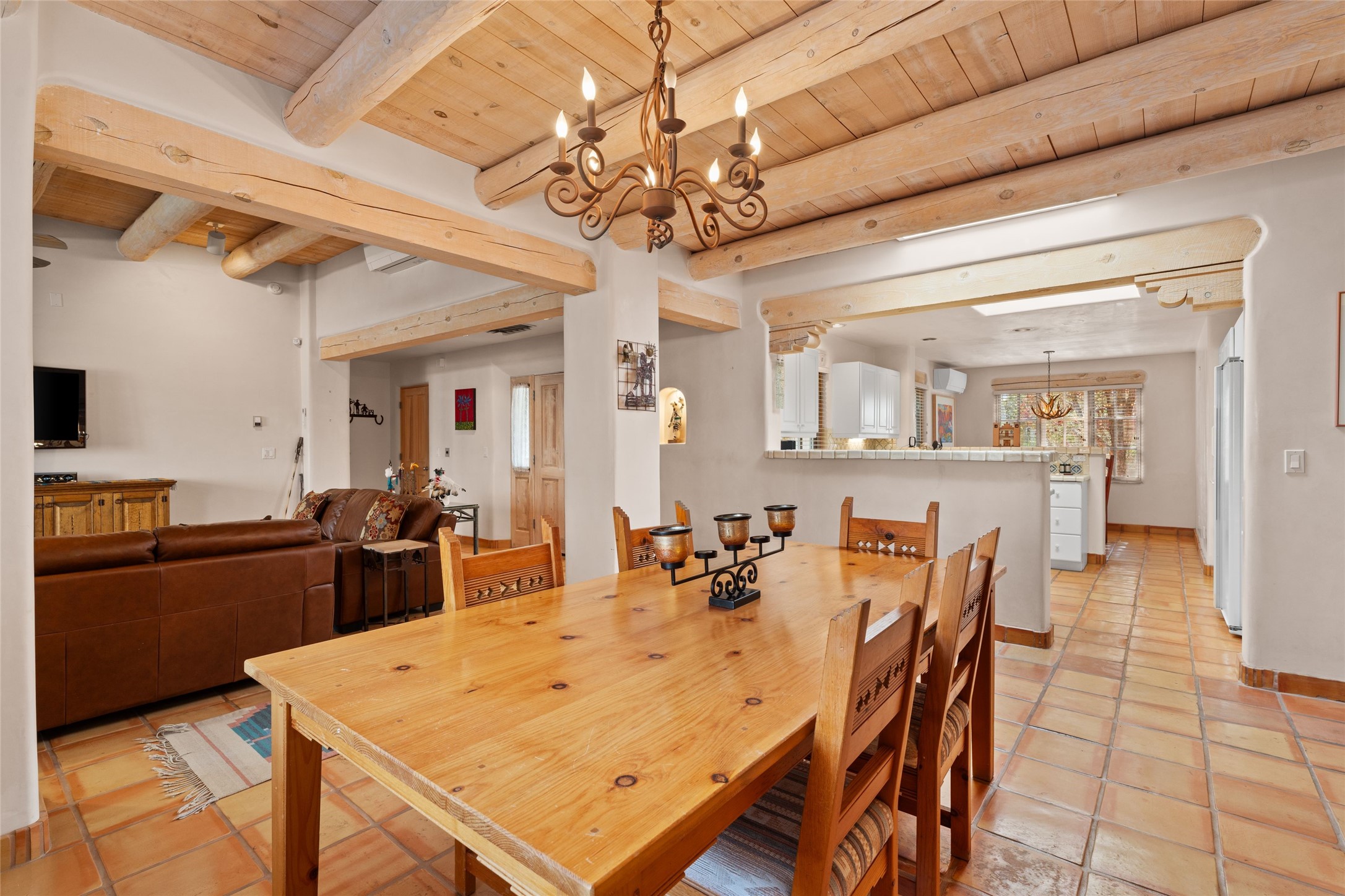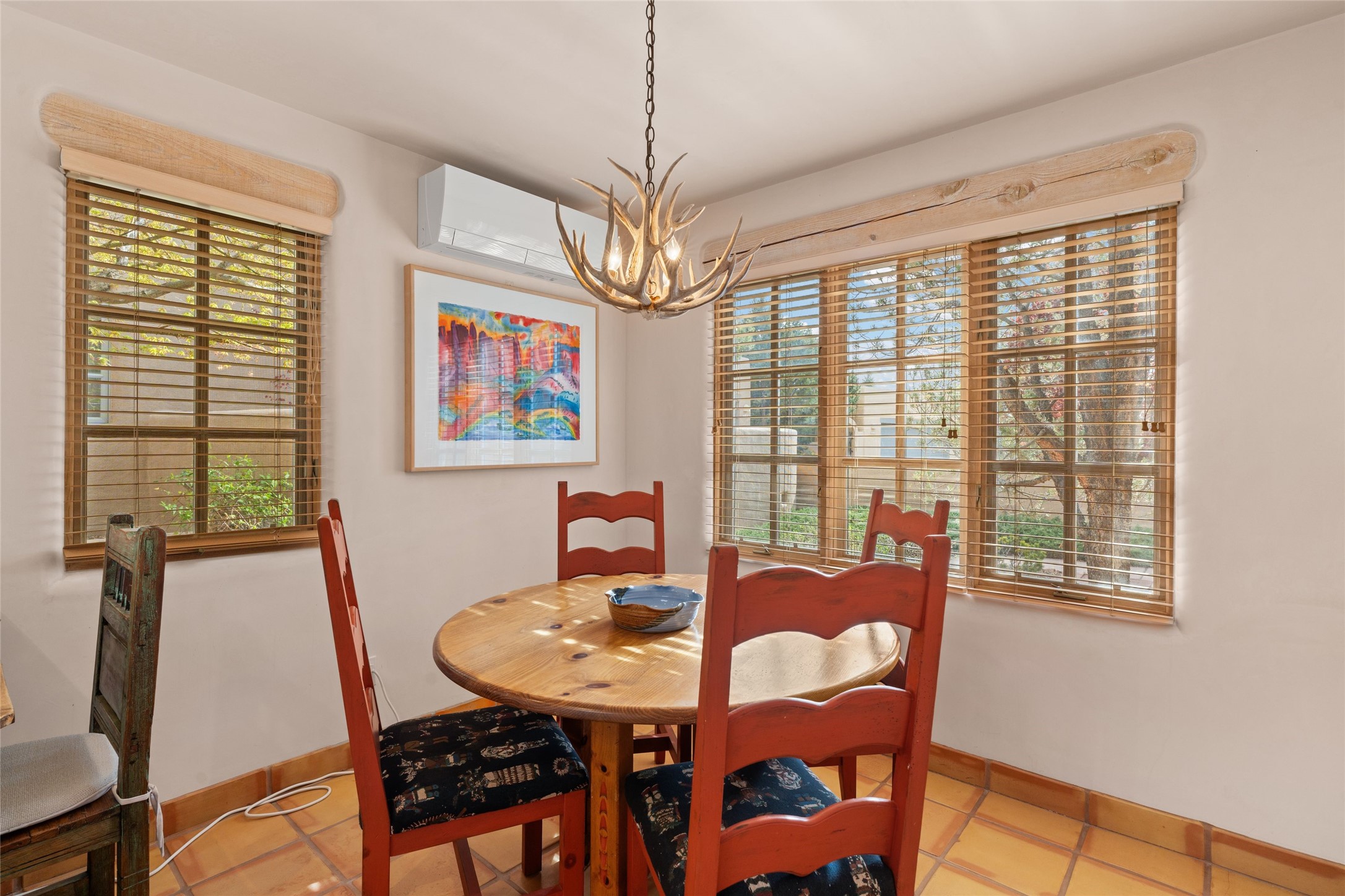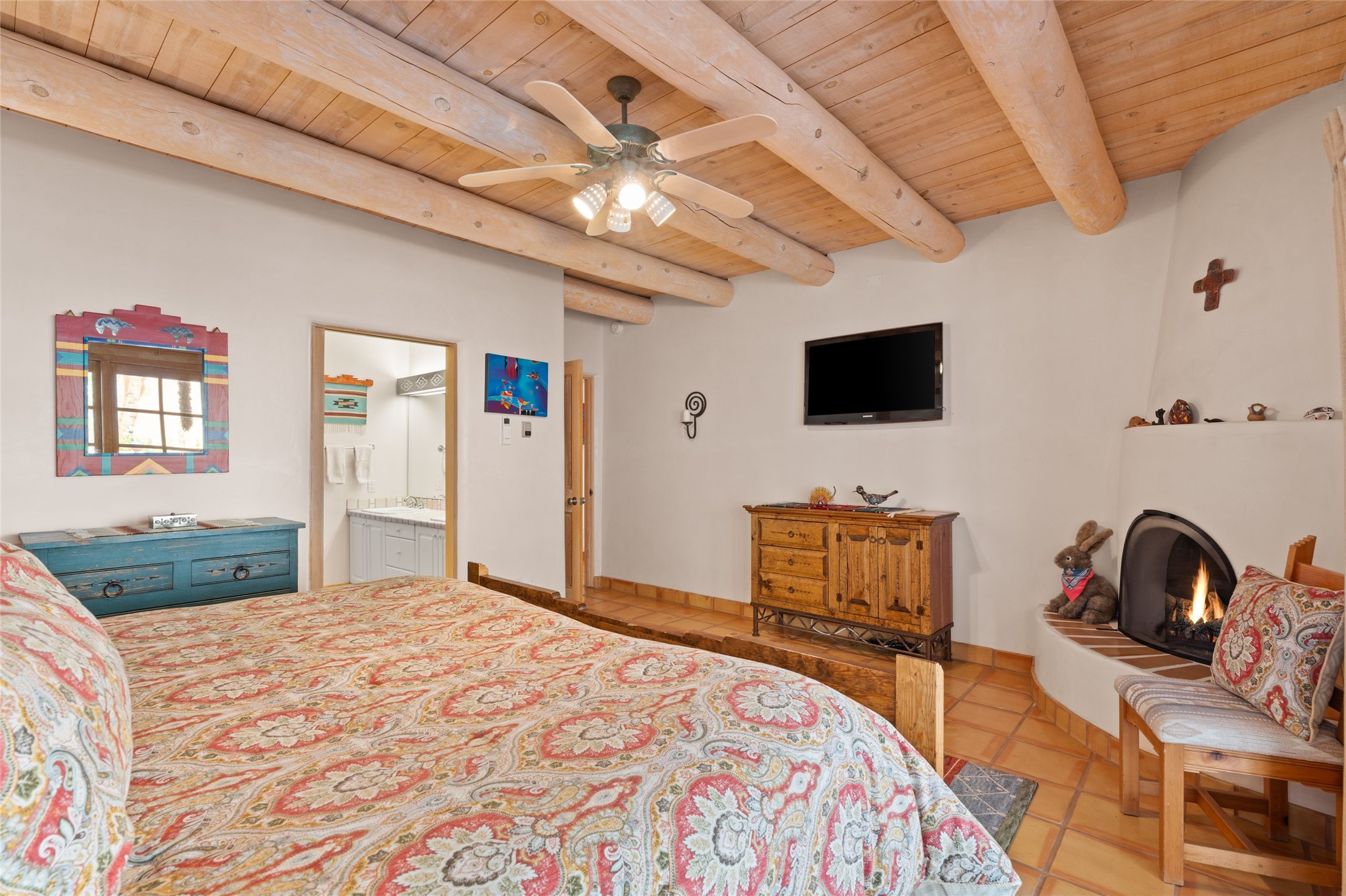 Classic Quail Run Pinon B with delightful outdoor spaces, charming Santa Fe style and an ideal floorplan. Enter through the spacious front courtyard which showcases views of the first green and those fabulous sunsets. The home will greet you with Saltillo floors, open living and optimal separation of bedrooms. Light filled kitchen nook compliments a spacious kitchen which extends to an alluring dining and living area. Sizable primary bedroom features a wood burning Kiva and opens to an ample back portal with lovely high desert landscape. Located on a quiet cul de sac in the midst of Santa Fe's premier condominium resort. Ownership at Quail Run includes 24 hour hosted security, beautiful grounds, state of the art gym and pool, multiple fitness classes, engaging 9 hole golf course, pickleball, tennis and much more. Come and experience!