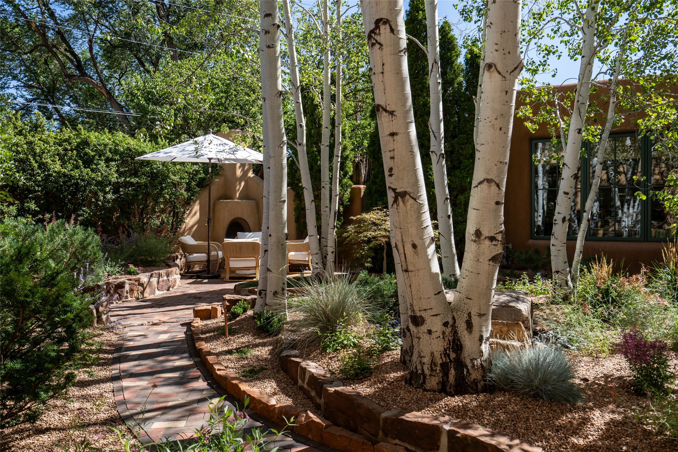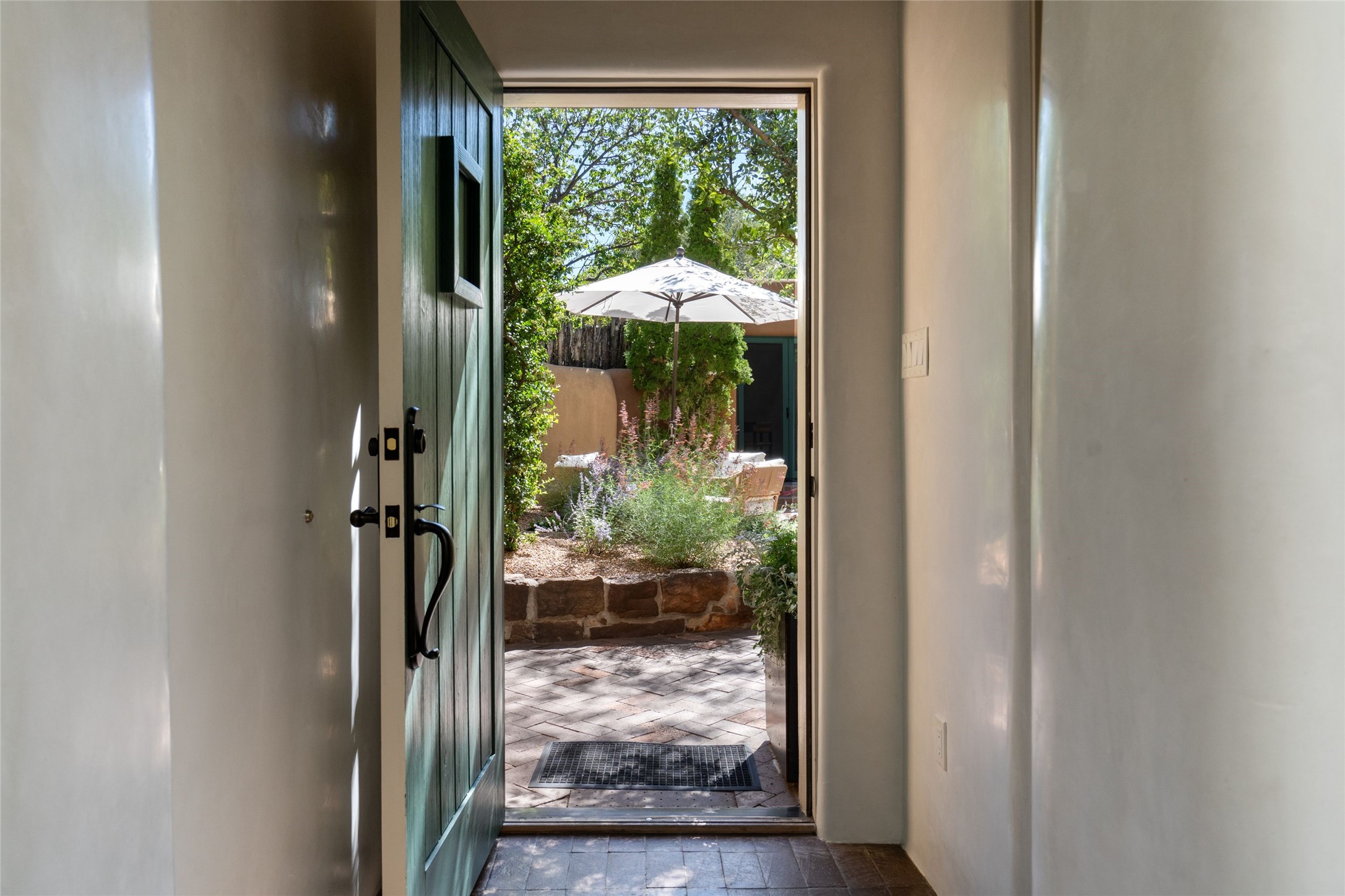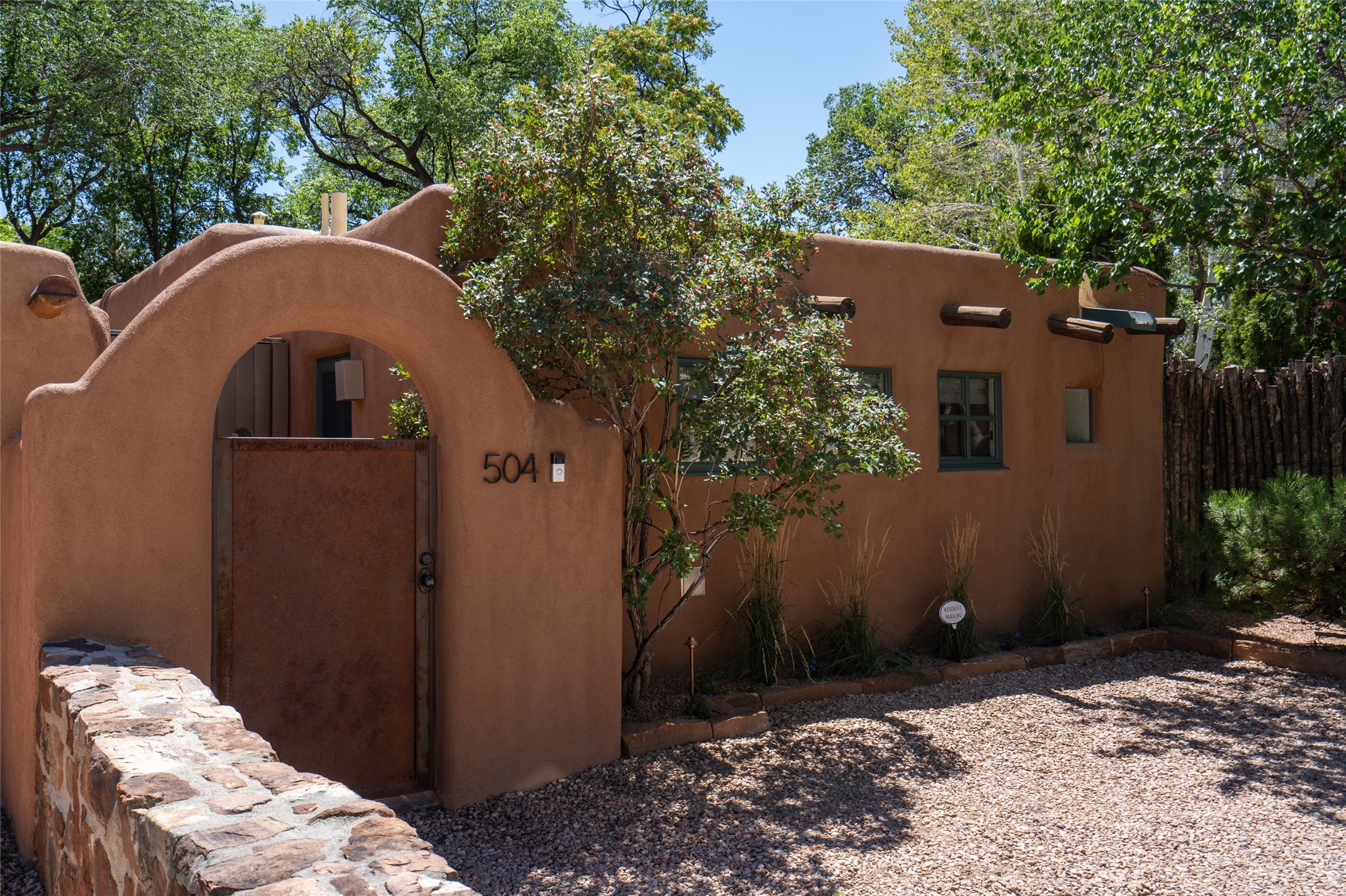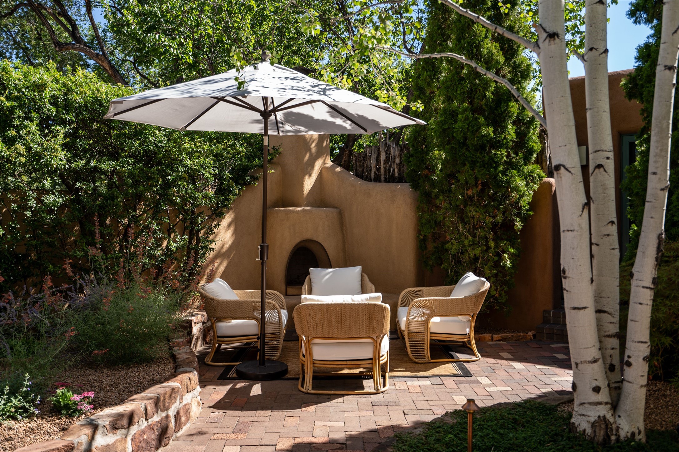 Recently renovated Pueblo-style compound that captures the spirit of Santa Fe in the heart of the coveted Historic Eastside. As you enter this enchanting property, you are greeted by a beautifully landscaped courtyard, a tranquil escape with multiple seating areas, perfect for indulging in quiet moments or lively gatherings. The property exudes old-world charm, featuring five wood-burning fireplaces, traditional vigas and beams, and a delightful mix of brick, tile, and wood floors that create a warm and welcoming atmosphere. The 1,521 sq. ft. main house offers 2 spacious bedrooms and 2.5 elegantly appointed baths. 2 dedicated parking spots lead to a private entrance. The thoughtfully remodeled interior showcases a redesigned kitchen that is both functional and exquisite, featuring custom cabinetry and high-end appliances. New primary suite is adorned with reclaimed terracotta Giallo-style tile, a chic wet bar, and a sophisticated Domingue waterproof plaster bath. Additionally, there is a rare finished 554 sq. ft. basement. Complementing the main residence is a charming 1,216 sq. ft. guesthouse. This newly renovated space features two parking spots and a gated entrance. With its open-concept design and skylights, the guesthouse is bathed in natural light, creating a bright and airy ambiance. Ideally located, just moments away from Downtown Subscription, a local coffee house and gathering spot, as well as Canyon Road, Kakawa Chocolate, and Kaune's Neighborhood Market