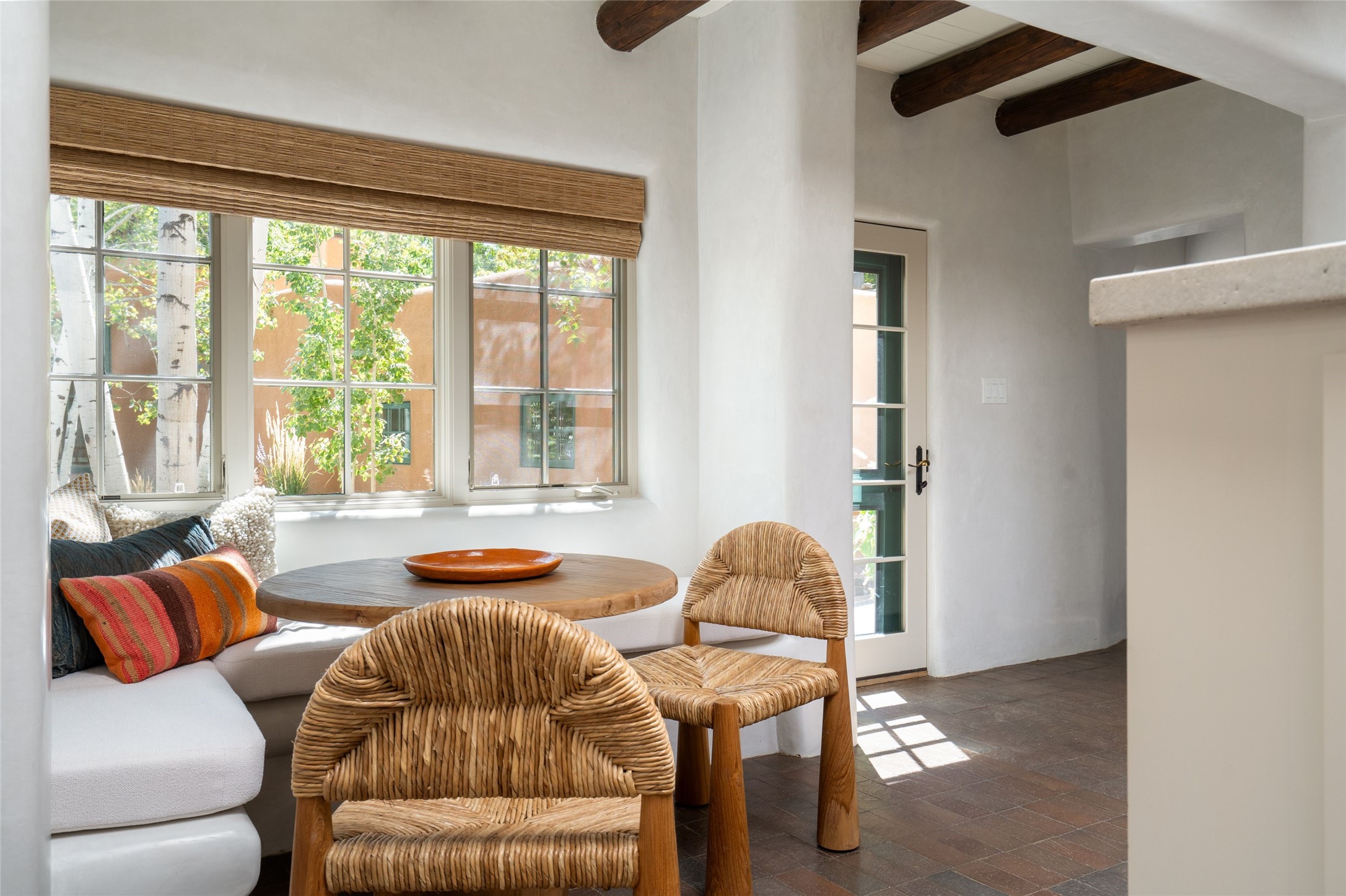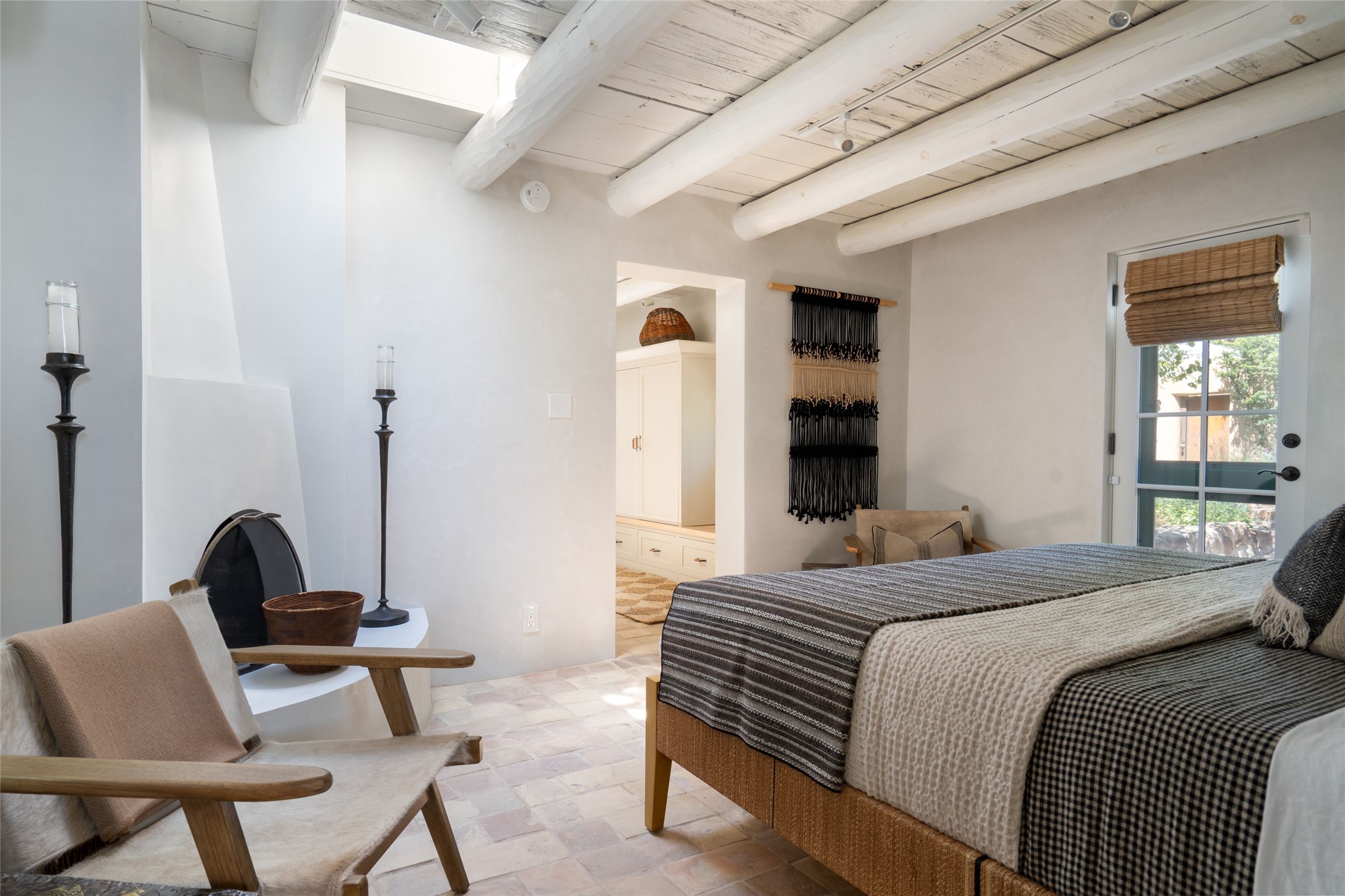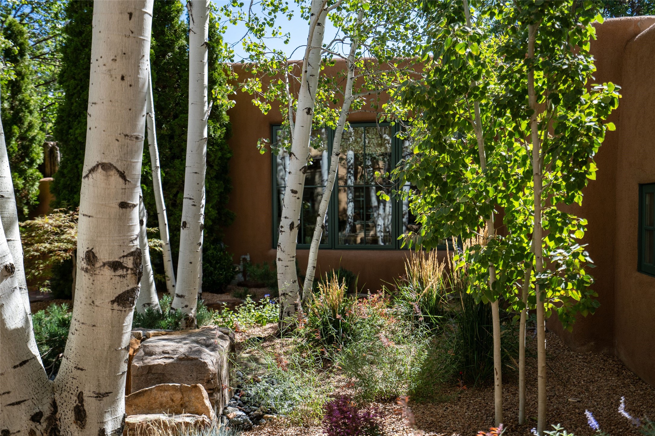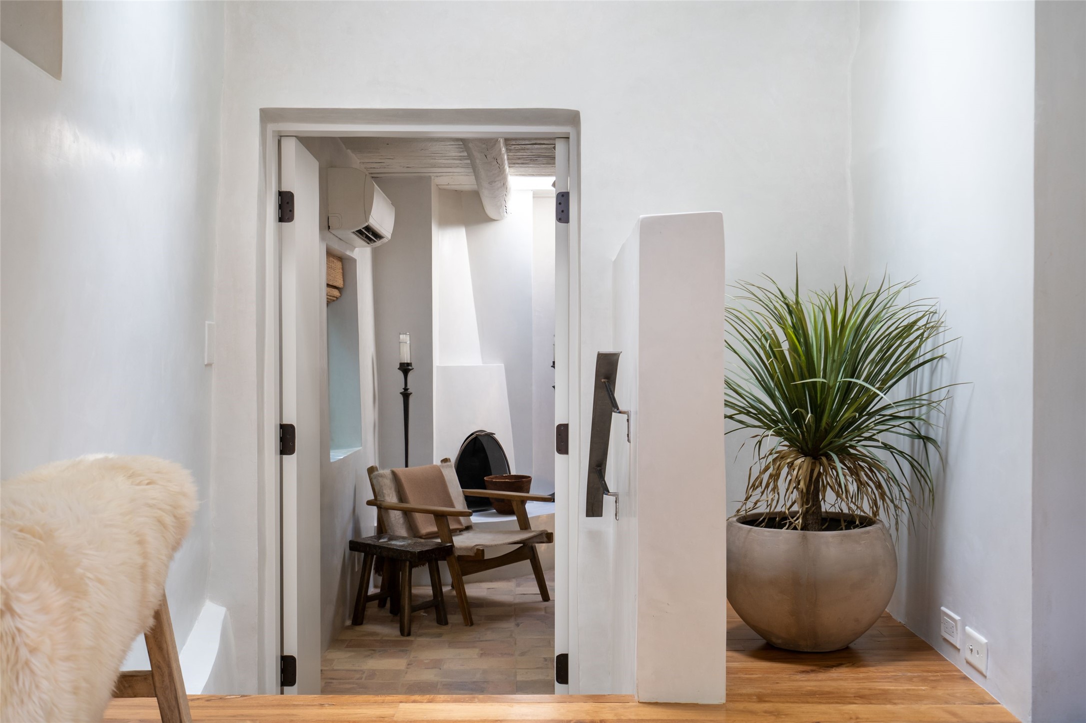 Recently renovated Pueblo-style compound that captures the spirit of Santa Fe in the heart of the coveted Historic Eastside. As you enter this enchanting property, you are greeted by a beautifully landscaped courtyard, a tranquil escape with multiple seating areas, perfect for indulging in quiet moments or lively gatherings. The property exudes old-world charm, featuring five wood-burning fireplaces, traditional vigas and beams, and a delightful mix of brick, tile, and wood floors that create a warm and welcoming atmosphere. The 1,521 sq. ft. main house offers 2 spacious bedrooms and 2.5 elegantly appointed baths. 2 dedicated parking spots lead to a private entrance. The thoughtfully remodeled interior showcases a redesigned kitchen that is both functional and exquisite, featuring custom cabinetry and high-end appliances. New primary suite is adorned with reclaimed terracotta Giallo-style tile, a chic wet bar, and a sophisticated Domingue waterproof plaster bath. Additionally, there is a rare finished 554 sq. ft. basement. Complementing the main residence is a charming 1,216 sq. ft. guesthouse. This newly renovated space features two parking spots and a gated entrance. With its open-concept design and skylights, the guesthouse is bathed in natural light, creating a bright and airy ambiance. Ideally located, just moments away from Downtown Subscription, a local coffee house and gathering spot, as well as Canyon Road, Kakawa Chocolate, and Kaune's Neighborhood Market