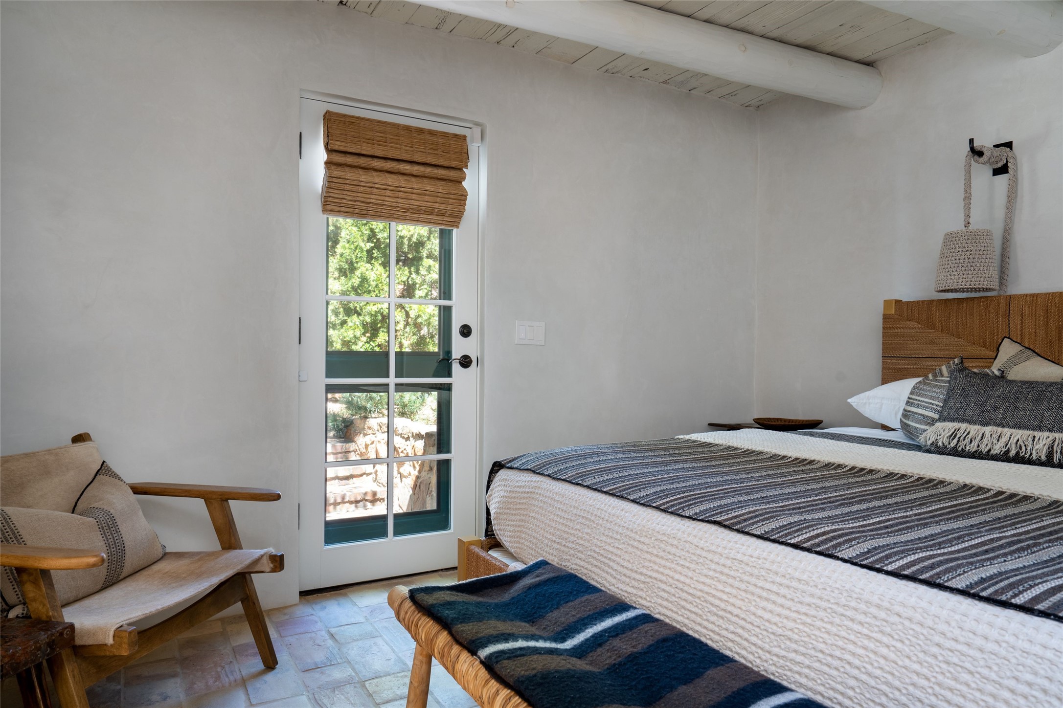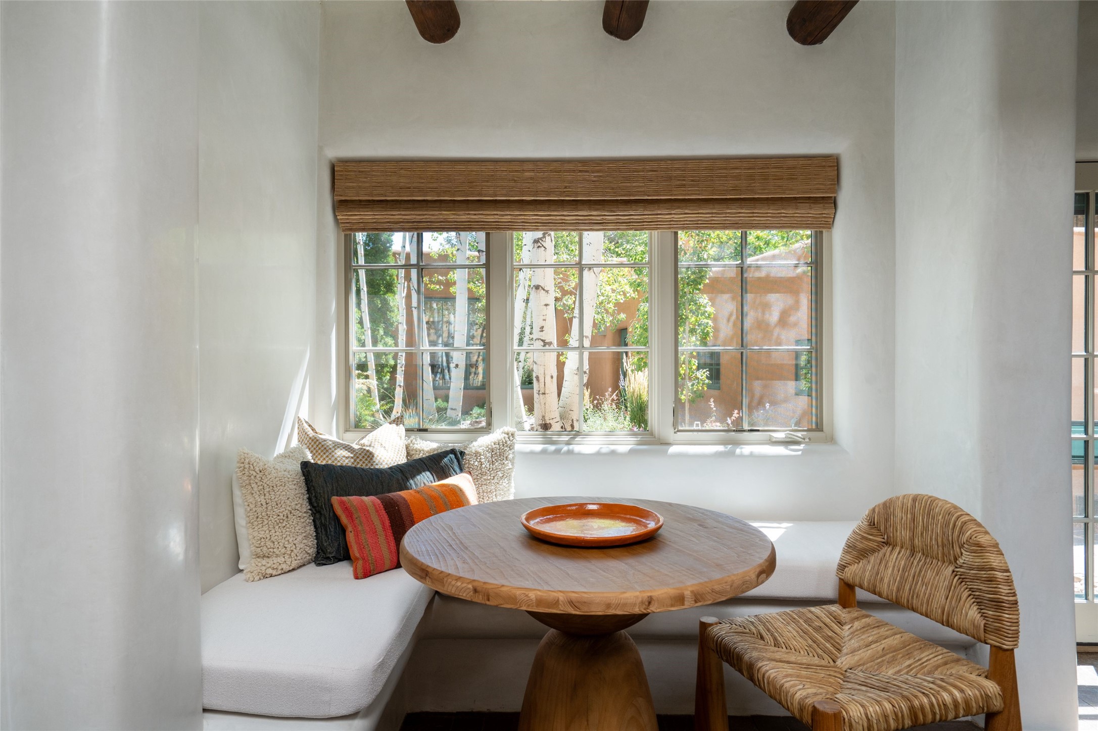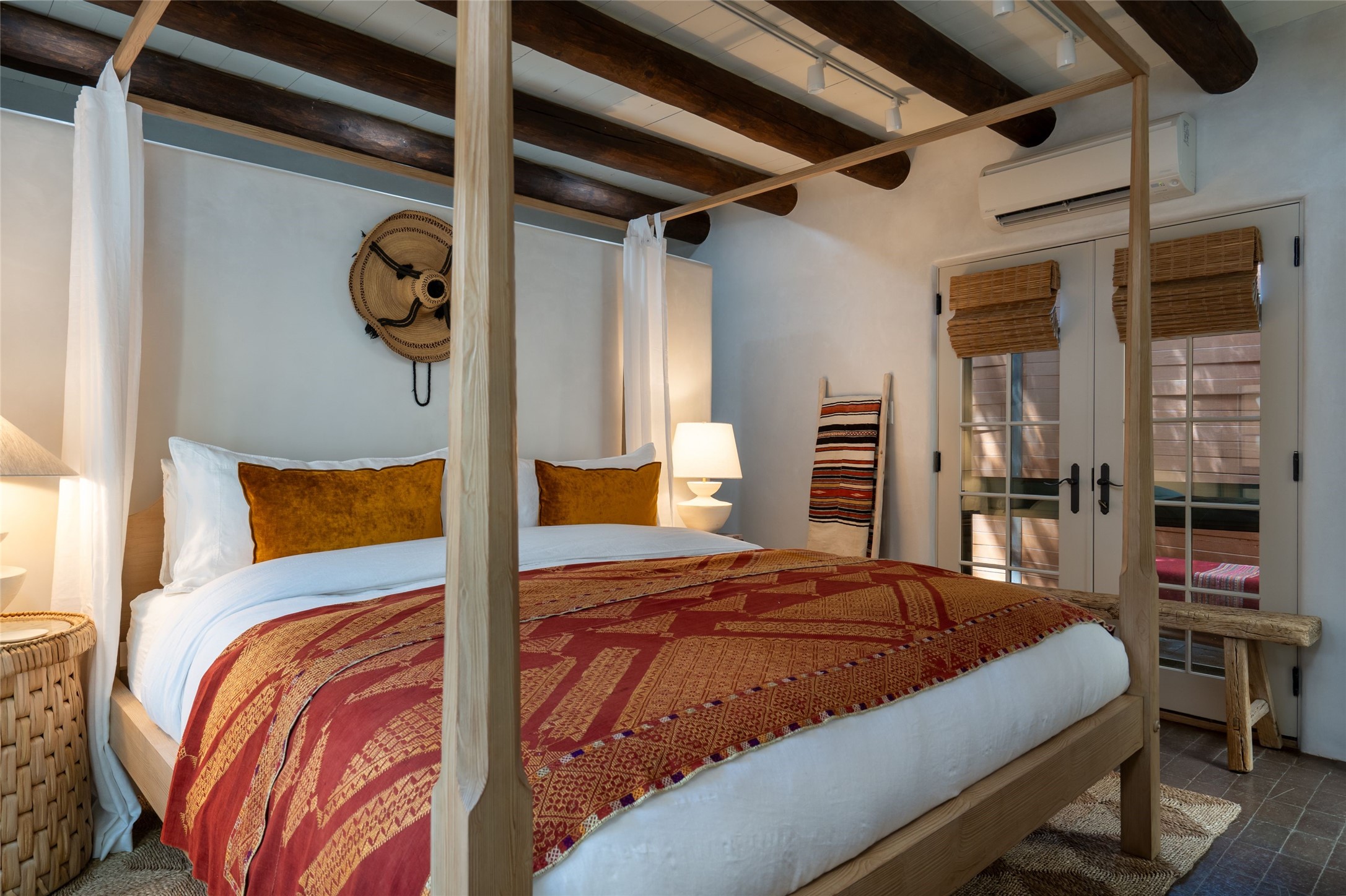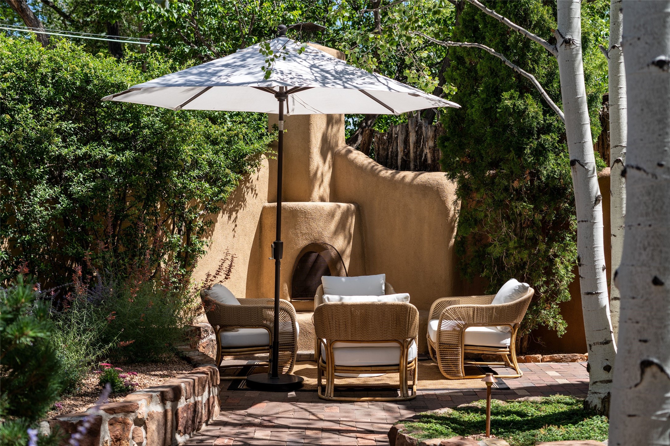 Recently renovated Pueblo-style compound that captures the spirit of Santa Fe in the heart of the coveted Historic Eastside. As you enter this enchanting property, you are greeted by a beautifully landscaped courtyard, a tranquil escape with multiple seating areas, perfect for indulging in quiet moments or lively gatherings. The property exudes old-world charm, featuring five wood-burning fireplaces, traditional vigas and beams, and a delightful mix of brick, tile, and wood floors that create a warm and welcoming atmosphere. The 1,521 sq. ft. main house offers 2 spacious bedrooms and 2.5 elegantly appointed baths. 2 dedicated parking spots lead to a private entrance. The thoughtfully remodeled interior showcases a redesigned kitchen that is both functional and exquisite, featuring custom cabinetry and high-end appliances. New primary suite is adorned with reclaimed terracotta Giallo-style tile, a chic wet bar, and a sophisticated Domingue waterproof plaster bath. Additionally, there is a rare finished 554 sq. ft. basement. Complementing the main residence is a charming 1,216 sq. ft. guesthouse. This newly renovated space features two parking spots and a gated entrance. With its open-concept design and skylights, the guesthouse is bathed in natural light, creating a bright and airy ambiance. Ideally located, just moments away from Downtown Subscription, a local coffee house and gathering spot, as well as Canyon Road, Kakawa Chocolate, and Kaune's Neighborhood Market
