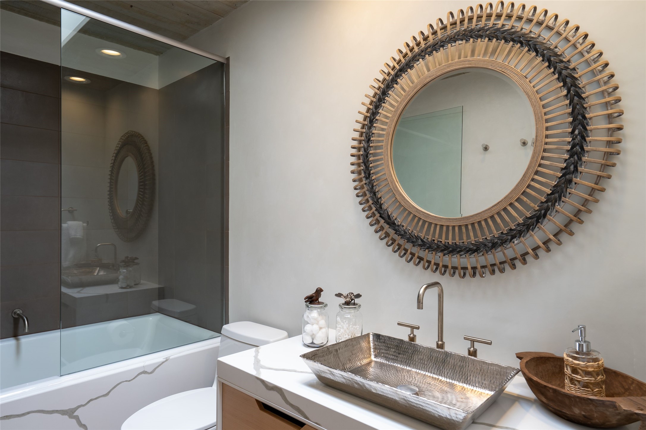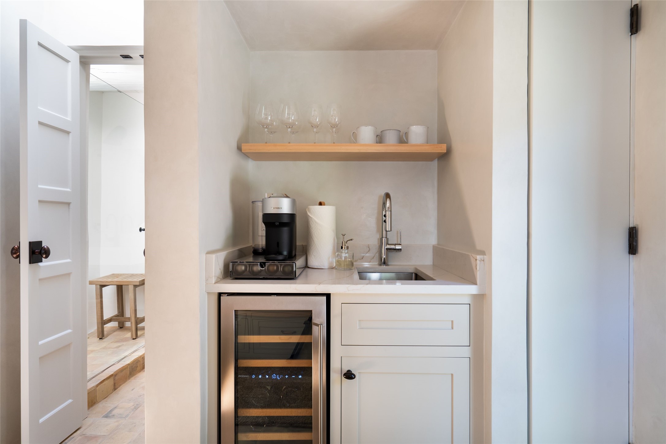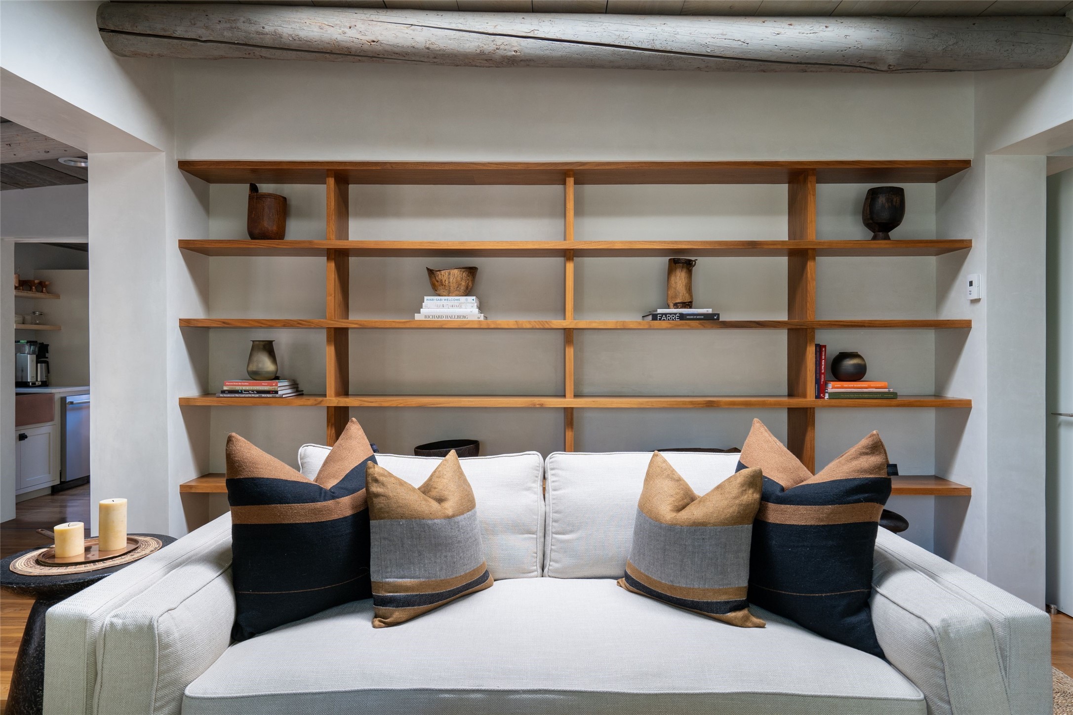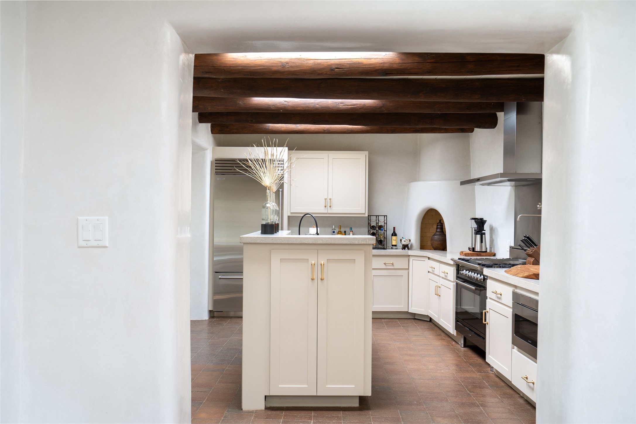 Recently renovated Pueblo-style compound that captures the spirit of Santa Fe in the heart of the coveted Historic Eastside. As you enter this enchanting property, you are greeted by a beautifully landscaped courtyard, a tranquil escape with multiple seating areas, perfect for indulging in quiet moments or lively gatherings. The property exudes old-world charm, featuring five wood-burning fireplaces, traditional vigas and beams, and a delightful mix of brick, tile, and wood floors that create a warm and welcoming atmosphere. The 1,521 sq. ft. main house offers 2 spacious bedrooms and 2.5 elegantly appointed baths. 2 dedicated parking spots lead to a private entrance. The thoughtfully remodeled interior showcases a redesigned kitchen that is both functional and exquisite, featuring custom cabinetry and high-end appliances. New primary suite is adorned with reclaimed terracotta Giallo-style tile, a chic wet bar, and a sophisticated Domingue waterproof plaster bath. Additionally, there is a rare finished 554 sq. ft. basement. Complementing the main residence is a charming 1,216 sq. ft. guesthouse. This newly renovated space features two parking spots and a gated entrance. With its open-concept design and skylights, the guesthouse is bathed in natural light, creating a bright and airy ambiance. Ideally located, just moments away from Downtown Subscription, a local coffee house and gathering spot, as well as Canyon Road, Kakawa Chocolate, and Kaune's Neighborhood Market