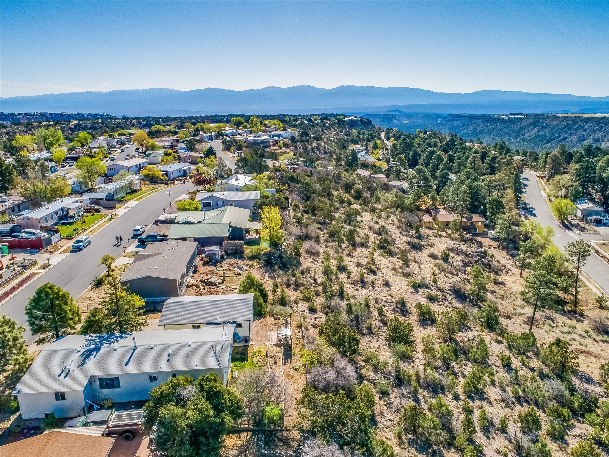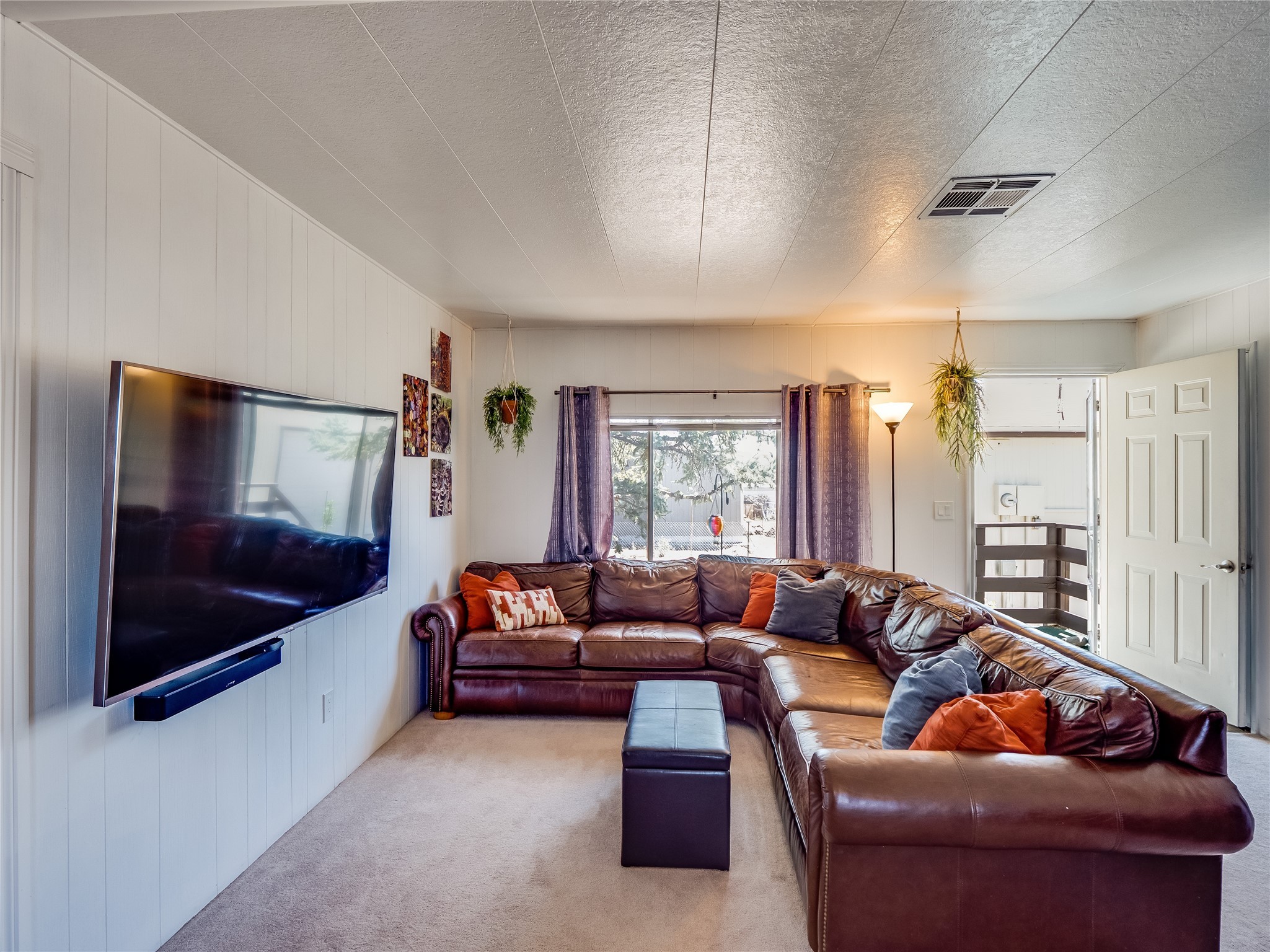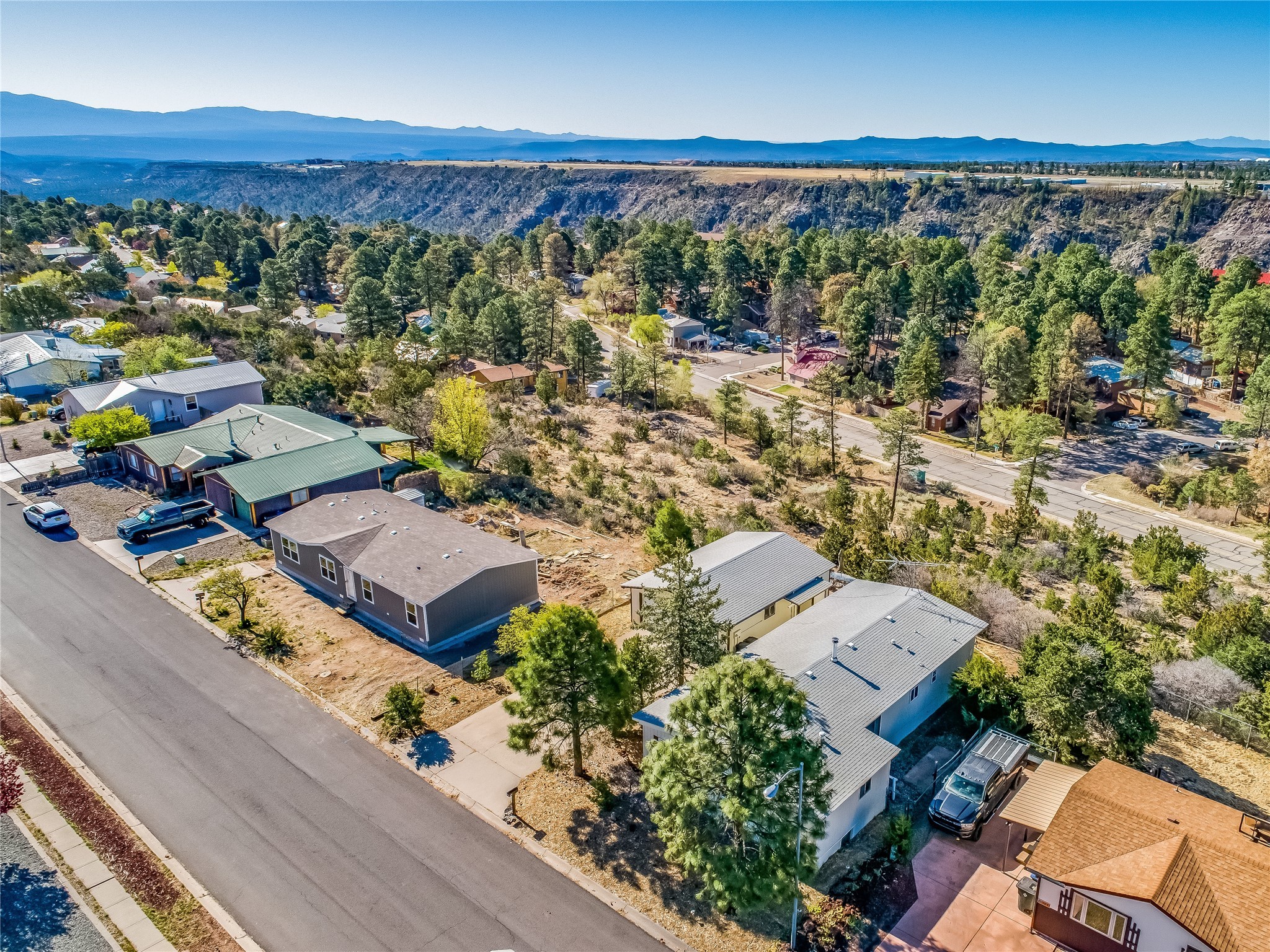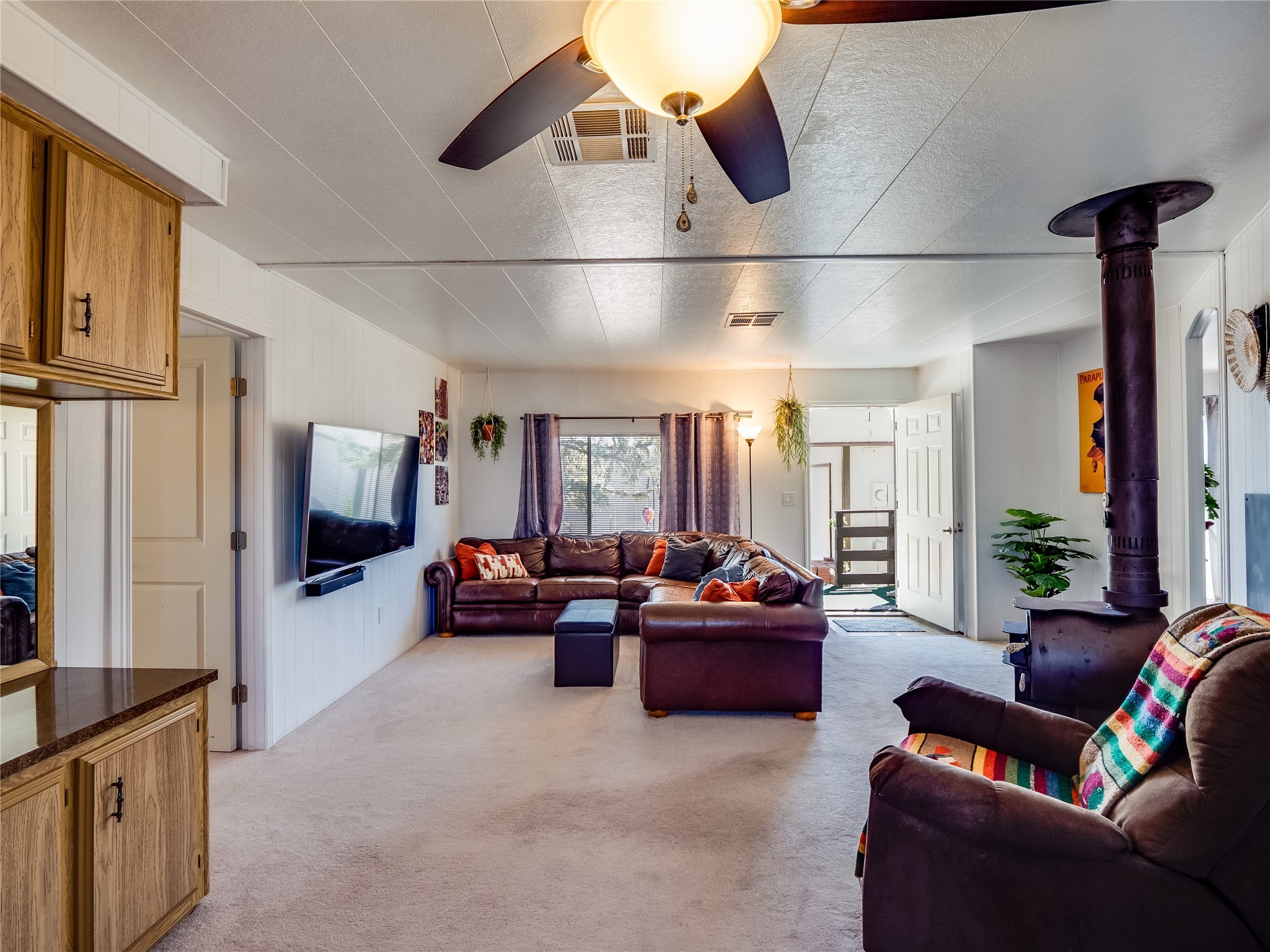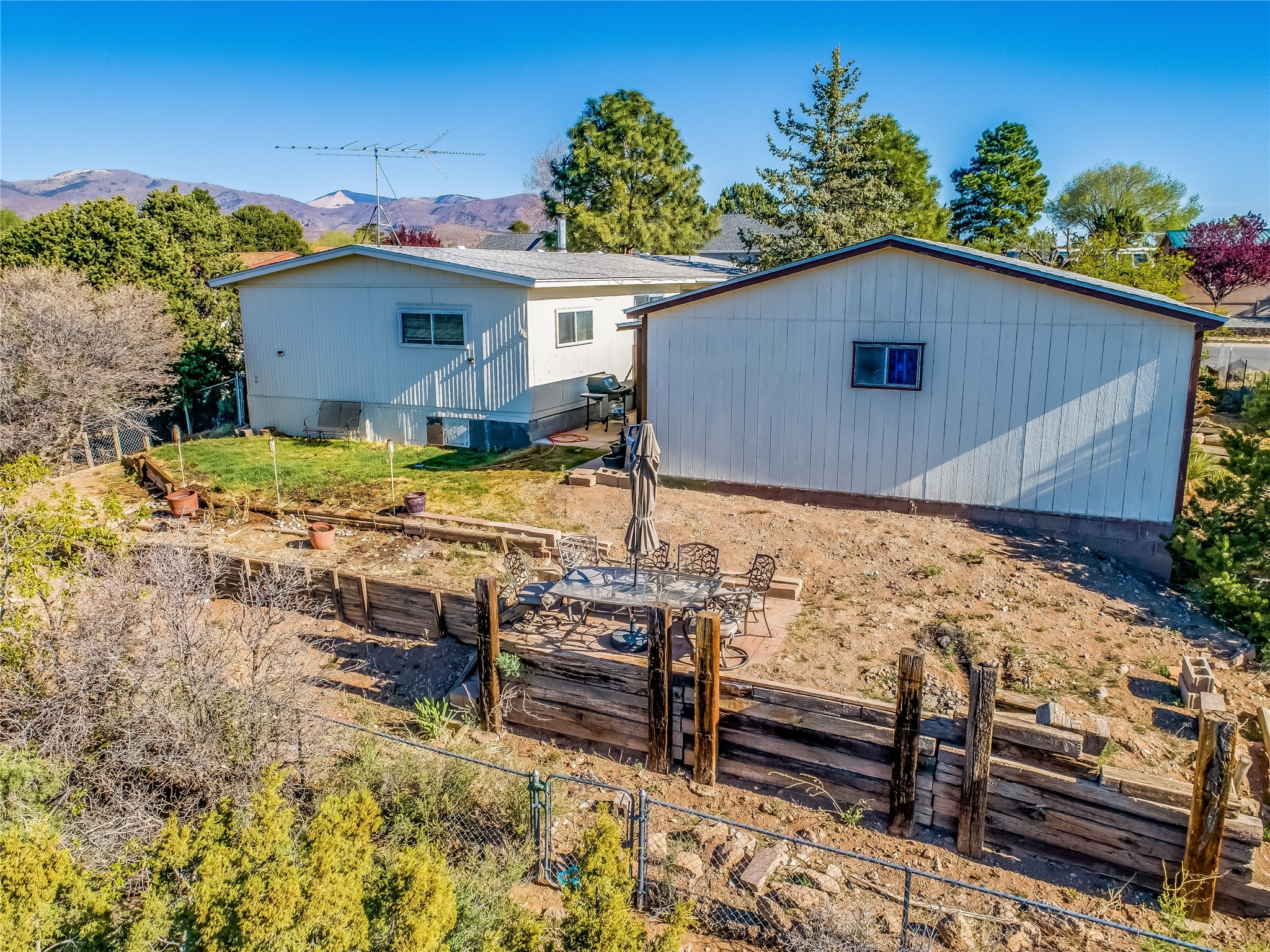 Welcome to this charming manufactured home nestled along the canyon edge in the peaceful Tsikumu Village neighborhood. Surrounded by nature and mature landscaping, the front yard boasts large, towering trees that frame the home and provide shade and privacy as you approach the front porch. Step up into the inviting entryway and immediately feel the warmth of the spacious carpeted living room that extends throughout the home. Cozy up by the wood-burning stove on chilly evenings, and enjoy the built-in cabinetry--perfect for displaying china or creating a convenient bar setup. The kitchen is both stylish and functional, featuring ample cabinet space with green cabinetry, black hardware, light countertops, a double oven, and a gas cooktop. A peninsula with bar seating offers a perfect spot for morning coffee or casual meals. Just off the kitchen is a bright dining area with sliding glass doors that open to the back patio--ideal for outdoor grilling and dining with a view. The generous primary en-suite is a private retreat with a large walk-in closet and an attached bathroom that includes a double sink vanity and a shower/tub combination. Two additional guest bedrooms offer comfortable accommodations, and a full guest bathroom with a single sink vanity serves the home. The laundry room leads to a versatile bonus room with a separate side entrance--great for a home office, studio, or hobby space. Outside, enjoy an open backyard with unobstructed views and stunning sights of the Sangre de Cristo Mountains. A grass lawn, a brick patio for entertaining, and retaining walls ideal for flower or vegetable gardens make this outdoor space versatile in creating your dream space. Located close to parks, scenic trails, and horse stalls, this home offers the perfect blend of comfort, convenience, and natural beauty. Book your tour today!