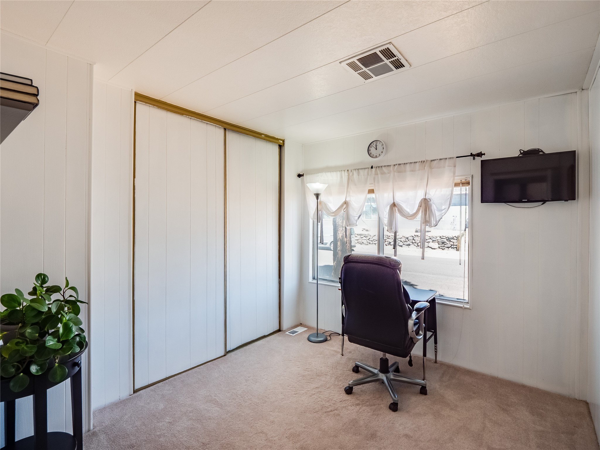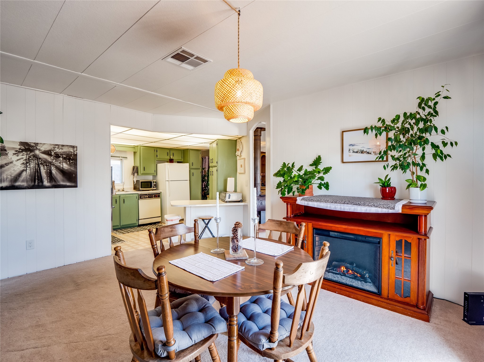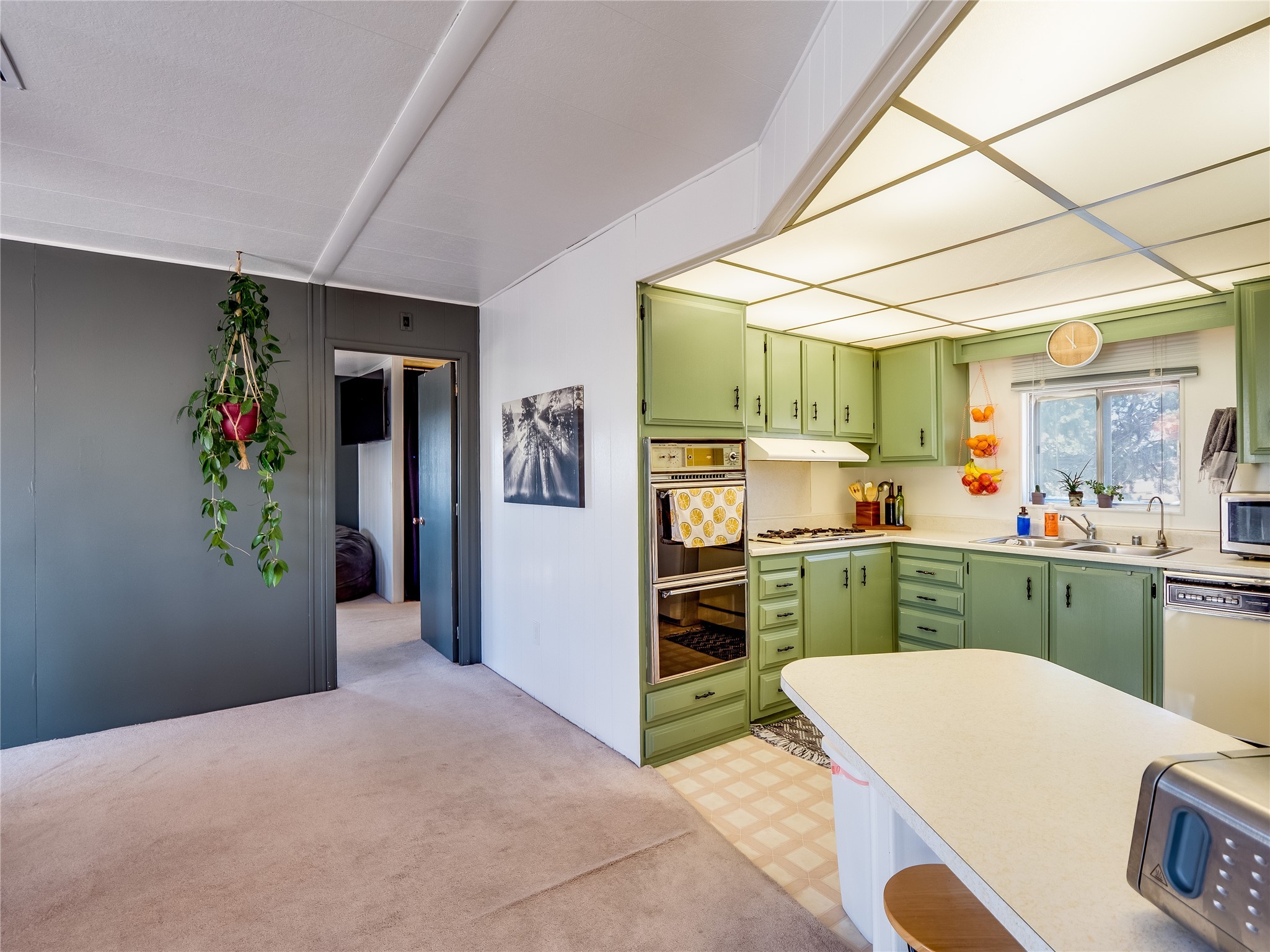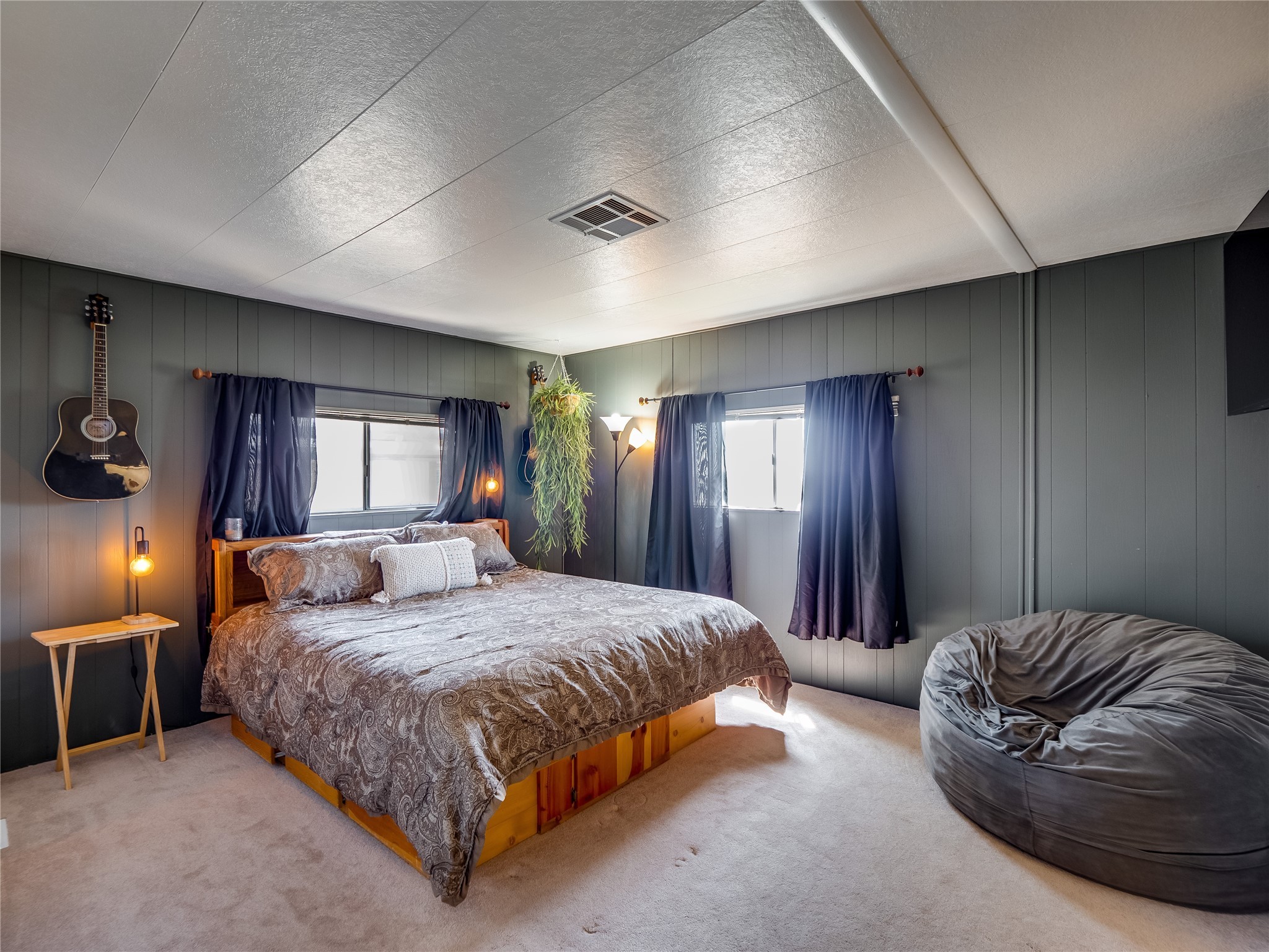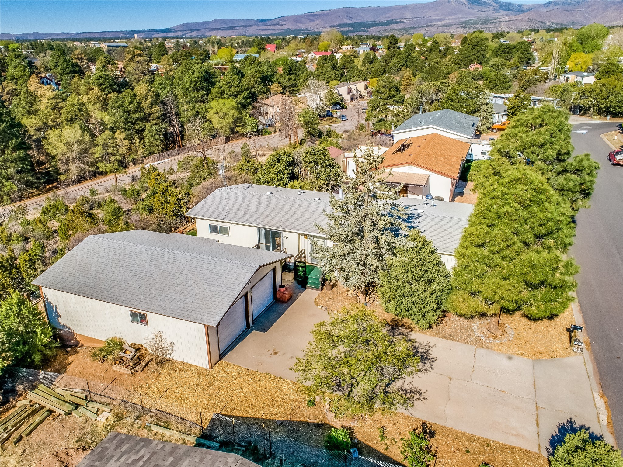 Welcome to this charming manufactured home nestled along the canyon edge in the peaceful Tsikumu Village neighborhood. Surrounded by nature and mature landscaping, the front yard boasts large, towering trees that frame the home and provide shade and privacy as you approach the front porch. Step up into the inviting entryway and immediately feel the warmth of the spacious carpeted living room that extends throughout the home. Cozy up by the wood-burning stove on chilly evenings, and enjoy the built-in cabinetry--perfect for displaying china or creating a convenient bar setup. The kitchen is both stylish and functional, featuring ample cabinet space with green cabinetry, black hardware, light countertops, a double oven, and a gas cooktop. A peninsula with bar seating offers a perfect spot for morning coffee or casual meals. Just off the kitchen is a bright dining area with sliding glass doors that open to the back patio--ideal for outdoor grilling and dining with a view. The generous primary en-suite is a private retreat with a large walk-in closet and an attached bathroom that includes a double sink vanity and a shower/tub combination. Two additional guest bedrooms offer comfortable accommodations, and a full guest bathroom with a single sink vanity serves the home. The laundry room leads to a versatile bonus room with a separate side entrance--great for a home office, studio, or hobby space. Outside, enjoy an open backyard with unobstructed views and stunning sights of the Sangre de Cristo Mountains. A grass lawn, a brick patio for entertaining, and retaining walls ideal for flower or vegetable gardens make this outdoor space versatile in creating your dream space. Located close to parks, scenic trails, and horse stalls, this home offers the perfect blend of comfort, convenience, and natural beauty. Book your tour today!