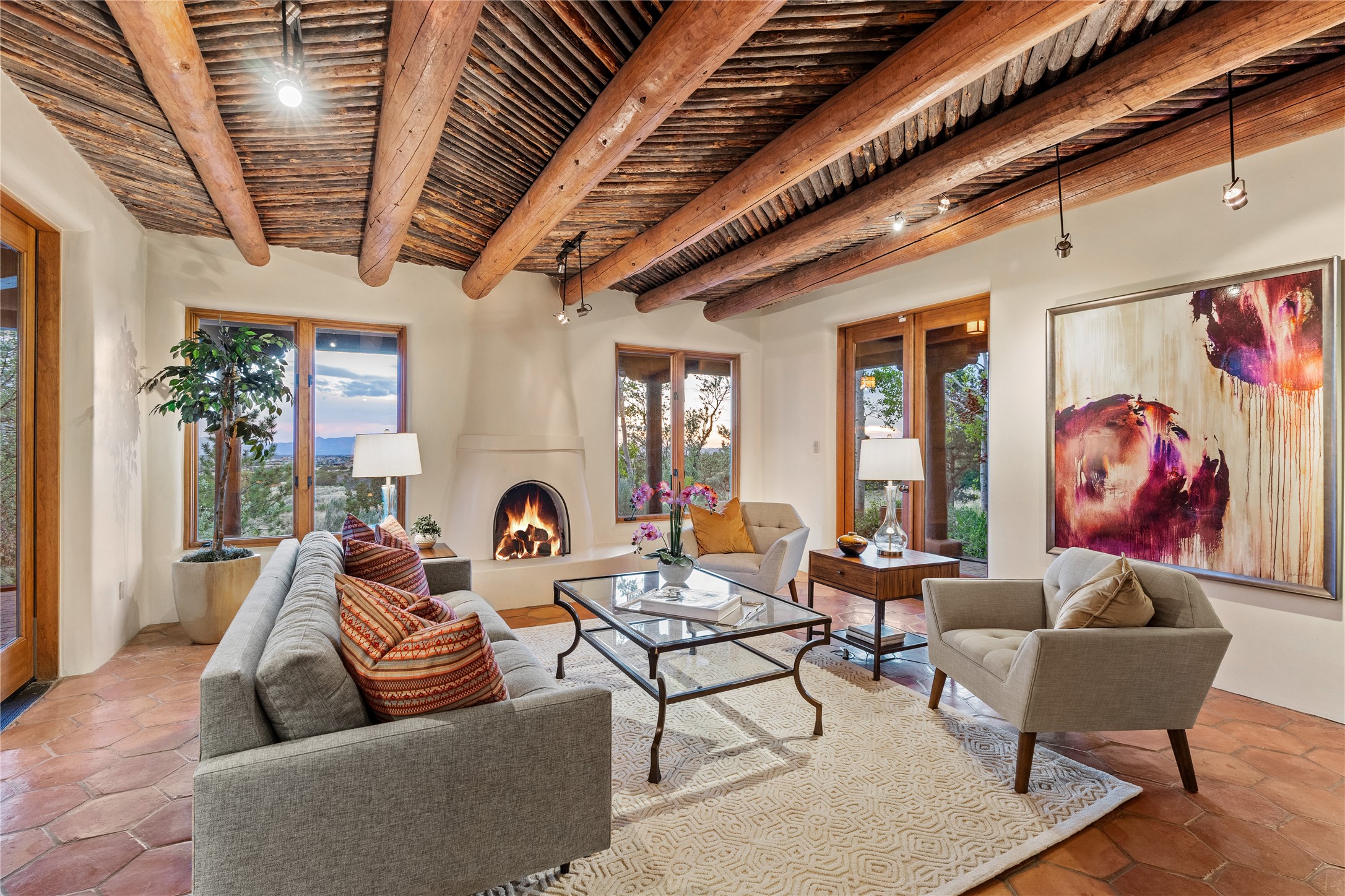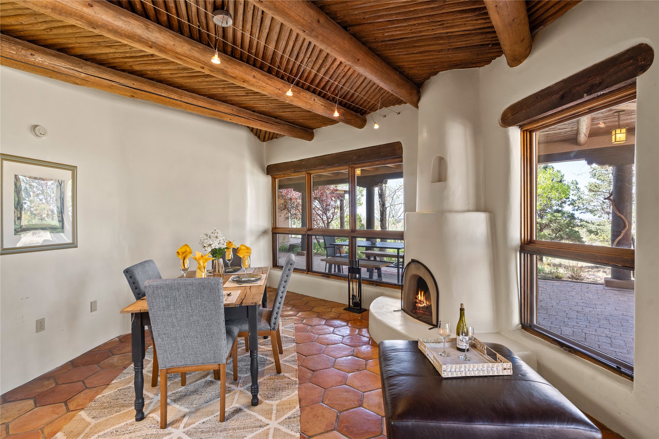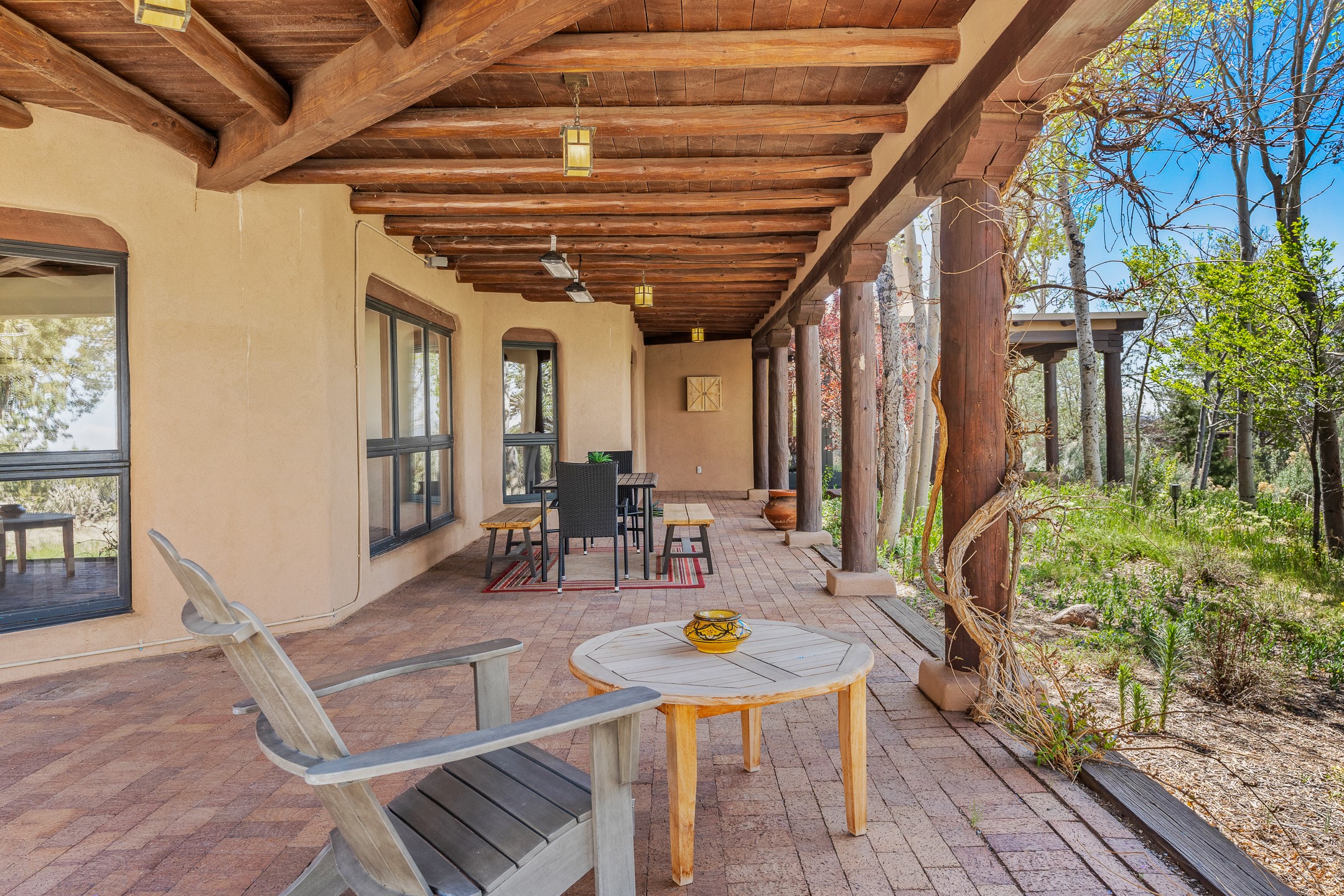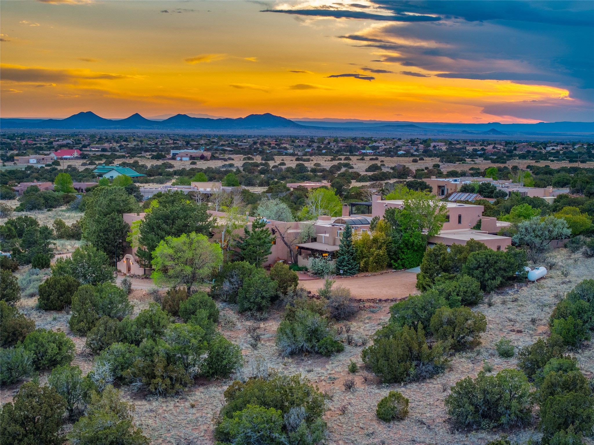 Incredible, rare, and versatile live/work opportunity off HWY 285.Situated on 11.07 acres, this unique property blends Santa Fe's old-world charm with modern style, offering a 5,481 sq. ft. main house and a 3539 sq. ft. guest house/studio. There are 4 large bedrooms, 2 full bathrooms, 3 3/4 bathrooms and 4 half-baths on the property. A large 2-car garage boosts additional space for storage and a small workshop area. Bordering the 4,000-acre Eldorado Preserve, there is also a 2,400 sq. ft. Morton barn with four oversized stalls. The remodeled main house features a European-inspired design with a gourmet kitchen, designer fixtures, and multiple Kiva fireplaces. The guest house/studio area, accessible via several entrances, includes a bright gallery space, a loft, 2 offices, and a reception space with 16-foot ceiling heights. Outdoor living areas boast covered portals, patios, and a moss rock pond, creating a serene private retreat close to shopping and amenities.