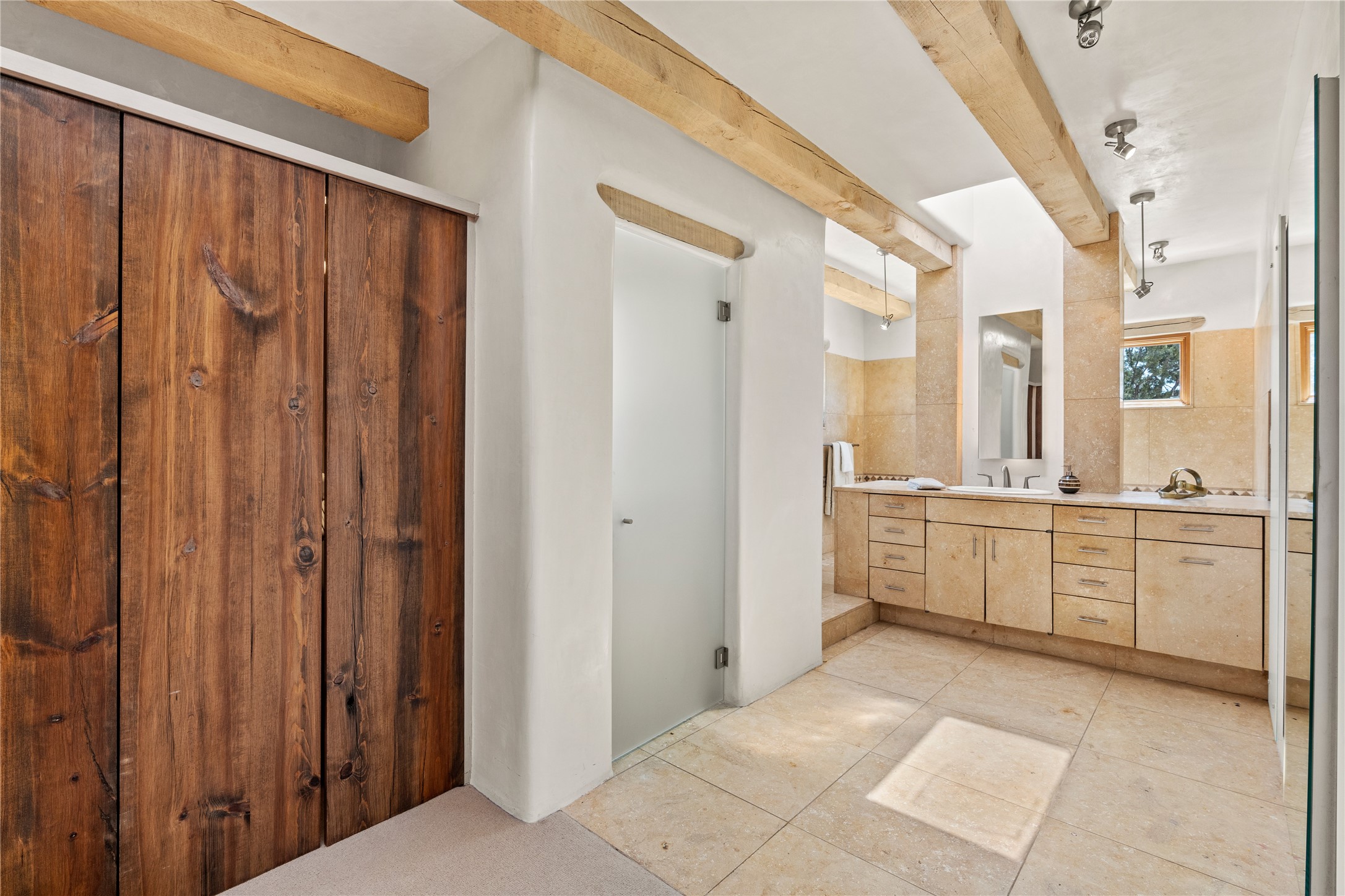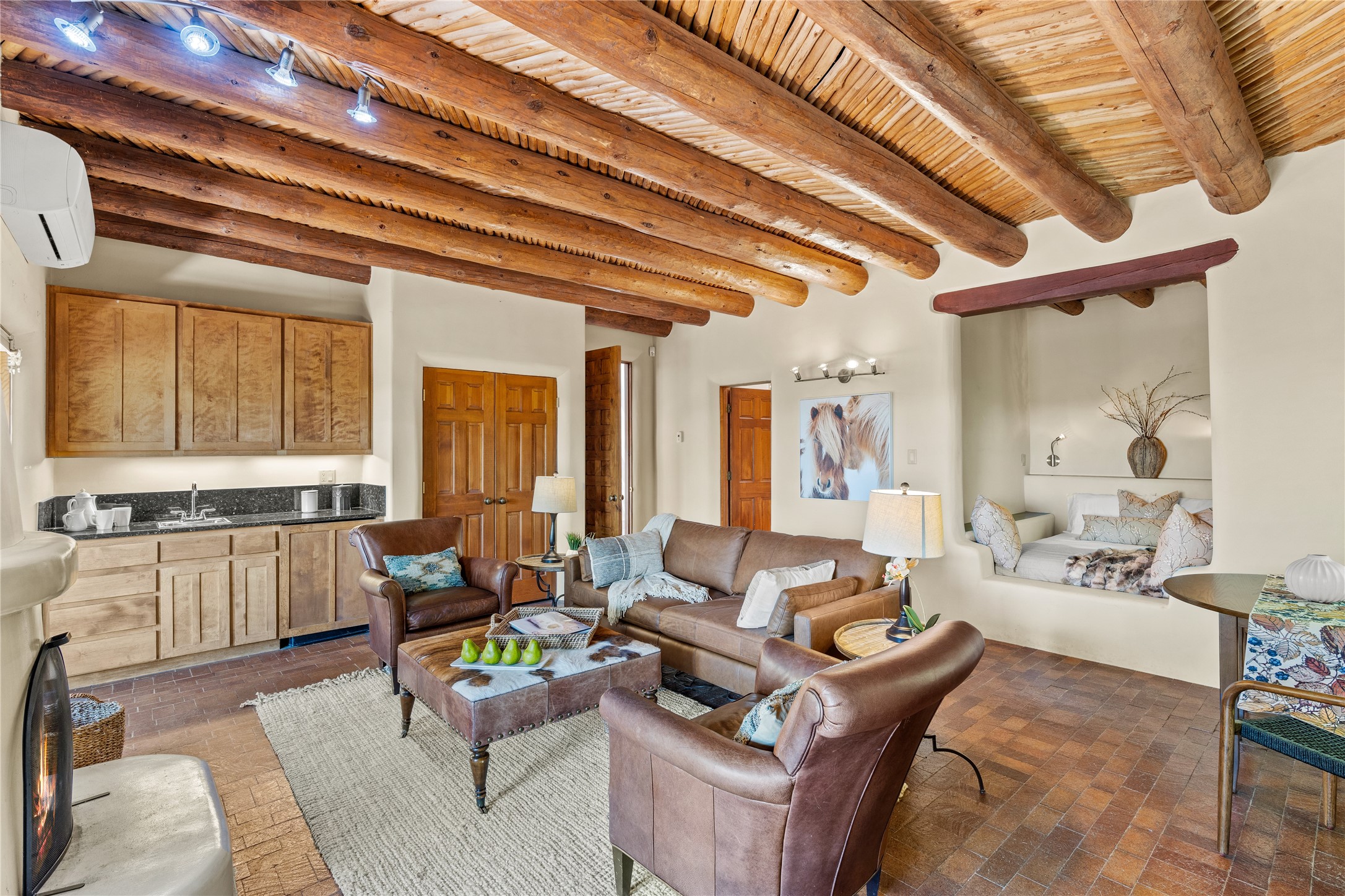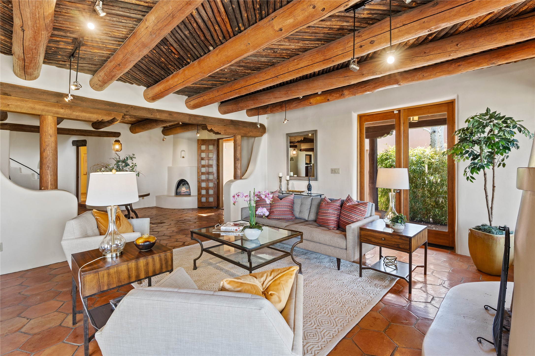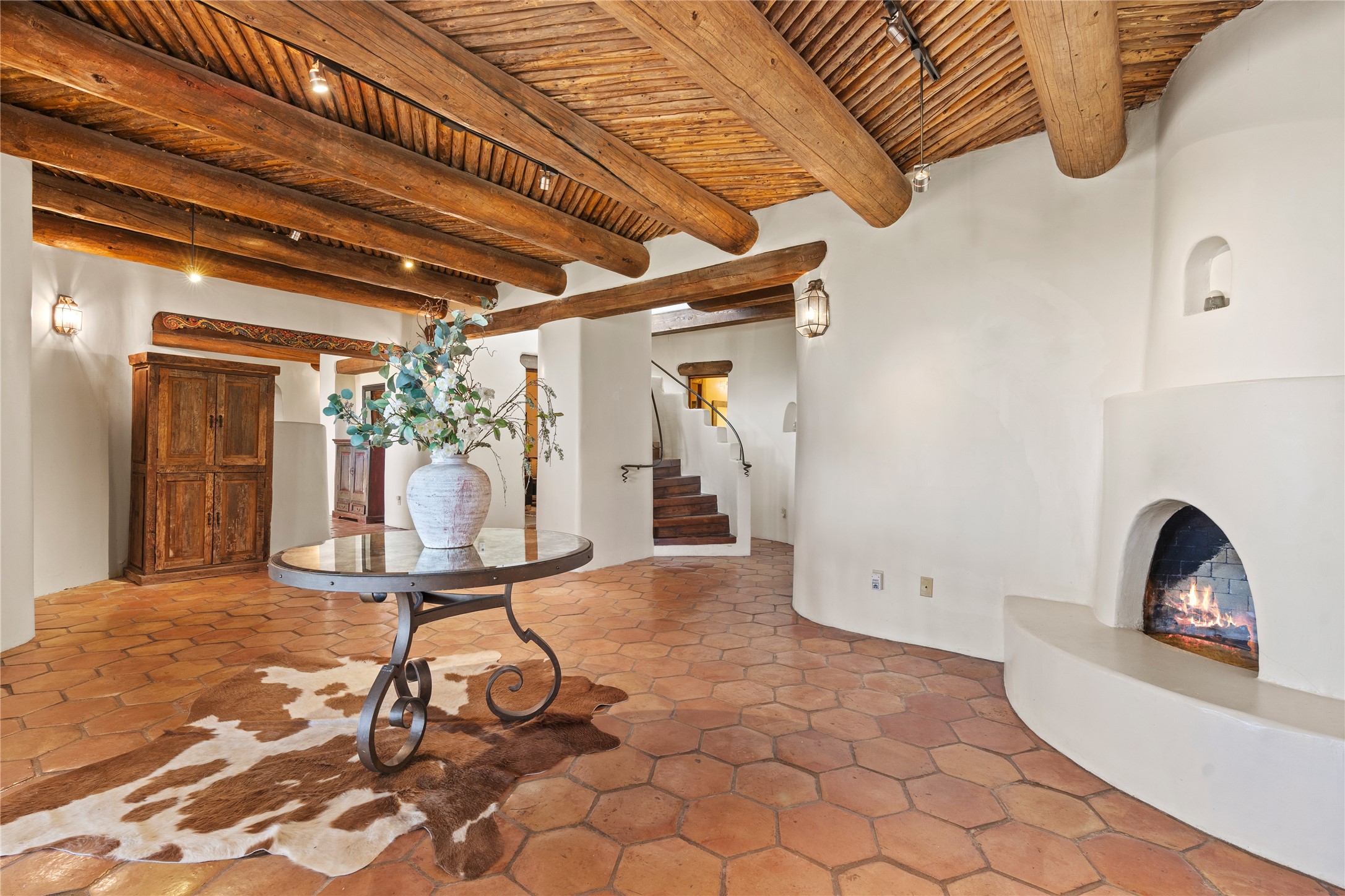 Incredible, rare, and versatile live/work opportunity off HWY 285.Situated on 11.07 acres, this unique property blends Santa Fe's old-world charm with modern style, offering a 5,481 sq. ft. main house and a 3539 sq. ft. guest house/studio. There are 4 large bedrooms, 2 full bathrooms, 3 3/4 bathrooms and 4 half-baths on the property. A large 2-car garage boosts additional space for storage and a small workshop area. Bordering the 4,000-acre Eldorado Preserve, there is also a 2,400 sq. ft. Morton barn with four oversized stalls. The remodeled main house features a European-inspired design with a gourmet kitchen, designer fixtures, and multiple Kiva fireplaces. The guest house/studio area, accessible via several entrances, includes a bright gallery space, a loft, 2 offices, and a reception space with 16-foot ceiling heights. Outdoor living areas boast covered portals, patios, and a moss rock pond, creating a serene private retreat close to shopping and amenities.