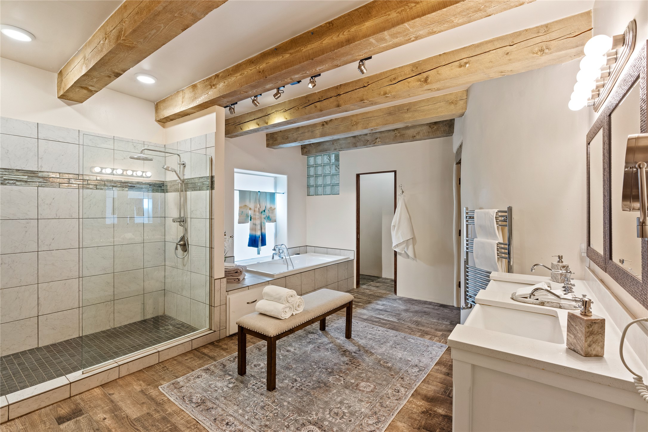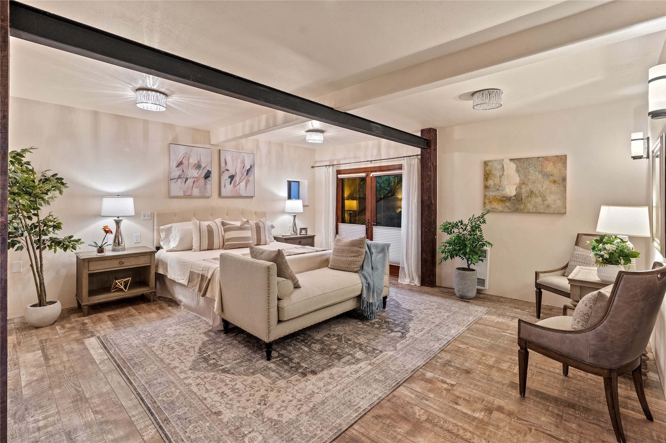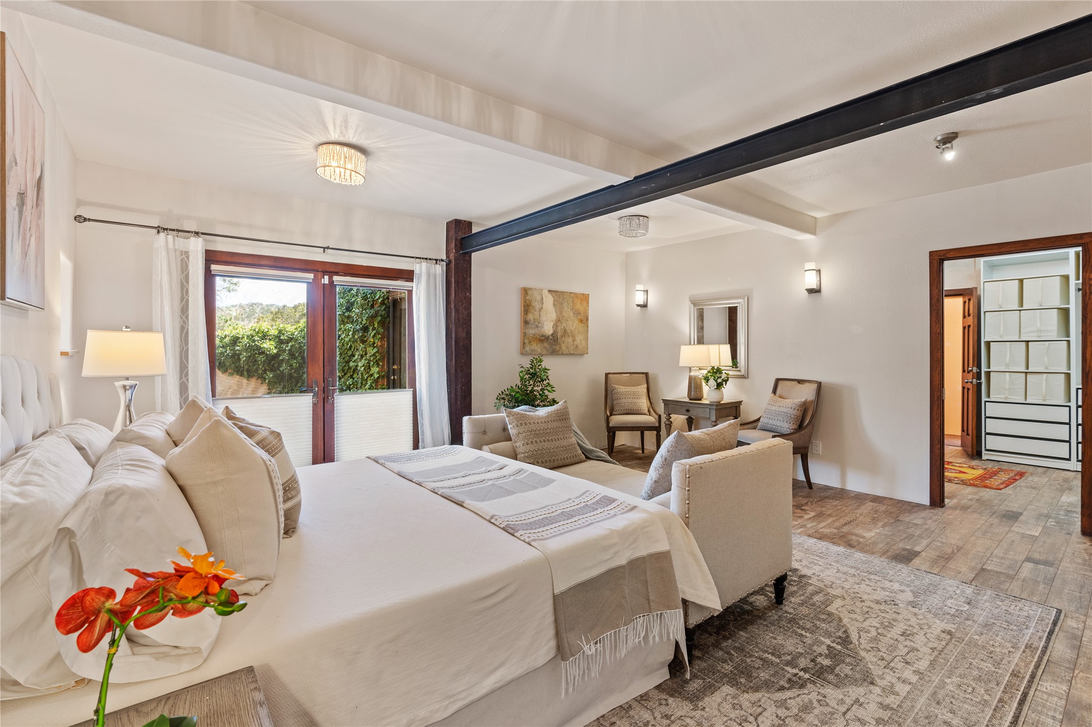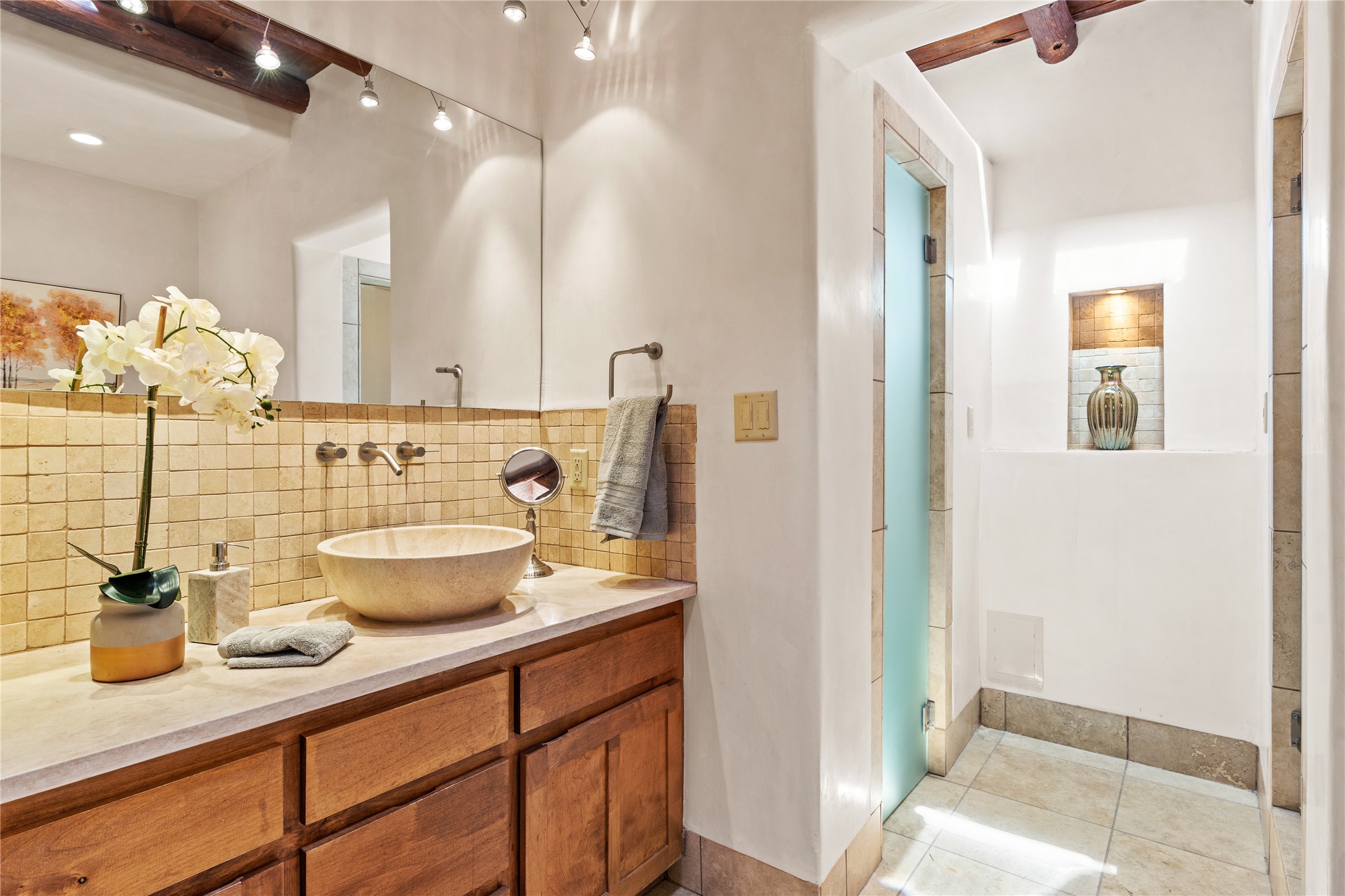 Incredible, rare, and versatile live/work opportunity off HWY 285.Situated on 11.07 acres, this unique property blends Santa Fe's old-world charm with modern style, offering a 5,481 sq. ft. main house and a 3539 sq. ft. guest house/studio. There are 4 large bedrooms, 2 full bathrooms, 3 3/4 bathrooms and 4 half-baths on the property. A large 2-car garage boosts additional space for storage and a small workshop area. Bordering the 4,000-acre Eldorado Preserve, there is also a 2,400 sq. ft. Morton barn with four oversized stalls. The remodeled main house features a European-inspired design with a gourmet kitchen, designer fixtures, and multiple Kiva fireplaces. The guest house/studio area, accessible via several entrances, includes a bright gallery space, a loft, 2 offices, and a reception space with 16-foot ceiling heights. Outdoor living areas boast covered portals, patios, and a moss rock pond, creating a serene private retreat close to shopping and amenities.