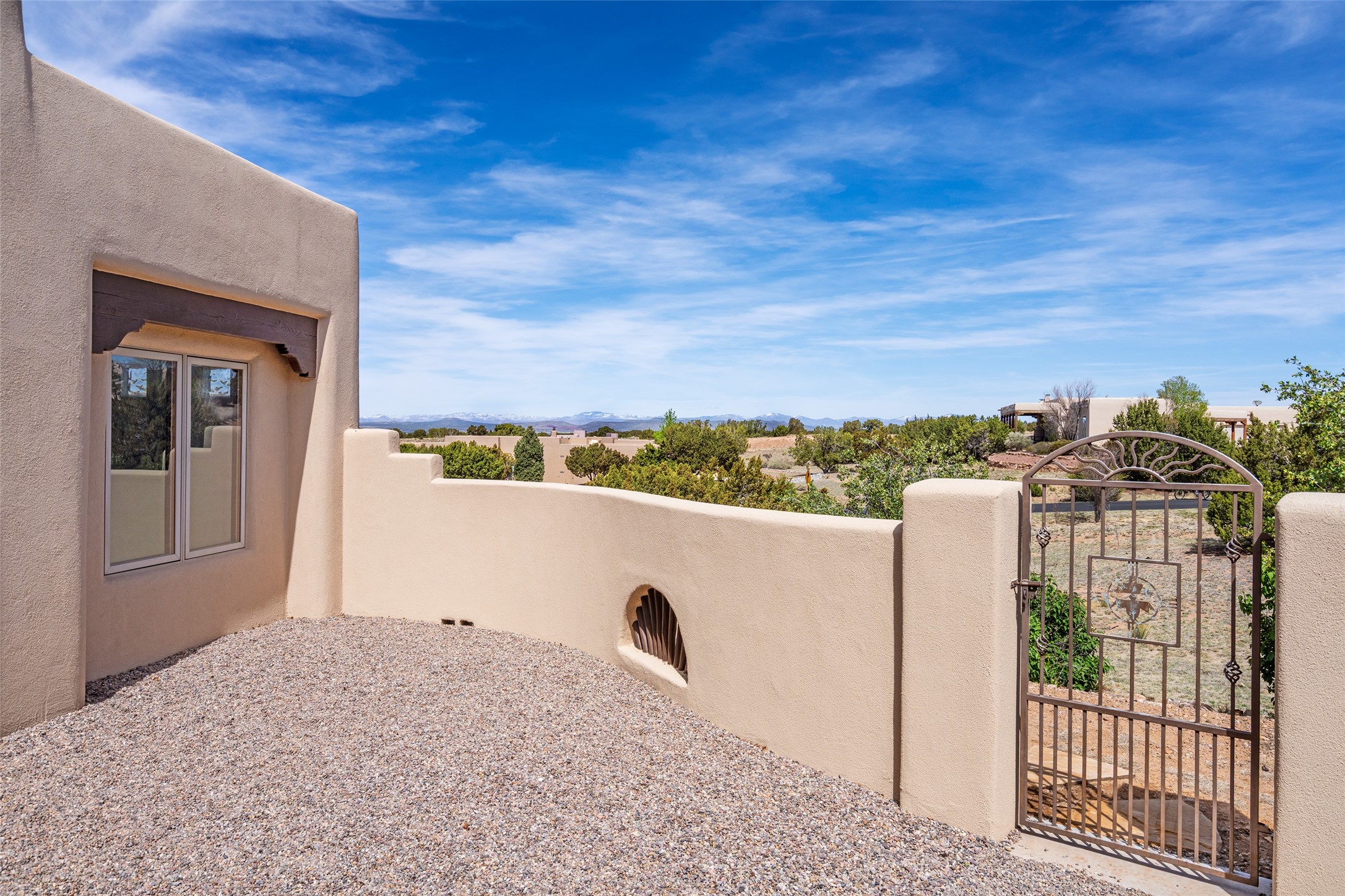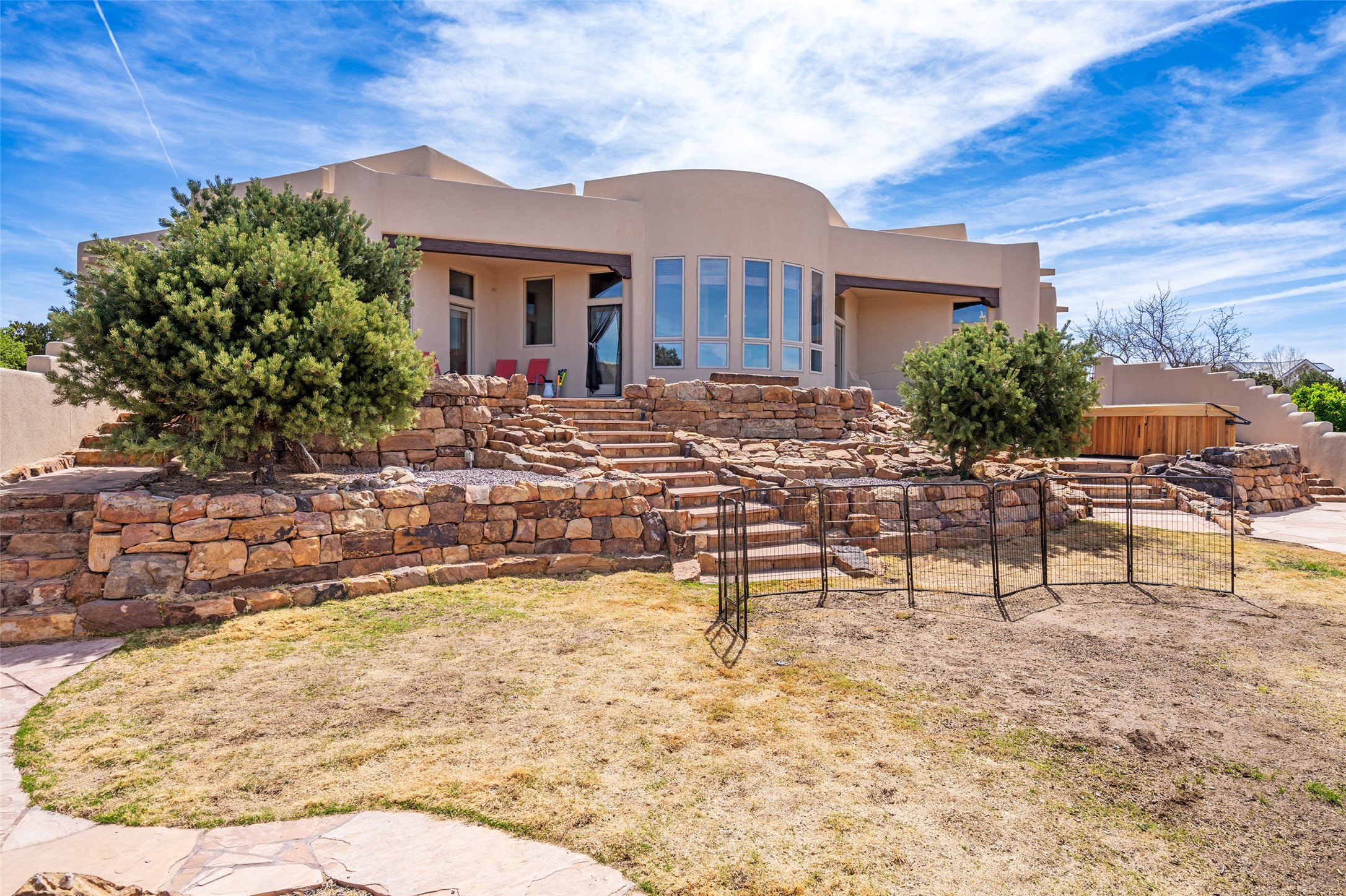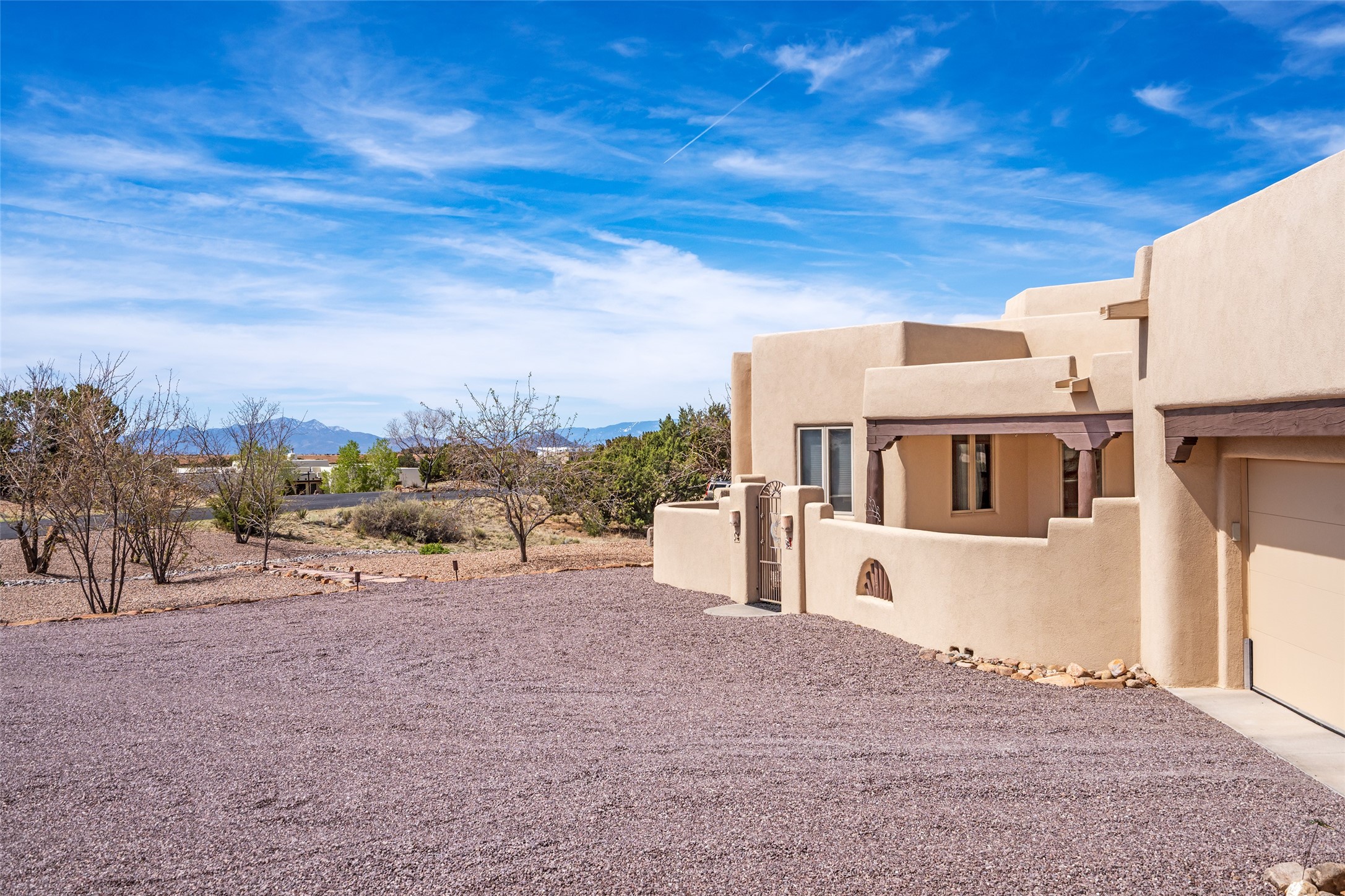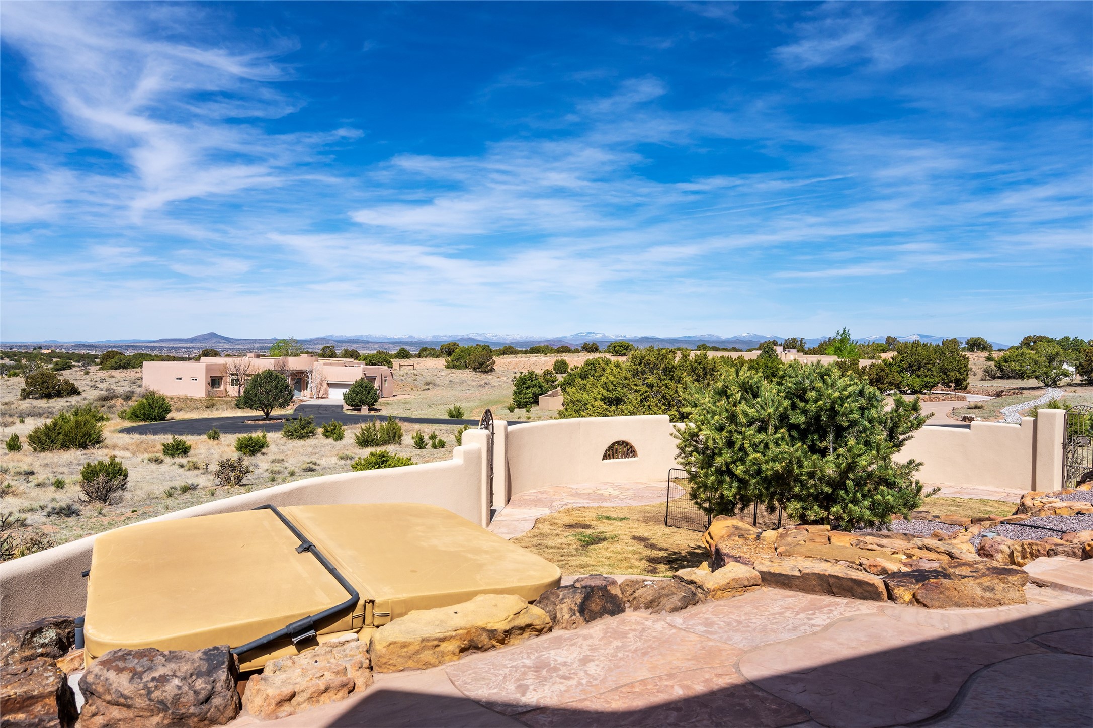 Welcome to this exceptional one-owner custom home, nestled in the coveted Estates section of Rancho Viejo. Set on a generous one-acre view lot, this thoughtfully designed single-level home offers 2,369 square feet of refined Southwest living. From the moment you enter, you'll be captivated by the stunning wood ceilings with vigas, artful nichos, and built-in shelving that blend function with authentic Santa Fe character. A dramatic two-sided gas fireplace anchors the living and dining areas, where a curved wall of windows frames breathtaking Jemez Mountain views. The well-appointed kitchen is a chef's delight, featuring custom wood cabinetry, luxurious granite counters, a stone tile backsplash, and premium appliances including a Dacor cooktop and wall oven, plus a Bosch dishwasher. The home's smart layout offers privacy and comfort, with a dedicated office and a spacious owner's suite in one wing. Enjoy a spa-like bathroom with dual vanities and a large, distinctive walk-in shower plus soaking tub, an oversized walk-in closet with safe cubby, and direct access to the rear portal from the serene primary bedroom. The opposite wing includes three additional bedrooms (one used as a hobby room), a stylish guest bath, a powder room, and a well-equipped laundry area. Outside, the landscaped backyard is a true retreat, complete with artistic custom flagstone patios, a soothing water feature, dramatic natural boulders, and a hot tub--perfect for relaxing under the stars. The oversized three-car garage includes space for a workshop or extra storage. Lovingly maintained and rich in Southwest charm, this home offers privacy, views, and elegant livability in one of Santa Fe's most desirable neighborhoods.