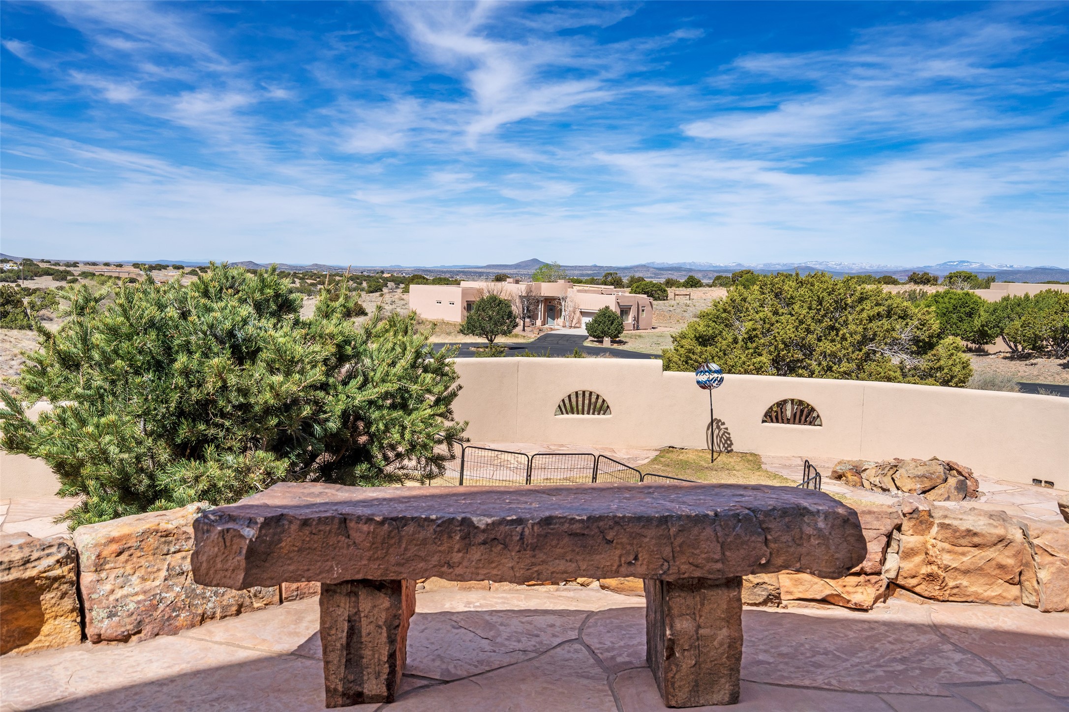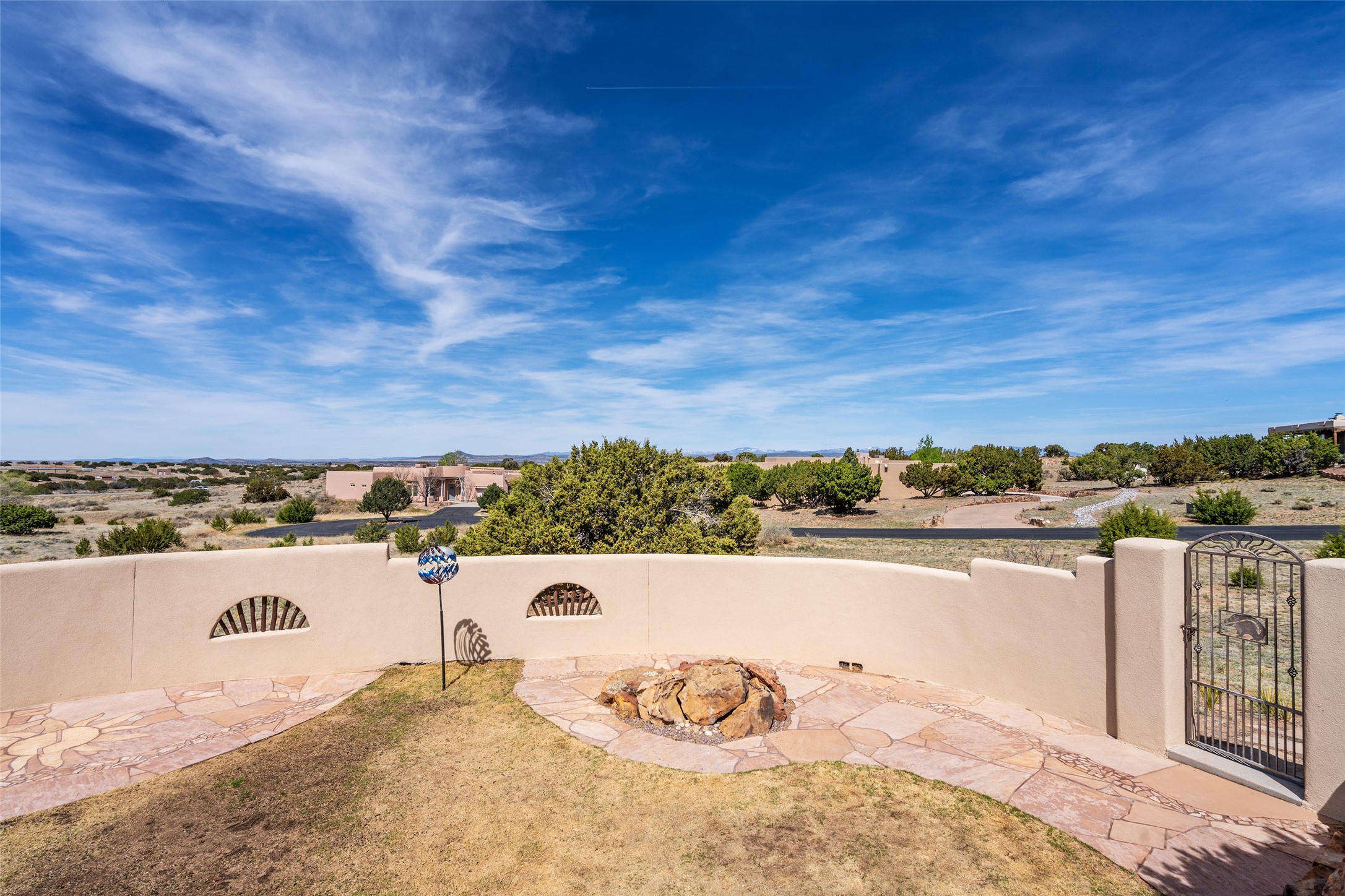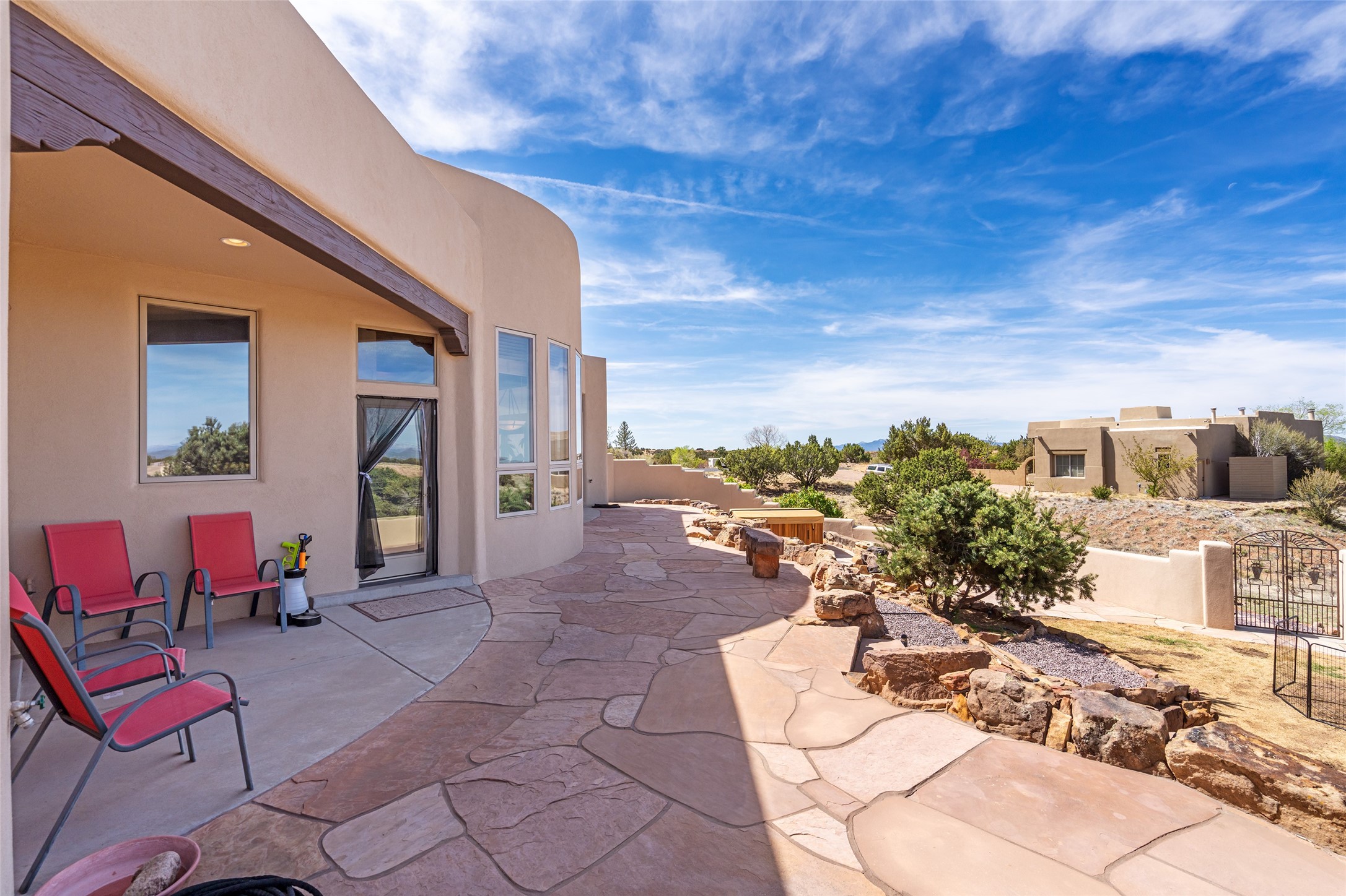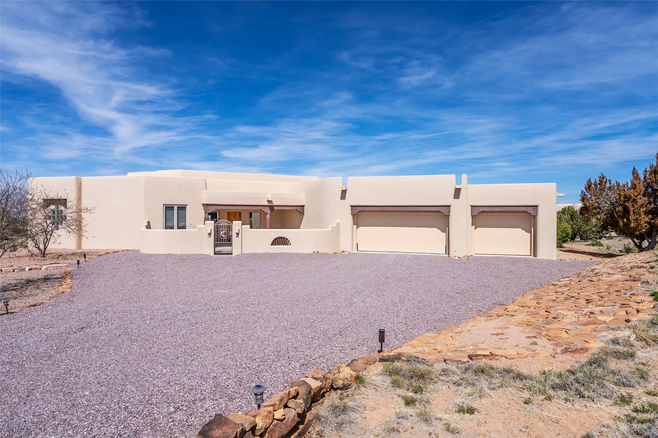 Welcome to this exceptional one-owner custom home, nestled in the coveted Estates section of Rancho Viejo. Set on a generous one-acre view lot, this thoughtfully designed single-level home offers 2,369 square feet of refined Southwest living. From the moment you enter, you'll be captivated by the stunning wood ceilings with vigas, artful nichos, and built-in shelving that blend function with authentic Santa Fe character. A dramatic two-sided gas fireplace anchors the living and dining areas, where a curved wall of windows frames breathtaking Jemez Mountain views. The well-appointed kitchen is a chef's delight, featuring custom wood cabinetry, luxurious granite counters, a stone tile backsplash, and premium appliances including a Dacor cooktop and wall oven, plus a Bosch dishwasher. The home's smart layout offers privacy and comfort, with a dedicated office and a spacious owner's suite in one wing. Enjoy a spa-like bathroom with dual vanities and a large, distinctive walk-in shower plus soaking tub, an oversized walk-in closet with safe cubby, and direct access to the rear portal from the serene primary bedroom. The opposite wing includes three additional bedrooms (one used as a hobby room), a stylish guest bath, a powder room, and a well-equipped laundry area. Outside, the landscaped backyard is a true retreat, complete with artistic custom flagstone patios, a soothing water feature, dramatic natural boulders, and a hot tub--perfect for relaxing under the stars. The oversized three-car garage includes space for a workshop or extra storage. Lovingly maintained and rich in Southwest charm, this home offers privacy, views, and elegant livability in one of Santa Fe's most desirable neighborhoods.