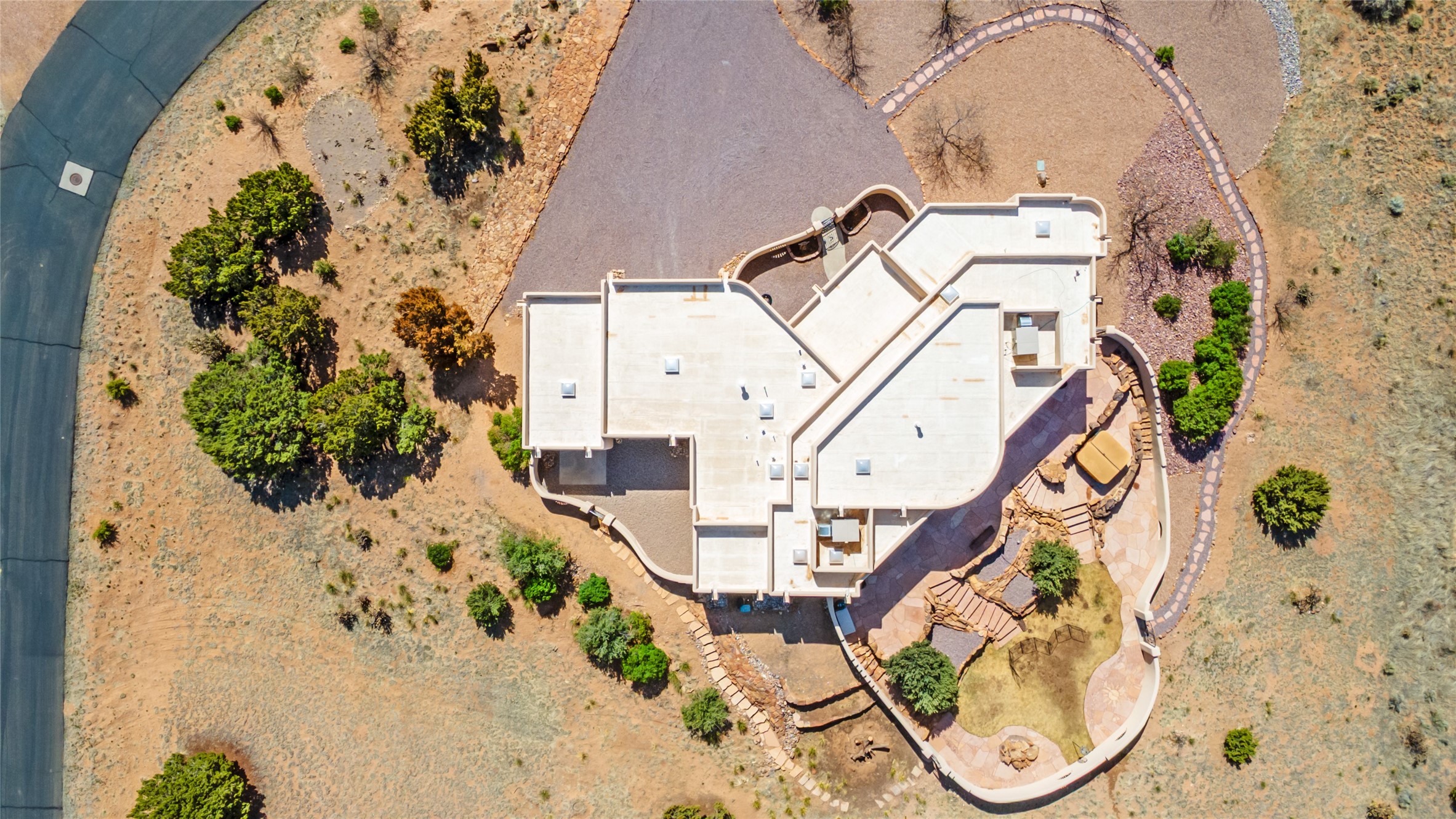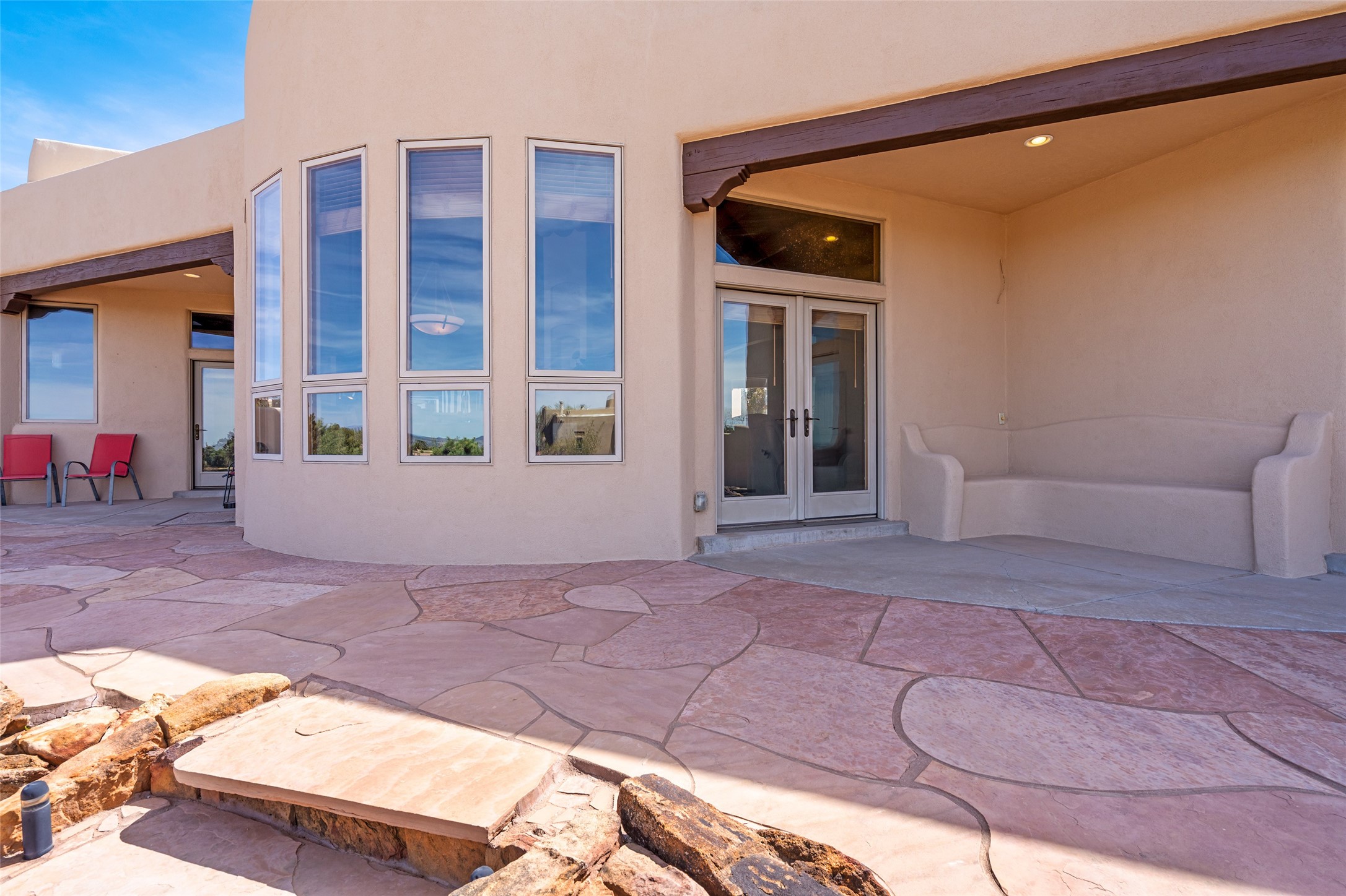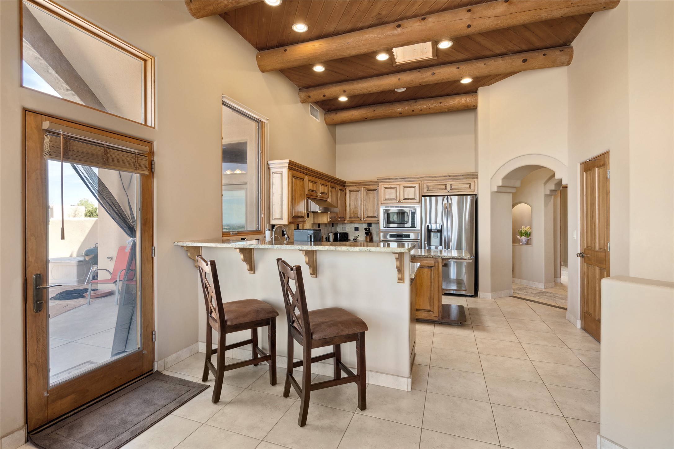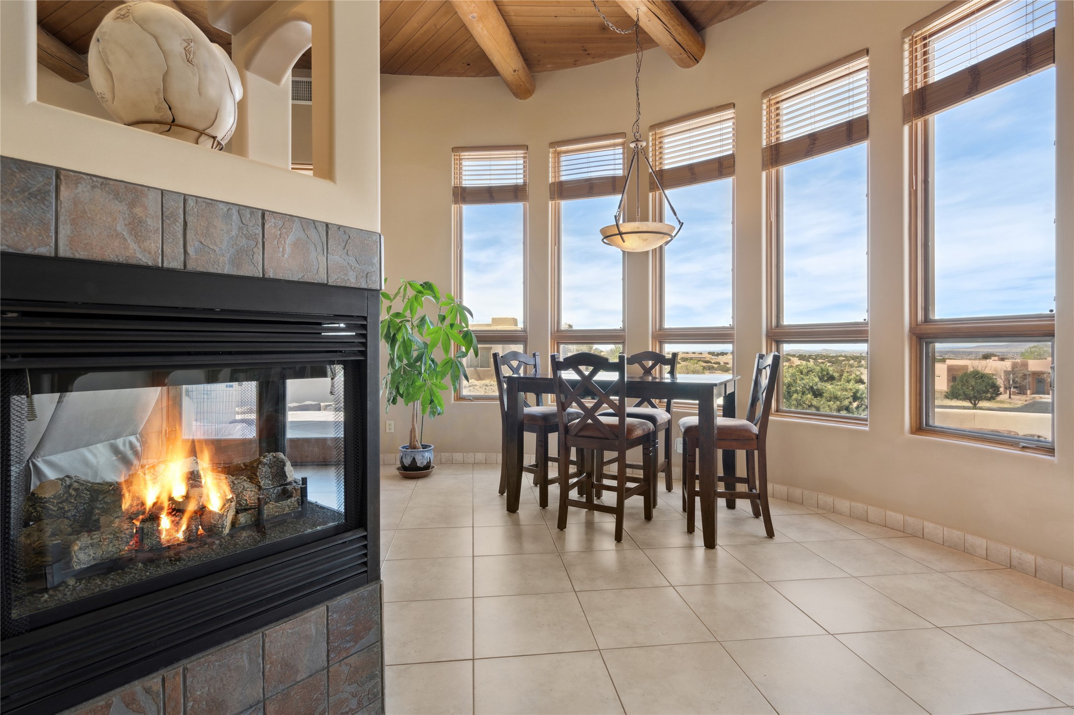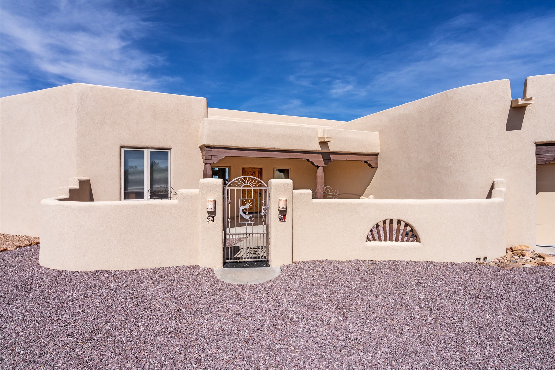 Welcome to this exceptional one-owner custom home, nestled in the coveted Estates section of Rancho Viejo. Set on a generous one-acre view lot, this thoughtfully designed single-level home offers 2,369 square feet of refined Southwest living. From the moment you enter, you'll be captivated by the stunning wood ceilings with vigas, artful nichos, and built-in shelving that blend function with authentic Santa Fe character. A dramatic two-sided gas fireplace anchors the living and dining areas, where a curved wall of windows frames breathtaking Jemez Mountain views. The well-appointed kitchen is a chef's delight, featuring custom wood cabinetry, luxurious granite counters, a stone tile backsplash, and premium appliances including a Dacor cooktop and wall oven, plus a Bosch dishwasher. The home's smart layout offers privacy and comfort, with a dedicated office and a spacious owner's suite in one wing. Enjoy a spa-like bathroom with dual vanities and a large, distinctive walk-in shower plus soaking tub, an oversized walk-in closet with safe cubby, and direct access to the rear portal from the serene primary bedroom. The opposite wing includes three additional bedrooms (one used as a hobby room), a stylish guest bath, a powder room, and a well-equipped laundry area. Outside, the landscaped backyard is a true retreat, complete with artistic custom flagstone patios, a soothing water feature, dramatic natural boulders, and a hot tub--perfect for relaxing under the stars. The oversized three-car garage includes space for a workshop or extra storage. Lovingly maintained and rich in Southwest charm, this home offers privacy, views, and elegant livability in one of Santa Fe's most desirable neighborhoods.