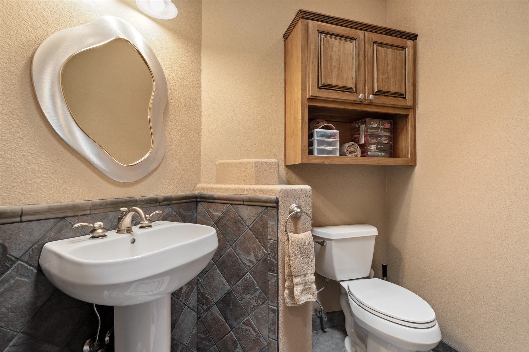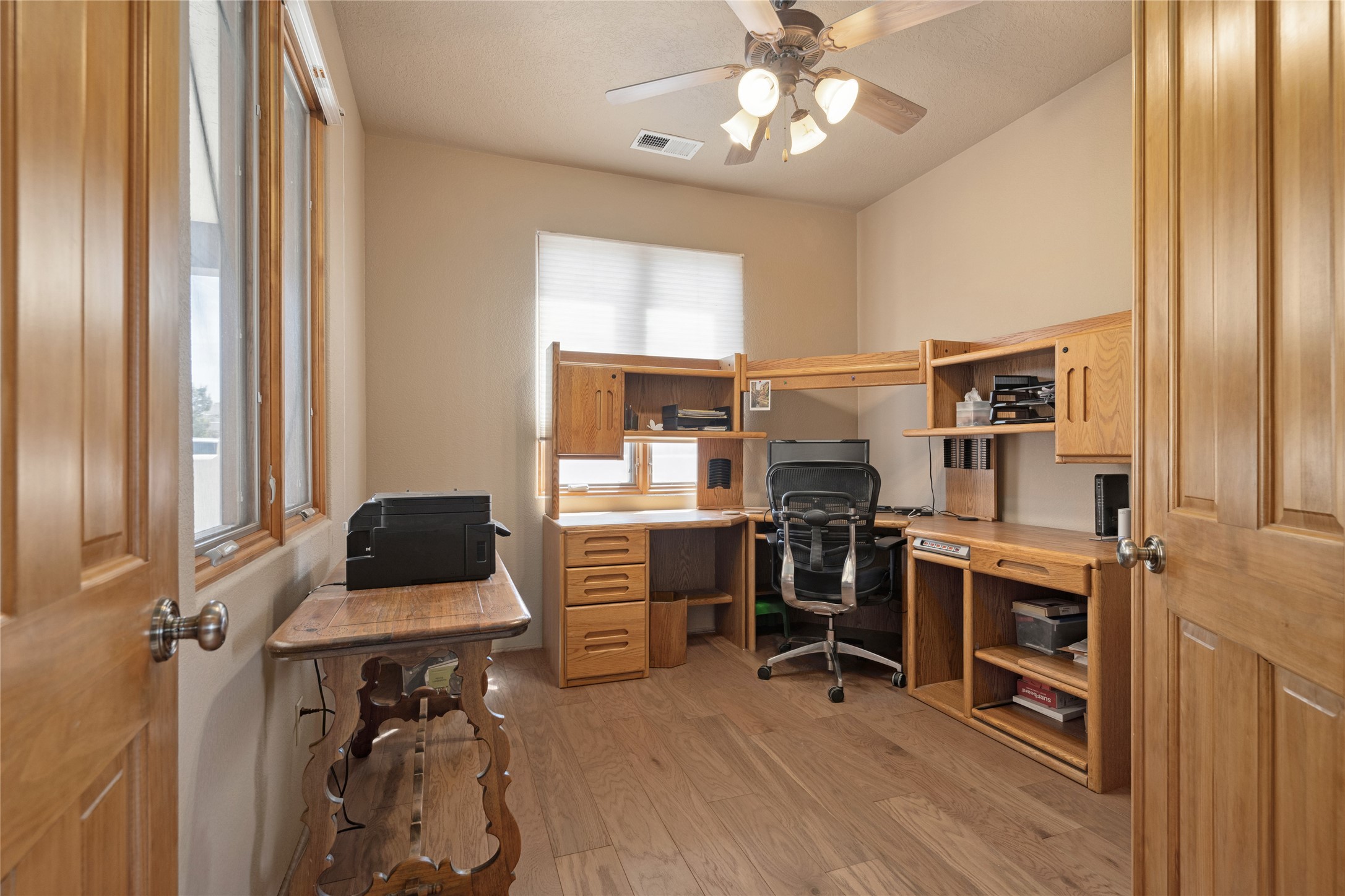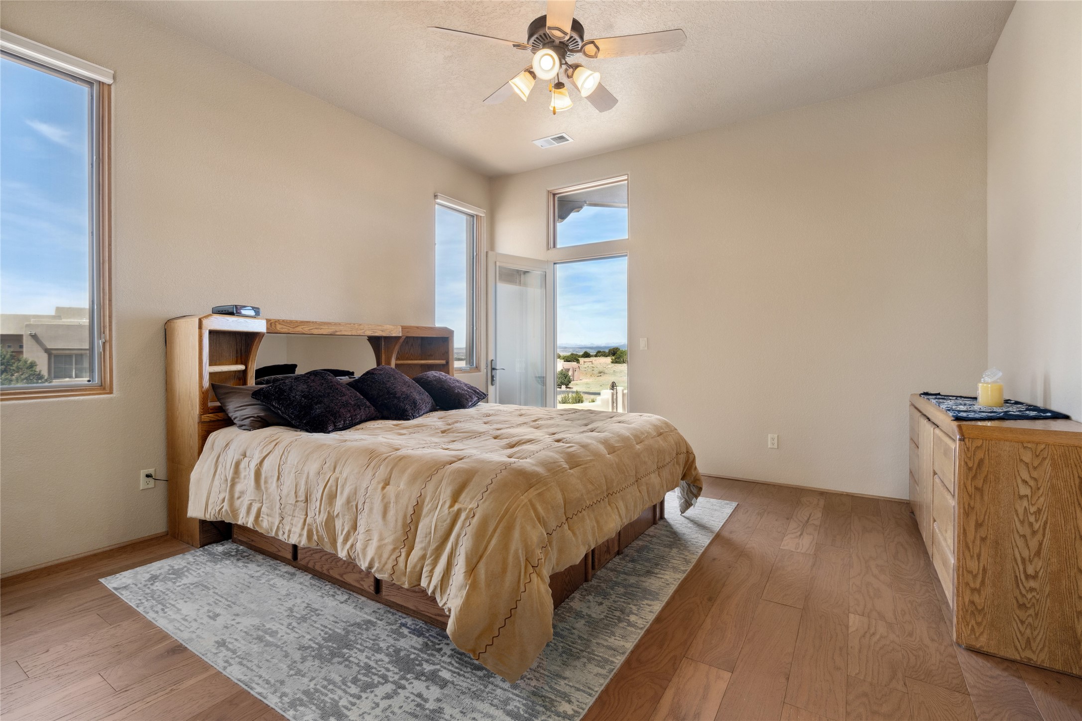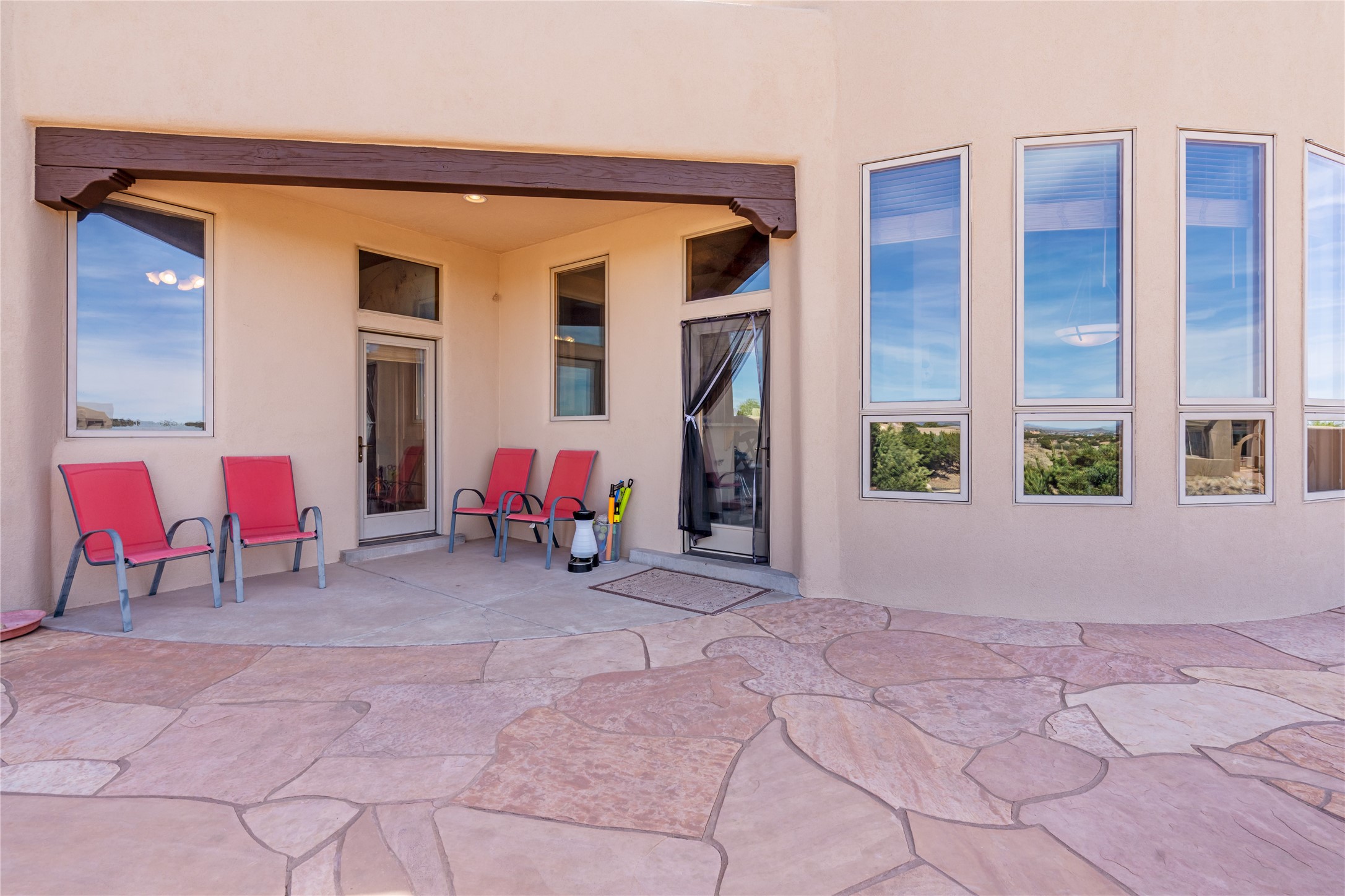 Welcome to this exceptional one-owner custom home, nestled in the coveted Estates section of Rancho Viejo. Set on a generous one-acre view lot, this thoughtfully designed single-level home offers 2,369 square feet of refined Southwest living. From the moment you enter, you'll be captivated by the stunning wood ceilings with vigas, artful nichos, and built-in shelving that blend function with authentic Santa Fe character. A dramatic two-sided gas fireplace anchors the living and dining areas, where a curved wall of windows frames breathtaking Jemez Mountain views. The well-appointed kitchen is a chef's delight, featuring custom wood cabinetry, luxurious granite counters, a stone tile backsplash, and premium appliances including a Dacor cooktop and wall oven, plus a Bosch dishwasher. The home's smart layout offers privacy and comfort, with a dedicated office and a spacious owner's suite in one wing. Enjoy a spa-like bathroom with dual vanities and a large, distinctive walk-in shower plus soaking tub, an oversized walk-in closet with safe cubby, and direct access to the rear portal from the serene primary bedroom. The opposite wing includes three additional bedrooms (one used as a hobby room), a stylish guest bath, a powder room, and a well-equipped laundry area. Outside, the landscaped backyard is a true retreat, complete with artistic custom flagstone patios, a soothing water feature, dramatic natural boulders, and a hot tub--perfect for relaxing under the stars. The oversized three-car garage includes space for a workshop or extra storage. Lovingly maintained and rich in Southwest charm, this home offers privacy, views, and elegant livability in one of Santa Fe's most desirable neighborhoods.