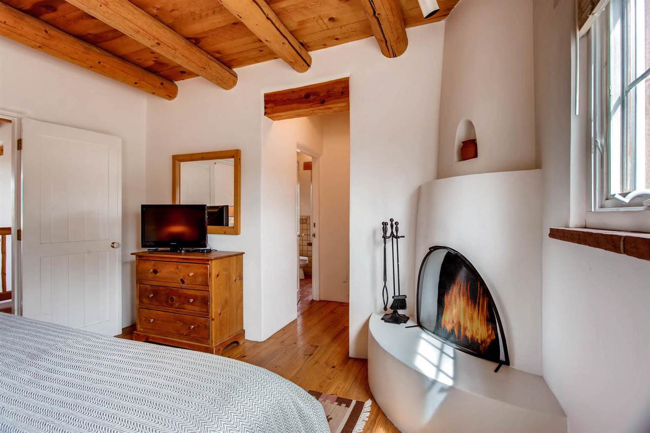 Imagine owning a quarter share in a beautifully managed, fully furnished downtown vacation condo! Picture this: a spacious two-story open ceiling in the living room, bathed in light and perfect for entertaining. The social kitchen, dining, and living areas flow seamlessly together. Plus, there's a Weber gas grill just waiting for you right out the back door, and a lovely, walled yard with an outdoor dining area. And get this--a deck with stunning views from the second-floor landing! The bedrooms are well-separated for privacy, and each one boasts a cozy kiva-style fireplace. The main floor features smooth plaster walls, vigas, and Satillo floors, while the second floor has pine wood floors. And don't forget the charming Talavera tile in the bathrooms and kitchen (complete with butcher-block countertops)!