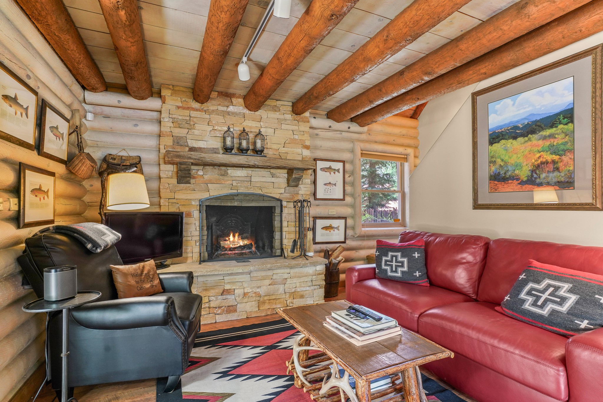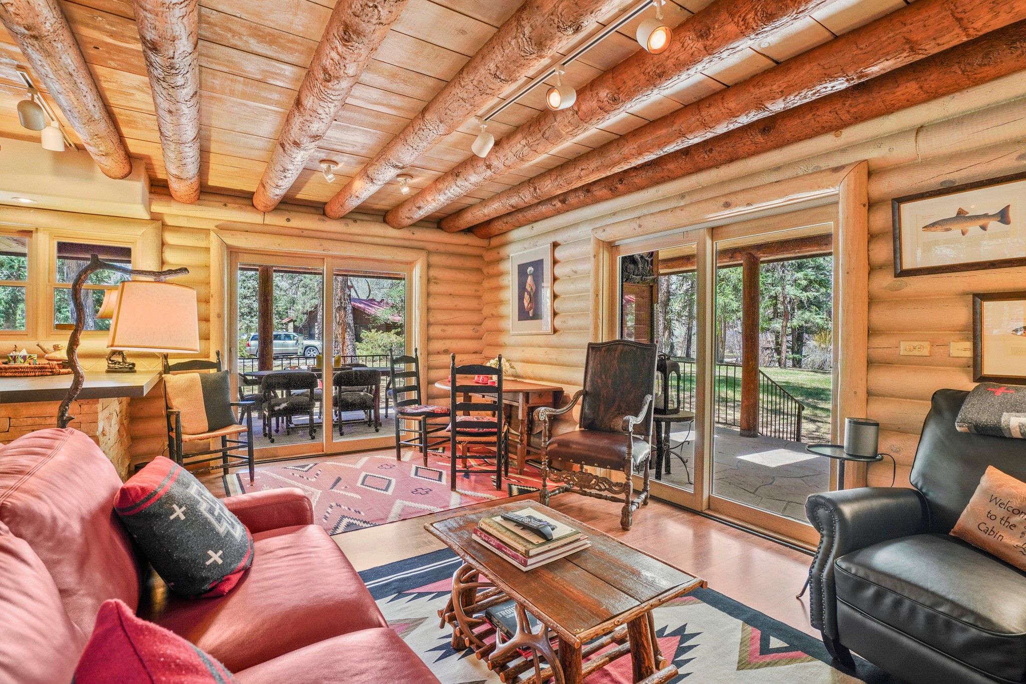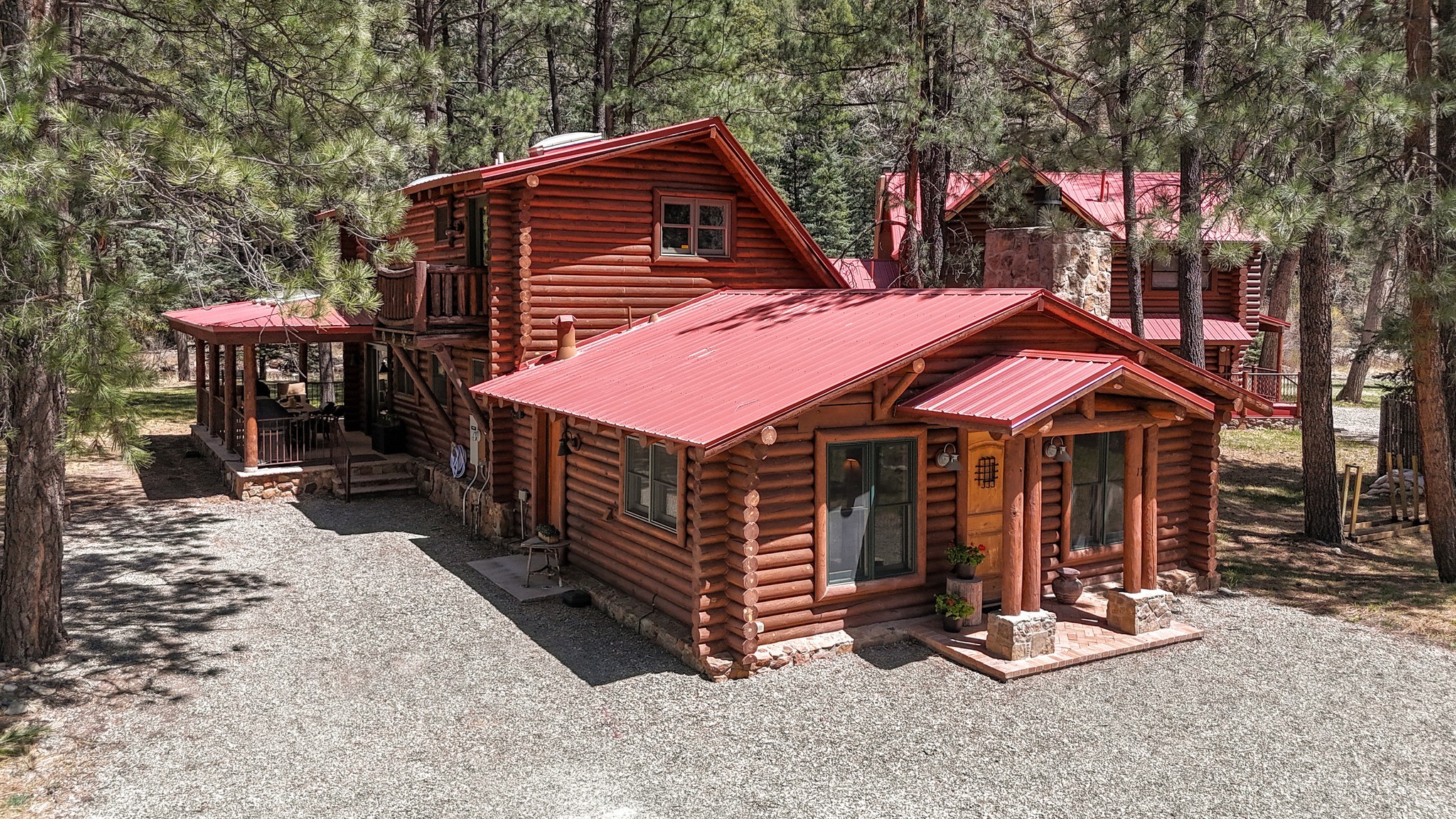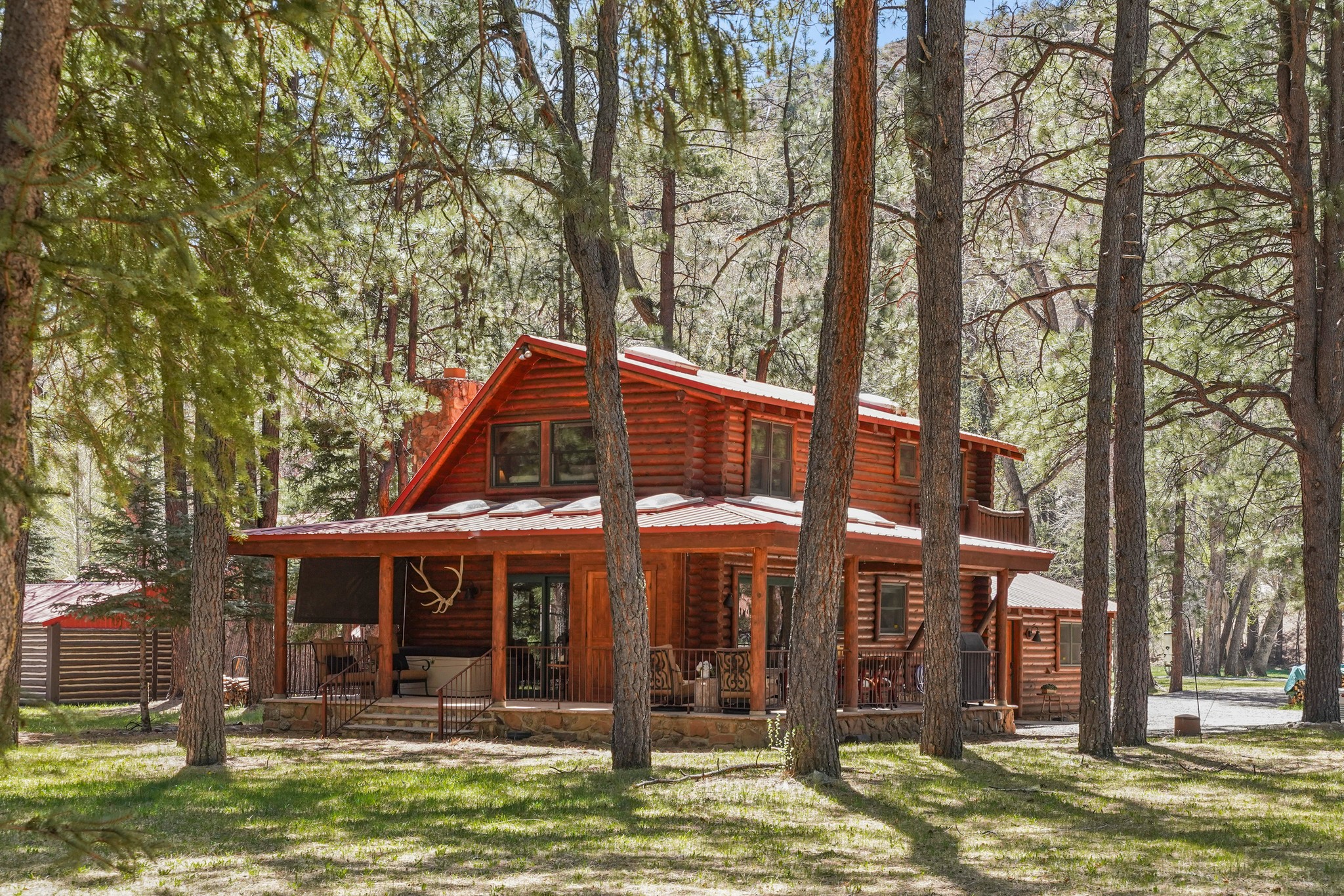 This exceptional log cabin offers rare riverfront living in a gated log home community, less than an hour from Santa Fe. With 1,700 feet of shared river frontage, three serene ponds, and an on-site caretaker, the property blends natural beauty with privacy, security, and ease of ownership.Crafted with authenticity and warmth, the 3-bedroom, 2-bath cabin features two inviting living areas, each with its own stone fireplace. The spacious main living room boasts high beamed ceilings and a charming office nook, while a cozy den off the eat-in kitchen showcases traditional vigas that echo the spirit of the Southwest.The main floor includes a comfortable bedroom and bath, while upstairs, two generous bedrooms and an additional full bath offer treetop views and peaceful retreats. Just off the kitchen and den, a wrap-around covered deck with skylights and flagstone floors creates a seamless indoor-outdoor living space--ideal for entertaining or simply enjoying the sights and sounds of the river. The property is being offered furnished as shown.A rare opportunity to own a legacy mountain retreat that combines natural splendor, thoughtful design, and convenient access to Santa Fe.