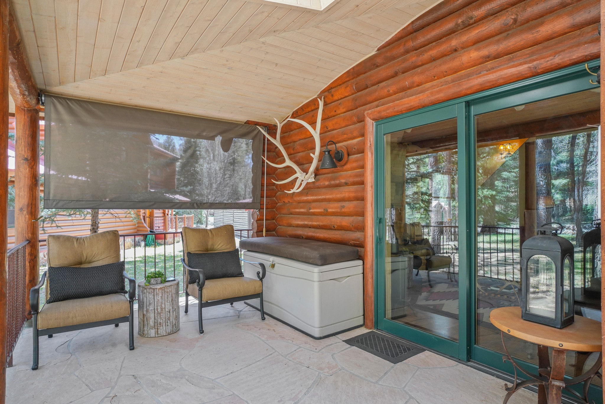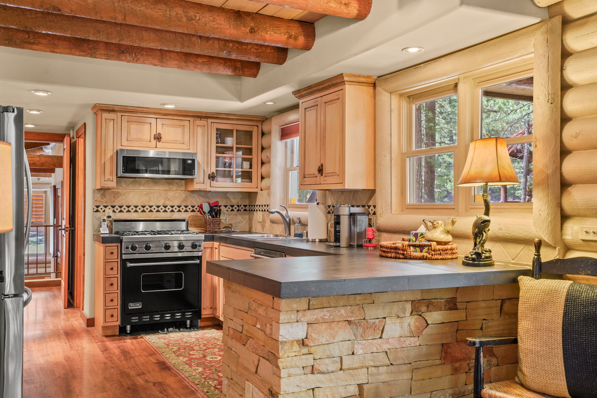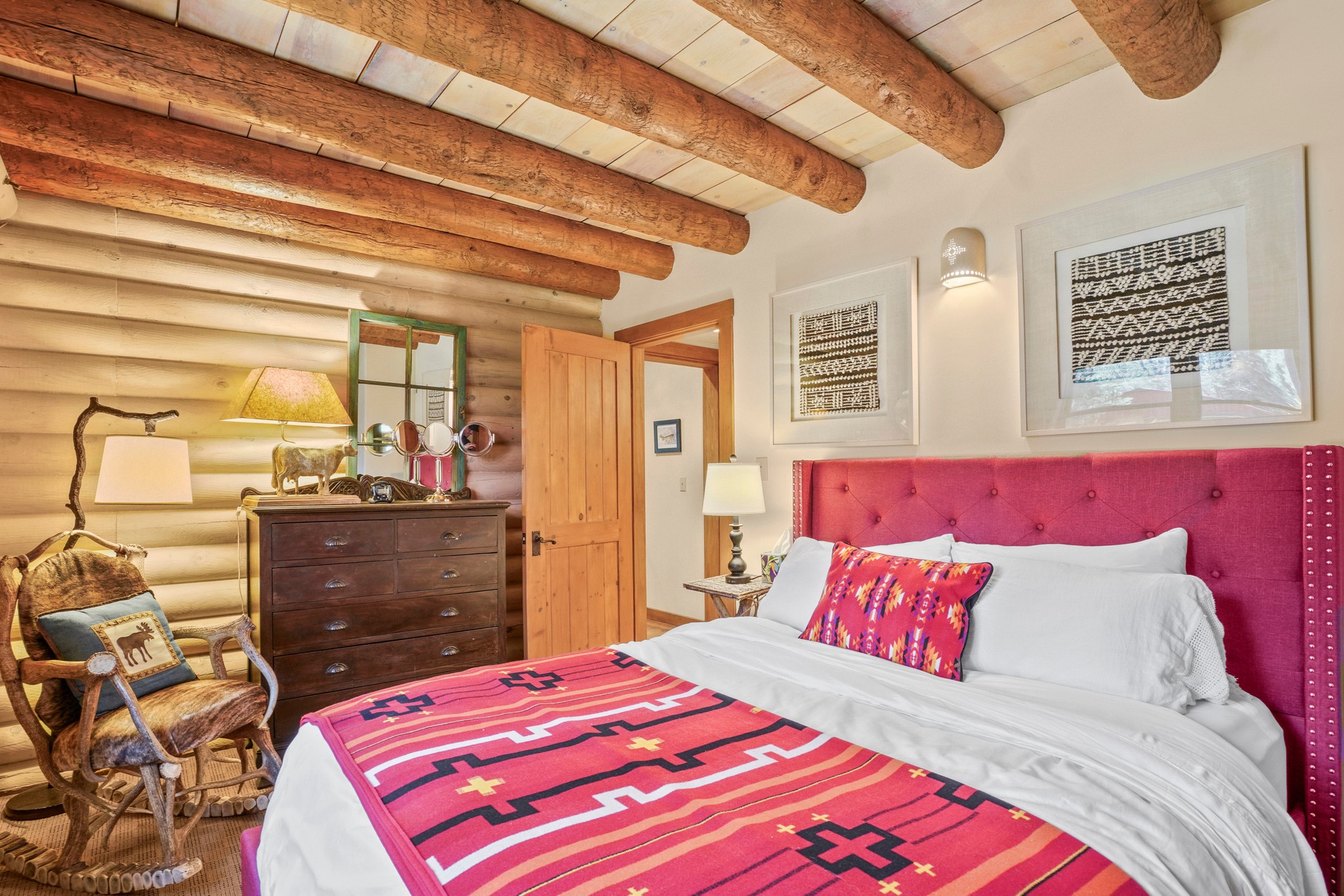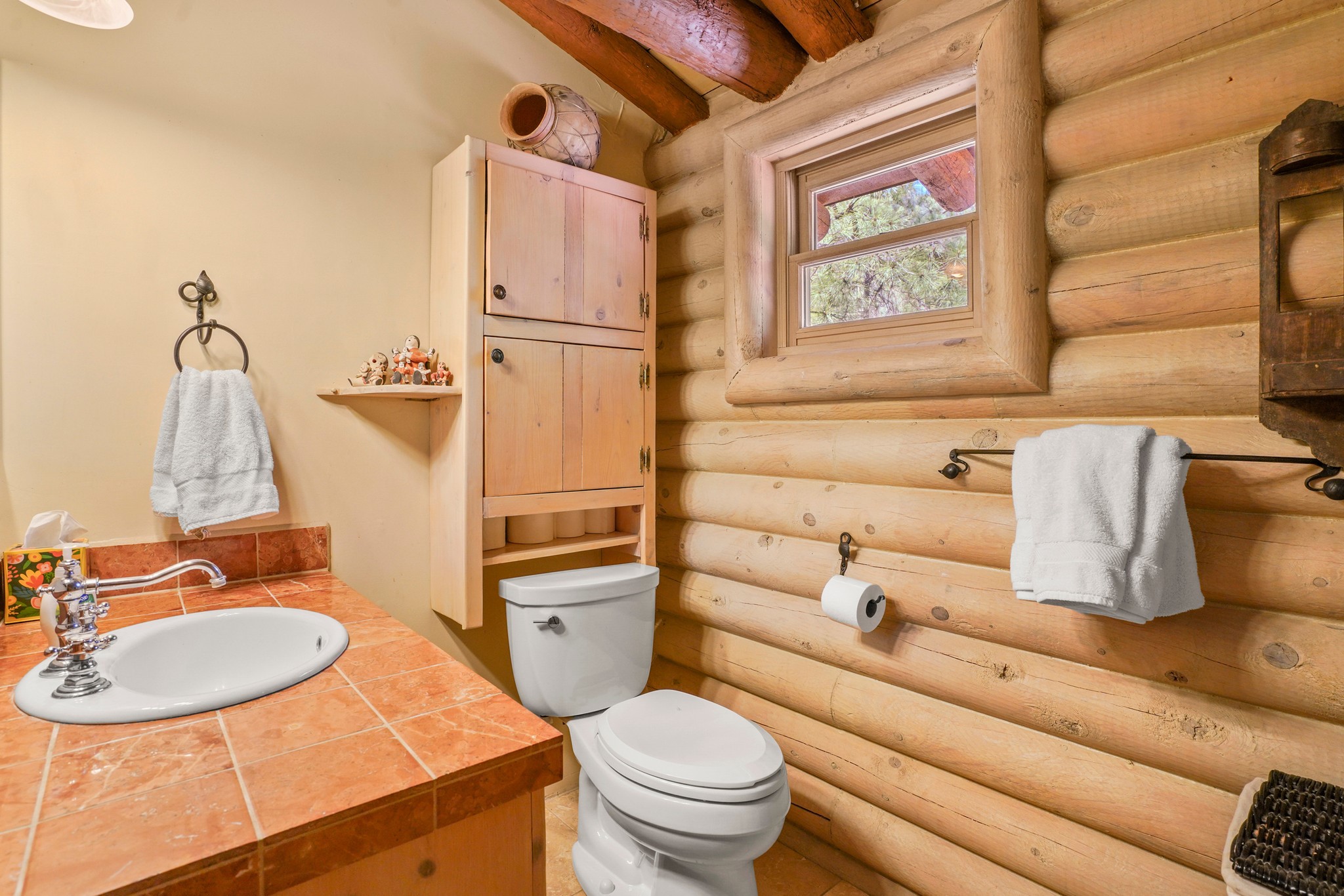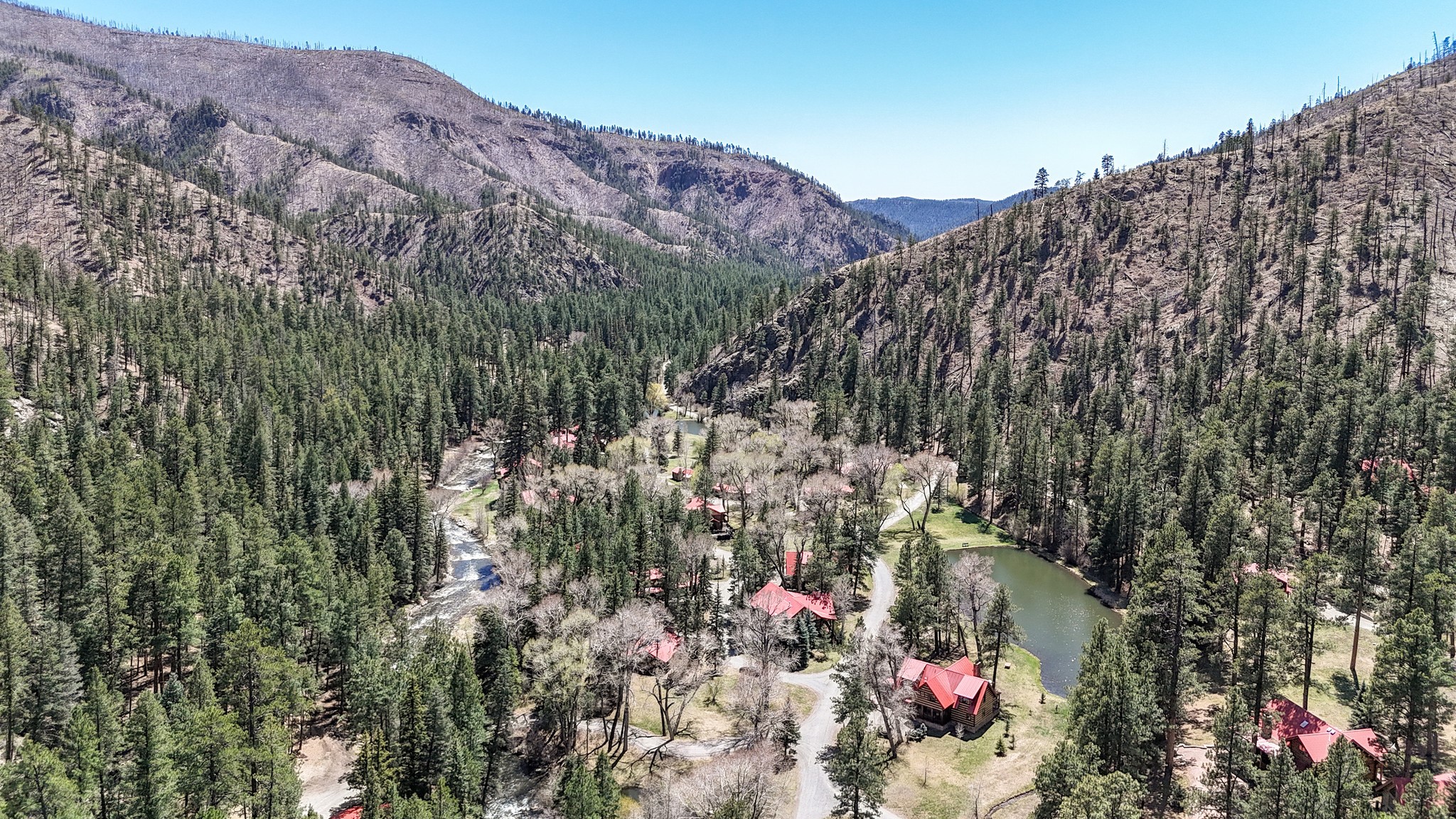 This exceptional log cabin offers rare riverfront living in a gated log home community, less than an hour from Santa Fe. With 1,700 feet of shared river frontage, three serene ponds, and an on-site caretaker, the property blends natural beauty with privacy, security, and ease of ownership.Crafted with authenticity and warmth, the 3-bedroom, 2-bath cabin features two inviting living areas, each with its own stone fireplace. The spacious main living room boasts high beamed ceilings and a charming office nook, while a cozy den off the eat-in kitchen showcases traditional vigas that echo the spirit of the Southwest.The main floor includes a comfortable bedroom and bath, while upstairs, two generous bedrooms and an additional full bath offer treetop views and peaceful retreats. Just off the kitchen and den, a wrap-around covered deck with skylights and flagstone floors creates a seamless indoor-outdoor living space--ideal for entertaining or simply enjoying the sights and sounds of the river. The property is being offered furnished as shown.A rare opportunity to own a legacy mountain retreat that combines natural splendor, thoughtful design, and convenient access to Santa Fe.