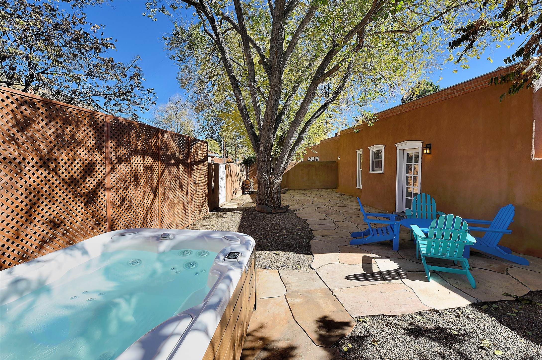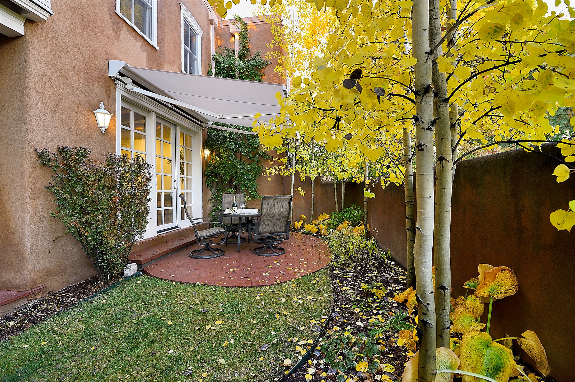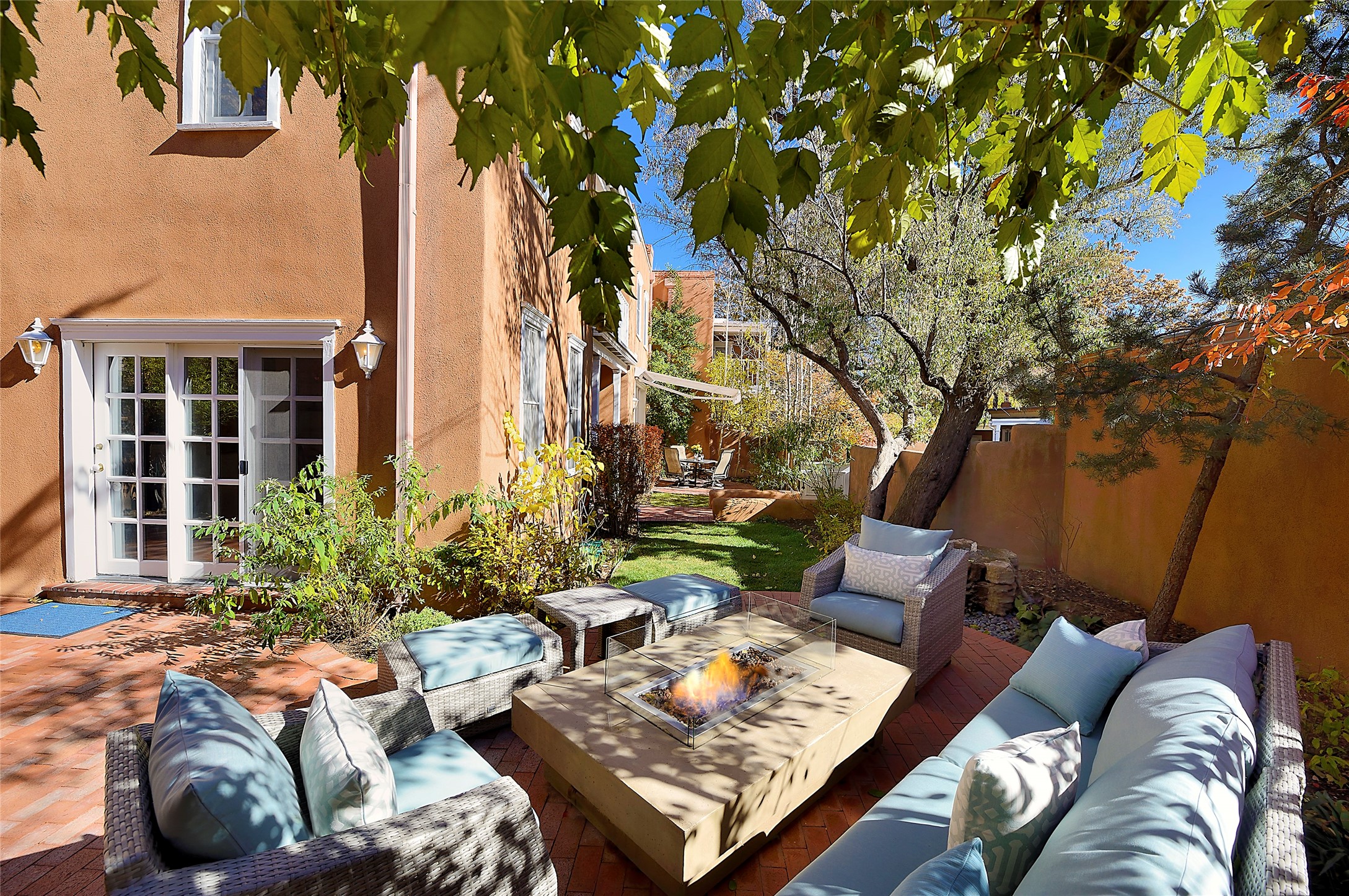 Prime Eastside Location - Just Blocks from Canyon Road and the Plaza!Welcome to this impeccably maintained and thoughtfully upgraded Territorial-style condo, designed by Sharon Woods and located in one of Santa Fe's most desirable historic neighborhoods. Only 3-4 blocks from both Canyon Road and the Plaza, this home offers true walkability to world-class dining, galleries, shopping, and cultural experiences--making a car optional, yet a private garage is included just steps from the front door, a rare and highly coveted amenity on the Eastside.This light-filled, two-story end-unit condo in a charming compound features high ceilings, and exceptional indoor-outdoor flow. The main level includes a formal living room, dining area, kitchen, powder room with laundry, and access to a lush, walled garden. The front patio boasts a large grill, and ample space for outdoor dining and entertaining.Upstairs, you'll find two bedrooms with two full baths, plus a versatile third room currently used as a second living area with a fold-out couch and closet--ideal as a guest room, office, or studio. The primary suite and second living room open to a private back courtyard with a hot tub, surrounded by mature trees, vines, and beautifully landscaped gardens.Enjoy outdoor access from every room, multiple patios with street access, and amenities including ducted heat and air conditioning, a newer roof and stucco, and an outdoor gas fire pit.Whether you're seeking a serene full-time residence, a luxurious getaway, or a proven rental investment, this rare Eastside gem offers it all.