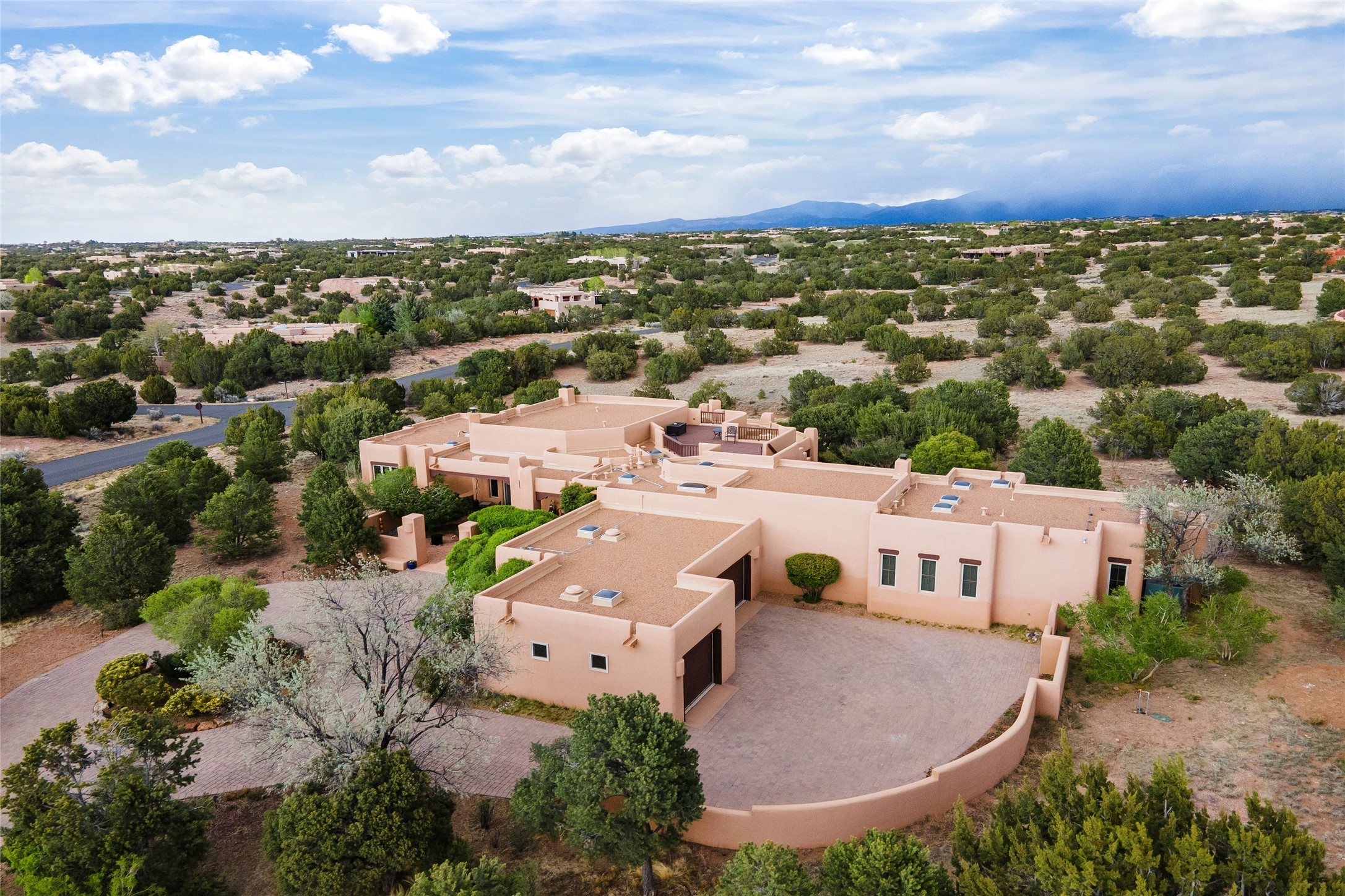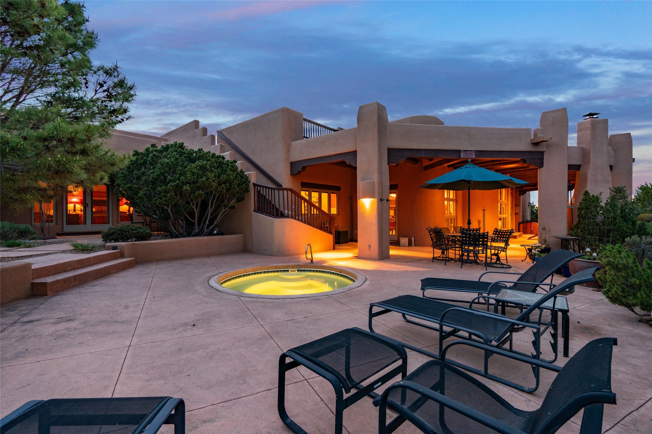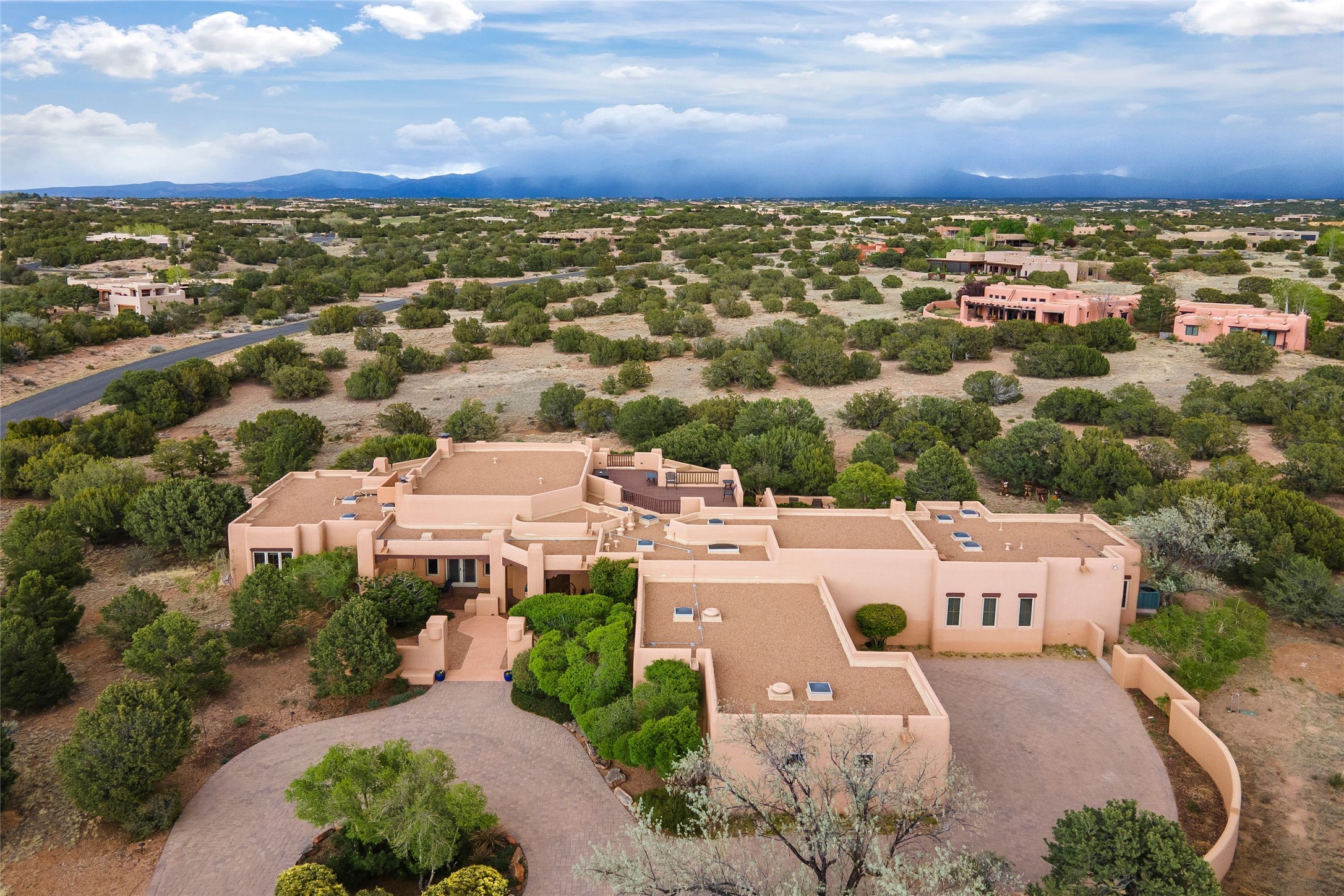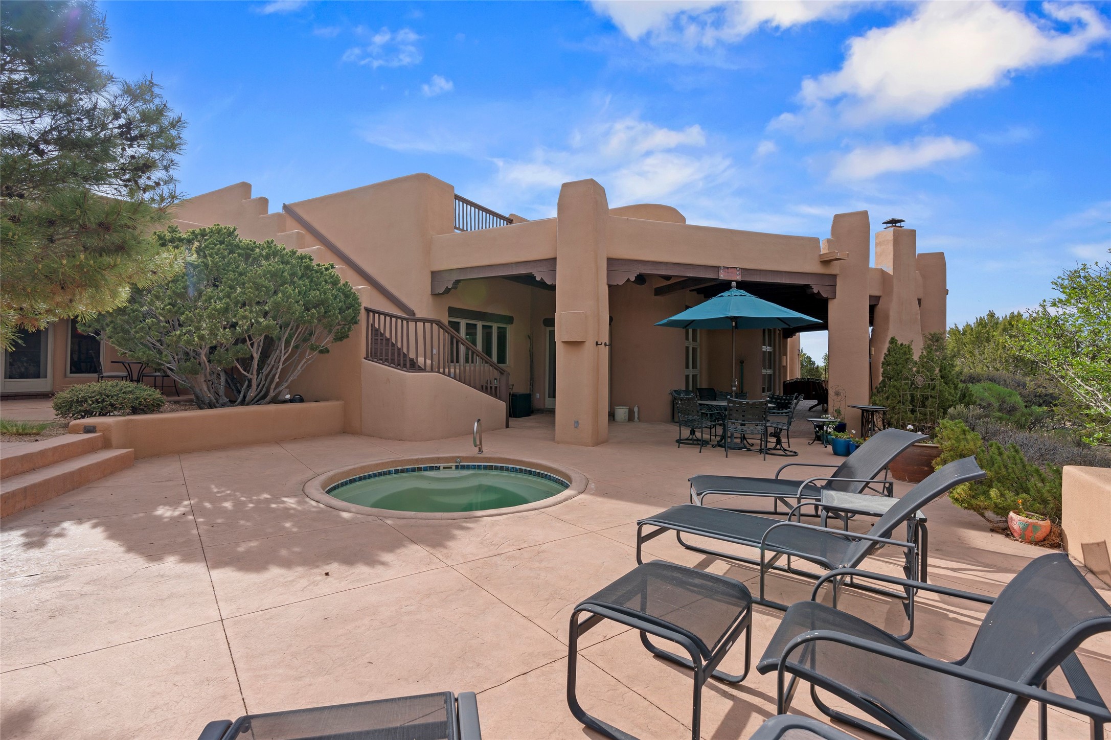 This Soft Contemporary 3-Bed + Den + Retreat / 3.5 -Bath home offers Sangre de Cristo Mountain Views in gated Las Campanas. The Great Room is truly Great, with 2 areas for socializing - One with a Kiva Fireplace, built-in TV / entertainment niche & doors to the Front Portal area. The other is a conversation area with a free-flowing kiva fireplace, wet bar, room for a Baby Grand Piano, Sangre de Cristo views plus access to the Back Portal area with wood-burning kiva fireplace. The Dining area is perfect for sharing meals & has access to the Back Portal area with Built-in BBQ & in-ground spa. The Kitchen has a Sub-Zero refrigerator, Bosch Dishwasher, Dacor Oven & Microwave plus a generous island with Dacor gas cooktop & prep sink. There is also a walk-in wine storage area plus Buffet & Butler's Pantry, both with ample storage. The Owner's Suite includes a kiva fireplace, walk-in closet & its own private portal with a Sangre de Cristo Mountain view. The Owner's Bath offers 2 separate vanities, 2 separate water closets, walk-in shower with body sprays & direct access to the In-ground Spa & outdoor shower. Also in the Owner's Suite wing, there is a private Den / Office with walk-in closet & outdoor access through double French doors as well as a south-facing Library / Retreat area. Two secondary bedrooms, each with their own bathrooms, are on the opposite side of the home, creating privacy from the Owner's Suite. The spacious outdoor area offers a multitude of desirable features - Private In-Ground Spa, Outdoor Shower, Built-in BBQ, Extensive shaded portal areas with wood-burning fireplace & a spacious roof deck with 360-degree Mountain Views. The 3-car garage includes a third, separate stall that can be used as a studio. This fabulous home checks all the boxes - 3 Bedrooms + Den + Retreat * 3 Baths * 3-Car Garage * In-ground Spa * Outdoor Shower * Spacious Roof Deck * Sangre de Cristo Mountain views - Make it yours Today!