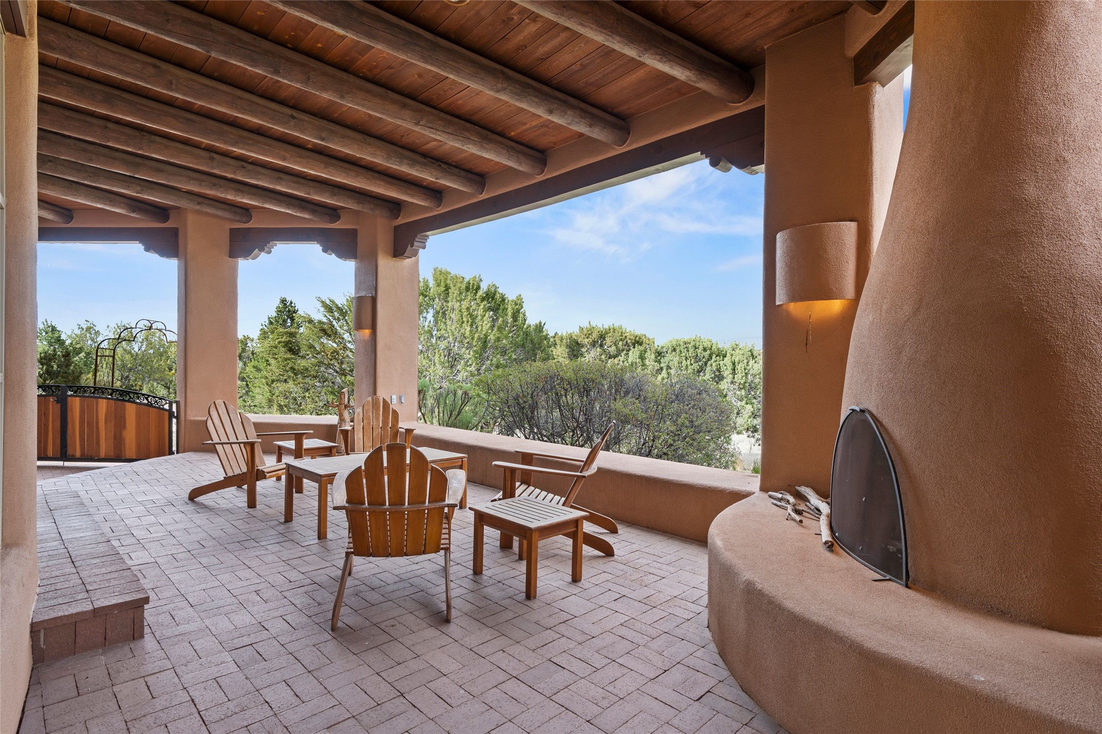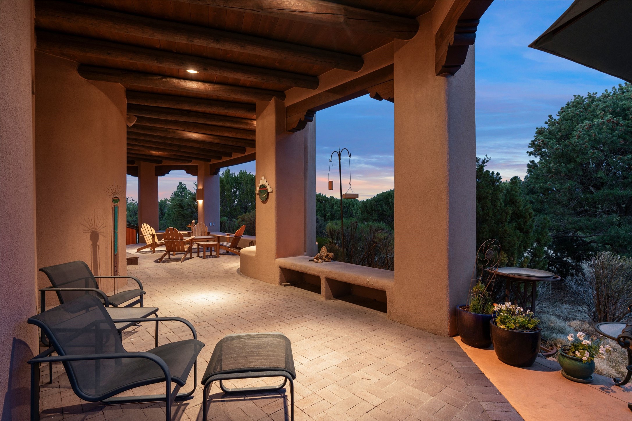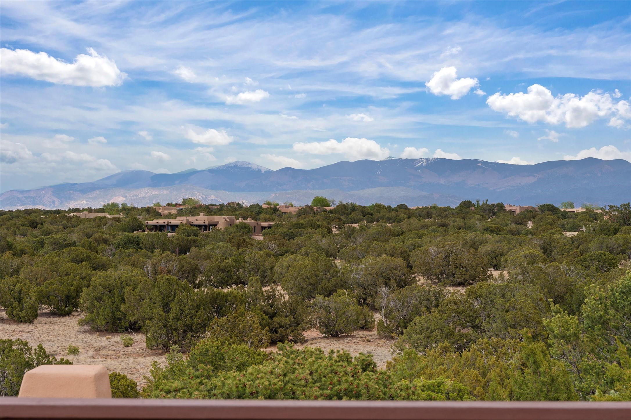 This Soft Contemporary 3-Bed + Den + Retreat / 3.5 -Bath home offers Sangre de Cristo Mountain Views in gated Las Campanas. The Great Room is truly Great, with 2 areas for socializing - One with a Kiva Fireplace, built-in TV / entertainment niche & doors to the Front Portal area. The other is a conversation area with a free-flowing kiva fireplace, wet bar, room for a Baby Grand Piano, Sangre de Cristo views plus access to the Back Portal area with wood-burning kiva fireplace. The Dining area is perfect for sharing meals & has access to the Back Portal area with Built-in BBQ & in-ground spa. The Kitchen has a Sub-Zero refrigerator, Bosch Dishwasher, Dacor Oven & Microwave plus a generous island with Dacor gas cooktop & prep sink. There is also a walk-in wine storage area plus Buffet & Butler's Pantry, both with ample storage. The Owner's Suite includes a kiva fireplace, walk-in closet & its own private portal with a Sangre de Cristo Mountain view. The Owner's Bath offers 2 separate vanities, 2 separate water closets, walk-in shower with body sprays & direct access to the In-ground Spa & outdoor shower. Also in the Owner's Suite wing, there is a private Den / Office with walk-in closet & outdoor access through double French doors as well as a south-facing Library / Retreat area. Two secondary bedrooms, each with their own bathrooms, are on the opposite side of the home, creating privacy from the Owner's Suite. The spacious outdoor area offers a multitude of desirable features - Private In-Ground Spa, Outdoor Shower, Built-in BBQ, Extensive shaded portal areas with wood-burning fireplace & a spacious roof deck with 360-degree Mountain Views. The 3-car garage includes a third, separate stall that can be used as a studio. This fabulous home checks all the boxes - 3 Bedrooms + Den + Retreat * 3 Baths * 3-Car Garage * In-ground Spa * Outdoor Shower * Spacious Roof Deck * Sangre de Cristo Mountain views - Make it yours Today!
