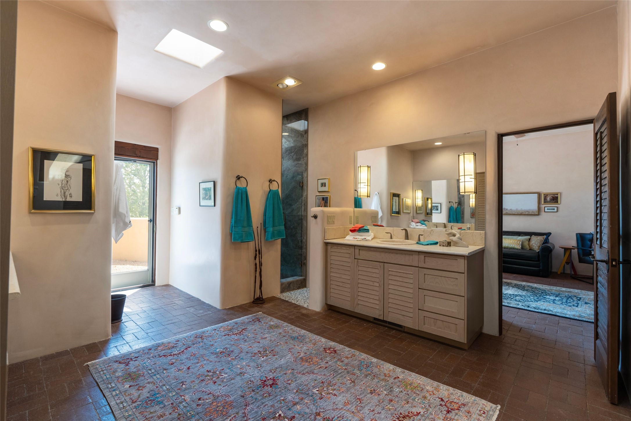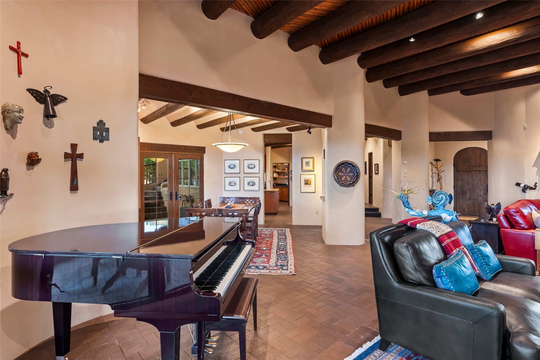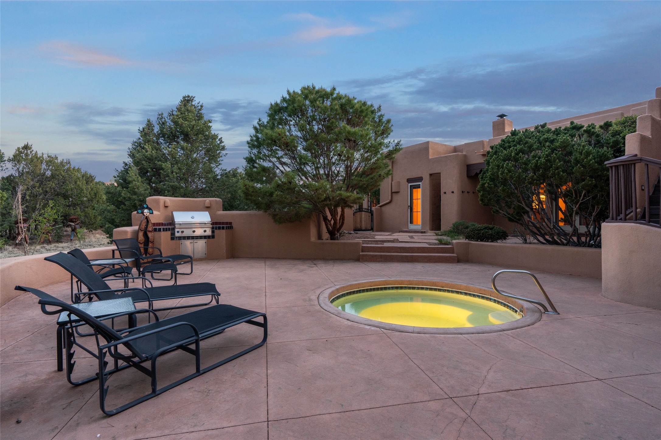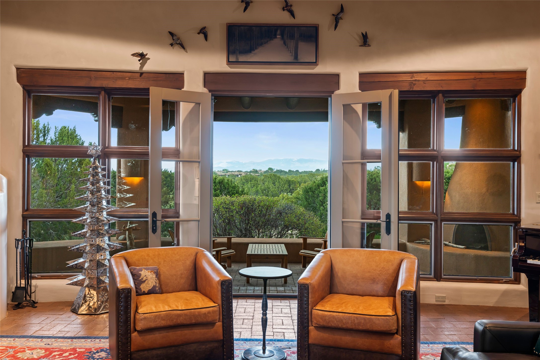 This Soft Contemporary 3-Bed + Den + Retreat / 3.5 -Bath home offers Sangre de Cristo Mountain Views in gated Las Campanas. The Great Room is truly Great, with 2 areas for socializing - One with a Kiva Fireplace, built-in TV / entertainment niche & doors to the Front Portal area. The other is a conversation area with a free-flowing kiva fireplace, wet bar, room for a Baby Grand Piano, Sangre de Cristo views plus access to the Back Portal area with wood-burning kiva fireplace. The Dining area is perfect for sharing meals & has access to the Back Portal area with Built-in BBQ & in-ground spa. The Kitchen has a Sub-Zero refrigerator, Bosch Dishwasher, Dacor Oven & Microwave plus a generous island with Dacor gas cooktop & prep sink. There is also a walk-in wine storage area plus Buffet & Butler's Pantry, both with ample storage. The Owner's Suite includes a kiva fireplace, walk-in closet & its own private portal with a Sangre de Cristo Mountain view. The Owner's Bath offers 2 separate vanities, 2 separate water closets, walk-in shower with body sprays & direct access to the In-ground Spa & outdoor shower. Also in the Owner's Suite wing, there is a private Den / Office with walk-in closet & outdoor access through double French doors as well as a south-facing Library / Retreat area. Two secondary bedrooms, each with their own bathrooms, are on the opposite side of the home, creating privacy from the Owner's Suite. The spacious outdoor area offers a multitude of desirable features - Private In-Ground Spa, Outdoor Shower, Built-in BBQ, Extensive shaded portal areas with wood-burning fireplace & a spacious roof deck with 360-degree Mountain Views. The 3-car garage includes a third, separate stall that can be used as a studio. This fabulous home checks all the boxes - 3 Bedrooms + Den + Retreat * 3 Baths * 3-Car Garage * In-ground Spa * Outdoor Shower * Spacious Roof Deck * Sangre de Cristo Mountain views - Make it yours Today!