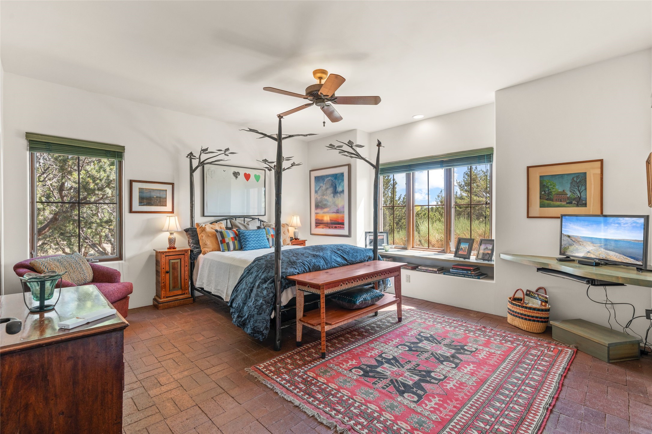 In the tree-studded rolling hills northwest of town are Las Campanas and a host of other developments and neighborhoods of larger, private lots and newer homes, most with city services and utilities. The land here sits between the city and the arroyos that carry rainwater to the Rio Grande, just a few miles west, creating a landscape almost like ocean waves rolling into shore. The community of