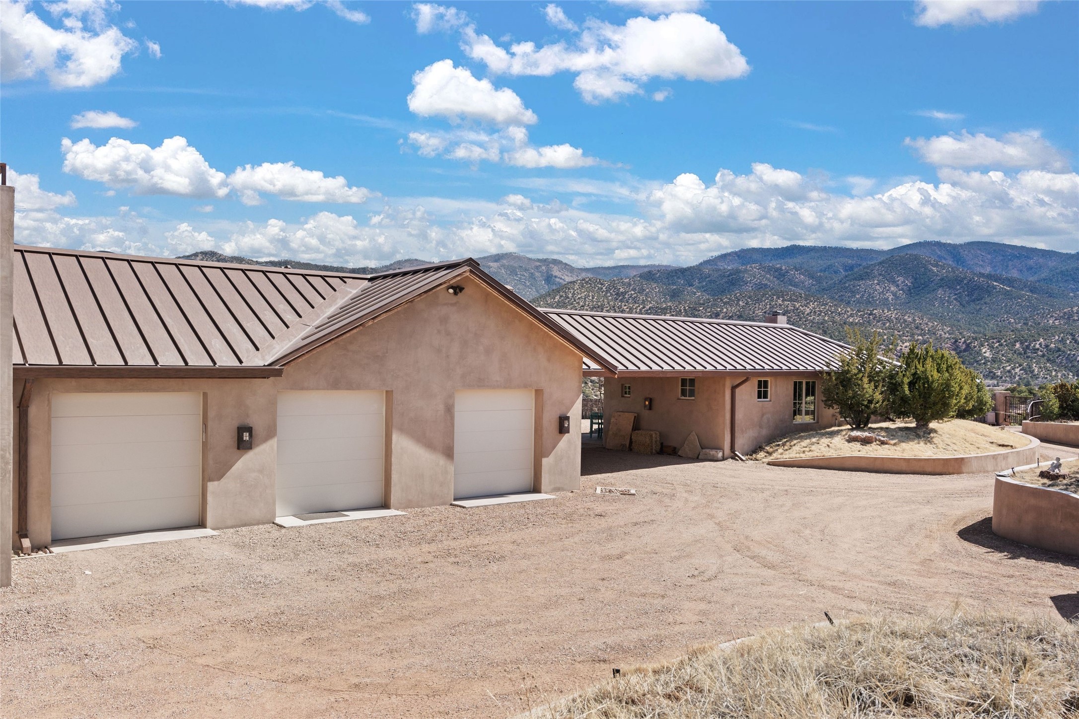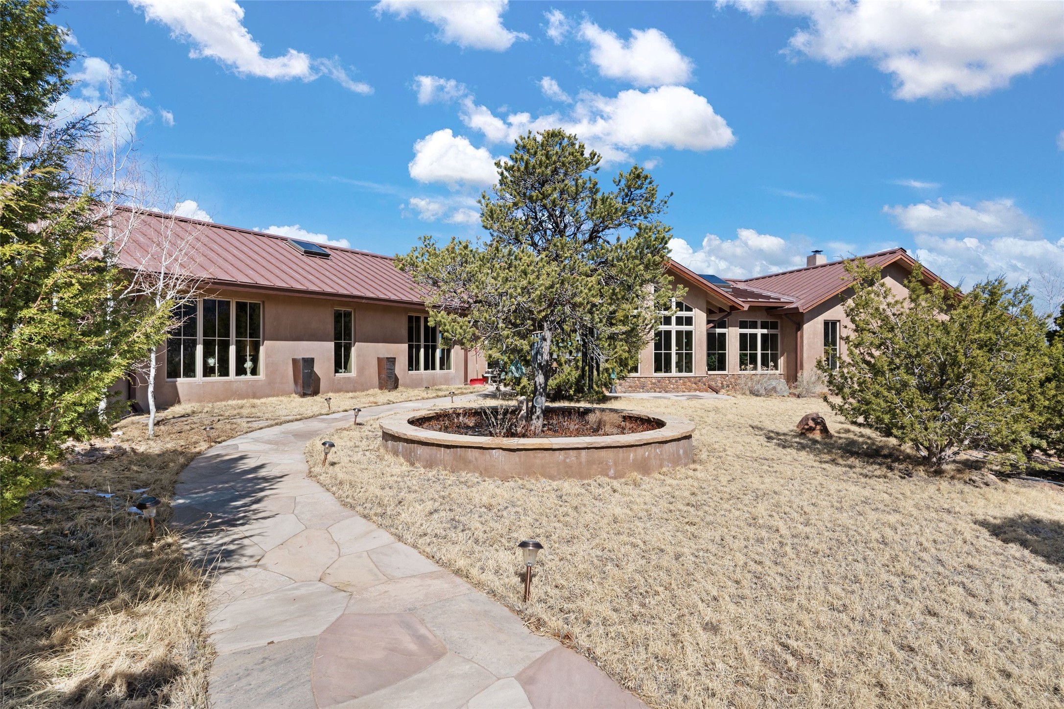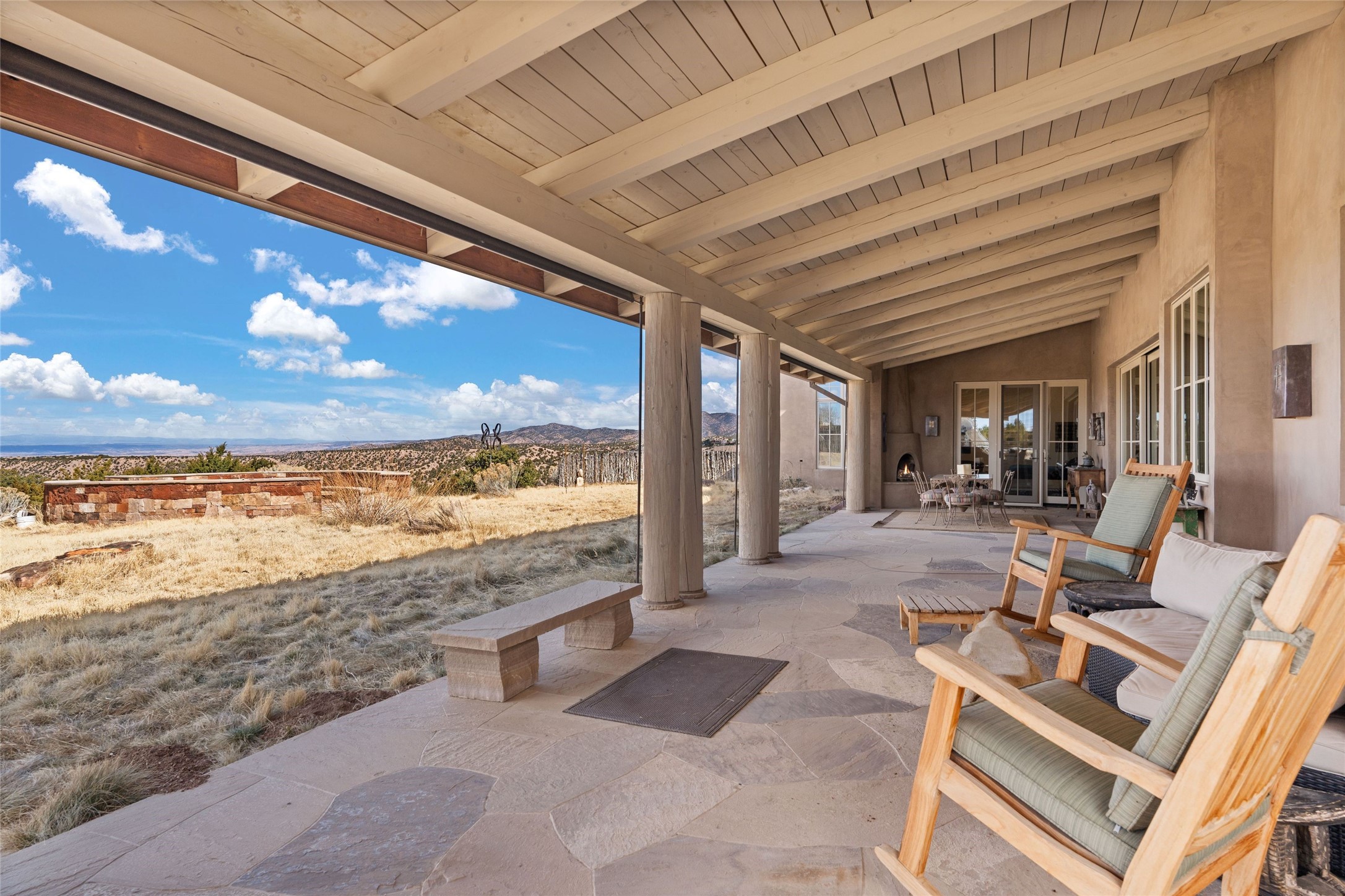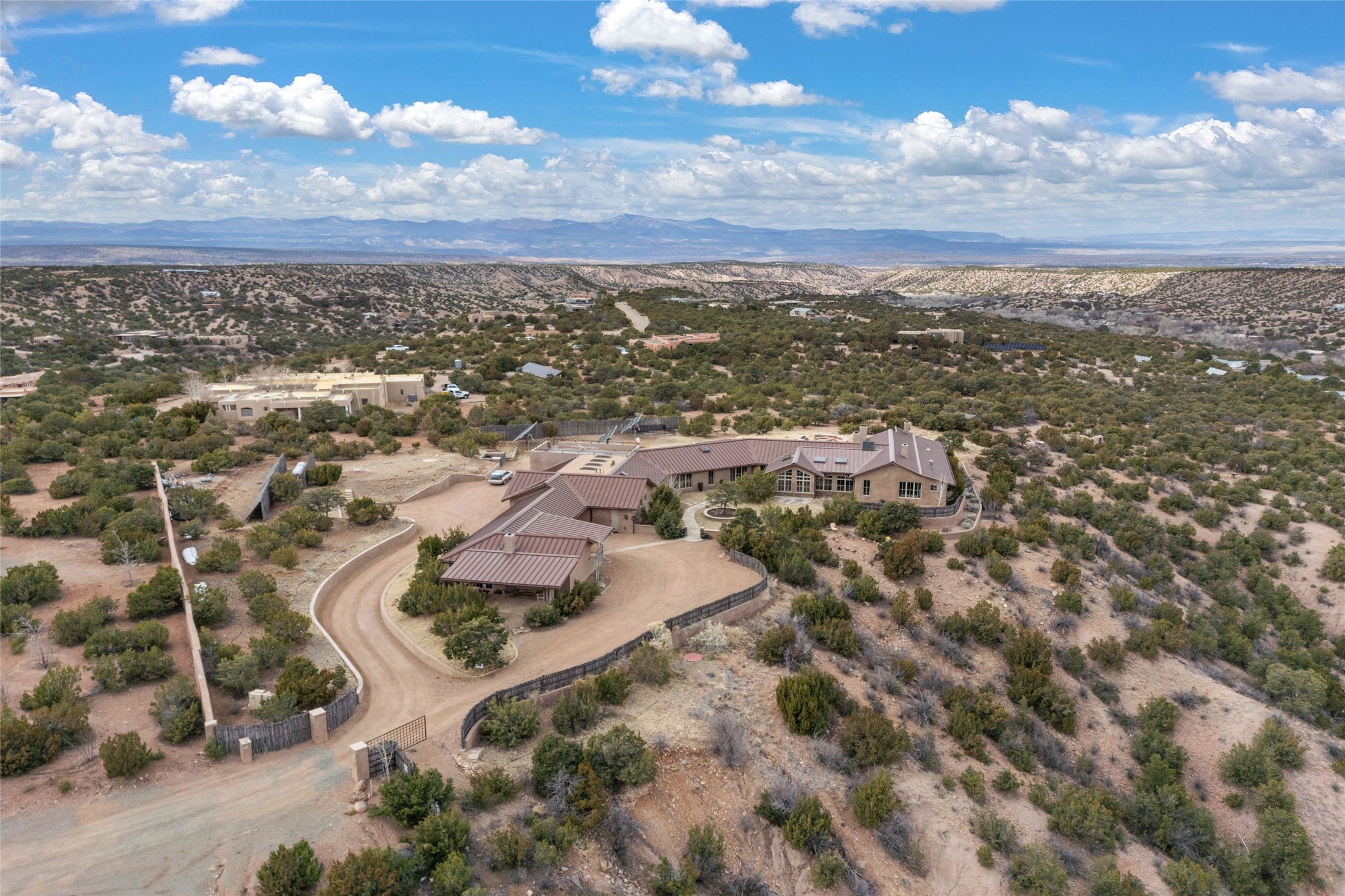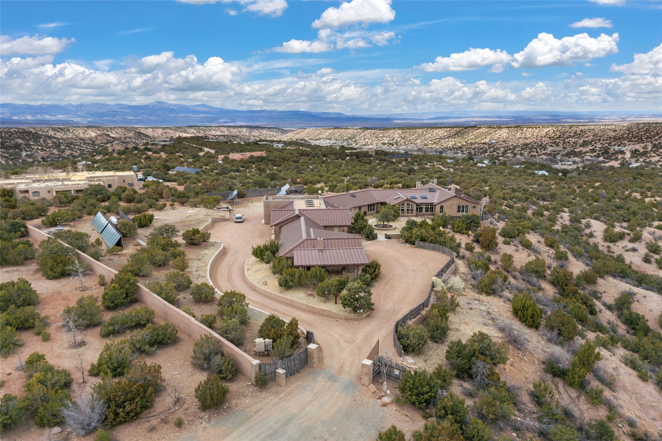 An extraordinary opportunity to embrace a luxurious, self-sustaining lifestyle in this Northern New Mexico farmhouse within the gated community of Tesuque Villas. This single-level home with guesthouse is designed for off-grid potential including: a solar photovoltaic electric system, and backup generator, rainwater harvesting, private well, 10,000-gallon underground water storage tank, and 3,000-gal propane storage. Designed as a healthy home with consulting architect Paula Baker-Laporte. Inside the main home, the kitchen is equipped with a built-in Subzero refrigerator and freezer, Wolf six-burner gas stove, and Bosch dishwasher. The attached butler's pantry provides Wolf appliances including double ovens, steam oven, Miele coffee cappuccino maker, second Bosch dishwasher, and a storage room. Black walnut and locally sourced flagstone floors throughout the home with radiant in-floor heat. The great room presents a central kitchen island with solid amazonite countertop. Adjacent office space provides a convenient area for work/study. The primary suite features an infrared sauna, steam shower, heated towel rack, expansive closet, laundry, and library. With inviting outdoor kiva-style fire pit and roof deck with 360-long-range views this home exemplifies the perfect blend of modern luxury and natural beauty. Sited within the Sangre de Cristo mountains with a spectacular view of the Jemez Mountain range, this private location is just a short drive from downtown Santa Fe and minutes from the Four Seasons Rancho Encantado Resort and Tesuque Village Market.