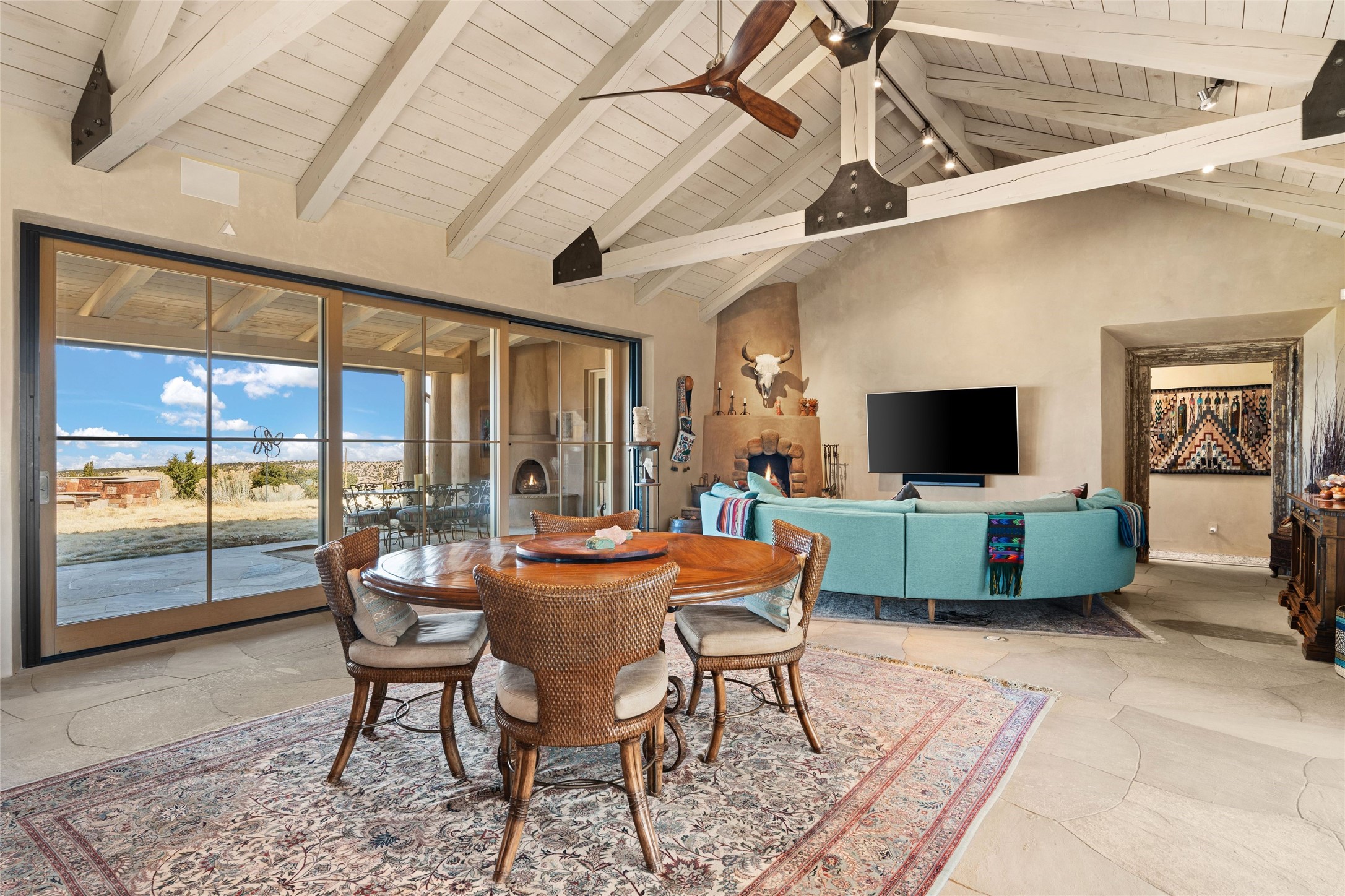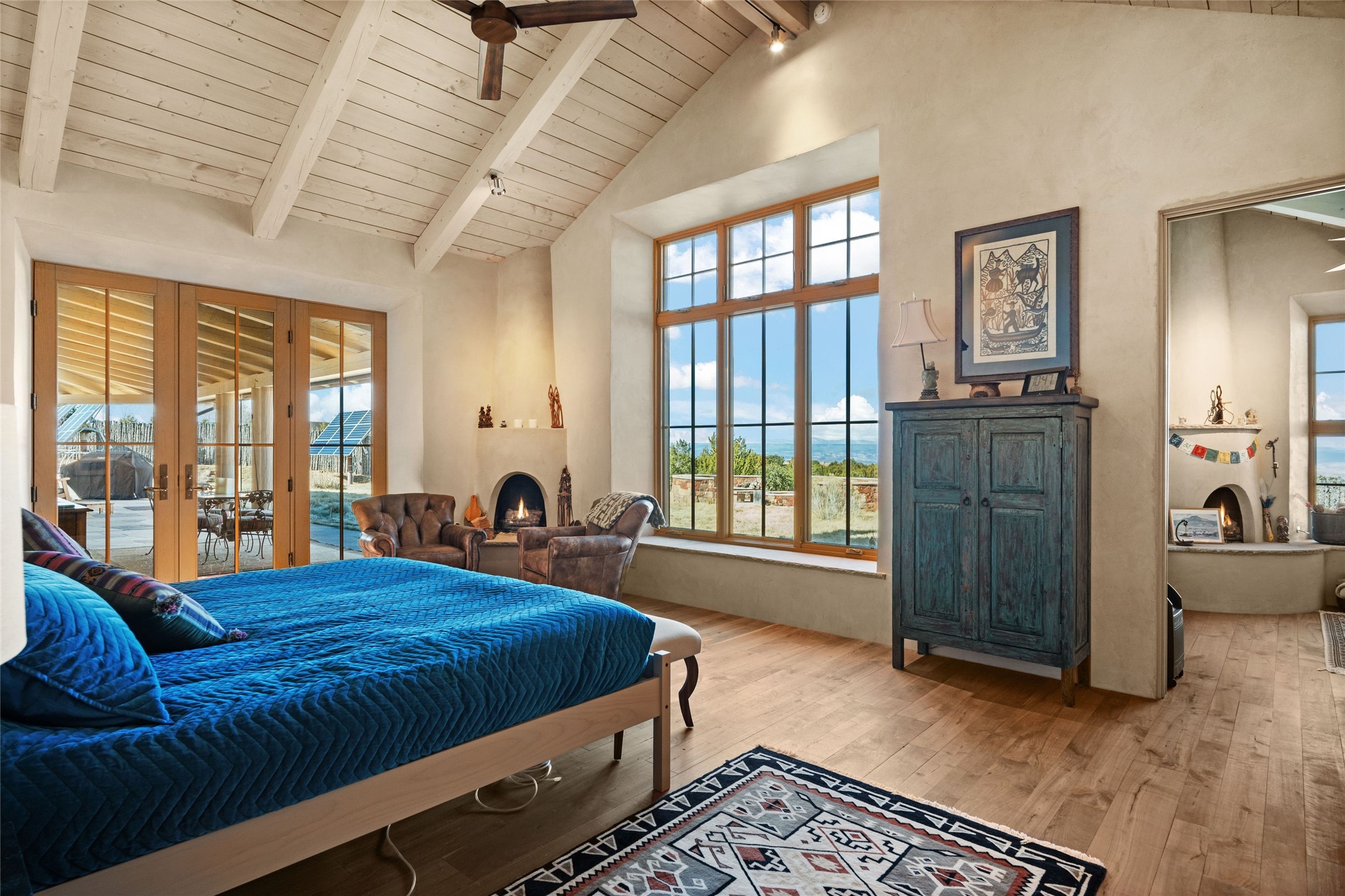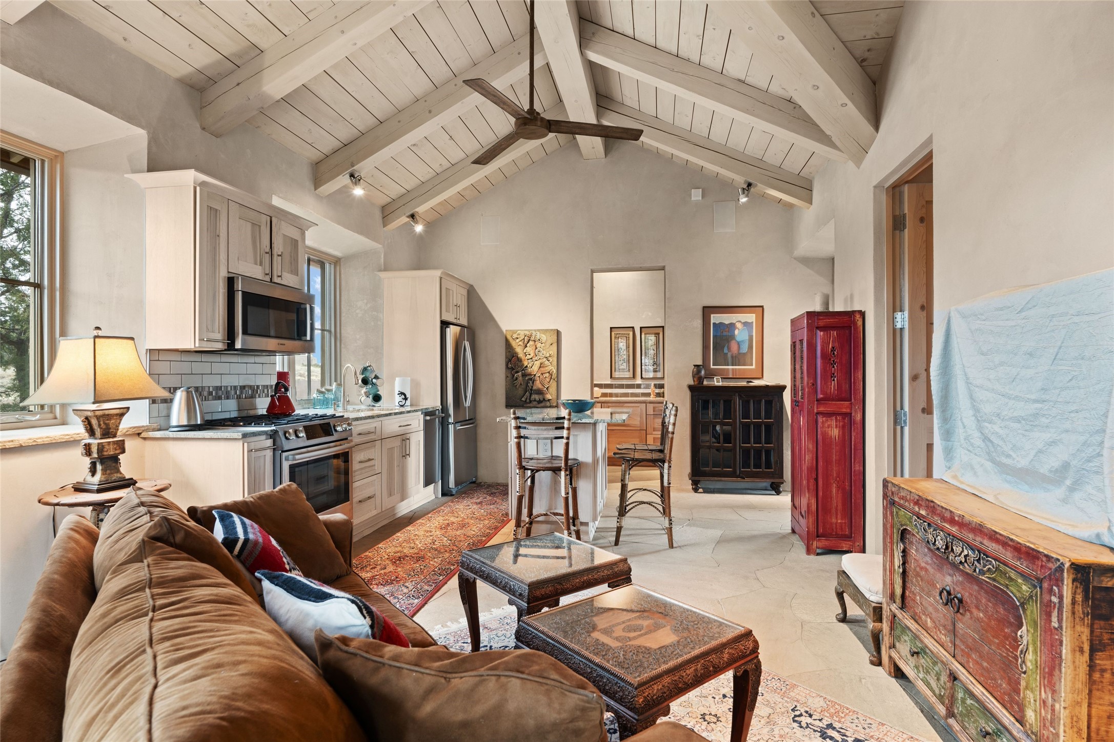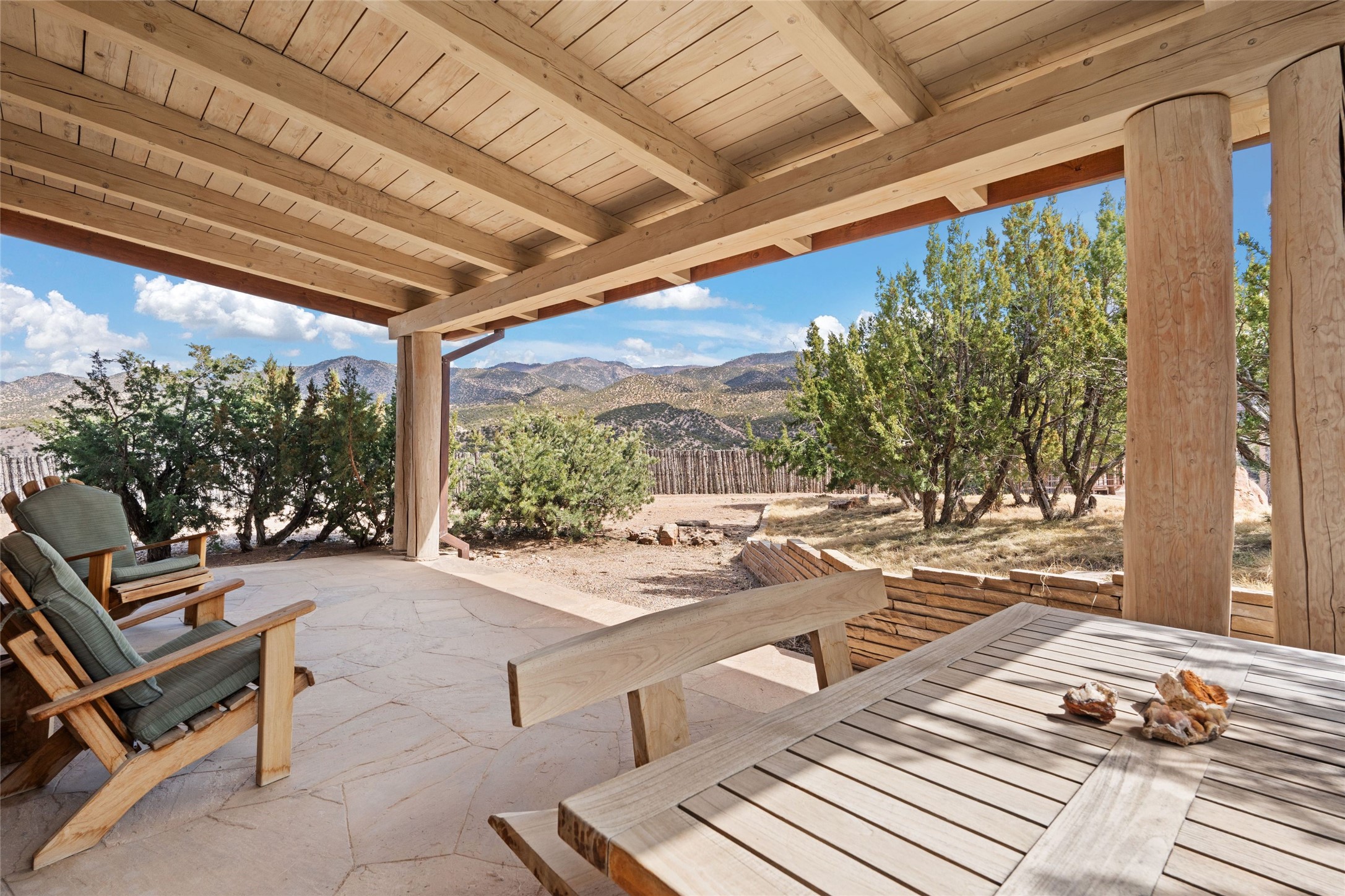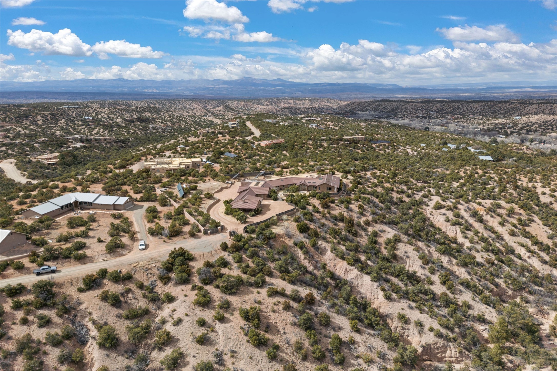 An extraordinary opportunity to embrace a luxurious, self-sustaining lifestyle in this Northern New Mexico farmhouse within the gated community of Tesuque Villas. This single-level home with guesthouse is designed for off-grid potential including: a solar photovoltaic electric system, and backup generator, rainwater harvesting, private well, 10,000-gallon underground water storage tank, and 3,000-gal propane storage. Designed as a healthy home with consulting architect Paula Baker-Laporte. Inside the main home, the kitchen is equipped with a built-in Subzero refrigerator and freezer, Wolf six-burner gas stove, and Bosch dishwasher. The attached butler's pantry provides Wolf appliances including double ovens, steam oven, Miele coffee cappuccino maker, second Bosch dishwasher, and a storage room. Black walnut and locally sourced flagstone floors throughout the home with radiant in-floor heat. The great room presents a central kitchen island with solid amazonite countertop. Adjacent office space provides a convenient area for work/study. The primary suite features an infrared sauna, steam shower, heated towel rack, expansive closet, laundry, and library. With inviting outdoor kiva-style fire pit and roof deck with 360-long-range views this home exemplifies the perfect blend of modern luxury and natural beauty. Sited within the Sangre de Cristo mountains with a spectacular view of the Jemez Mountain range, this private location is just a short drive from downtown Santa Fe and minutes from the Four Seasons Rancho Encantado Resort and Tesuque Village Market.