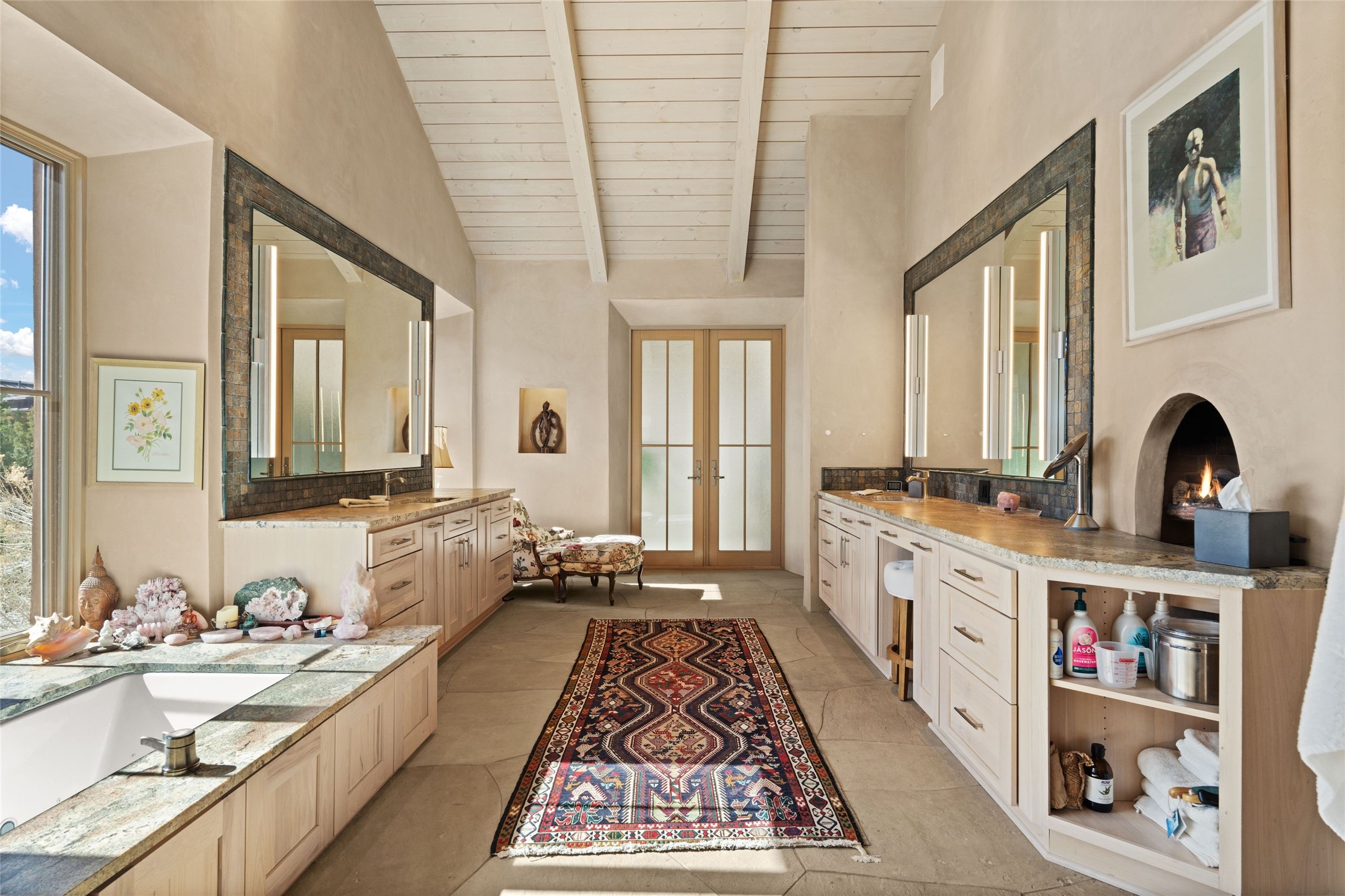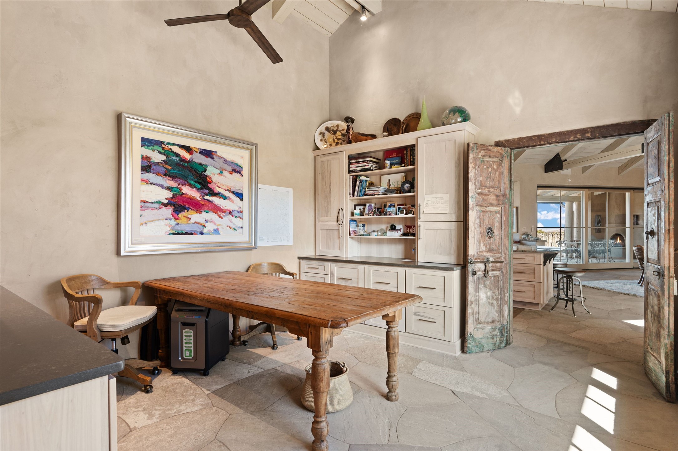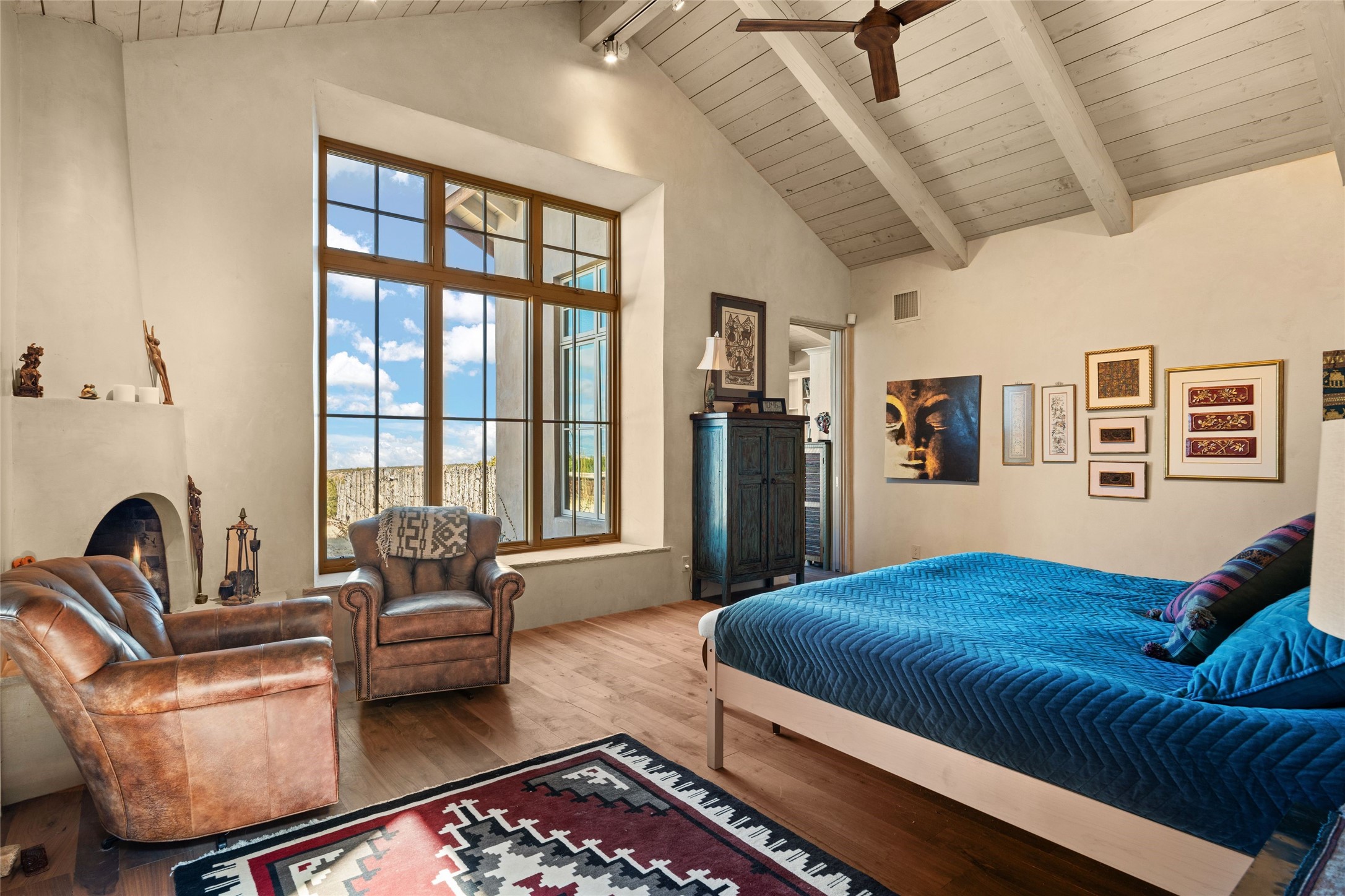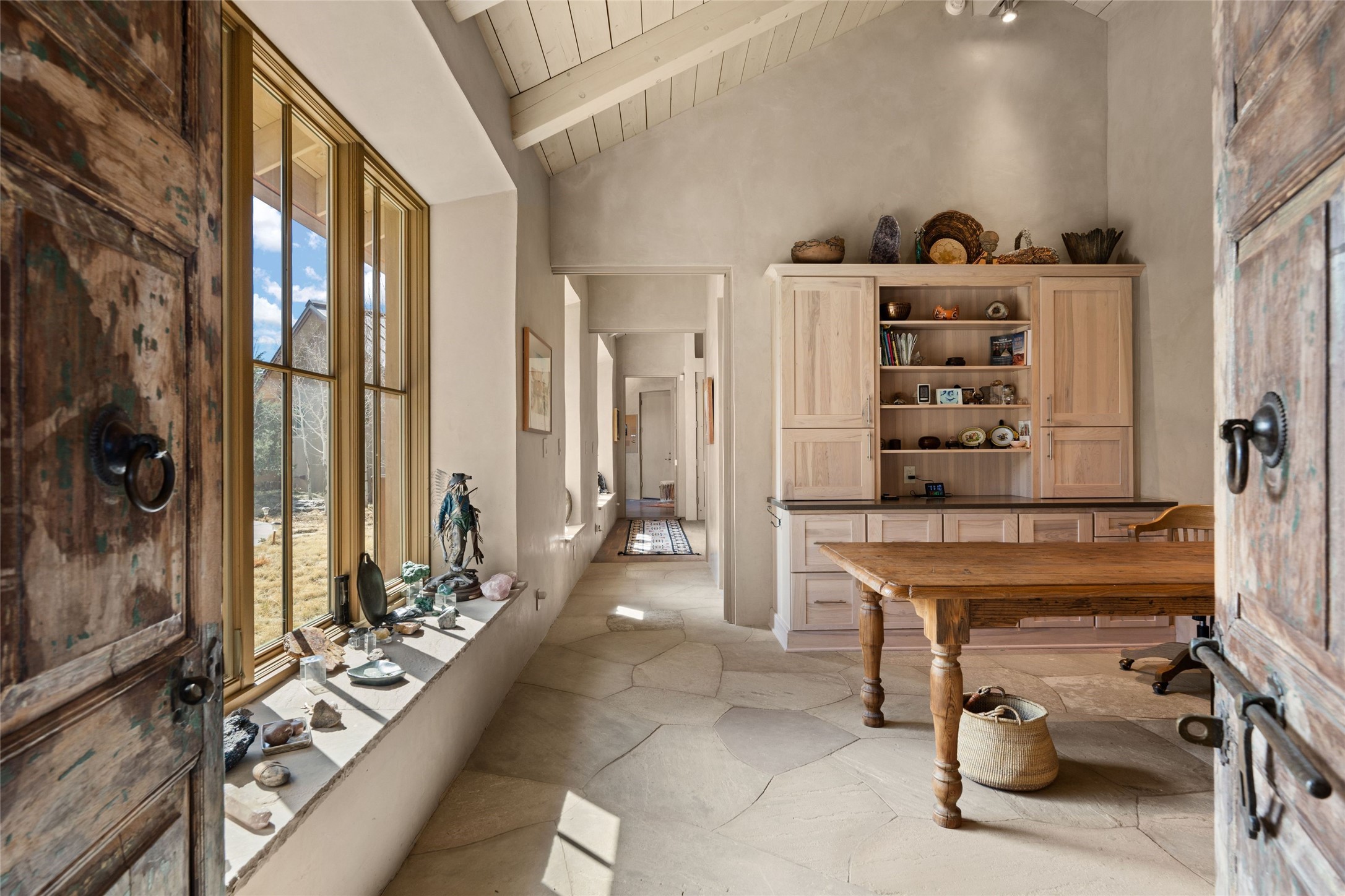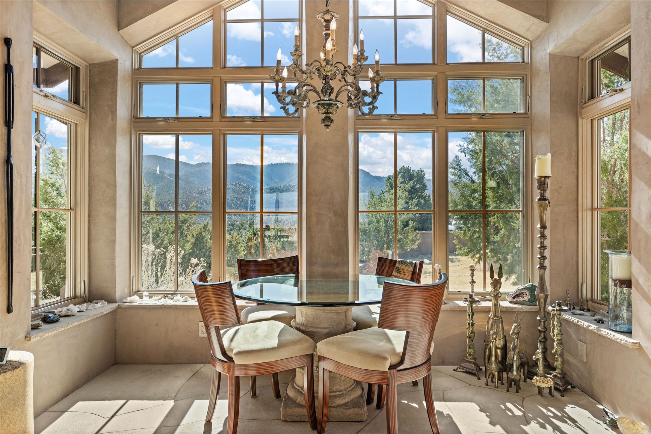 An extraordinary opportunity to embrace a luxurious, self-sustaining lifestyle in this Northern New Mexico farmhouse within the gated community of Tesuque Villas. This single-level home with guesthouse is designed for off-grid potential including: a solar photovoltaic electric system, and backup generator, rainwater harvesting, private well, 10,000-gallon underground water storage tank, and 3,000-gal propane storage. Designed as a healthy home with consulting architect Paula Baker-Laporte. Inside the main home, the kitchen is equipped with a built-in Subzero refrigerator and freezer, Wolf six-burner gas stove, and Bosch dishwasher. The attached butler's pantry provides Wolf appliances including double ovens, steam oven, Miele coffee cappuccino maker, second Bosch dishwasher, and a storage room. Black walnut and locally sourced flagstone floors throughout the home with radiant in-floor heat. The great room presents a central kitchen island with solid amazonite countertop. Adjacent office space provides a convenient area for work/study. The primary suite features an infrared sauna, steam shower, heated towel rack, expansive closet, laundry, and library. With inviting outdoor kiva-style fire pit and roof deck with 360-long-range views this home exemplifies the perfect blend of modern luxury and natural beauty. Sited within the Sangre de Cristo mountains with a spectacular view of the Jemez Mountain range, this private location is just a short drive from downtown Santa Fe and minutes from the Four Seasons Rancho Encantado Resort and Tesuque Village Market.