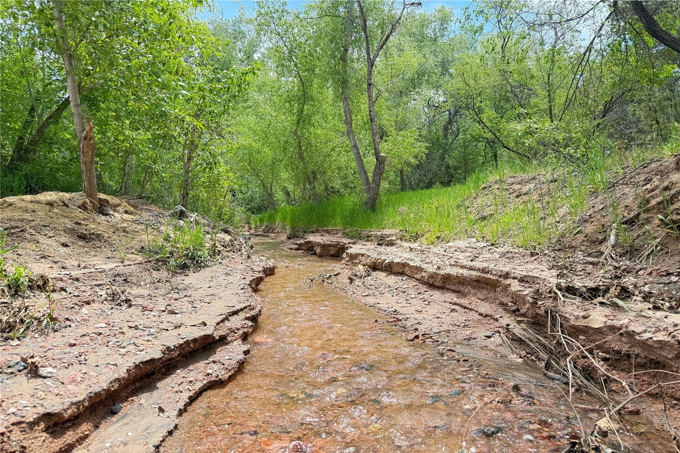 Exquisite Historic Compound with Modern Luxuries - Recent Extensive Renovation Creating a Truly Unique Lush Tesuque Oasis. Welcome to this extraordinary multi-residence estate nestled on a historic 100+ year-old property. Seamlessly blending Old Santa Fe charm with modern sophistication. From handcrafted elements to lush gardens, every detail of this property tells a story.Enter into a serene courtyard with water features, mature trees, and fruiting grapevines that leads to a warm sitting room and flows into the dining area and gourmet kitchen.Granite leather-finished countertops, a deep stone sink, open shelving, skylights, Liebherr fridge, and custom cabinetry complete a kitchen that is like no other. The main house features timeless design with 18 inch adobe walls, hardwood floors, original vigas, multiple kivas and custom cabinetry crafted on-site from 100-year-old wood.Downstairs, the primary suite is nestled below the main living area. Relax with a kiva fireplace, and a peaceful view of the back garden. Stunning Brazilian Aquamarine granite graces the primary bath. "Dancing Hare" casita offers Saltillo tile, two bedrooms, a full kitchen with Taj Mahal counters, turquoise cabinets, and a private patio and balcony. This casita has separate parking adding privacy. "Laughing Horse" casita features open-concept living with large glass doors opening to the garden with stable views, original exposed brick and wood stove, and a full kitchen. Additional Structures include large art studio with private entrance, an expansive gym, and two-stalled stables. This property boats multiple stunning outdoor spaces for dining, gardening and entertaining parties intimate or grand. Terraced levels, hot tub, fire-pit, a creek running at the back of the property and apricot trees complete this oasis. A rare opportunity to own a piece of history enhanced with artisanal craftsmanship and high-end modern finishes. A perfect personal sanctuary or family compound.