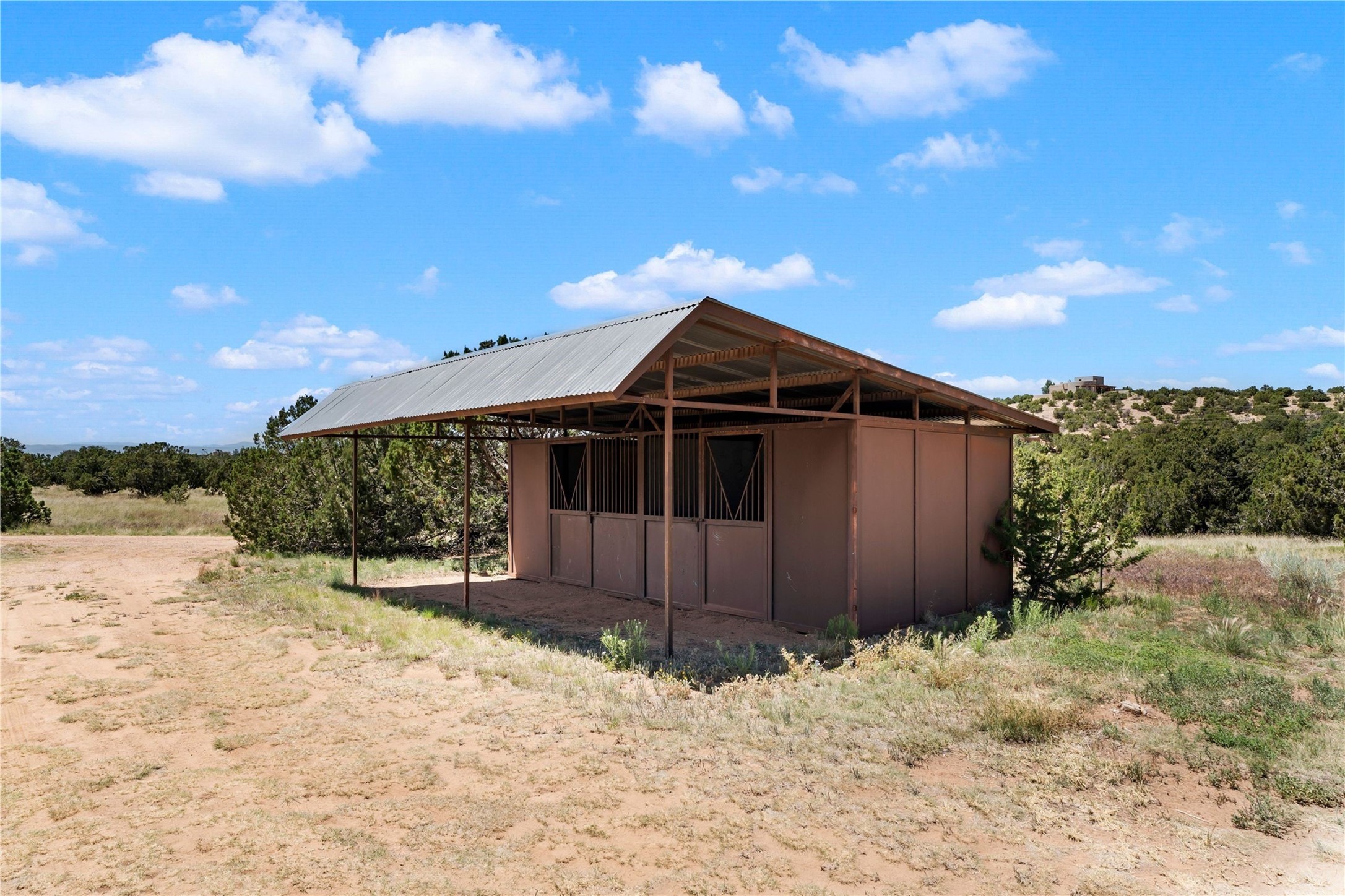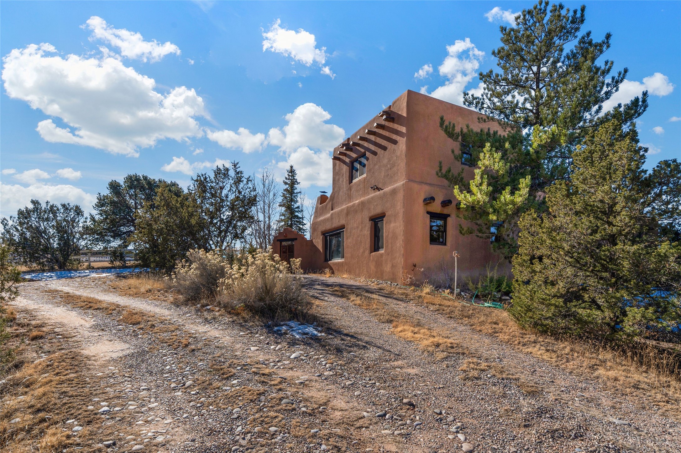 Sited on two and a half acres in a bucolic rural setting with pretty Sangre de Cristo mountain views, this charming Pueblo style adobe home offers traditional architectural details such as beautiful wood ceilings of vigas and latillas, also coved ceilings with vigas, plaster walls, solid wood doors, wooden lintels, brick and Saltillo tile floors, Talavera tile, and a kiva fireplace. The property features beautiful large pine trees, an enclosed yard with perennial plantings and lovely flower gardens, and a synthetic wood deck. The studio space is fitted with blackout window coverings, so it can be used as a dark room as well. The original infrastructure has been upgraded: the electrical system, new mechanical room with boiler and water heater, roof and stucco, and the well was recently maintained with new pressure tanks installed. There's also a small horse barn on the lot. Quintessential Santa Fe!