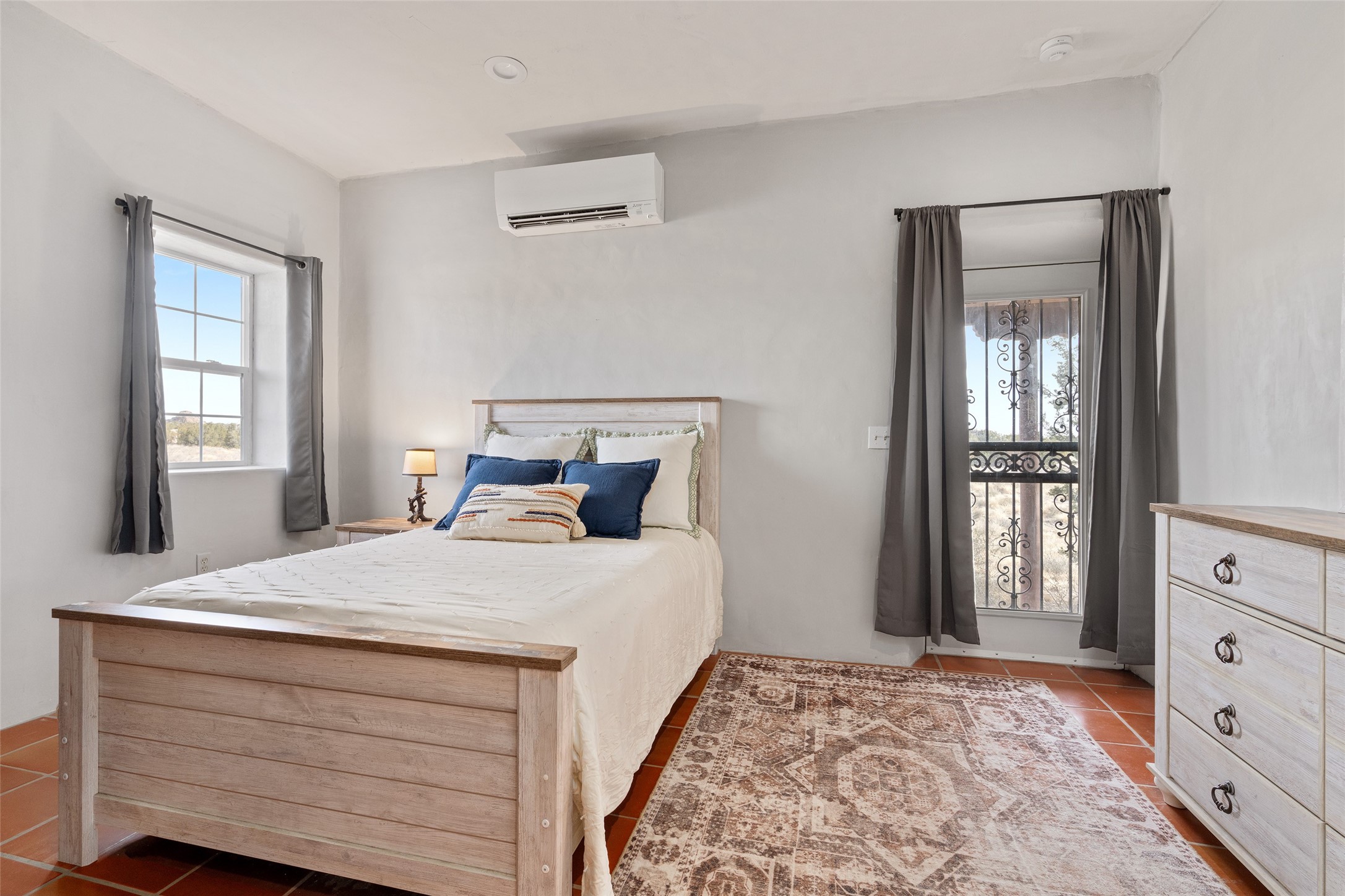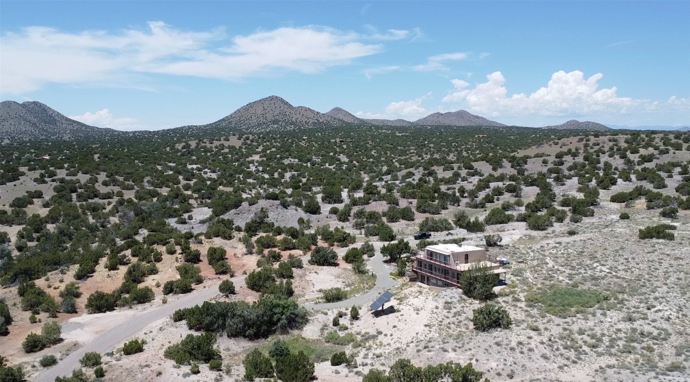 What you need to know - No HOA fees, Views for miles, Horses allowed and around 25 min to Plaza, Canyon Road, or Railyard, and 50 min from ABQ Intl Airport. This home has been renovated to accentuate traditional Santa Fe features -- walnut hardwood floors and locally hand-forged chandeliers have been added to the 10-foot ceilings with vigas and stone accent walls. The kitchen now has high-end appliances, granite countertops, and a Lacunza wood-burning stove, blending beauty and function. The open concept living, dining, and kitchen area is filled with natural light from expansive windows overlooking the surrounding landscape Talavera tile risers lead to the owner's suite, which encompasses the entire upstairs. Relax with the Mr. Steam dream shower and 2-person jetted tub surrounded by marble flooring, or watch the sunset from one of the balconies. On the main floor you'll find two bedrooms, both with outdoor access, and a shared bathroom and office space located by the entrance. Downstairs there is another bedroom, workout space, storage, laundry, meditation room with kiva and a fully equipped theater room - all of which stays with home. The rest of the space is open to your imagination - kids play room, art studio... The productive well features a new pump, cistern, and multi-stage filtration system. Programmable mini splits provide year-round comfort, while owned solar panels help keep energy costs low. The regraded and graveled driveway, along with an excavated pad, offers ample space for RVs or recreational toys, and potential for a horse barn or casita. Sitting on 16 acres of gently rolling hills dotted with juniper, mountain mahogany, and pion--it offers exceptional privacy, yet easy access to amenities.
