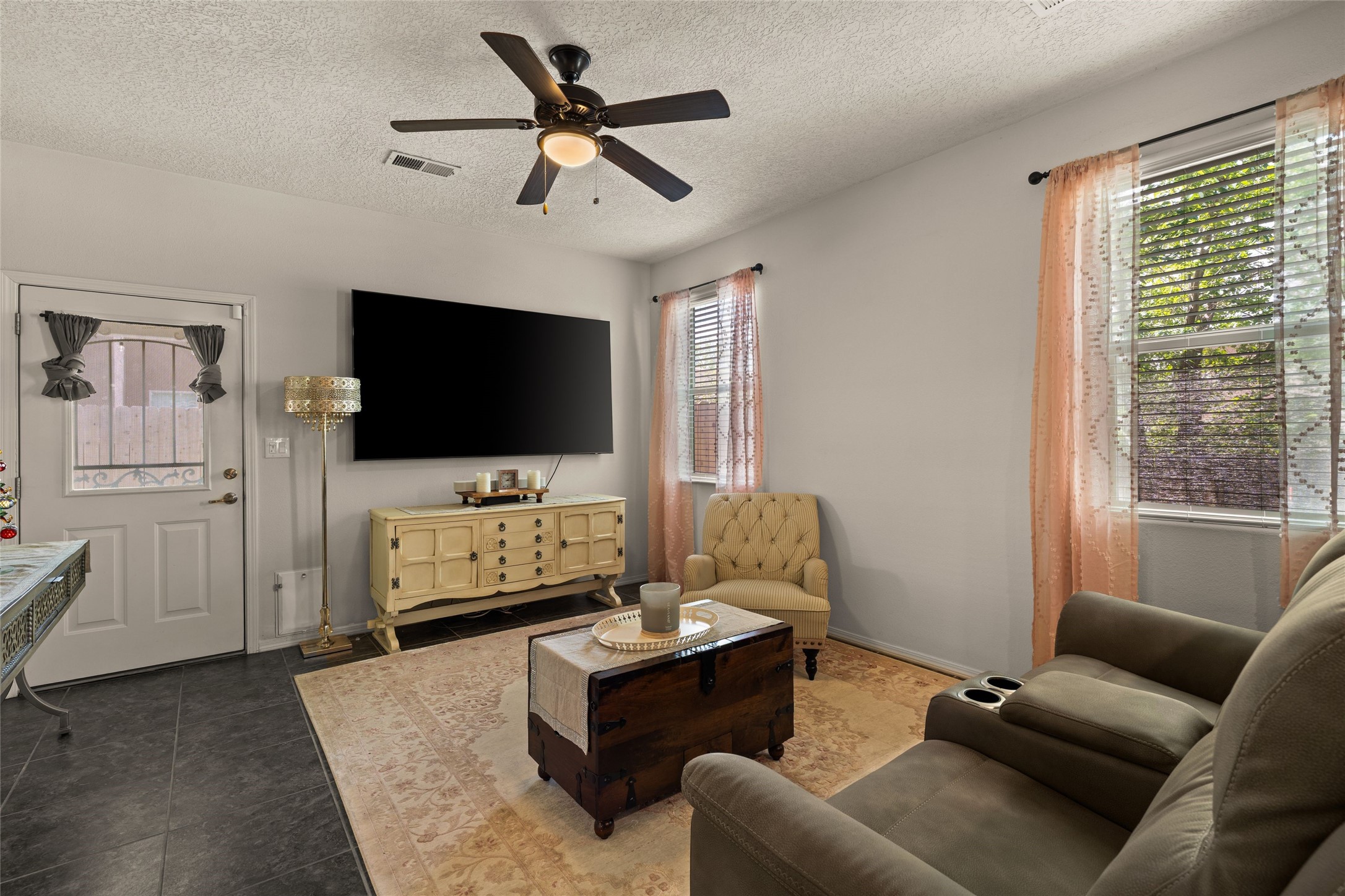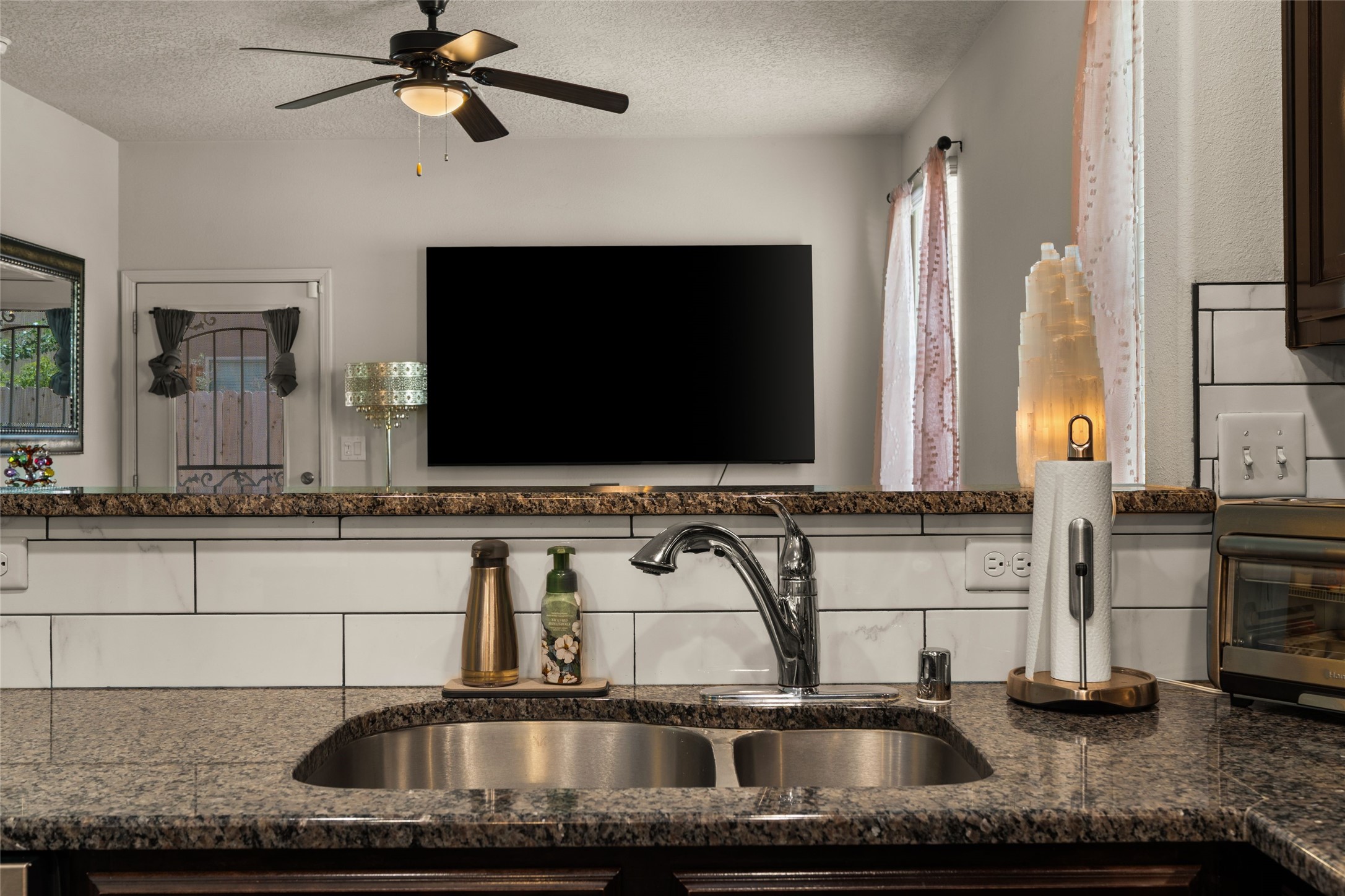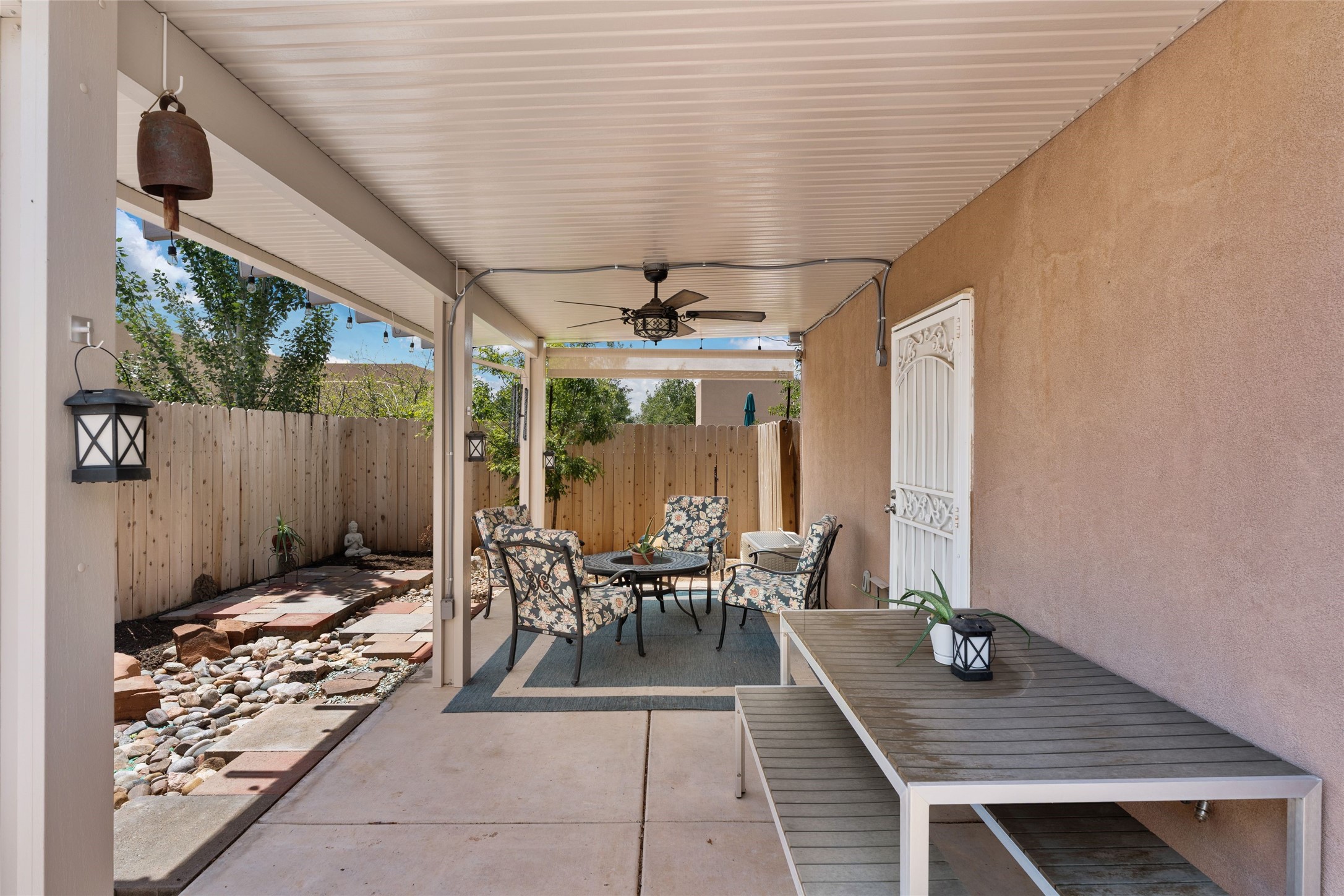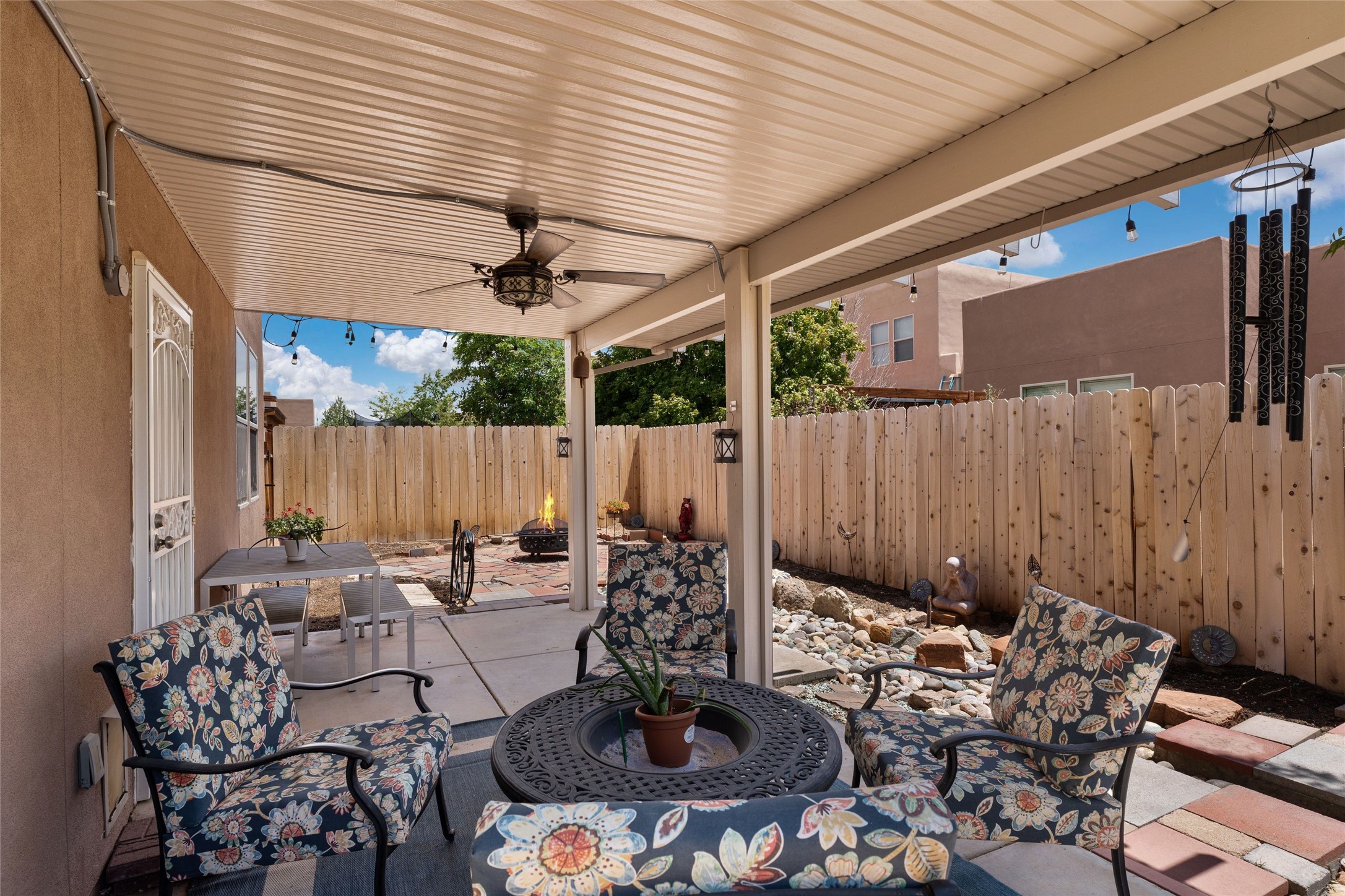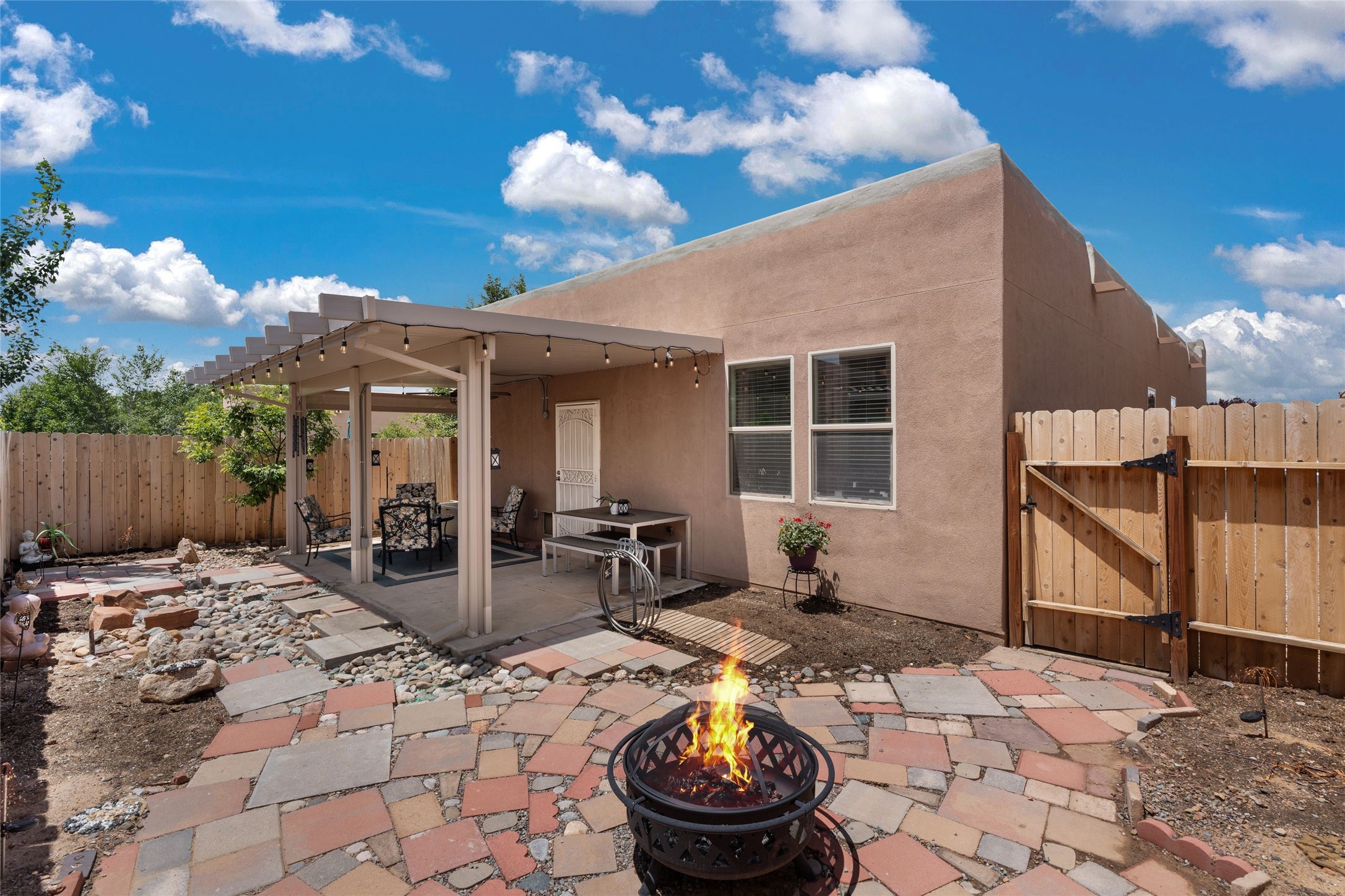 Easy to move in, with all the many upgrades and improvements! When you walk in the house, don't miss the large home office space, completely set-apart from the rest of the house. This generous space could be anything you envison - yoga retreat, media space, or a play area for children! When you continue into the public spaces you will appreciate the flow from dining to kitchen. Every cook enjoys a divided raised counter for serving, or showing off dessert! The kitchen is so thoughtfully laid out: gas range, center work island, and even a walk-in pantry. The living room is planned for both social and media enjoyment. And now, for the surprise! When you walk through the living to the outdoor area you will find a delightful and carefully planned entertainment yard! Completely fenced both for privacy and happy dogs: landscaped in Santa Fe style (more rock gardens than plants). The highlight is a large shaded portal, the seating/eating area is really an outdoor living room! Good coverage for sun protection, there is even a solar shade on the west side. In Santa Fe we covet outdoor spaces and this one is truly special. And now, what every buyer hopes for - 3 bedrooms with great separation. The primary bedroom is en-suite, and includes a walk-in closet plus a linen closet in the bathroom. The other two bedrooms seem private and set-apart, and both share a generous hall bathroom. All bedrooms are a good size, and if needed could become a get-away home office. Houses in Santa Fe are all the more special if there is a garage: this one is a two-car, (+storage) and with attached direct entry. good access. And, the trip with groceries from garage to kitchen is easy! Recent work includes extensive roof upgrades, parapets re-done & stucco maintenance.This geographical location is excellent, with easy access to 599 and many amenities. Don't miss the Chavez center: 3 pools, exercise equipment + classes, even ice-skating! This is a great place to call HOME!