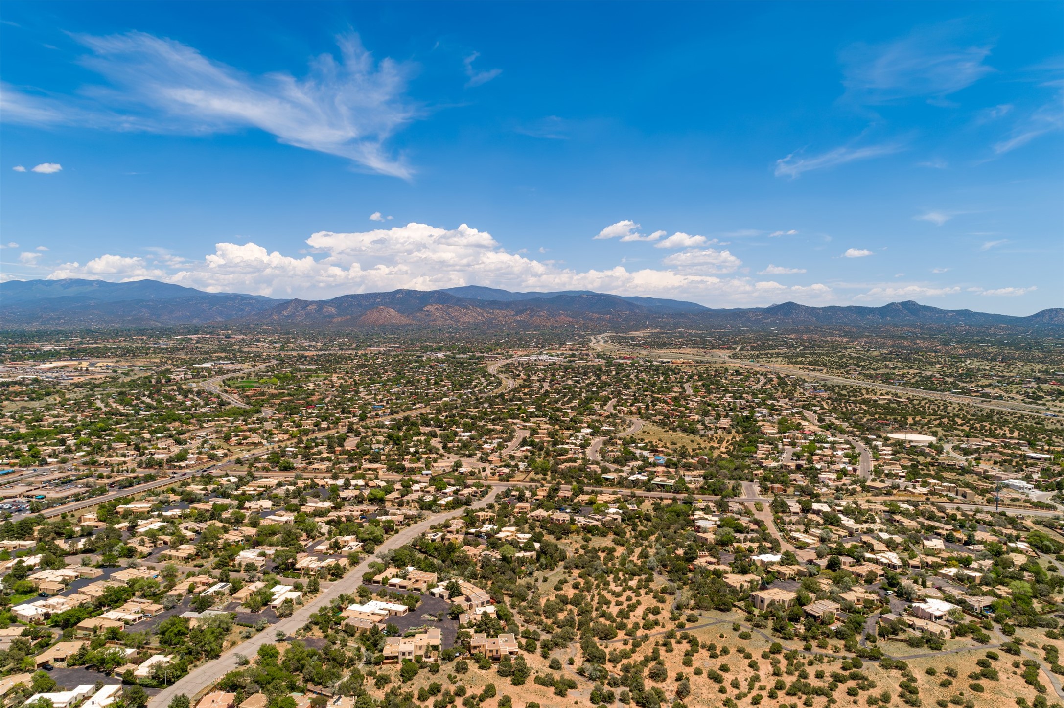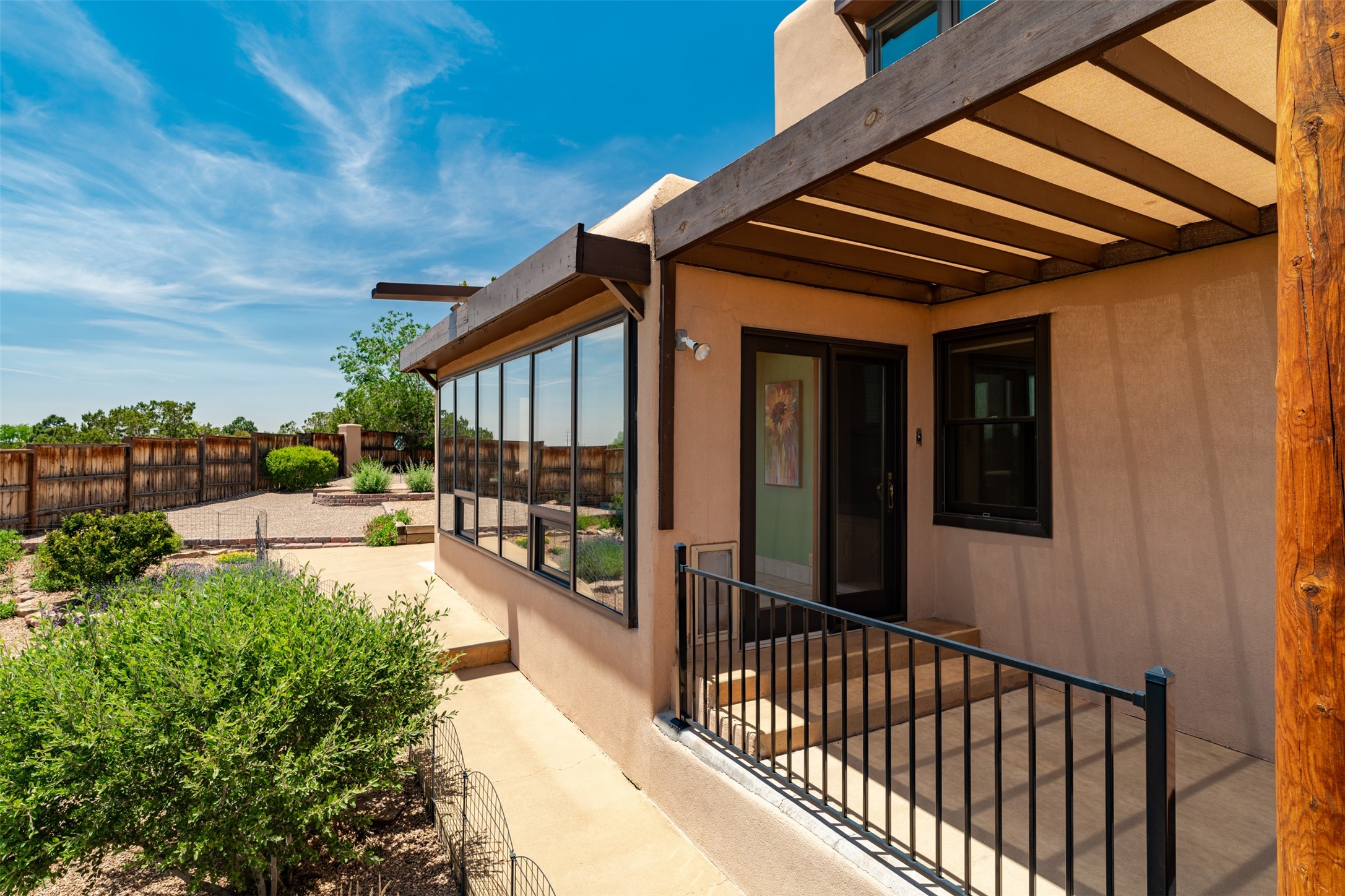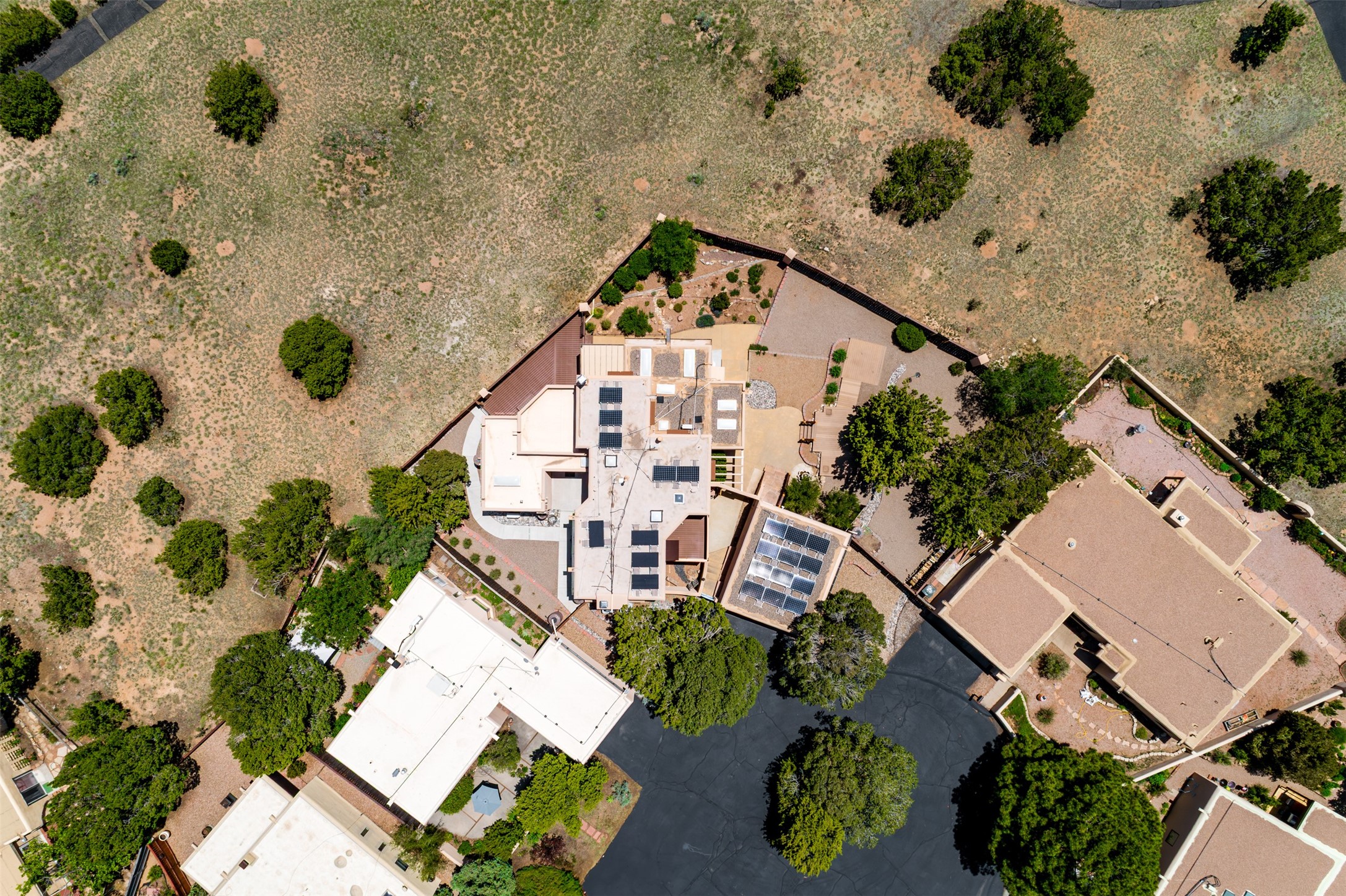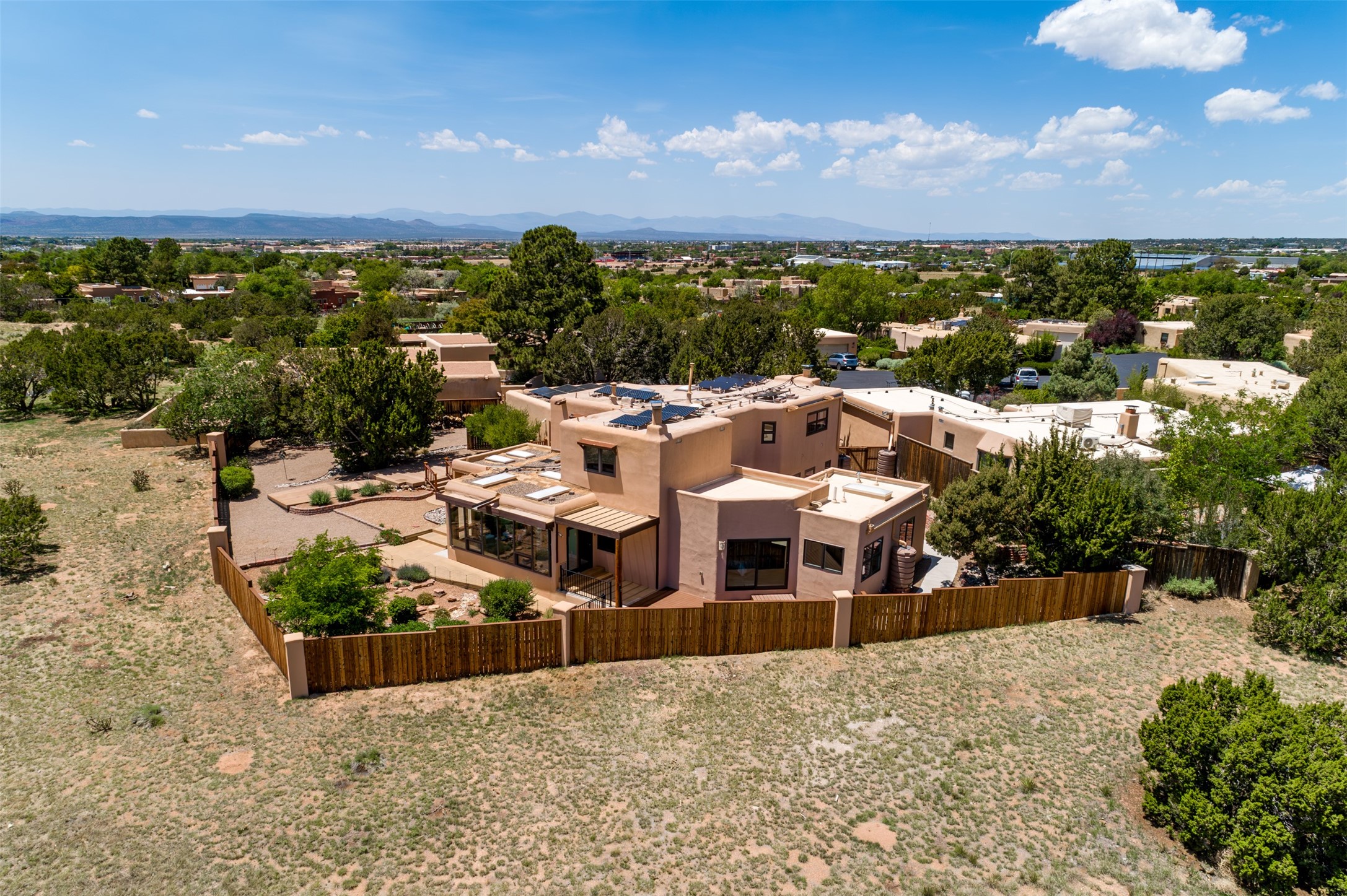 Nestled amid sweeping views and exquisite natural surroundings, this remarkable 4-bedroom, two story, home is a serene and sustainable retreat with a perfect blend of comfort, character, and eco-conscious upgrades. The luxurious, newer (2020) 600 sq ft primary suite on the main floor offers privacy and indulgence, complete with its own mini-split system, a spa-like bathroom, and direct access to outdoor living spaces. Three additional bedrooms are upstairs, where a sunny second-floor deck invites morning coffee or sunset unwinding.Skylights throughout the home bathe the interiors in natural light, highlighting thoughtful details like American clay walls, wood-beamed ceilings, and not one, but two fireplaces--including a charming corner Kiva in the dining room and a striking centerpiece hearth in the living room with a cozy built-in window seat.The bright, eat-in kitchen is a delight with newer appliances, abundant cabinetry, a classic white subway tile backsplash, and views that inspire. Comfort is ensured year-round with two-zone HVAC, refrigerated A/C, mini-splits, and tankless hot water in both upstairs baths.Outside, this home continues to impress with lush xeriscaping, a fenced garden area, and a fully fenced yard. A detached two-car garage includes an extra storage room, while multiple portals and decks provide ideal spots for dining, relaxing, or stargazing. Eco-conscious buyers will appreciate the complete solar electric system and 900-gallon rainwater catchment.This home is a rare find--where views, design, and sustainability come together in perfect harmony.This home is tucked away at the end of a cul-de-sac, with acres of open space and walking trails behind the house. Park Plazas has 8-9 miles of hiking trails, tennis courts, a community garden and is an oasis in the center of Santa Fe close to restaurants, shopping and other amenities, Don't miss this spectacular home in this wonderful neighborhood.