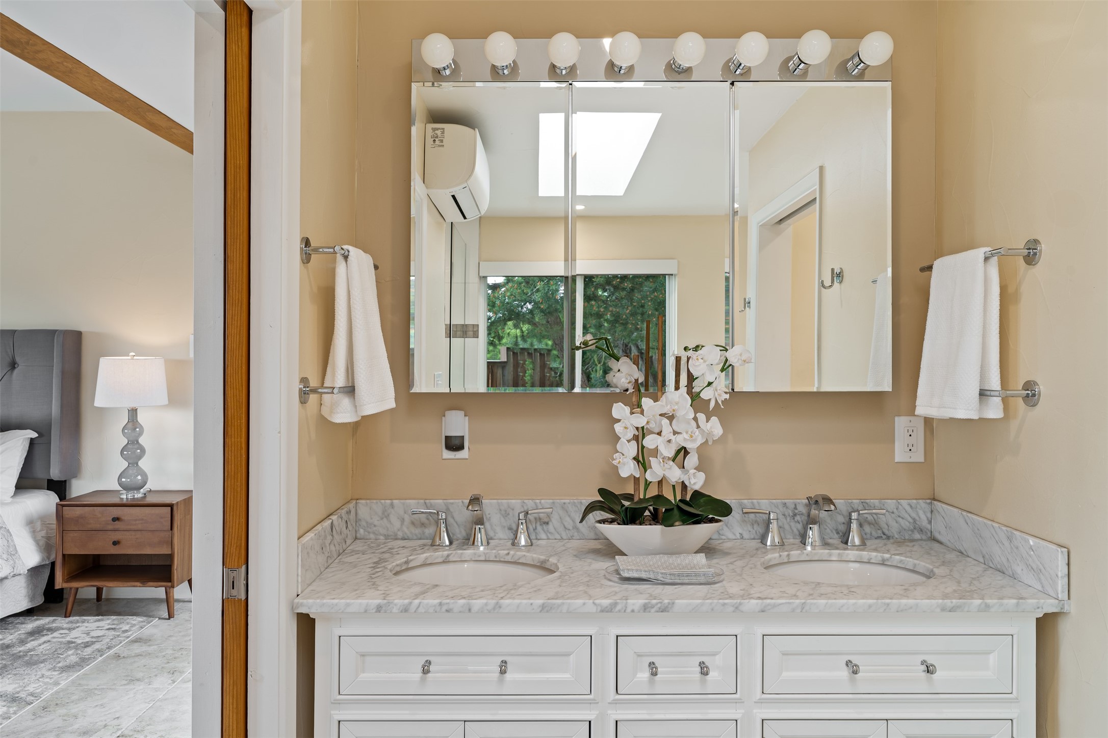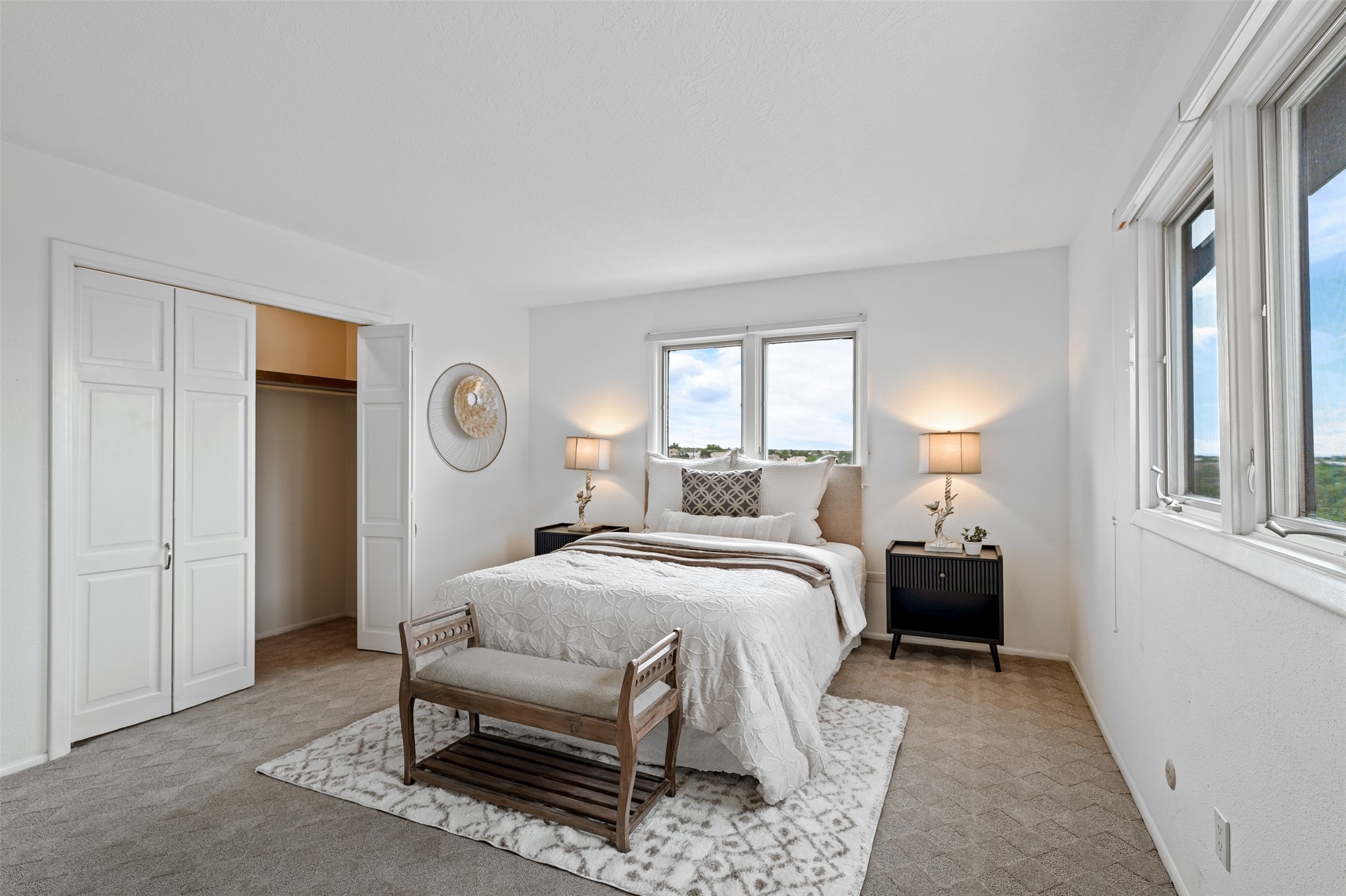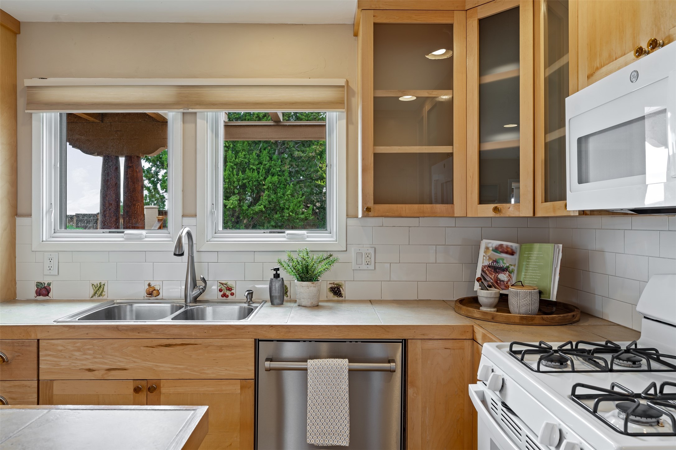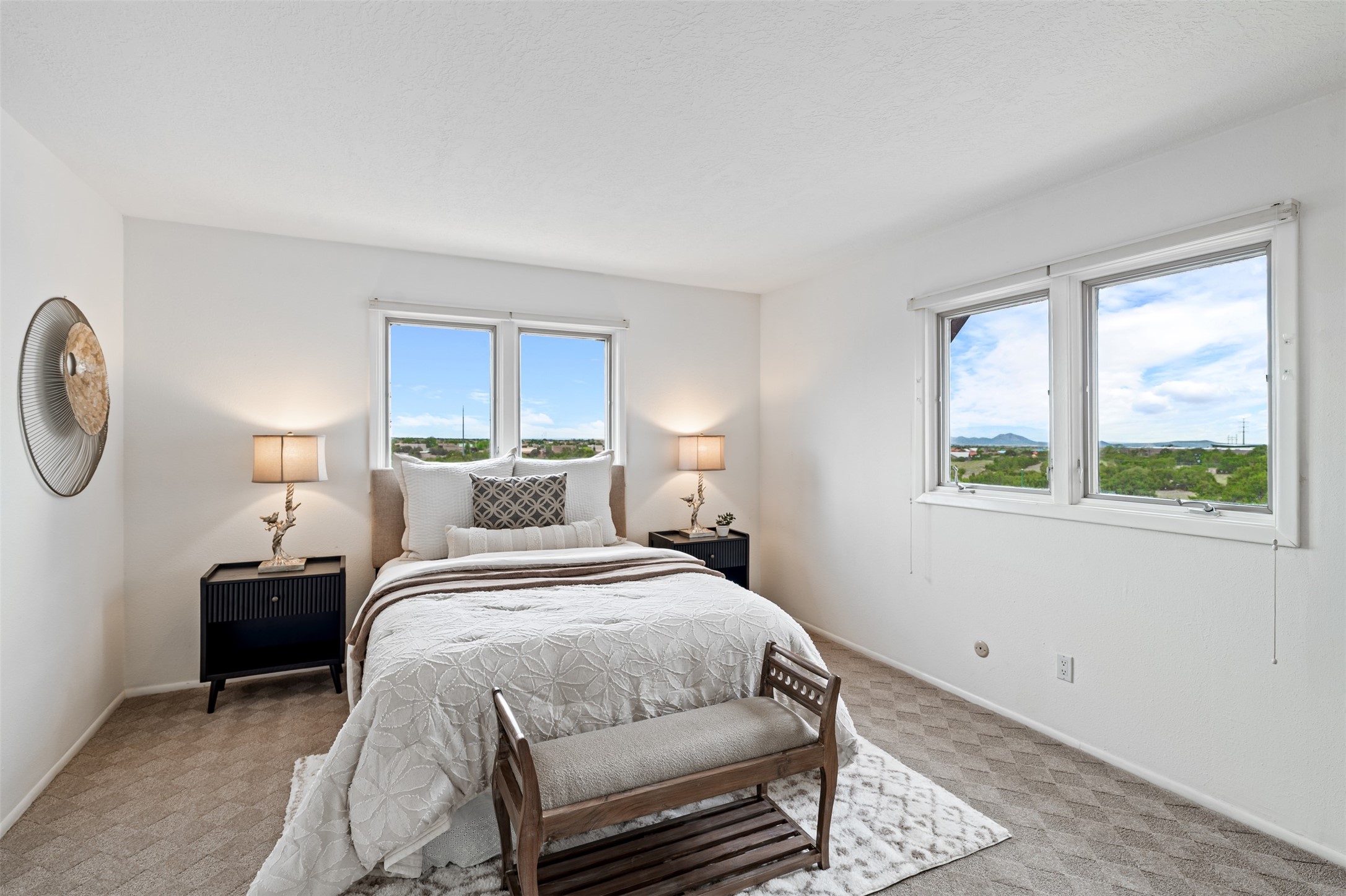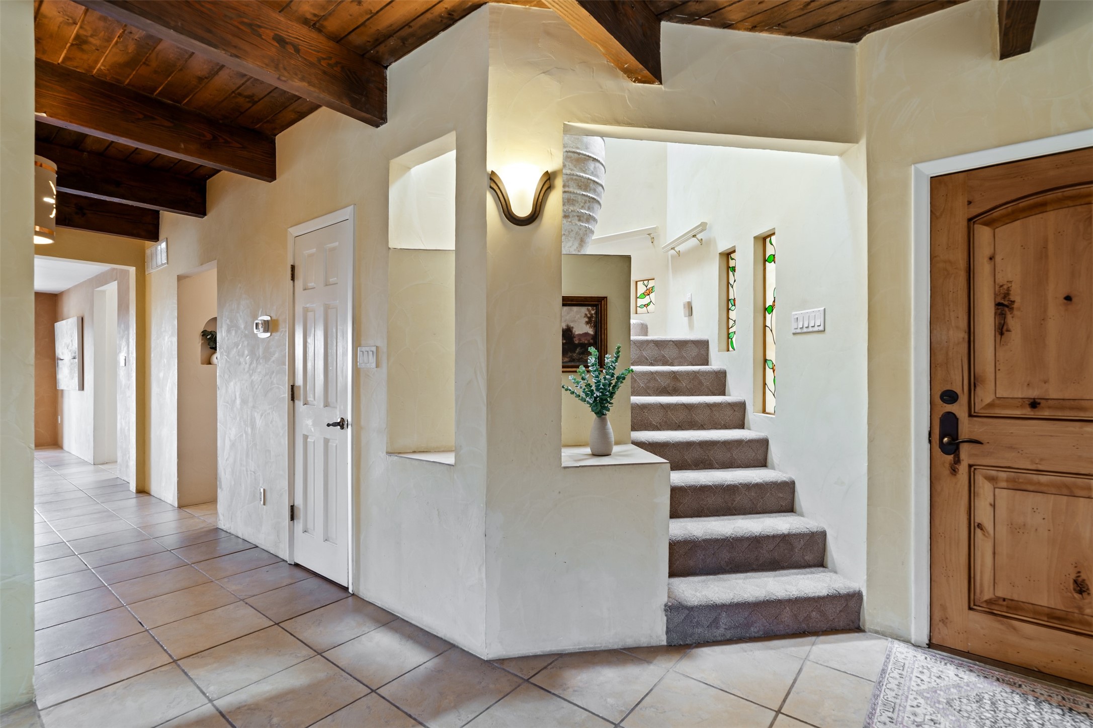 Nestled amid sweeping views and exquisite natural surroundings, this remarkable 4-bedroom, two story, home is a serene and sustainable retreat with a perfect blend of comfort, character, and eco-conscious upgrades. The luxurious, newer (2020) 600 sq ft primary suite on the main floor offers privacy and indulgence, complete with its own mini-split system, a spa-like bathroom, and direct access to outdoor living spaces. Three additional bedrooms are upstairs, where a sunny second-floor deck invites morning coffee or sunset unwinding.Skylights throughout the home bathe the interiors in natural light, highlighting thoughtful details like American clay walls, wood-beamed ceilings, and not one, but two fireplaces--including a charming corner Kiva in the dining room and a striking centerpiece hearth in the living room with a cozy built-in window seat.The bright, eat-in kitchen is a delight with newer appliances, abundant cabinetry, a classic white subway tile backsplash, and views that inspire. Comfort is ensured year-round with two-zone HVAC, refrigerated A/C, mini-splits, and tankless hot water in both upstairs baths.Outside, this home continues to impress with lush xeriscaping, a fenced garden area, and a fully fenced yard. A detached two-car garage includes an extra storage room, while multiple portals and decks provide ideal spots for dining, relaxing, or stargazing. Eco-conscious buyers will appreciate the complete solar electric system and 900-gallon rainwater catchment.This home is a rare find--where views, design, and sustainability come together in perfect harmony.This home is tucked away at the end of a cul-de-sac, with acres of open space and walking trails behind the house. Park Plazas has 8-9 miles of hiking trails, tennis courts, a community garden and is an oasis in the center of Santa Fe close to restaurants, shopping and other amenities, Don't miss this spectacular home in this wonderful neighborhood.