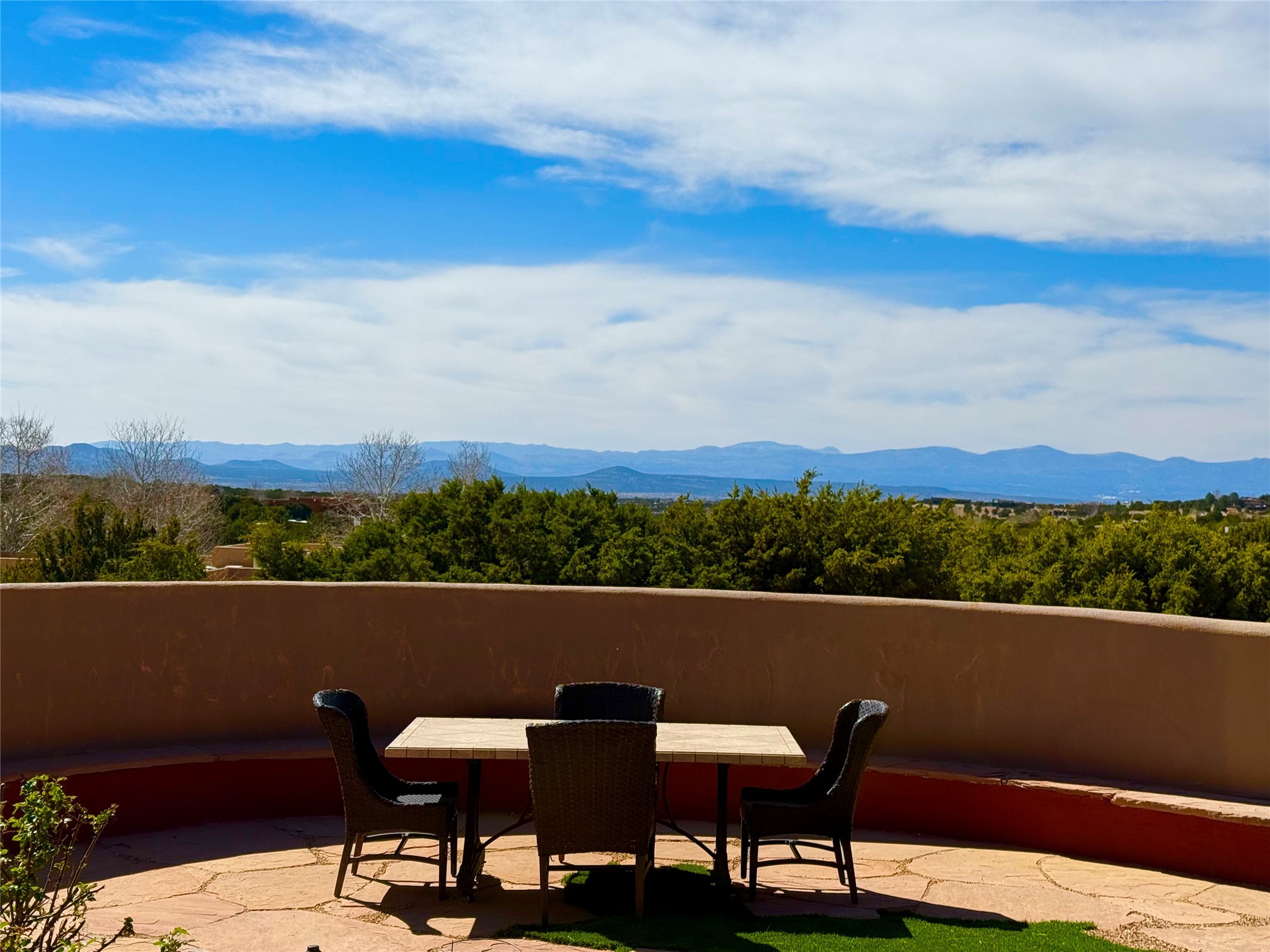Along a private, quiet road in desirable NW Santa Fe, only minutes from downtown, don't miss the huge entertaining spaces with drop dead gorgeous 180 degree sunset views! Home features a well equipped, open kitchen with plenty of space. Gorgeous custom travertine tilework, an awesome built-in sound system, and extensive landscaping. Design offers privacy in the bedroom areas and togetherness in the large open family spaces. Spacious Master Suite with kiva fireplace, large walk-in closet, private portal,and a fabulous spa bath. Tall french doors across the back of the home bring the outdoors in. Backyard features a walled rear courtyard, built-in outdoor seating, and incredible landscaping. Built in 2006 and sited on 2.5 acres adjoining the extensive trail system of NW Santa Fe, this home is the perfect place to get away and enjoy world famous Santa Fe sunsets!