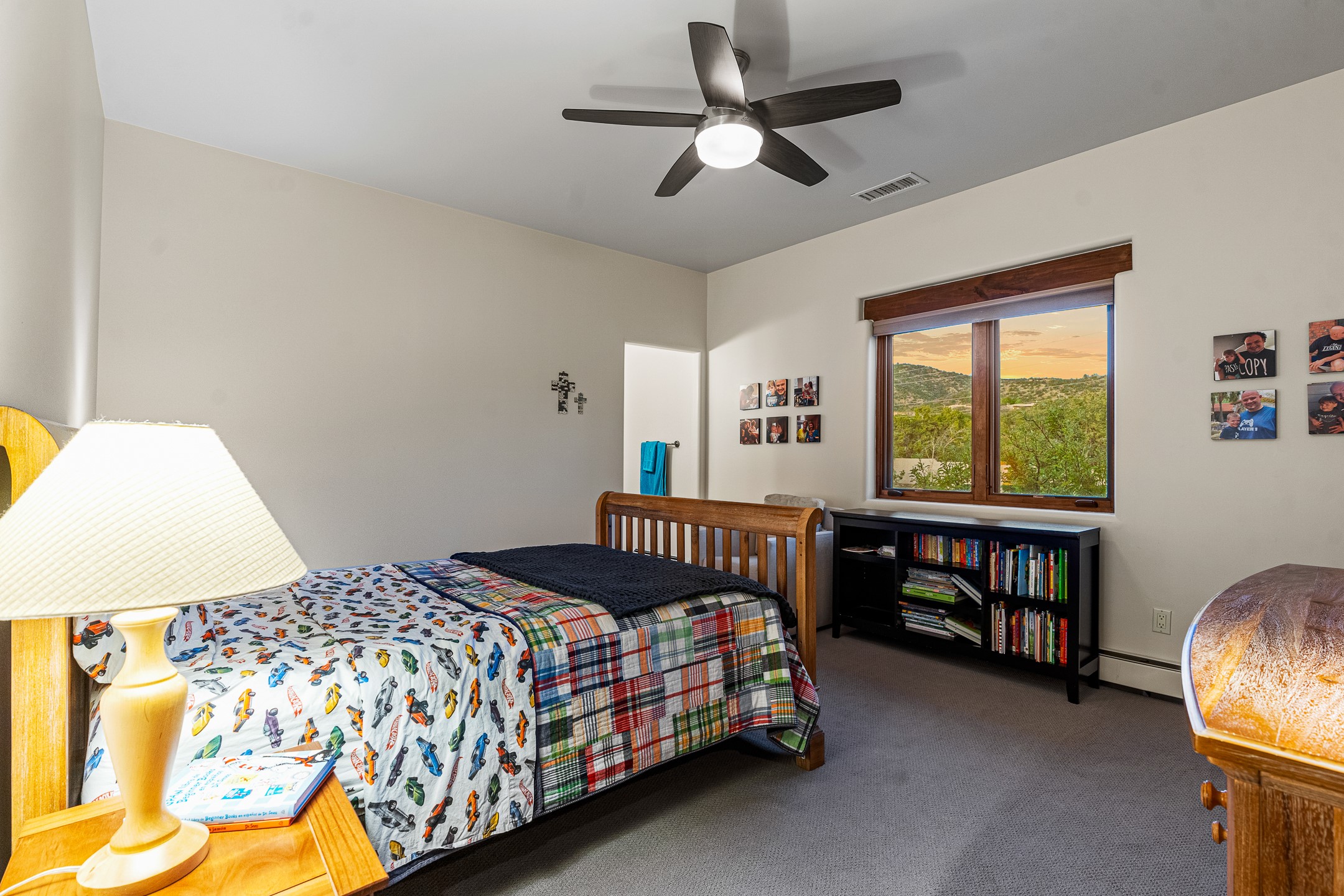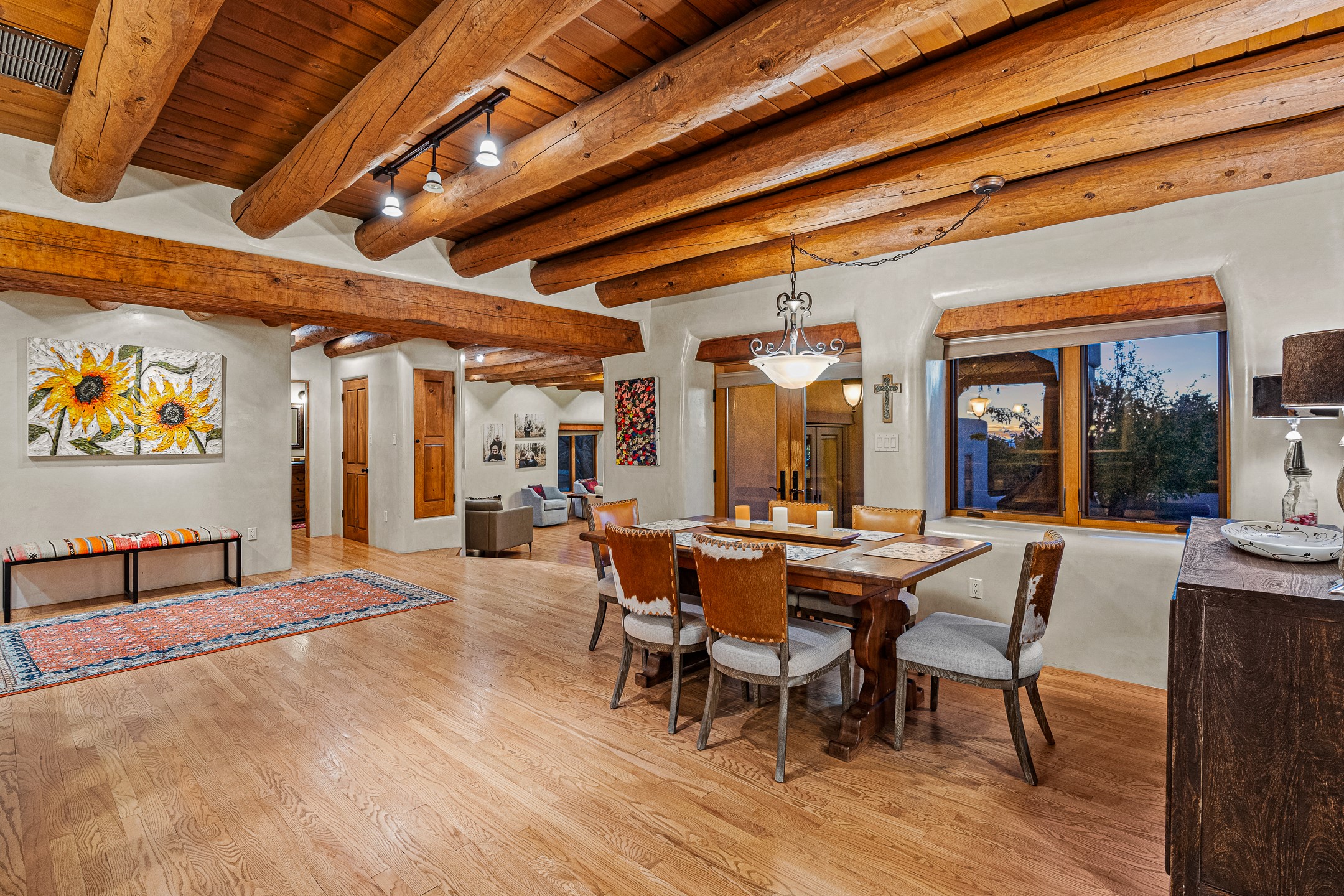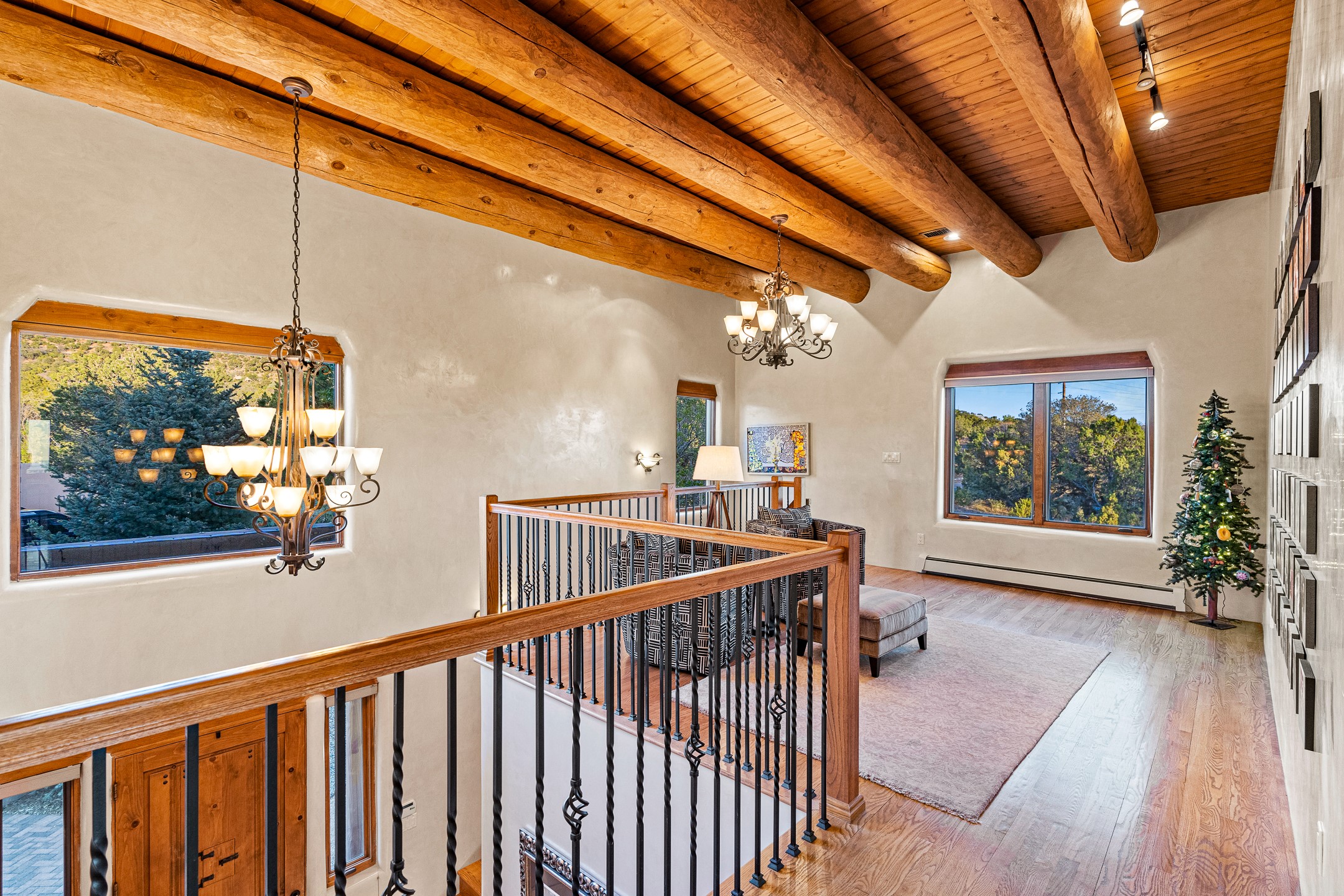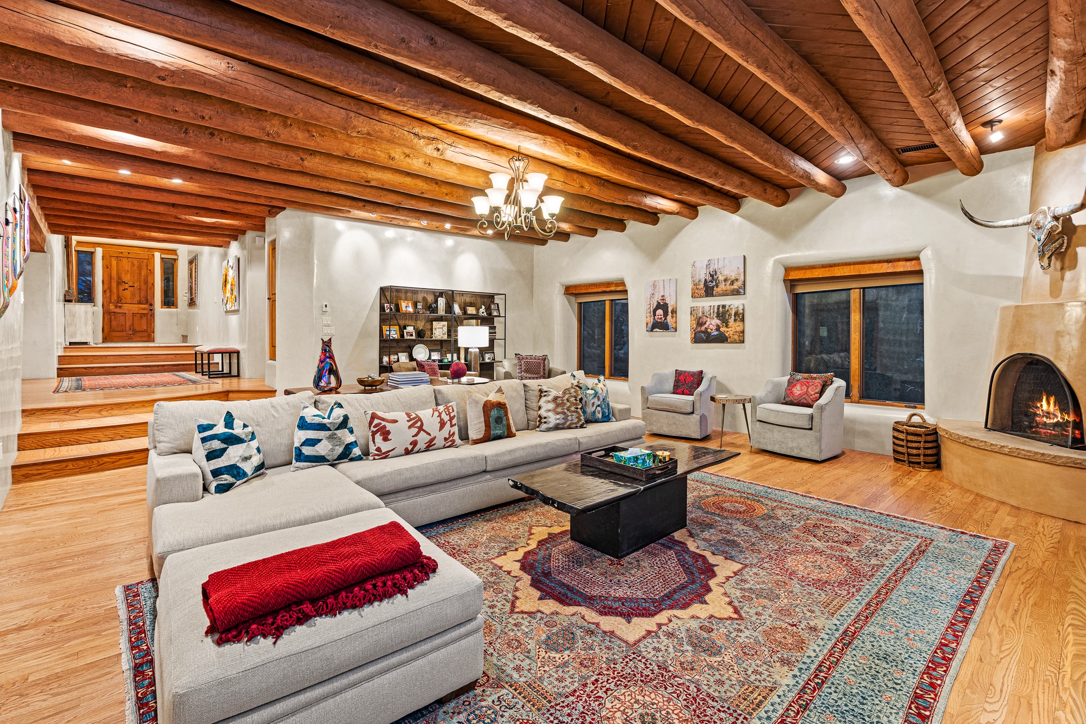 A private and gated sanctuary sitting on 2.77 acres just off of the historic Old Santa Fe Trail. The luxurious four bedroom, three and a half bath main home provides space and functionality for modern living. Elegant living downstairs includes refined diamond plaster finishes, viga beams, two fireplaces, and travertine tile. A chef inspired kitchen includes abundant granite countertops with Subzero and Thermador appliances. The kitchen flows into a lovely dining area with views to the West of the tranquil backyard space and portal ideal for outdoor living and entertaining. A cozy family room off the kitchen and dining area currently serves as a playroom, offering flexible use of space. A first-floor guest bedroom with full bath adds convenience and versatility. Upstairs, a gracious primary suite serves as a true retreat, complete with a fireplace, spa-style bath with large walk-in shower, and a clawfoot tub perfectly placed before a view window. Step out onto the private balcony to take in panoramic Western sunset and mountain views. Two additional upstairs bedrooms provide comfortable accommodations for family or guests. Additional features include a spacious laundry room, oversized three car garage, and additional ample storage space. A charming one bedroom, three quarter bath casita sits separately on the North side of the property boasting a full kitchen, dining area, and living room with fireplace providing a cozy hideaway for your family or guests. This property is the perfect blend of privacy, sophistication, and authentic New Mexico living just minutes from downtown Santa Fe.