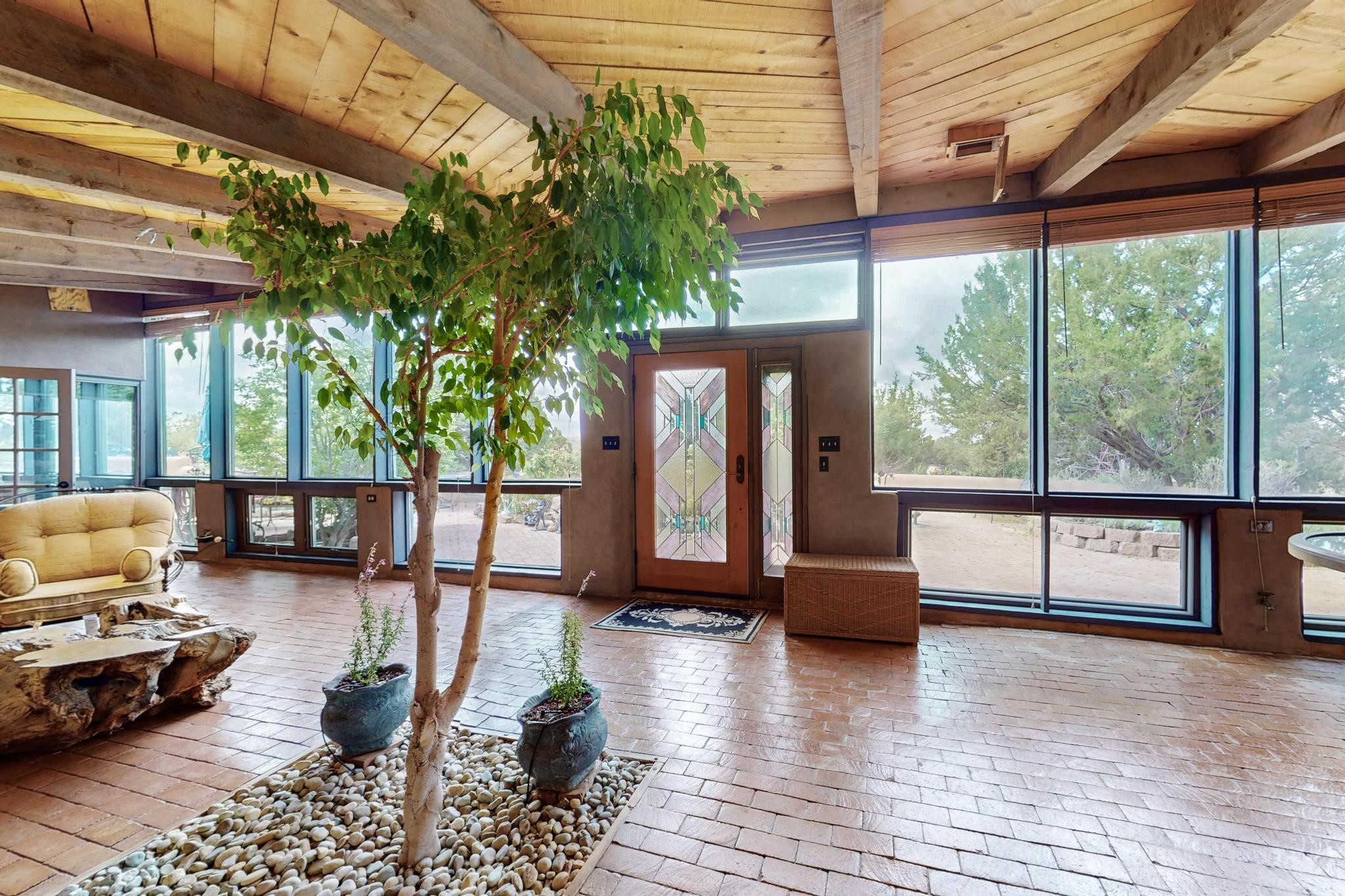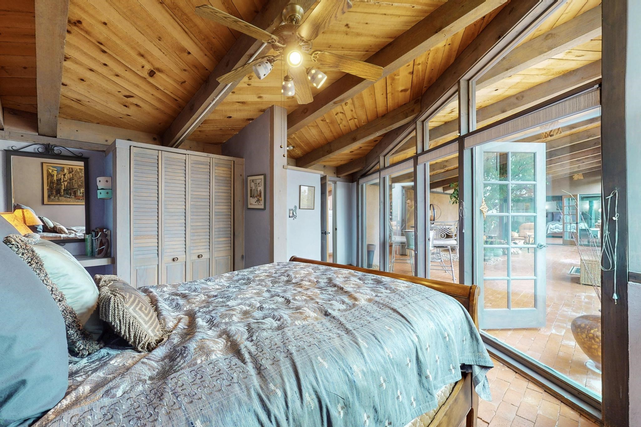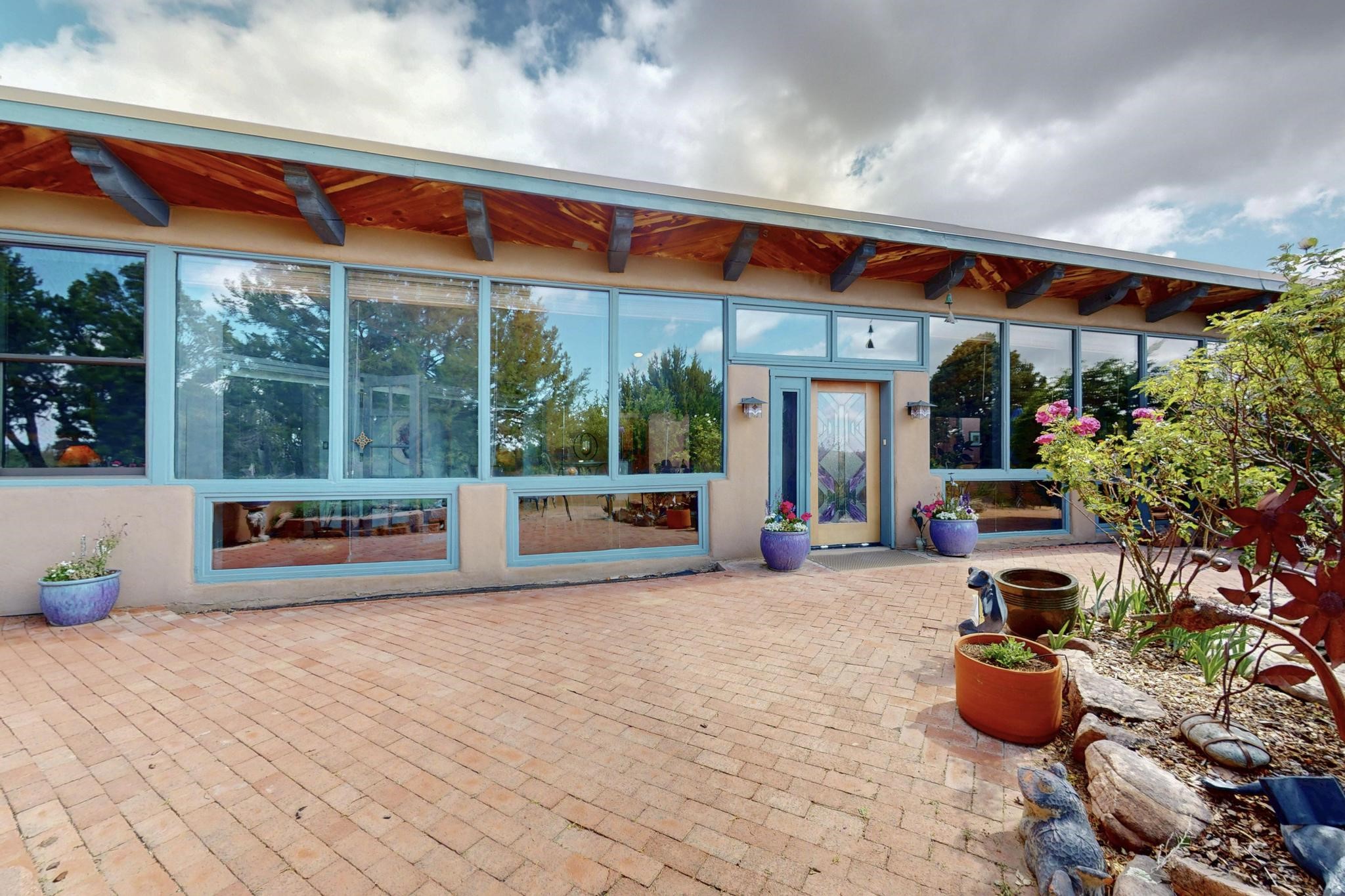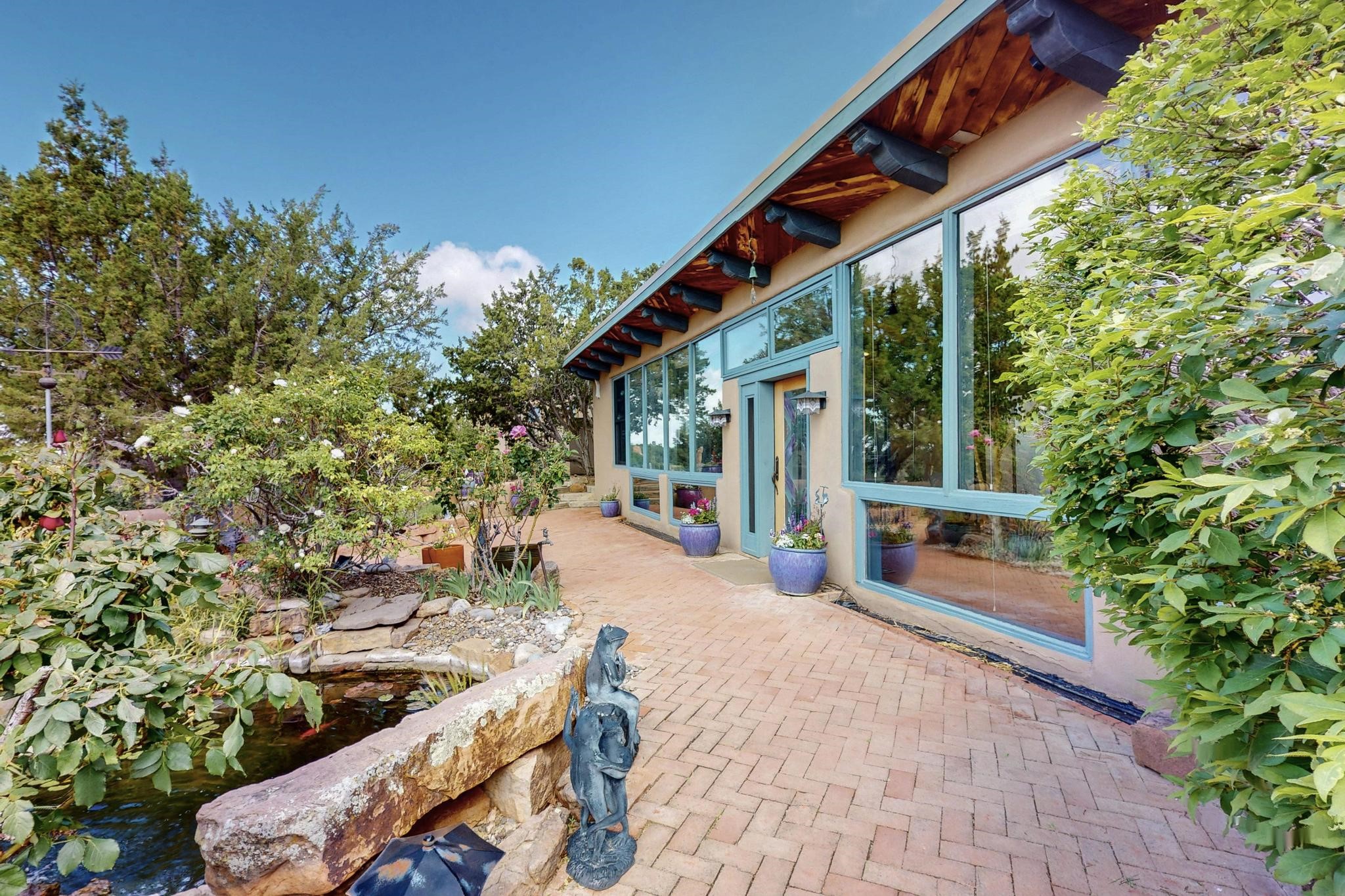 First time on the market! One-of-a-kind pitched roof propanel passive solar beauty with Old World Charm. Like a Swiss Chalet with a dash of Mid-Century Modern. A rarity in Eldorado! Set back off the road on a circular drive, with nary a house in sight, is this gorgeously maintained and landscaped 1.50 acre lot replete with a bubbling Koi and goldfish pond. A multitude of exterior dining and entertaining areas. Meander through the totally dripped irrigated garden which leads the way into a sun drenched, and massive, brick floor Atrium. In fact, the whole house has brick floors and Post and Beam high ceilings with French doors galore! Oversized Living/Dining room with floor to ceiling windows and remote controlled blinds. The wood stove has a catalytic converter which keeps the room toasty through those long winter nights with an 75% to 81% efficiency rating. Split bedroom floor plan. A fabulous Master with a Vermont casting wood stove, en-suite bath with an on-demand gas water heater and a remote controlled awning to keep the bright morning light at bay. Ginormous cedar closet in dressing room/walk-in closet which is the size of a NYC studio apartment! Both the Living Room and Bedrooms have mini-splits and ceiling fans. European-style kitchen has a warming drawer, open shelving and tons of cupboards. A wonderful long pantry with a utility area and space for all your pots, pans, spices and sundries. Outside the kitchen door is a dedicated gas connection for the BBQ. A long and wide two car detached tandem garage has tons of storage and a climate controlled wine room suitable for hundreds of bottles. One of a kind unique beauty.There's nothing like it!