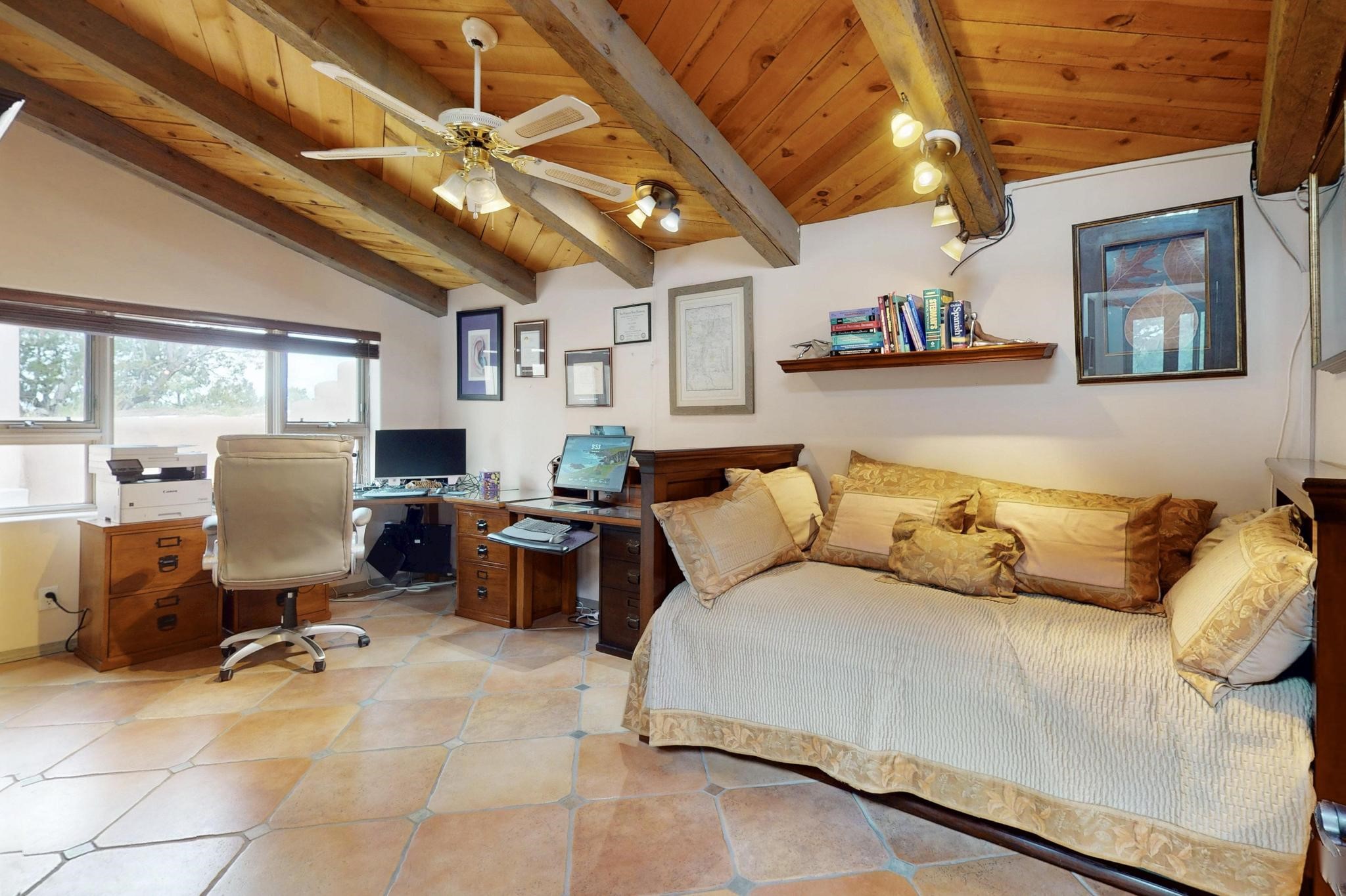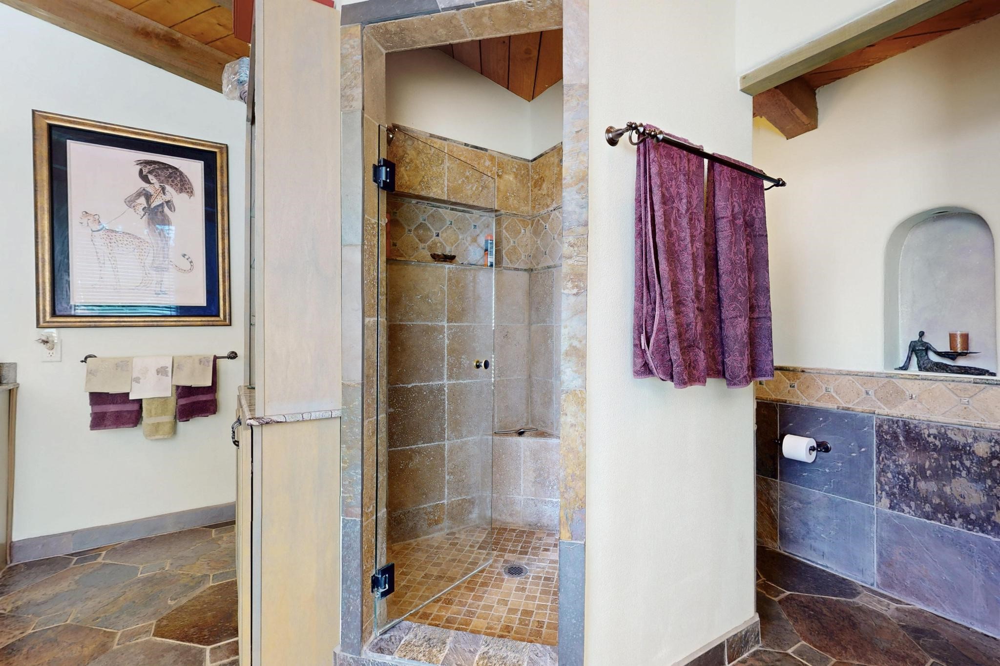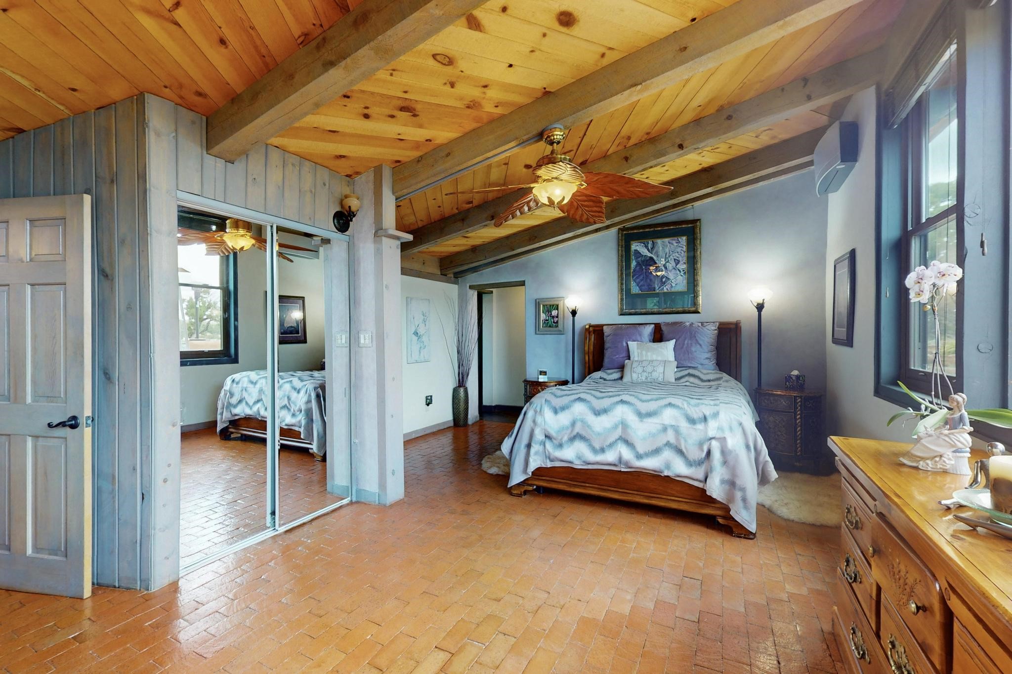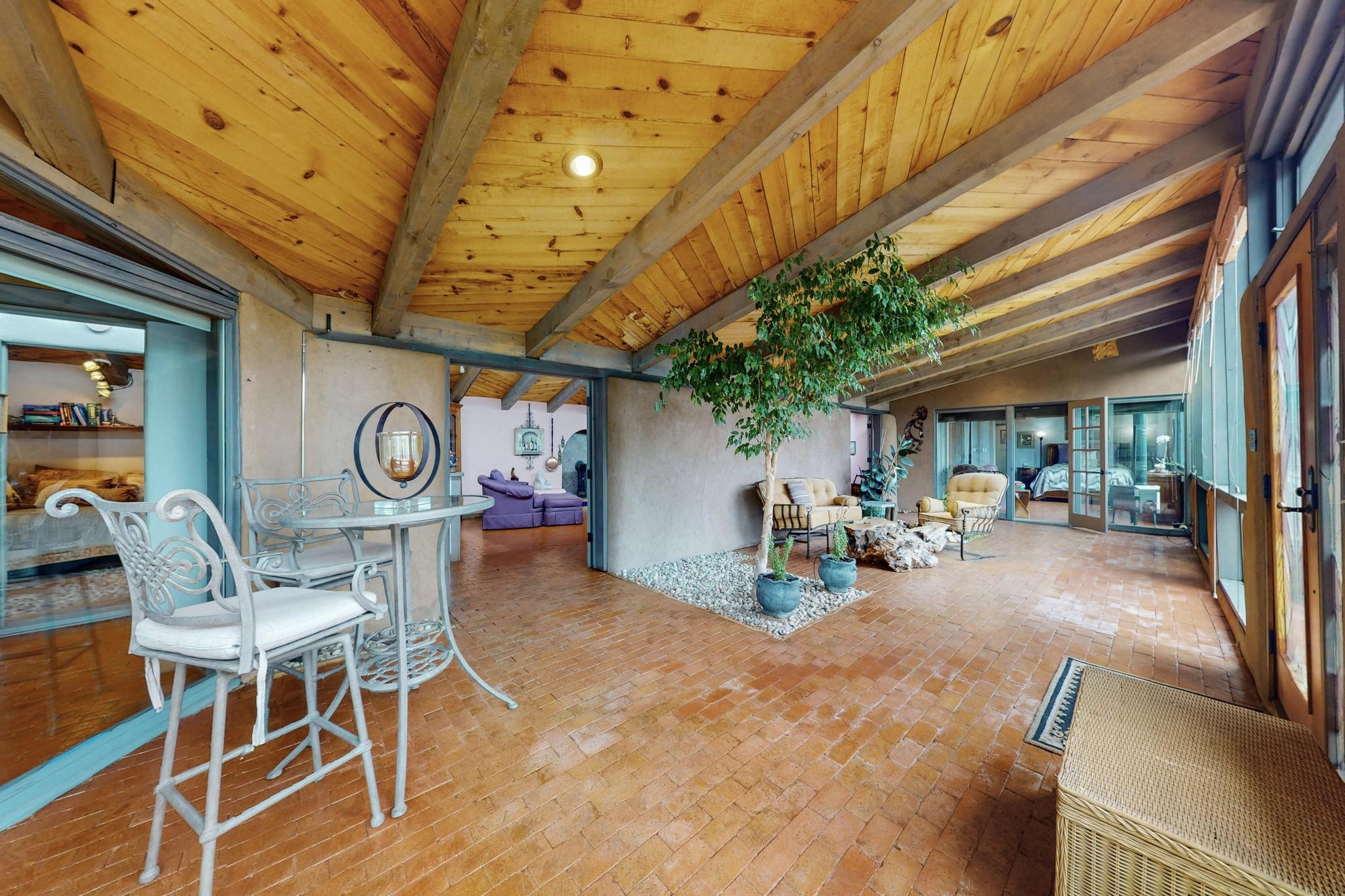 First time on the market! One-of-a-kind pitched roof propanel passive solar beauty with Old World Charm. Like a Swiss Chalet with a dash of Mid-Century Modern. A rarity in Eldorado! Set back off the road on a circular drive, with nary a house in sight, is this gorgeously maintained and landscaped 1.50 acre lot replete with a bubbling Koi and goldfish pond. A multitude of exterior dining and entertaining areas. Meander through the totally dripped irrigated garden which leads the way into a sun drenched, and massive, brick floor Atrium. In fact, the whole house has brick floors and Post and Beam high ceilings with French doors galore! Oversized Living/Dining room with floor to ceiling windows and remote controlled blinds. The wood stove has a catalytic converter which keeps the room toasty through those long winter nights with an 75% to 81% efficiency rating. Split bedroom floor plan. A fabulous Master with a Vermont casting wood stove, en-suite bath with an on-demand gas water heater and a remote controlled awning to keep the bright morning light at bay. Ginormous cedar closet in dressing room/walk-in closet which is the size of a NYC studio apartment! Both the Living Room and Bedrooms have mini-splits and ceiling fans. European-style kitchen has a warming drawer, open shelving and tons of cupboards. A wonderful long pantry with a utility area and space for all your pots, pans, spices and sundries. Outside the kitchen door is a dedicated gas connection for the BBQ. A long and wide two car detached tandem garage has tons of storage and a climate controlled wine room suitable for hundreds of bottles. One of a kind unique beauty.There's nothing like it!