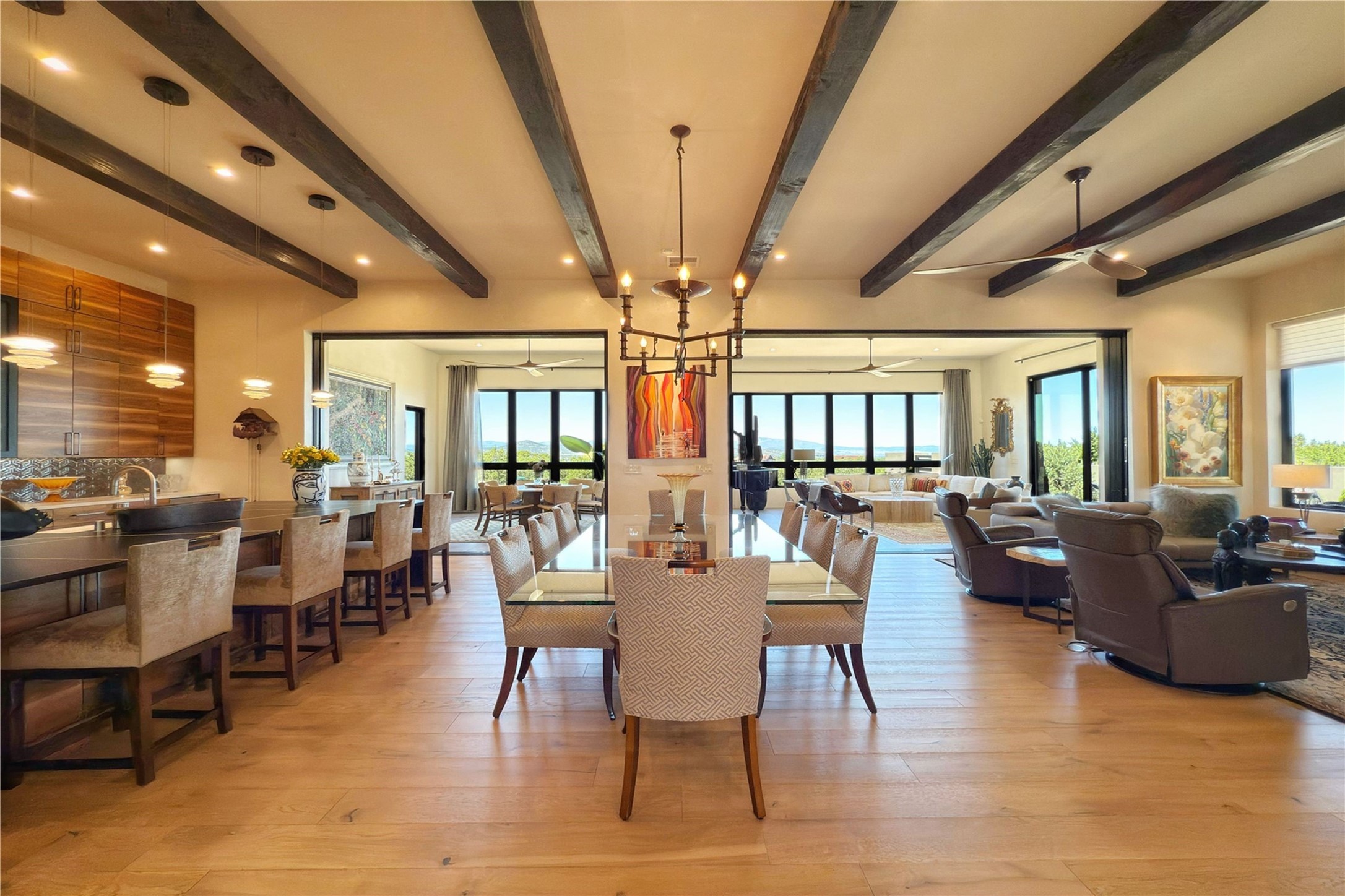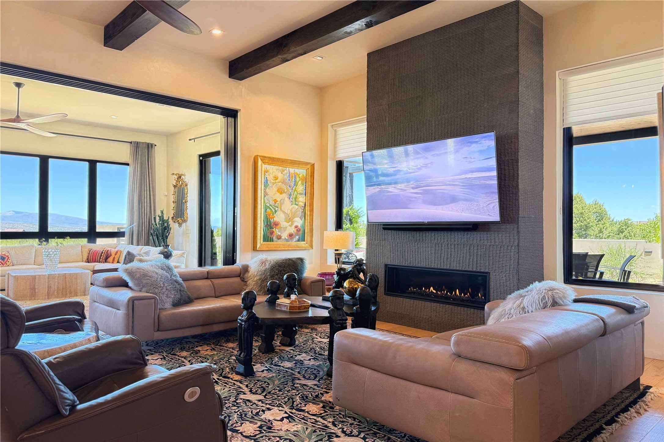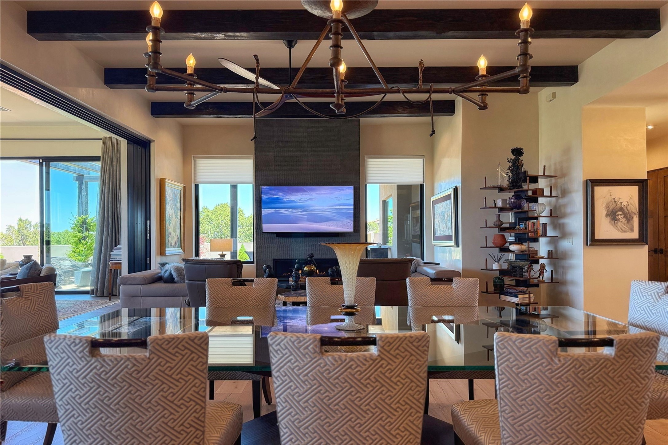 Contemporary Elegance with Designer TouchesA stunning contemporary residence thoughtfully curated celebrates Jemez mountain views and Santa Fe sunsets. This architectural gem offers high-end finishes, designer details, and expansive indoor-outdoor living in desirable Las Campanas.This home welcomes you with a zen-like garden and water feature. Step through the large pivoting wooden door and be greeted by a great room concept with soaring ceilings and abundant natural light. A contemporary glass chandelier adds dramatic flair and elegance.Living room features a floor to ceiling tiled fireplace, and flows seamlessly into the dining, kitchen and giant sunroom- converted from an outdoor portal to create year round living space. The gourmet kitchen is a designer's and chef's dream, featuring a massive island, black quartz counters, top-tier appliances, steam oven and large wine fridge. The butlers pantry makes entertainment a breeze and the walnut cabinetry is exquisite.Relax in a serene primary suite occupying in its own wing with southwest sunlight and a private portal. The primary bath is truly opulent,with quartz countertops, a steam shower with decorative tile and stone, and a deep soaking tub with views. Enjoy his-and-hers closets, and direct access to the laundry room.A guest wing includes an office and two guest suites with California closets, and gorgeous tiled baths.The powder room is a showstopper, with a vintage Venetian glass chandelier.Outdoor living is elevated with two large portals, expertly designed to maximize views, complete with a stone Montana fire pit. Outdoor metal sculptures convey with the property, adding artistic appeal to the serene surroundings.Solar panels and two EV charging plugs in the garage complete the functional ease of living here. This exceptional property also includes first right of refusal on the adjacent lot. Sellers' Las Campanas golf equity membership is available for purchase as well.