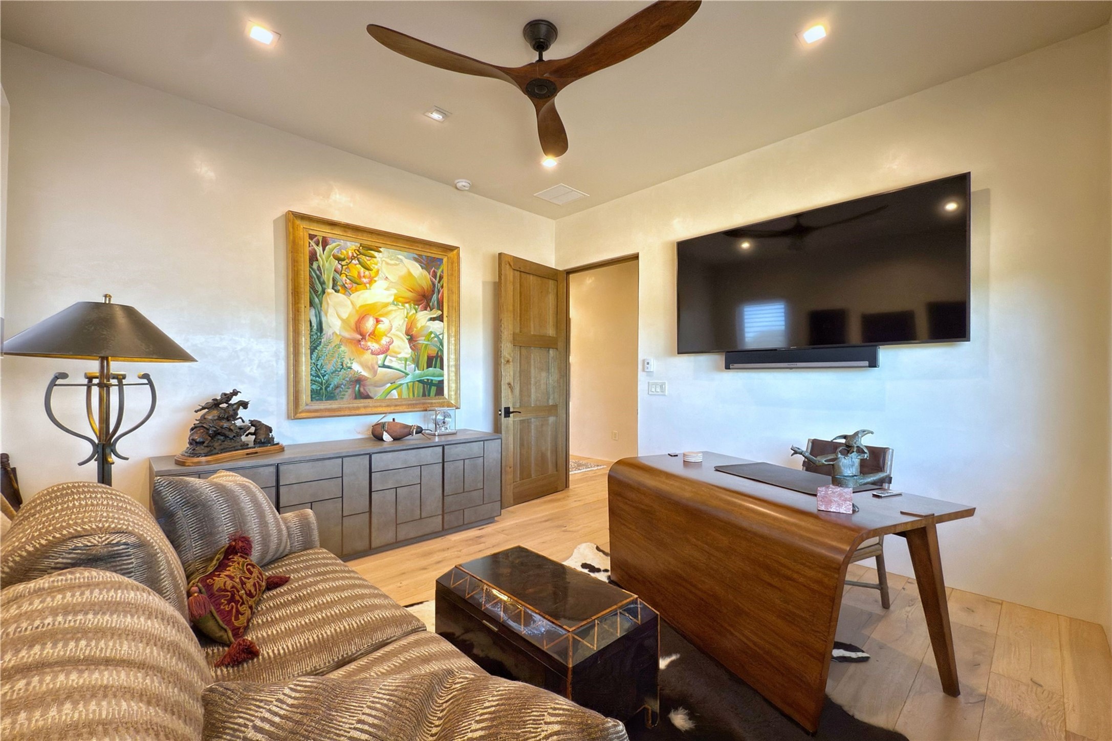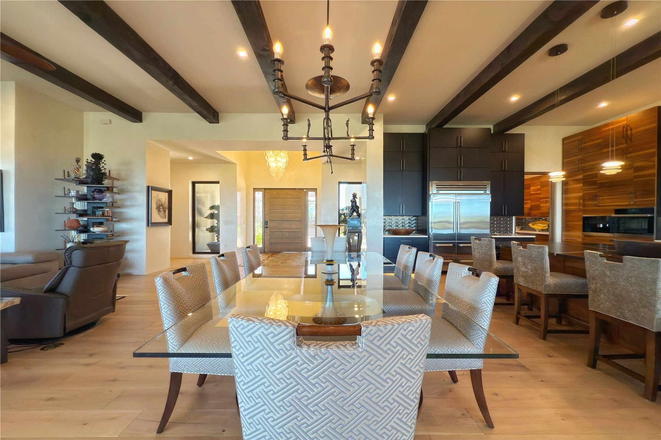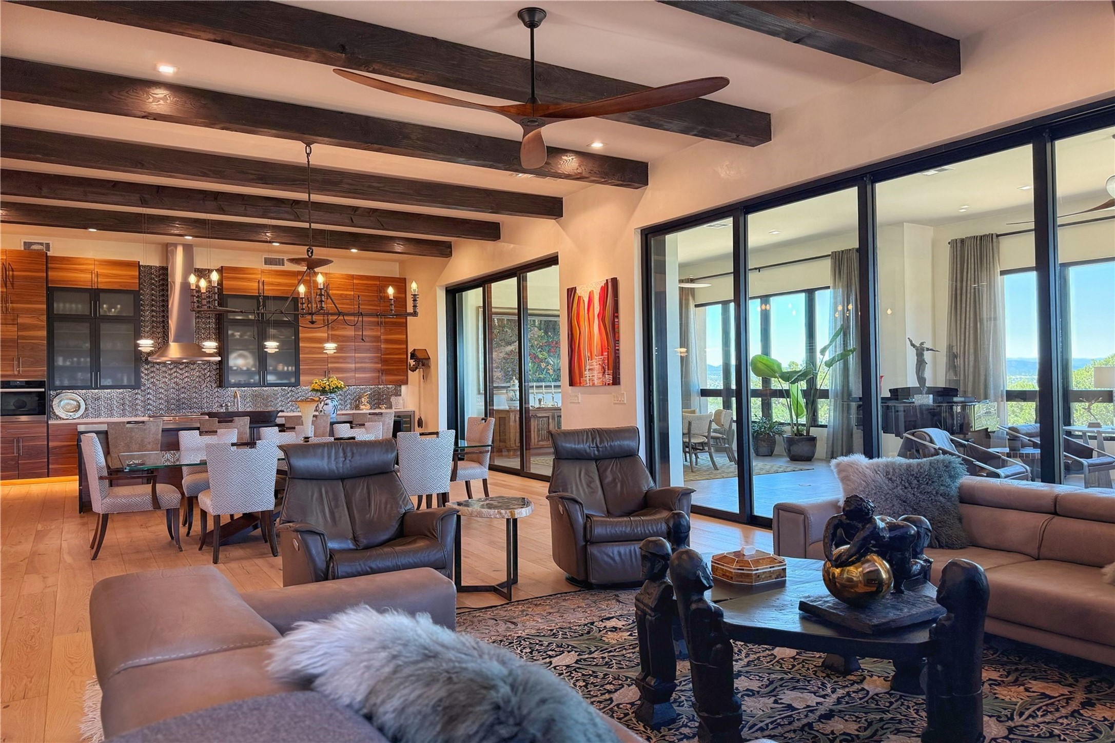Contemporary Elegance with Designer TouchesA stunning contemporary residence thoughtfully curated celebrates Jemez mountain views and Santa Fe sunsets. This architectural gem offers high-end finishes, designer details, and expansive indoor-outdoor living in desirable Las Campanas.This home welcomes you with a zen-like garden and water feature. Step through the large pivoting wooden door and be greeted by a great room concept with soaring ceilings and abundant natural light. A contemporary glass chandelier adds dramatic flair and elegance.Living room features a floor to ceiling tiled fireplace, and flows seamlessly into the dining, kitchen and giant sunroom- converted from an outdoor portal to create year round living space. The gourmet kitchen is a designer's and chef's dream, featuring a massive island, black quartz counters, top-tier appliances, steam oven and large wine fridge. The butlers pantry makes entertainment a breeze and the walnut cabinetry is exquisite.Relax in a serene primary suite occupying in its own wing with southwest sunlight and a private portal. The primary bath is truly opulent,with quartz countertops, a steam shower with decorative tile and stone, and a deep soaking tub with views. Enjoy his-and-hers closets, and direct access to the laundry room.A guest wing includes an office and two guest suites with California closets, and gorgeous tiled baths.The powder room is a showstopper, with a vintage Venetian glass chandelier.Outdoor living is elevated with two large portals, expertly designed to maximize views, complete with a stone Montana fire pit. Outdoor metal sculptures convey with the property, adding artistic appeal to the serene surroundings.Solar panels and two EV charging plugs in the garage complete the functional ease of living here. This exceptional property also includes first right of refusal on the adjacent lot. Sellers' Las Campanas golf equity membership is available for purchase as well.