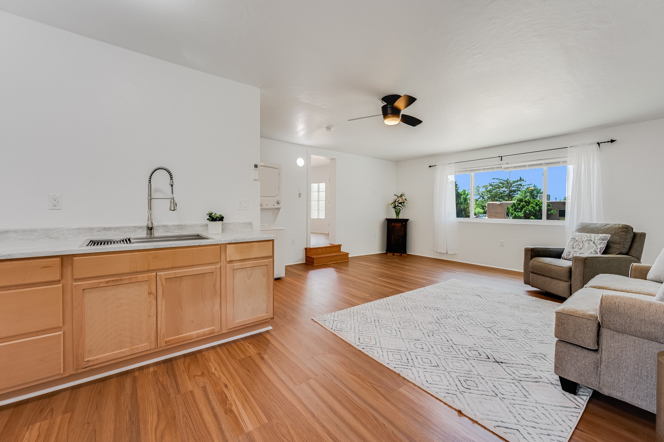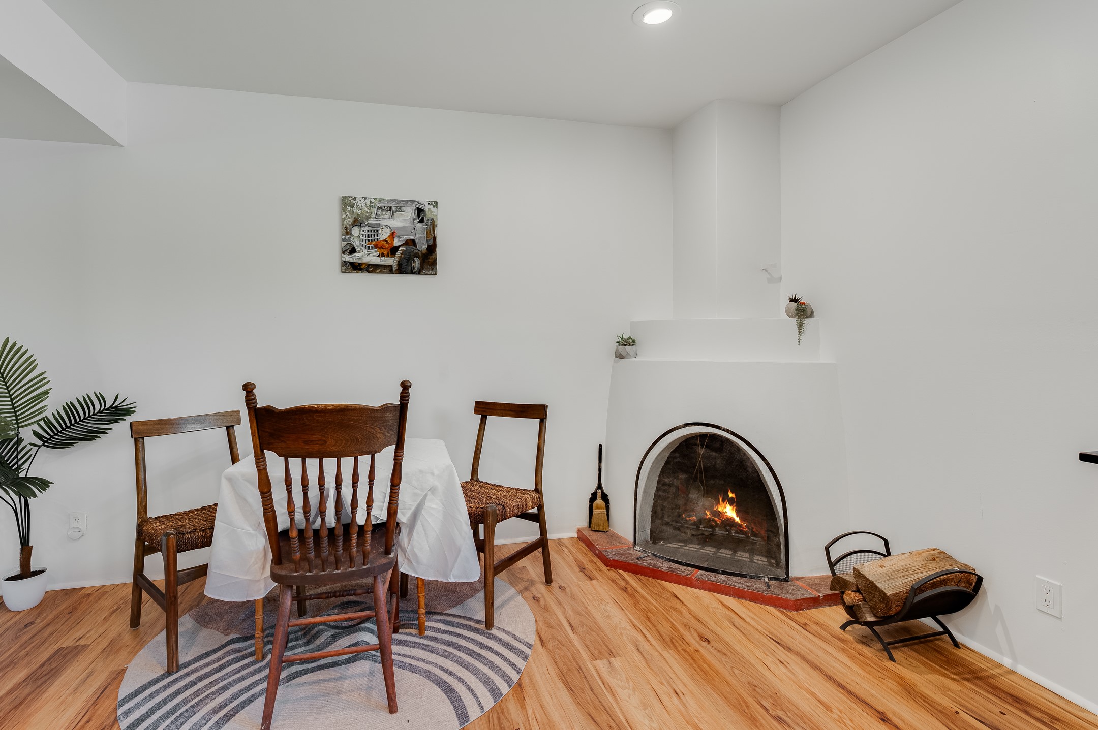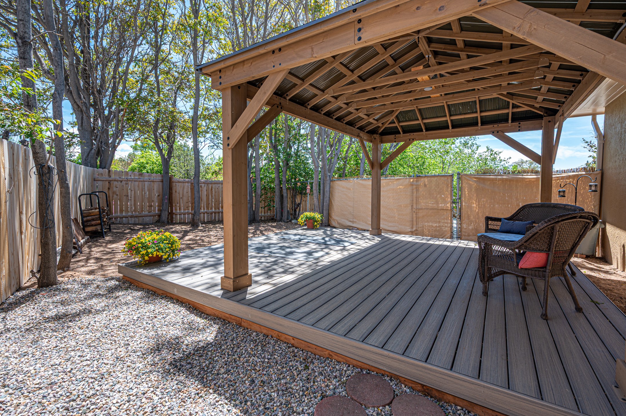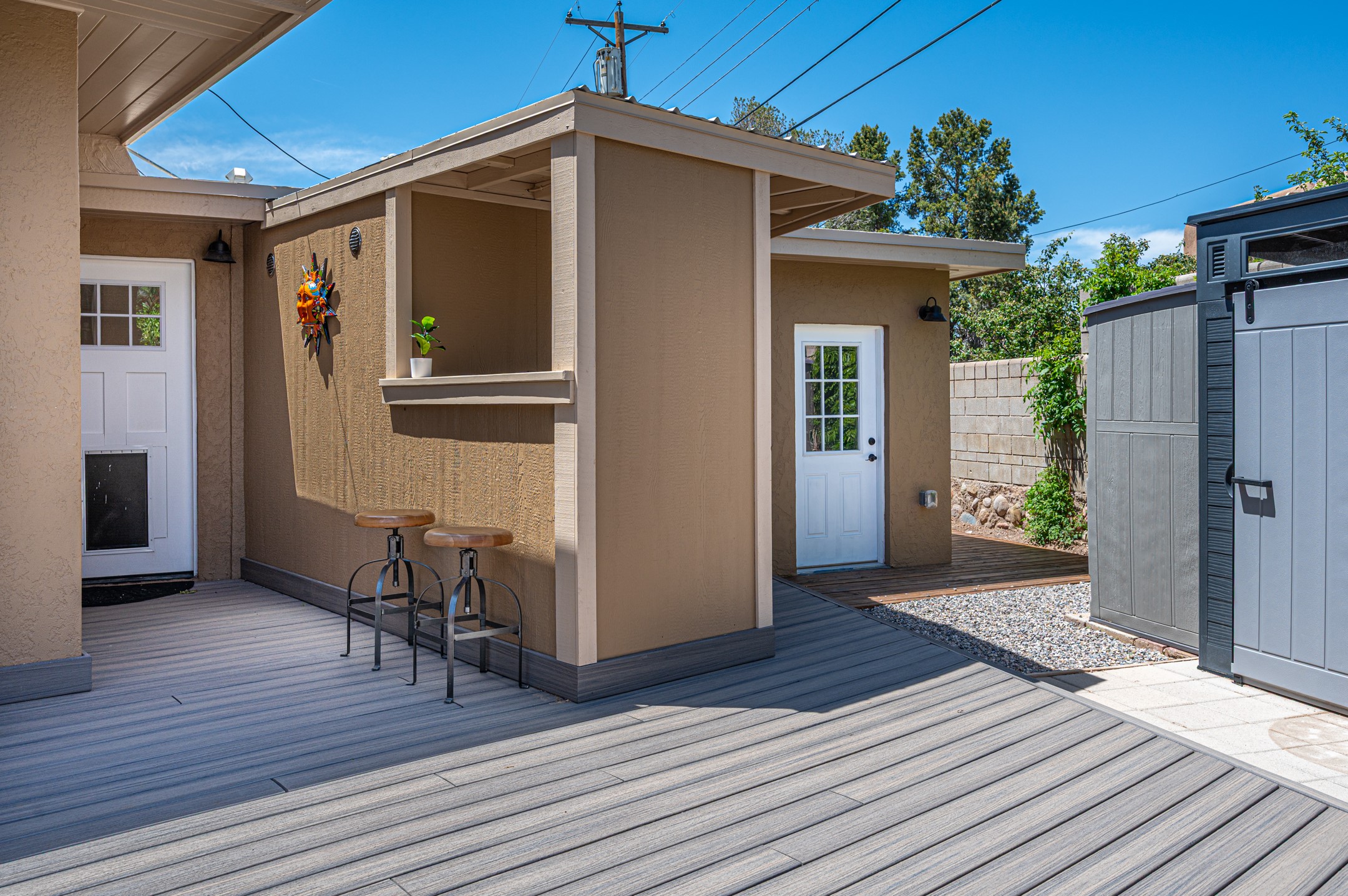 **OWNER FINANCING AVAILABLE** This single-level home in the desirable Casa Solana neighborhood blends comfort and thoughtful design across approximately 2,000 square feet. With three bedrooms and three bathrooms, including a spacious primary bedroom with an en suite, and an attached studio, this property is well-suited for generational living and/or rental income. Inside, you'll find warm wood floors and recessed lighting. The total kitchen renovation features new electrical and plumbing, quartz countertops and sleek stainless steel appliances, and a breakfast nook with wood burning fireplace to make both everyday meals and entertaining a joy. Step outside to over 1,000 square feet of deck space equipped with a bar and sauna, gazebo shaded by mature trees, and a fully fenced yard for privacy and comfort. Relax in the side gazebo or utilize it as a peaceful yoga or meditation platform. This home includes a new roof coating and solar panels, rebuilt soffits and triple glazed windows, blending energy efficiency with durability. The property sits on a corner lot, is located just minutes from downtown Santa Fe, and has easy access to popular shopping, dining, and cultural attractions. Move-in ready and with over $300k in upgrades, this home offers both tranquility, reliability, and connection to everything Santa Fe has to offer.