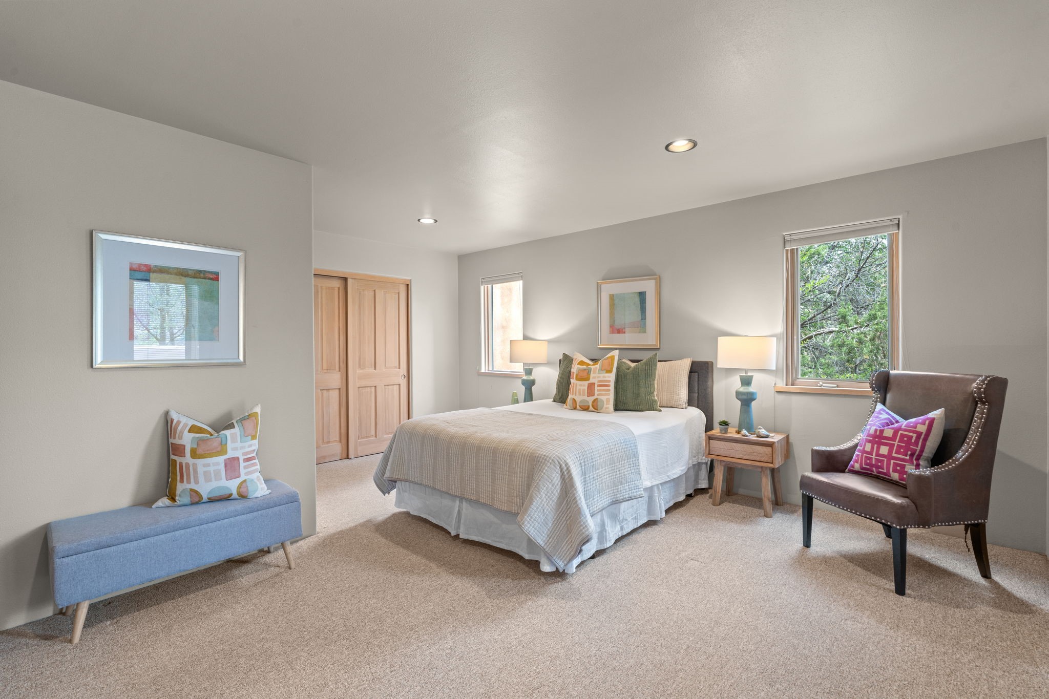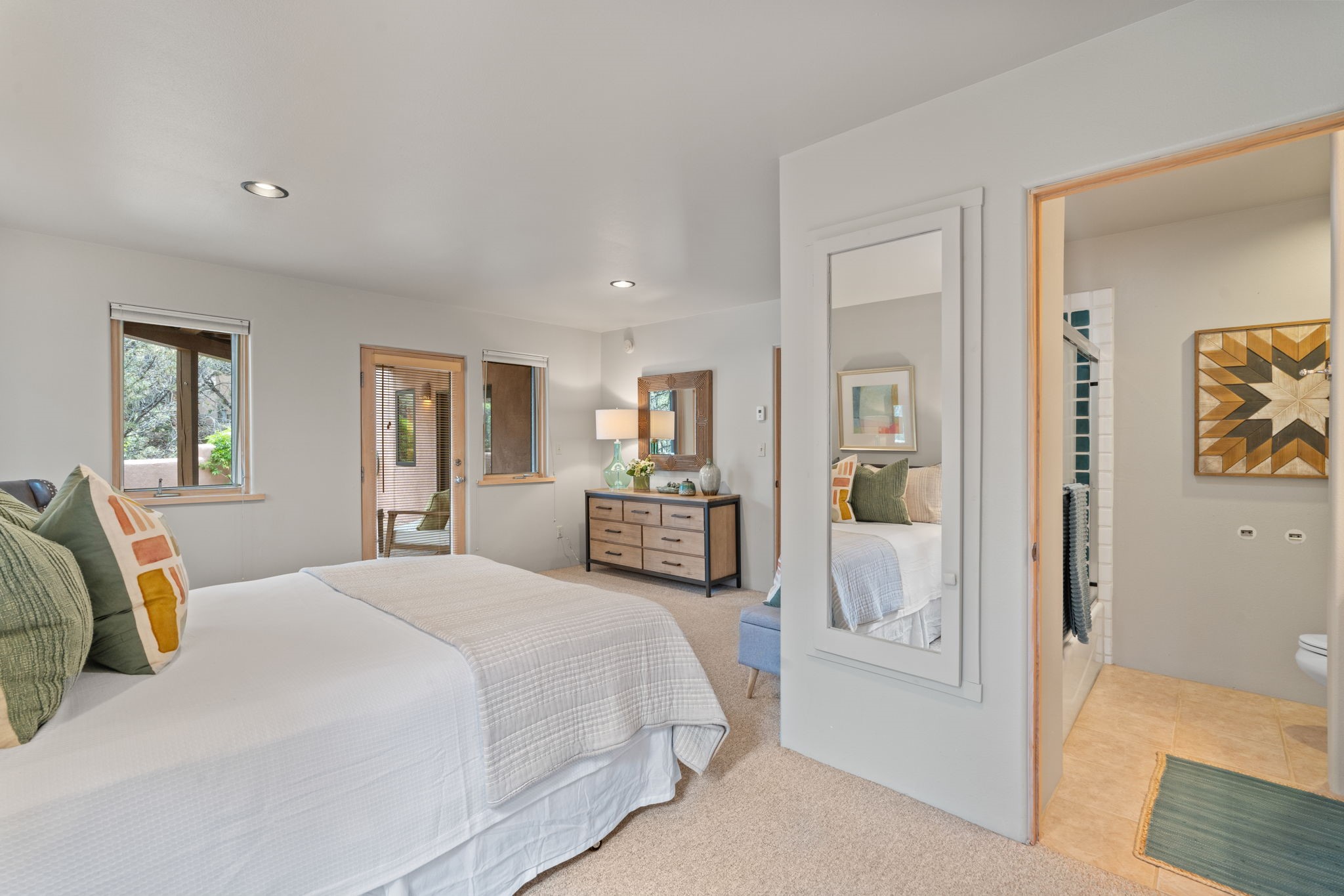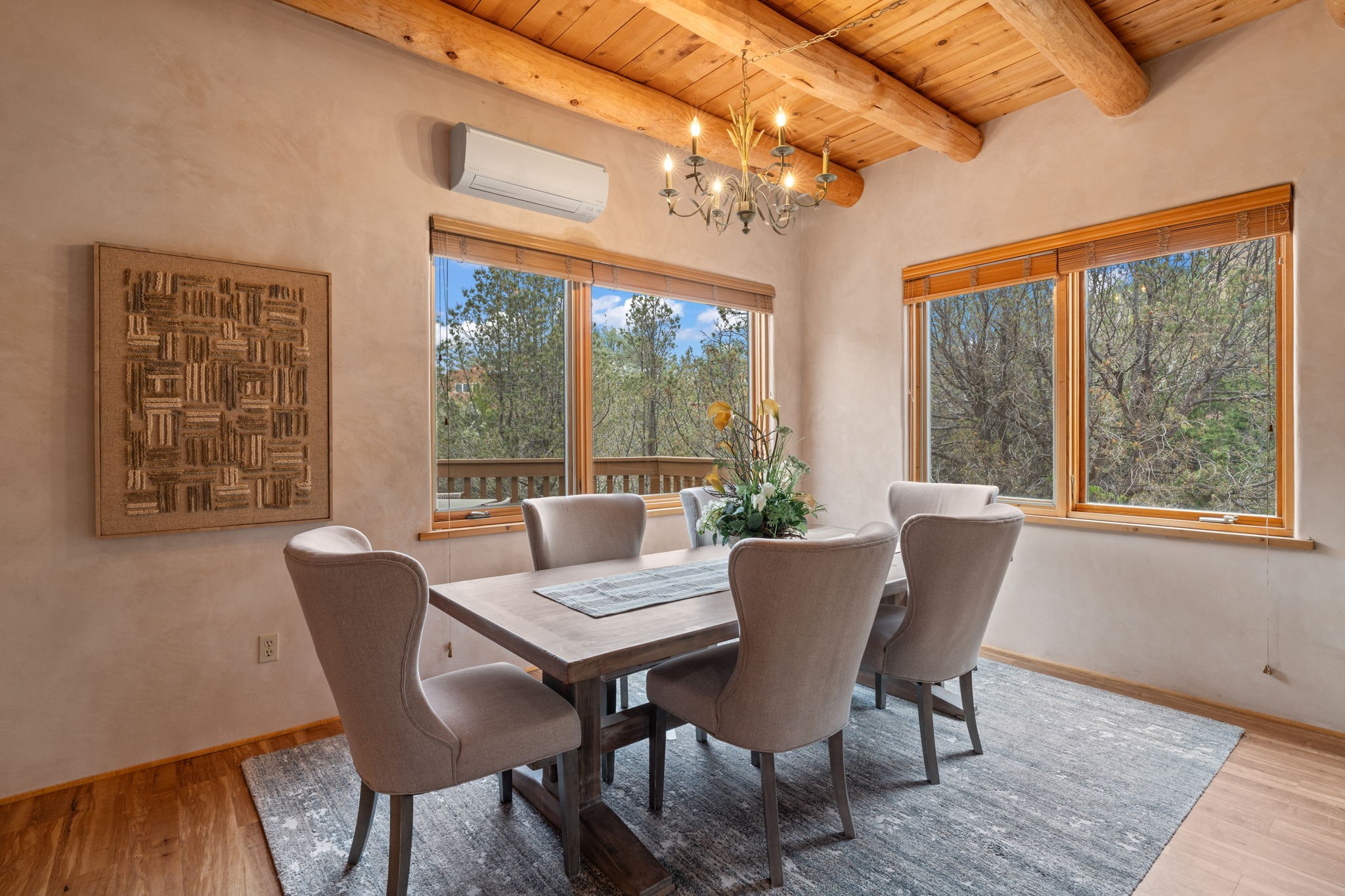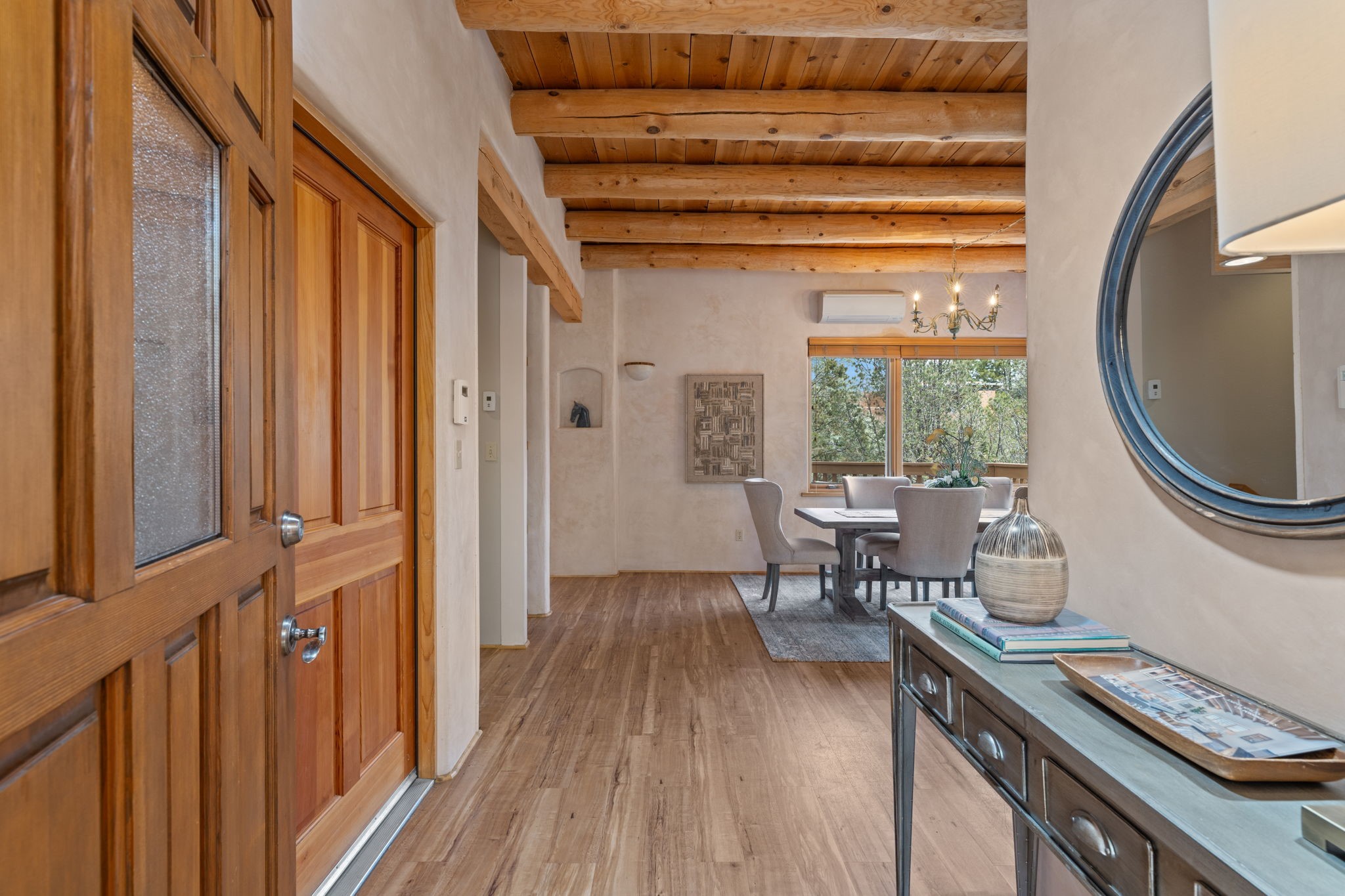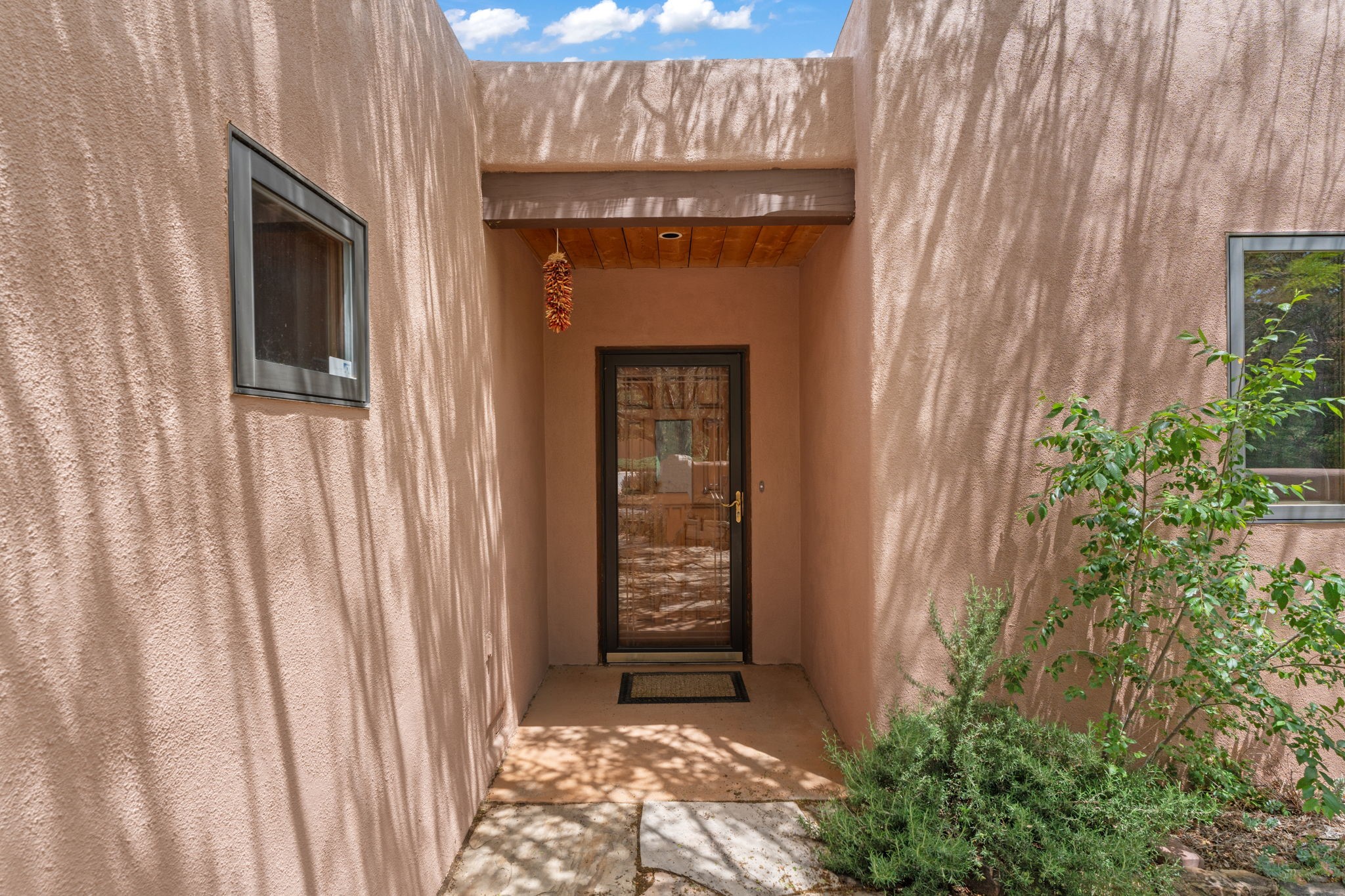 Sophisticated In-Town Living in highly sought-after Estancias Primera on charming La Viveza Court. Leave your home and walk to the Plaza via the lush arroyo. This two-story home has three outside living with an open living/dining/kitchen floor plan with wood-burning Kiva fireplace, plaster walls, wood floors and vigas, a main level powder room and tree-scaped patio. The two well-sized bedrooms have doors to walk out on to the terrace and feature en-suite full baths. In addition to a heated two-car garage with shelving, there are two nicely-sized storage areas. Estancias Primera is known for its reasonable HOA fees, privacy, and has a seasonal swimming pool, tennis courts and a clubhouse. This is the perfect lock-and-leave or full-time home. In five minutes, you're at the Plaza or Dale Ball trail system and in 20 minutes, the ski basin. The home has radiant floor heating and mini splits for air conditioning and additional heating.