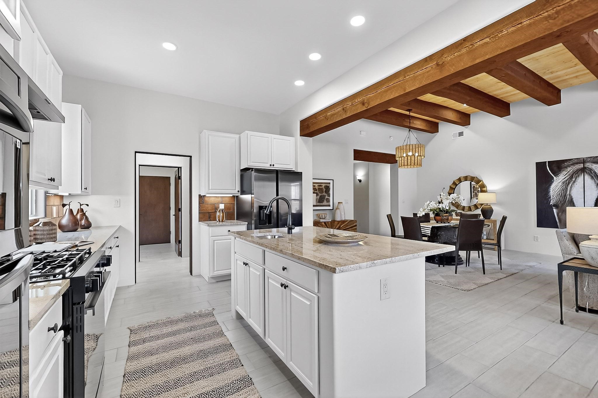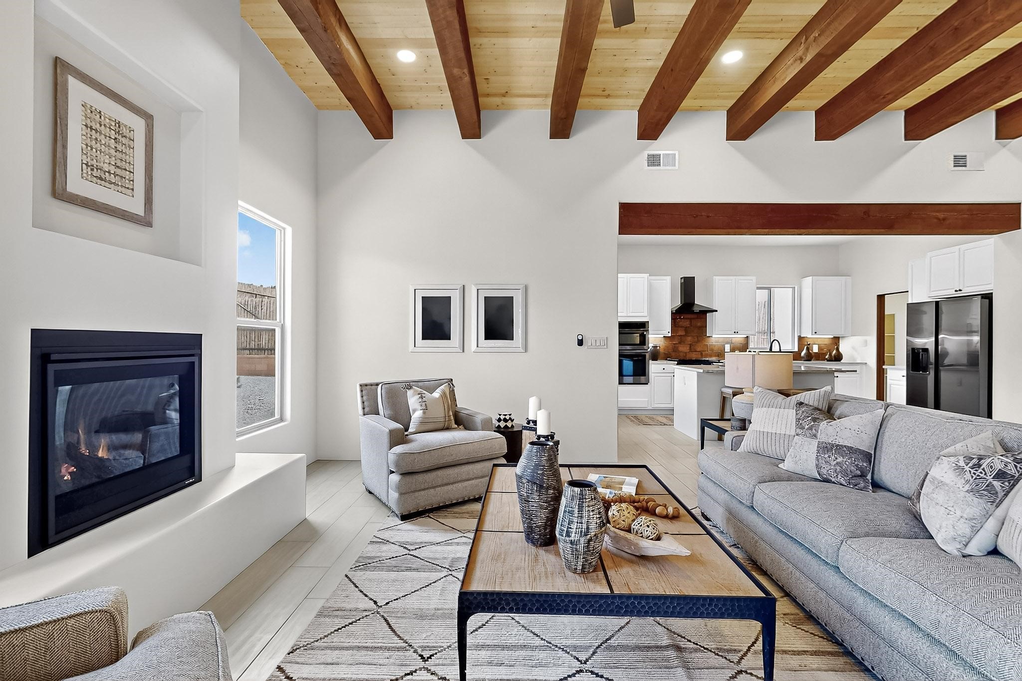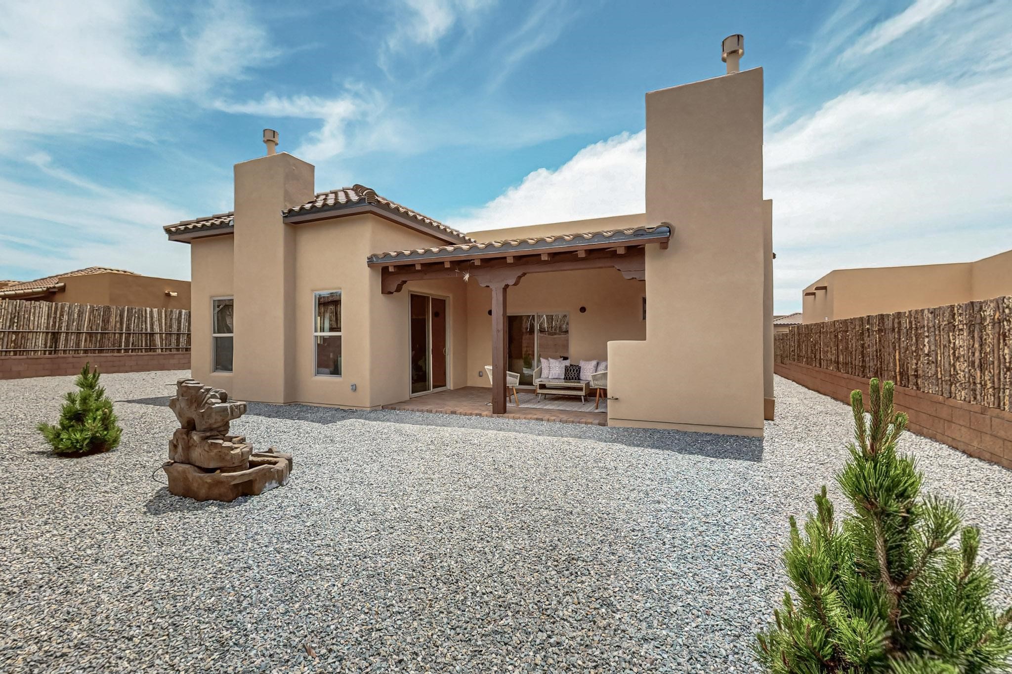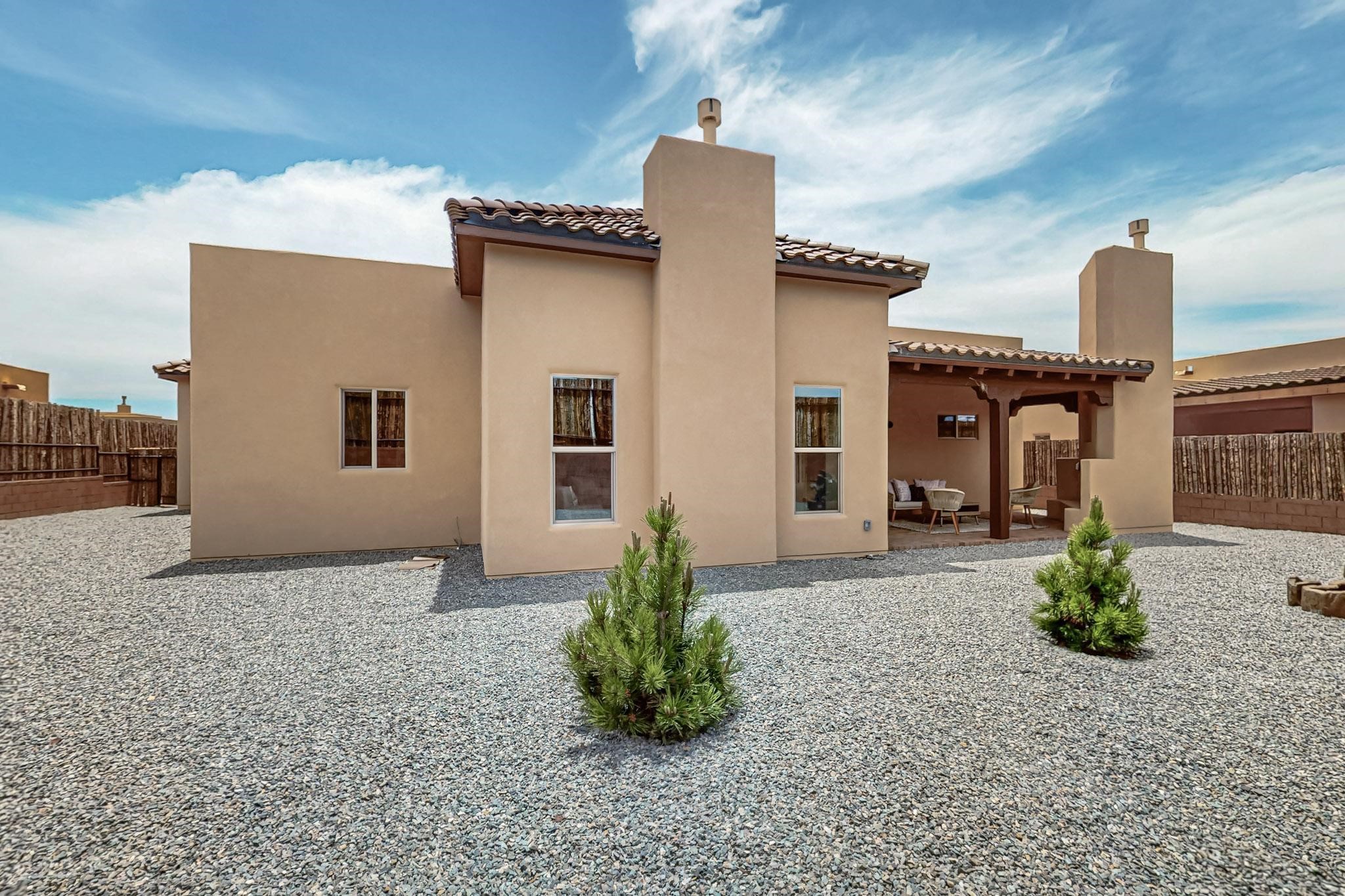 With a gated front courtyard wall and a 3 Car garage, this San Antonio Plan consists of 2260 sq. ft., 3 bedrooms and 2 1/2 baths. Located at 33 La Pradera in the La Pradera Subdivision, the exterior is a pitched roof Spanish design with clay-like tile roofs and covered portals with heavy wood beams and brick pavers. The 3-car driveway is a colored stamped- concrete design. The home is entered through an 8 ft. high door to a foyer with a boveda ceiling and beige, wood-like porcelain floor tiles. To the right is a powder room and to the left is a hallway with a nicho-accented wall leading to the two (2) guest bedrooms. The foyer leads into the living/dining room which has a 12-foot-high ceiling with cedar-stained wood beams and clear-coated T & G trim and a gas fireplace. The living room and the owner's suite open out to a covered portal with brick pavers and a gas-fired fireplace. The open kitchen has white cabinets mahogany- colored backsplash tile. An exceptionally large pantry is directly off the kitchen. The utility room is then accessed from the pantry and has ample cabinets, skylight, and a sink.The owner's bath has a large walk-in shower with euro-style shower fixtures and an overhead rain shower head. There is also an exceptionally large walk-incloset. The insulated garage includes a storage room and an epoxy-coated floor.