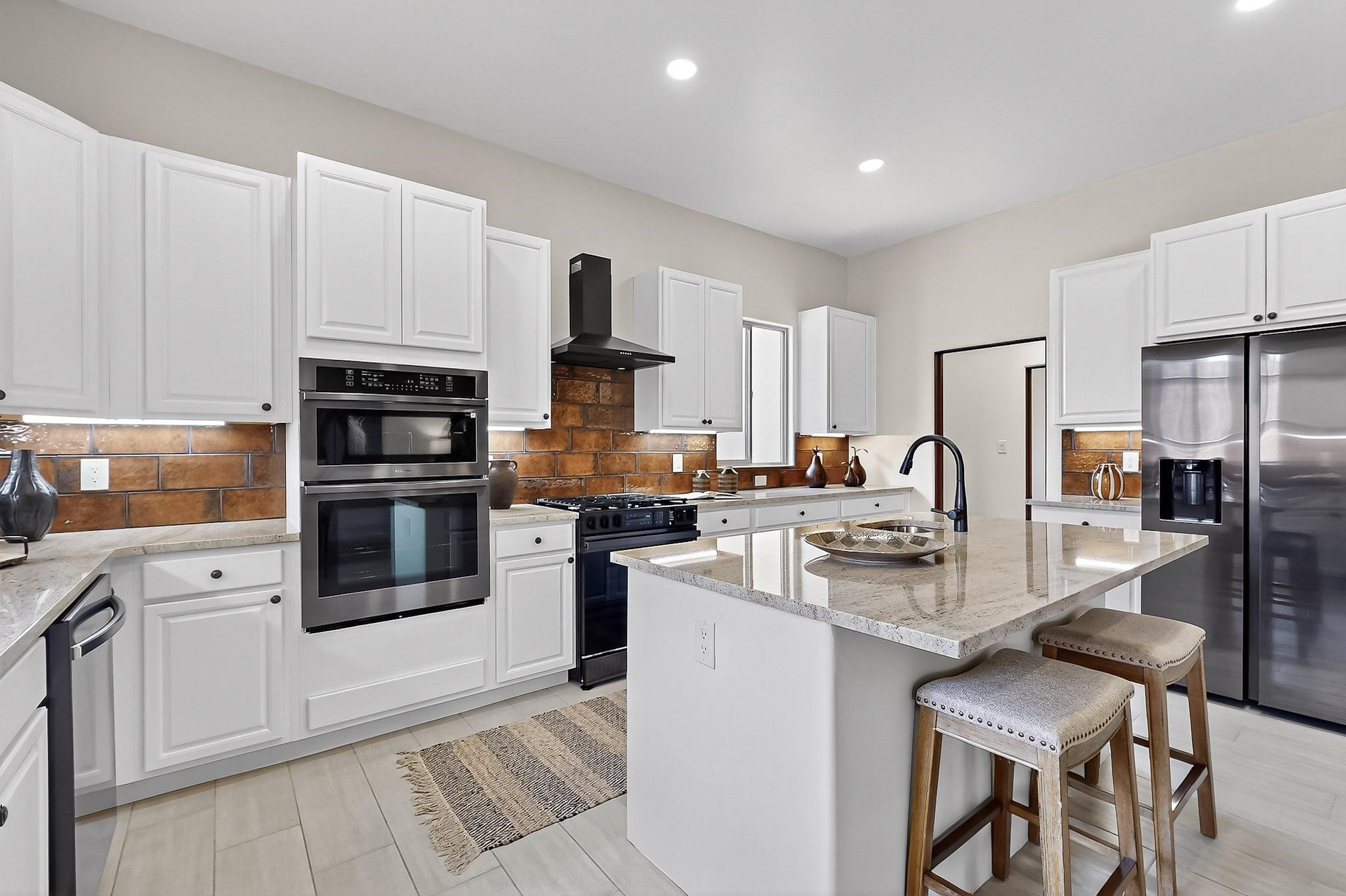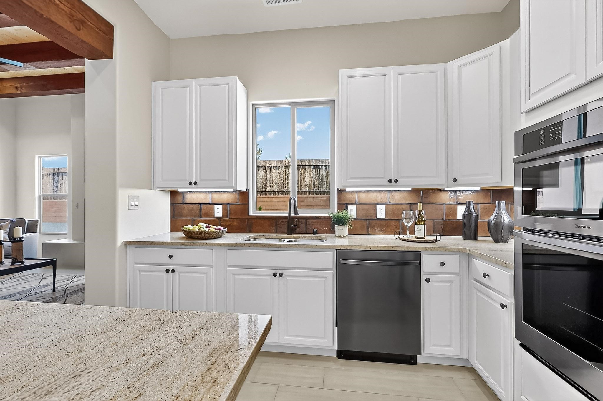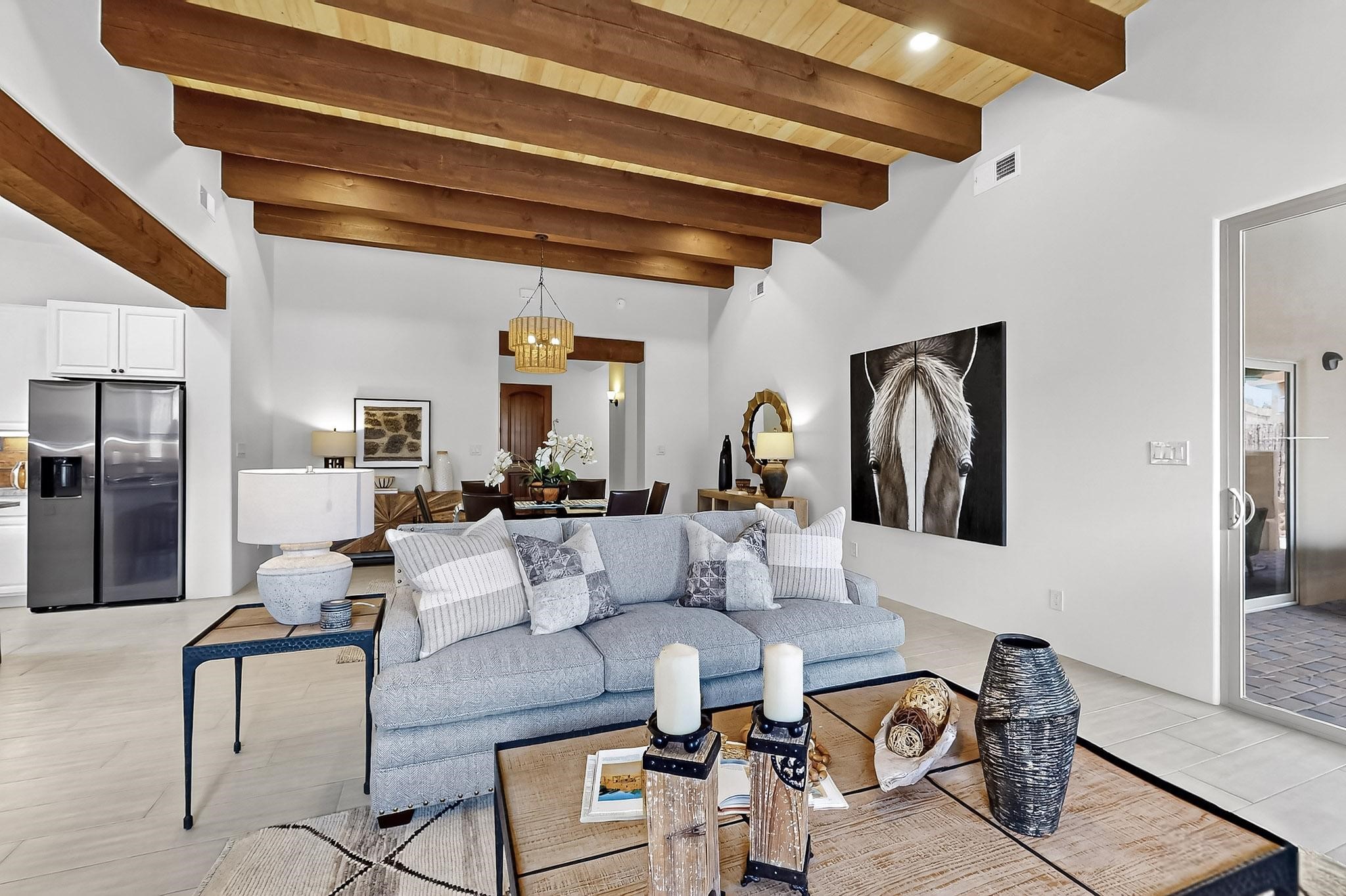 With a gated front courtyard wall and a 3 Car garage, this San Antonio Plan consists of 2260 sq. ft., 3 bedrooms and 2 1/2 baths. Located at 33 La Pradera in the La Pradera Subdivision, the exterior is a pitched roof Spanish design with clay-like tile roofs and covered portals with heavy wood beams and brick pavers. The 3-car driveway is a colored stamped- concrete design. The home is entered through an 8 ft. high door to a foyer with a boveda ceiling and beige, wood-like porcelain floor tiles. To the right is a powder room and to the left is a hallway with a nicho-accented wall leading to the two (2) guest bedrooms. The foyer leads into the living/dining room which has a 12-foot-high ceiling with cedar-stained wood beams and clear-coated T & G trim and a gas fireplace. The living room and the owner's suite open out to a covered portal with brick pavers and a gas-fired fireplace. The open kitchen has white cabinets mahogany- colored backsplash tile. An exceptionally large pantry is directly off the kitchen. The utility room is then accessed from the pantry and has ample cabinets, skylight, and a sink.The owner's bath has a large walk-in shower with euro-style shower fixtures and an overhead rain shower head. There is also an exceptionally large walk-incloset. The insulated garage includes a storage room and an epoxy-coated floor.