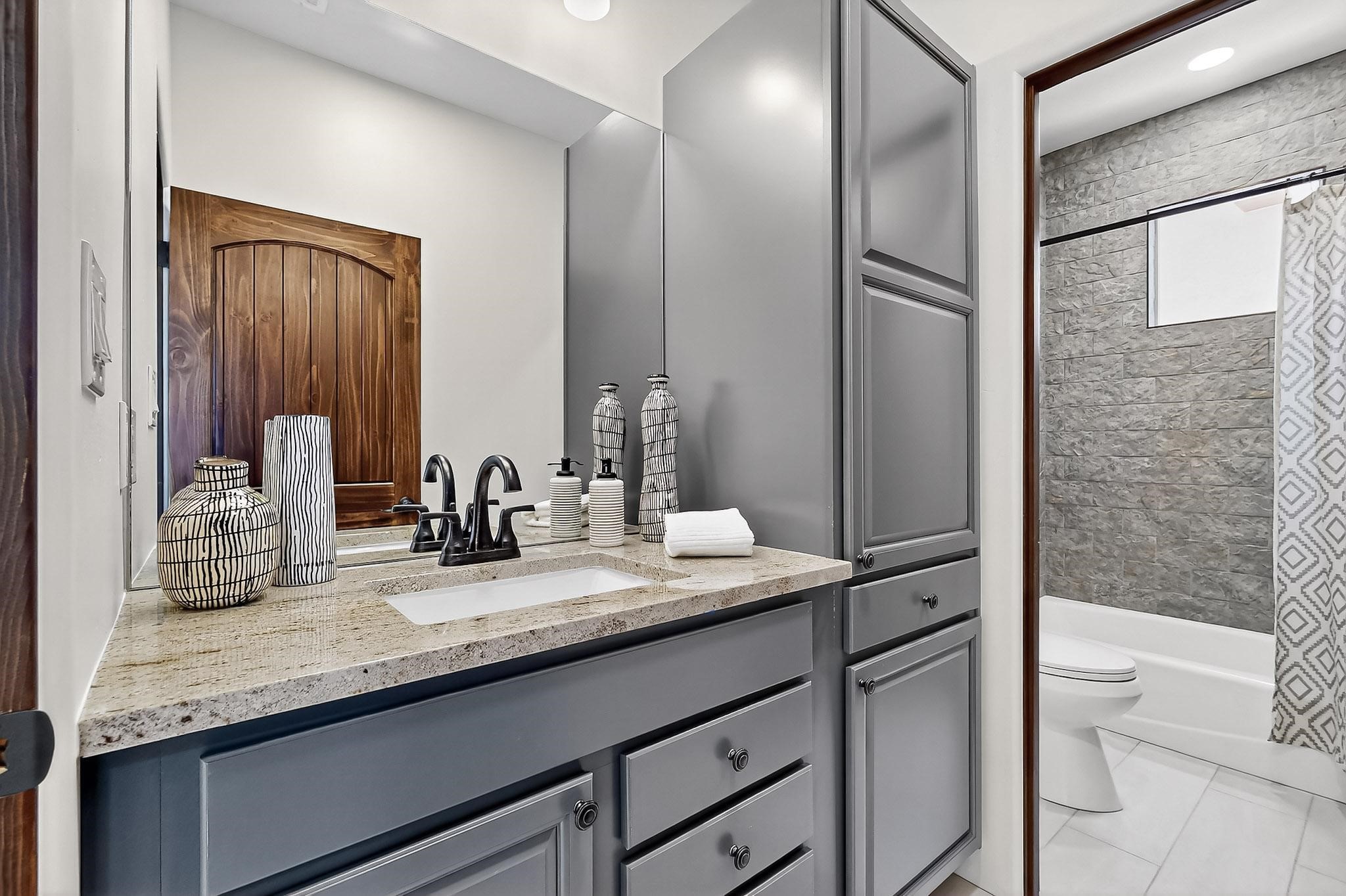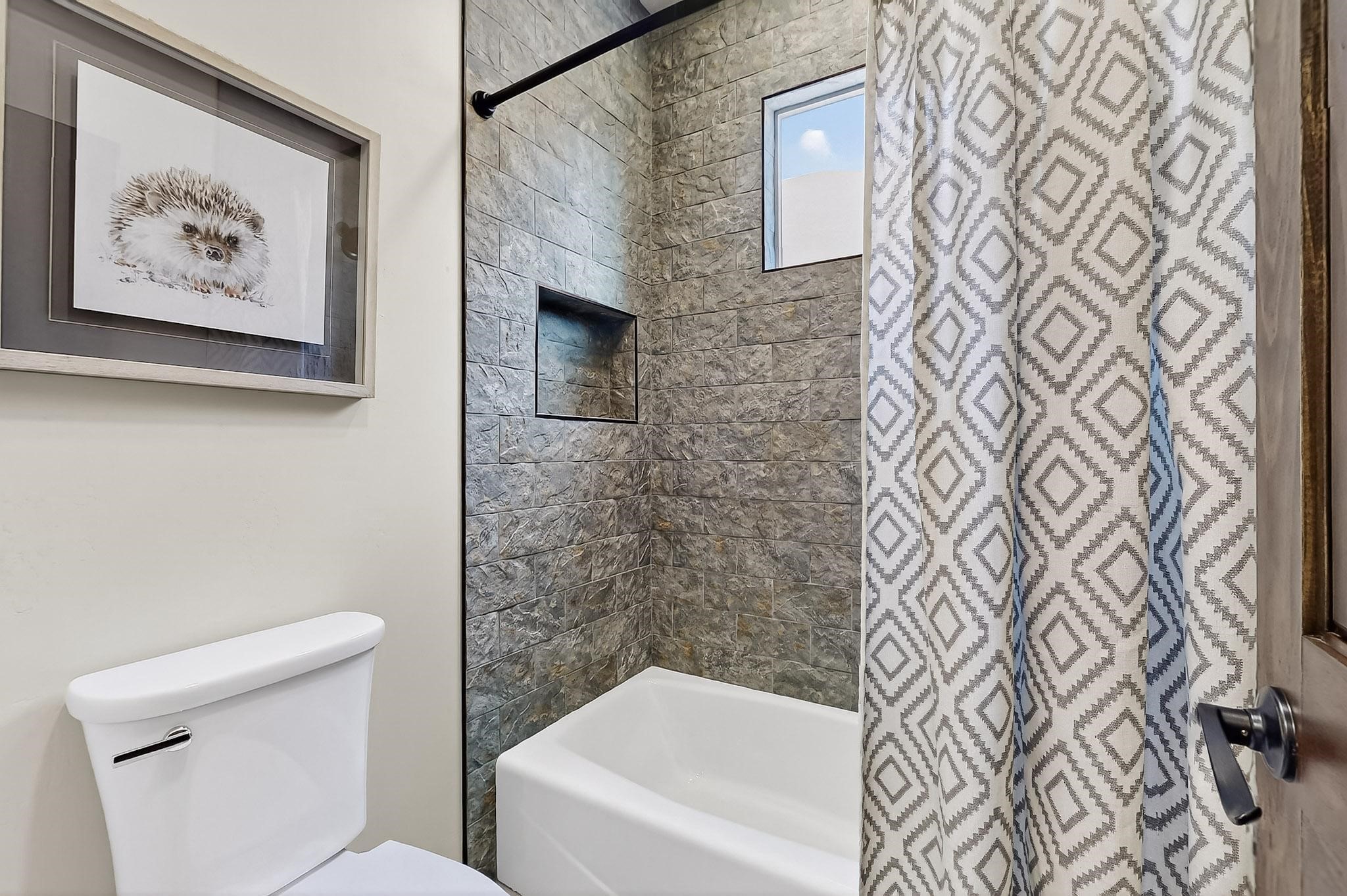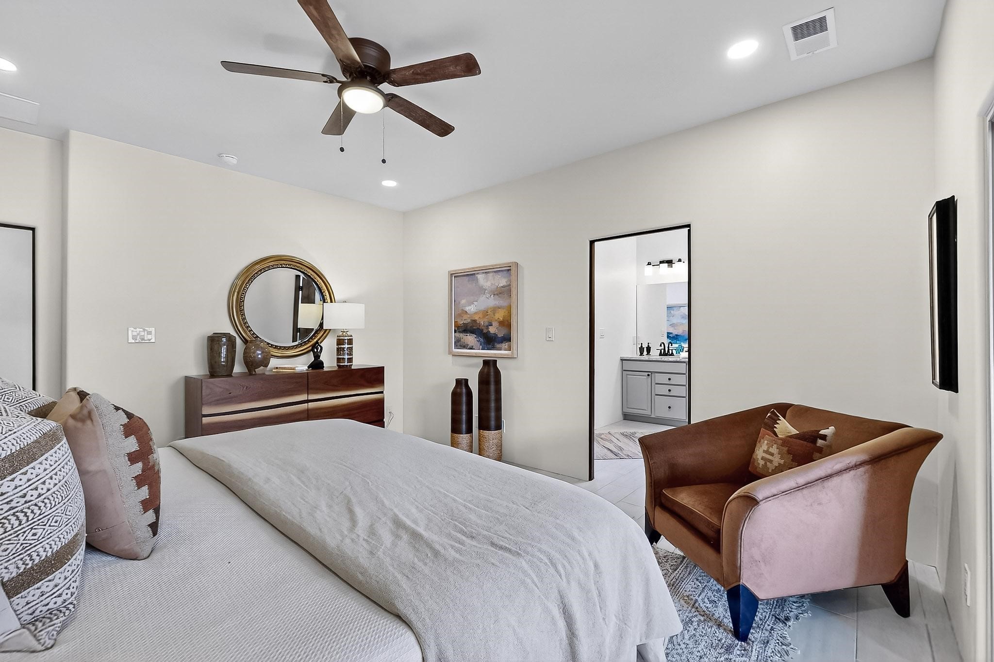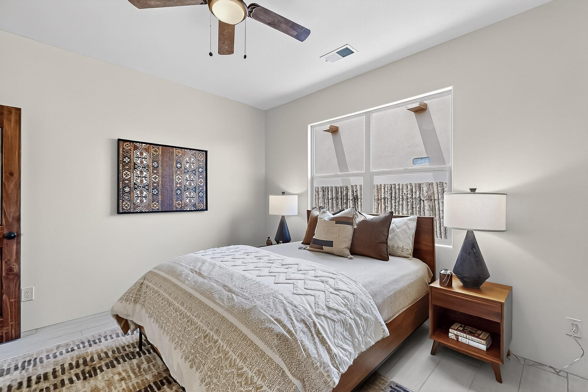 With a gated front courtyard wall and a 3 Car garage, this San Antonio Plan consists of 2260 sq. ft., 3 bedrooms and 2 1/2 baths. Located at 33 La Pradera in the La Pradera Subdivision, the exterior is a pitched roof Spanish design with clay-like tile roofs and covered portals with heavy wood beams and brick pavers. The 3-car driveway is a colored stamped- concrete design. The home is entered through an 8 ft. high door to a foyer with a boveda ceiling and beige, wood-like porcelain floor tiles. To the right is a powder room and to the left is a hallway with a nicho-accented wall leading to the two (2) guest bedrooms. The foyer leads into the living/dining room which has a 12-foot-high ceiling with cedar-stained wood beams and clear-coated T & G trim and a gas fireplace. The living room and the owner's suite open out to a covered portal with brick pavers and a gas-fired fireplace. The open kitchen has white cabinets mahogany- colored backsplash tile. An exceptionally large pantry is directly off the kitchen. The utility room is then accessed from the pantry and has ample cabinets, skylight, and a sink.The owner's bath has a large walk-in shower with euro-style shower fixtures and an overhead rain shower head. There is also an exceptionally large walk-incloset. The insulated garage includes a storage room and an epoxy-coated floor.