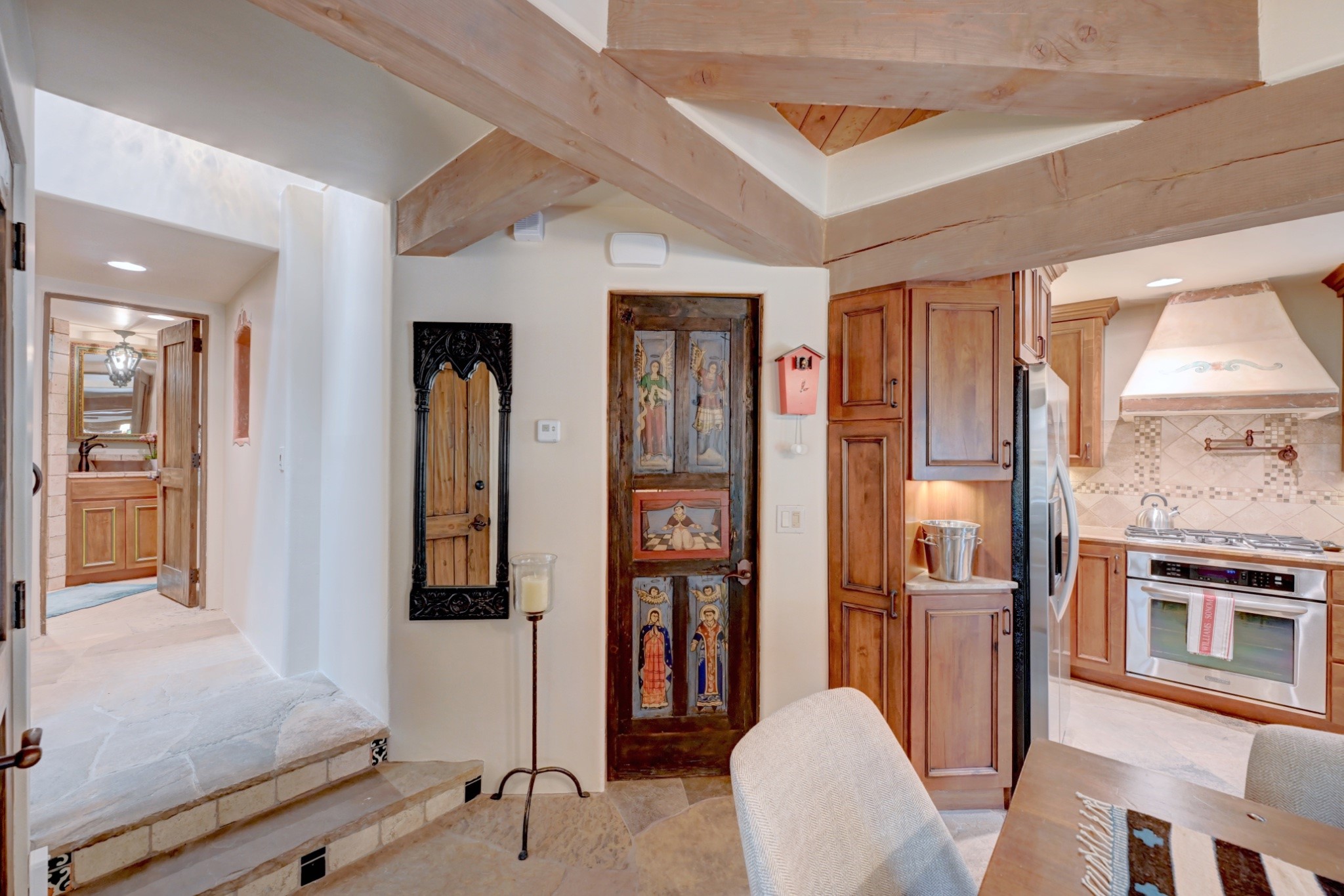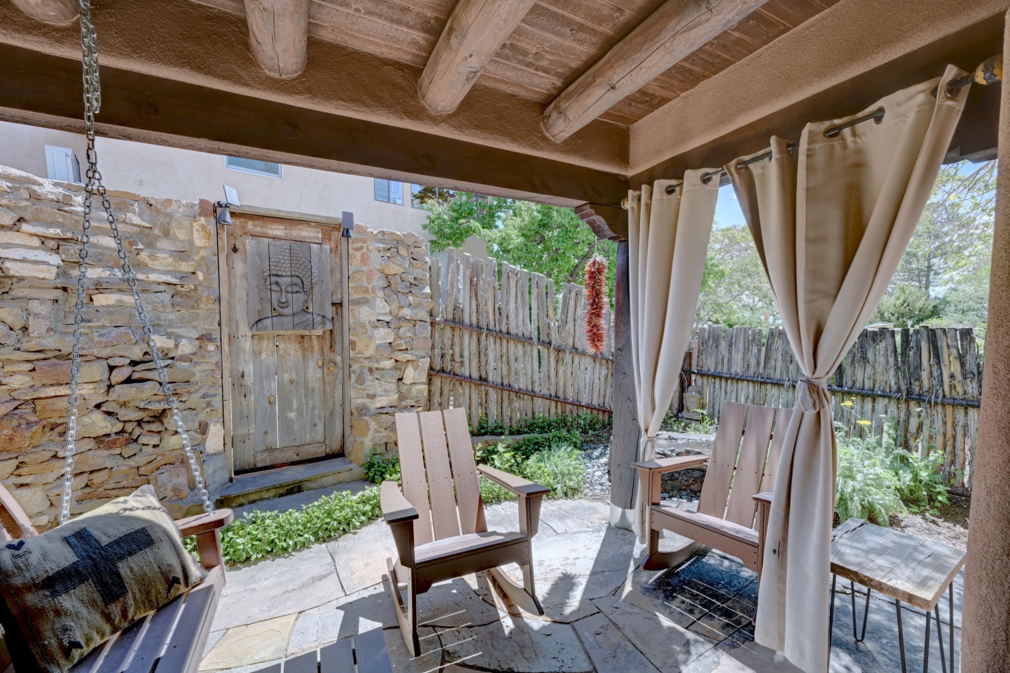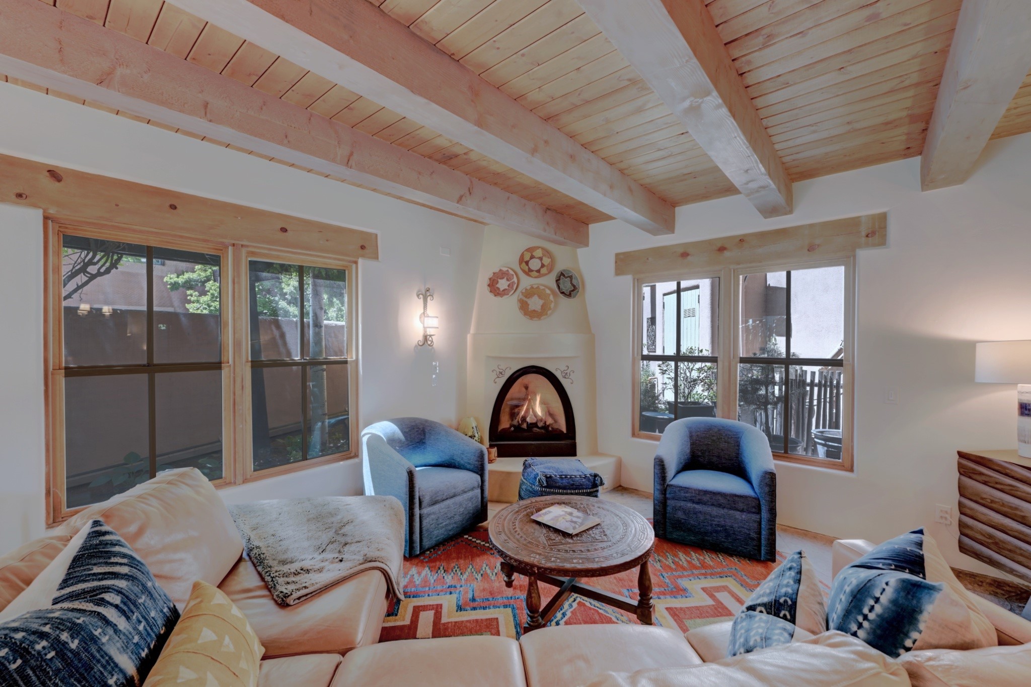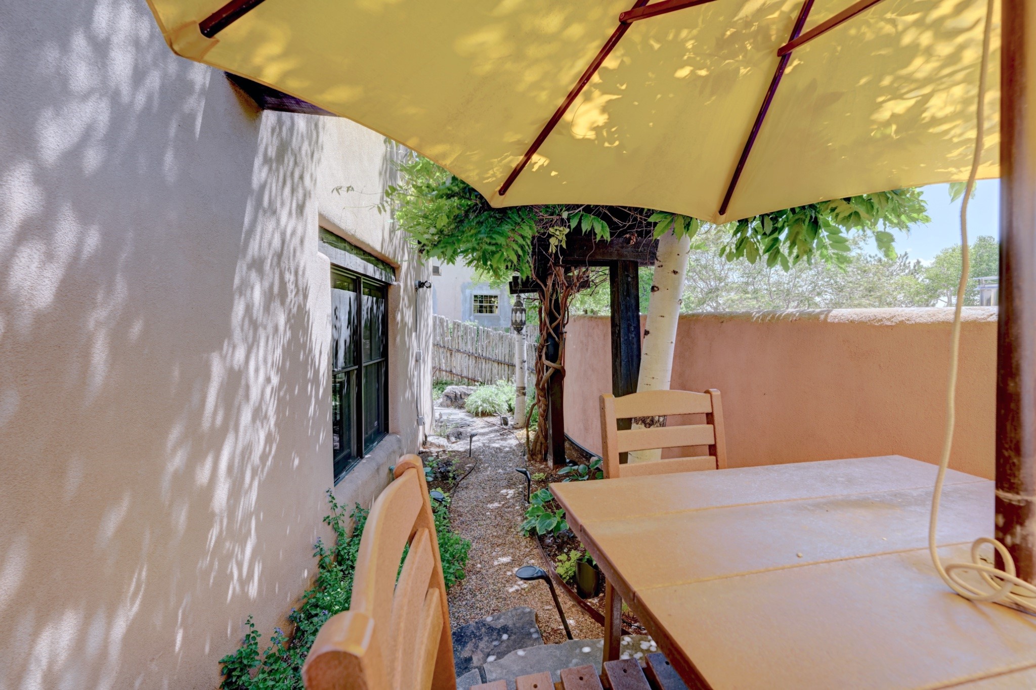 Nestled in the heart of Santa Fe's coveted historic Eastside and located off of Gonzales Rd, this elegant condo captures the essence of Southwestern living. Just a short walk from the famed Canyon Road art district, you'll find yourself perfectly positioned to enjoy the city's rich culture. Step inside to discover authentic Santa Fe style throughout this 1,352 +/- square foot retreat within a two-condo development. Admire beautiful beam and wood-plank ceilings, while gorgeous hand-hewn flagstone floors ground the space in traditional craftsmanship. The well-appointed cook's kitchen flows seamlessly into the living and dining areas, featuring thoughtful touches like a two-drawer dishwasher, convenient pot-filler, and a microwave drawer. Unwind by the kiva fireplace in the living room or step outside to your enchanting garden. This outdoor oasis boasts a hand-stacked rock wall, carved Buddha wooden gate, large, mature Wisteria vine and a soothing fountain surrounded by two distinct seating areas--all beautifully landscaped for easy care. Upstairs, the primary bedroom suite offers a private deck with lovely views, plus an ensuite bathroom featuring a double sink vanity, large soaking tub, and luxurious steam shower. Artistic details abound throughout, from wrought iron stair rails and light fixtures to hand painting on a nicho and fireplace. A charming wooden door with hand-painted Santos leads to the second bedroom, which doubles perfectly as a home office. Every room showcases custom cabinetry, doors, and true divided-light windows. Modern comforts include radiant in-floor heating, ductless mini-splits for cooling comfort, and a new tankless hot water heater. One dedicated parking space completes this package. Located minutes from Canyon Road's galleries, world renown restaurants and the Santa Fe Plaza's downtown attractions, this condo offers both convenience and tranquility. Whether as your Santa Fe pied--terre or full-time residence, this lock-and-leave lifestyle puts the best of The City Different at your doorstep. Please see the Matterport 3-D walkthrough in the listing. An extensive furniture package is available for purchase separately.