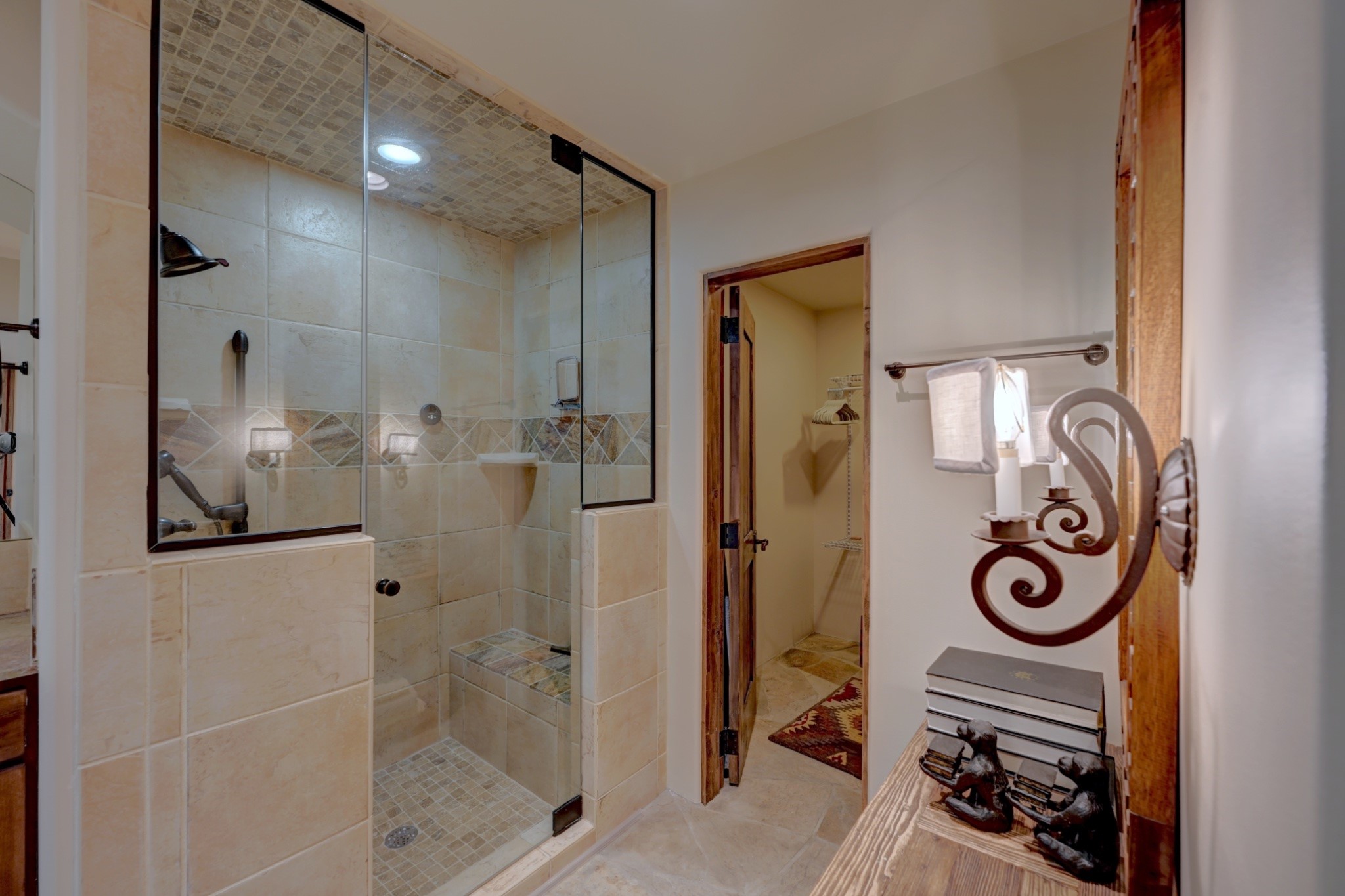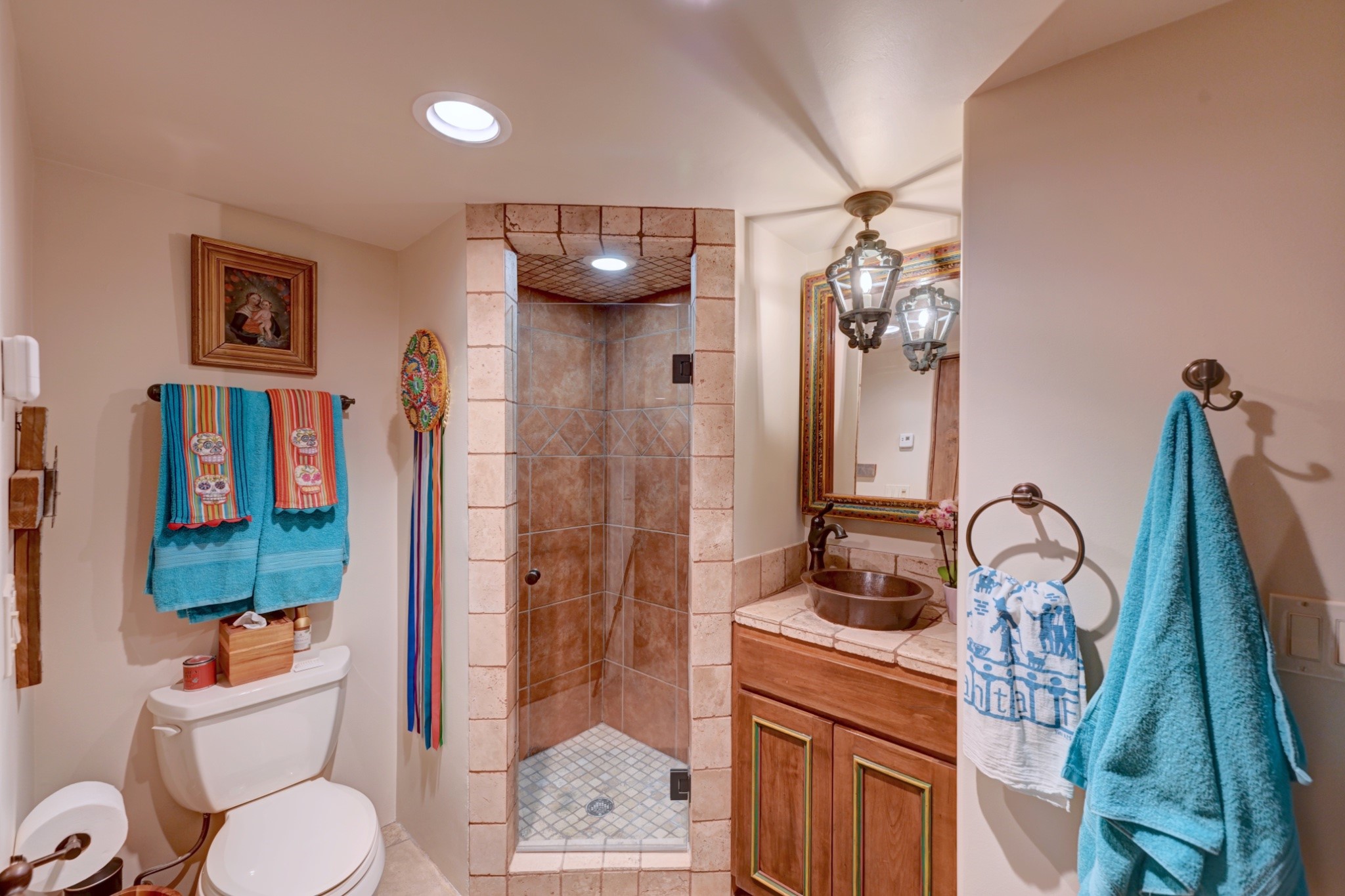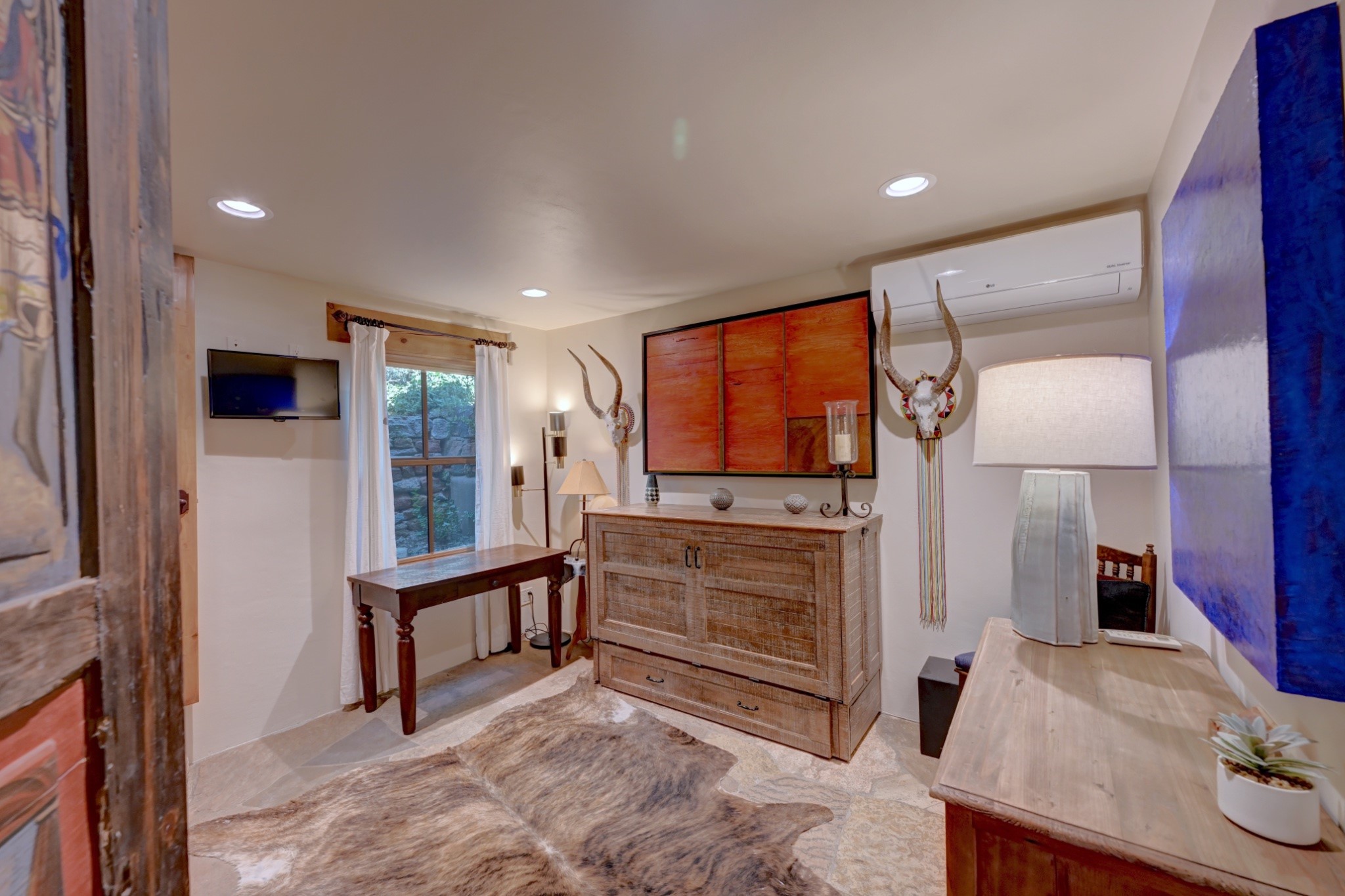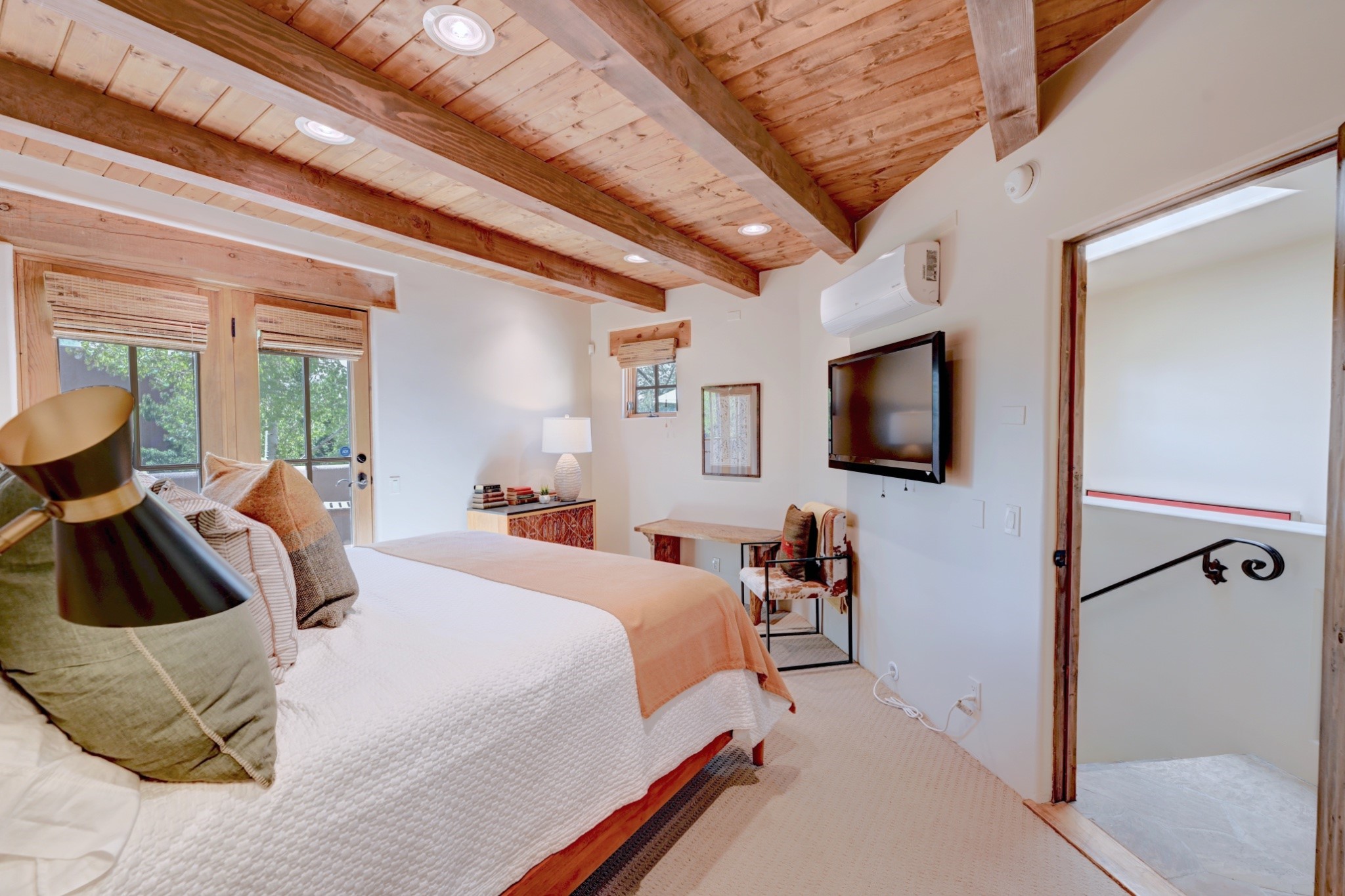 Nestled in the heart of Santa Fe's coveted historic Eastside and located off of Gonzales Rd, this elegant condo captures the essence of Southwestern living. Just a short walk from the famed Canyon Road art district, you'll find yourself perfectly positioned to enjoy the city's rich culture. Step inside to discover authentic Santa Fe style throughout this 1,352 +/- square foot retreat within a two-condo development. Admire beautiful beam and wood-plank ceilings, while gorgeous hand-hewn flagstone floors ground the space in traditional craftsmanship. The well-appointed cook's kitchen flows seamlessly into the living and dining areas, featuring thoughtful touches like a two-drawer dishwasher, convenient pot-filler, and a microwave drawer. Unwind by the kiva fireplace in the living room or step outside to your enchanting garden. This outdoor oasis boasts a hand-stacked rock wall, carved Buddha wooden gate, large, mature Wisteria vine and a soothing fountain surrounded by two distinct seating areas--all beautifully landscaped for easy care. Upstairs, the primary bedroom suite offers a private deck with lovely views, plus an ensuite bathroom featuring a double sink vanity, large soaking tub, and luxurious steam shower. Artistic details abound throughout, from wrought iron stair rails and light fixtures to hand painting on a nicho and fireplace. A charming wooden door with hand-painted Santos leads to the second bedroom, which doubles perfectly as a home office. Every room showcases custom cabinetry, doors, and true divided-light windows. Modern comforts include radiant in-floor heating, ductless mini-splits for cooling comfort, and a new tankless hot water heater. One dedicated parking space completes this package. Located minutes from Canyon Road's galleries, world renown restaurants and the Santa Fe Plaza's downtown attractions, this condo offers both convenience and tranquility. Whether as your Santa Fe pied--terre or full-time residence, this lock-and-leave lifestyle puts the best of The City Different at your doorstep. Please see the Matterport 3-D walkthrough in the listing. An extensive furniture package is available for purchase separately.