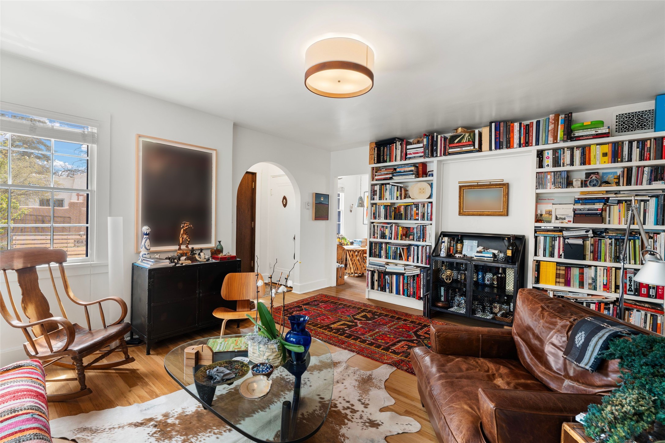 Perfect downtown pied--terre located in the heart of Santa Fe's South Capitol neighborhood. This residence combines classic architecture with modern amenities, creating an inviting atmosphere in a sought-after area. With 1,273 square feet, the main house features a thoughtfully designed layout that includes two spacious bedrooms and two bathrooms. The separate dining room offers an ideal space for gatherings, while the primary suite is a true highlight, complete with its own fireplace and French doors that open to a picturesque courtyard. Culinary enthusiasts will appreciate the well-appointed kitchen, which features a Wolf range and a built-in refrigerator. The charm extends beyond the main house with a detached guesthouse, offering 390 square feet of additional living space. This cozy retreat includes a kitchenette and a full bath, perfect for hosting visitors or enjoying personal time. Outside, the private courtyard showcases lush landscaping, featuring fruit trees that invites relaxation. It serves as a serene escape, ideal for unwinding amidst nature's beauty. An extra bonus is a basement with a washer/dryer and additional storage space. Off street parking for one car. Conveniently positioned in Santa Fe's Historic District, this property is just a stone's throw away from notable attractions, including the Roundhouse, Whole Foods, the Railyard, the Farmers Market, and the lively Santa Fe Plaza.